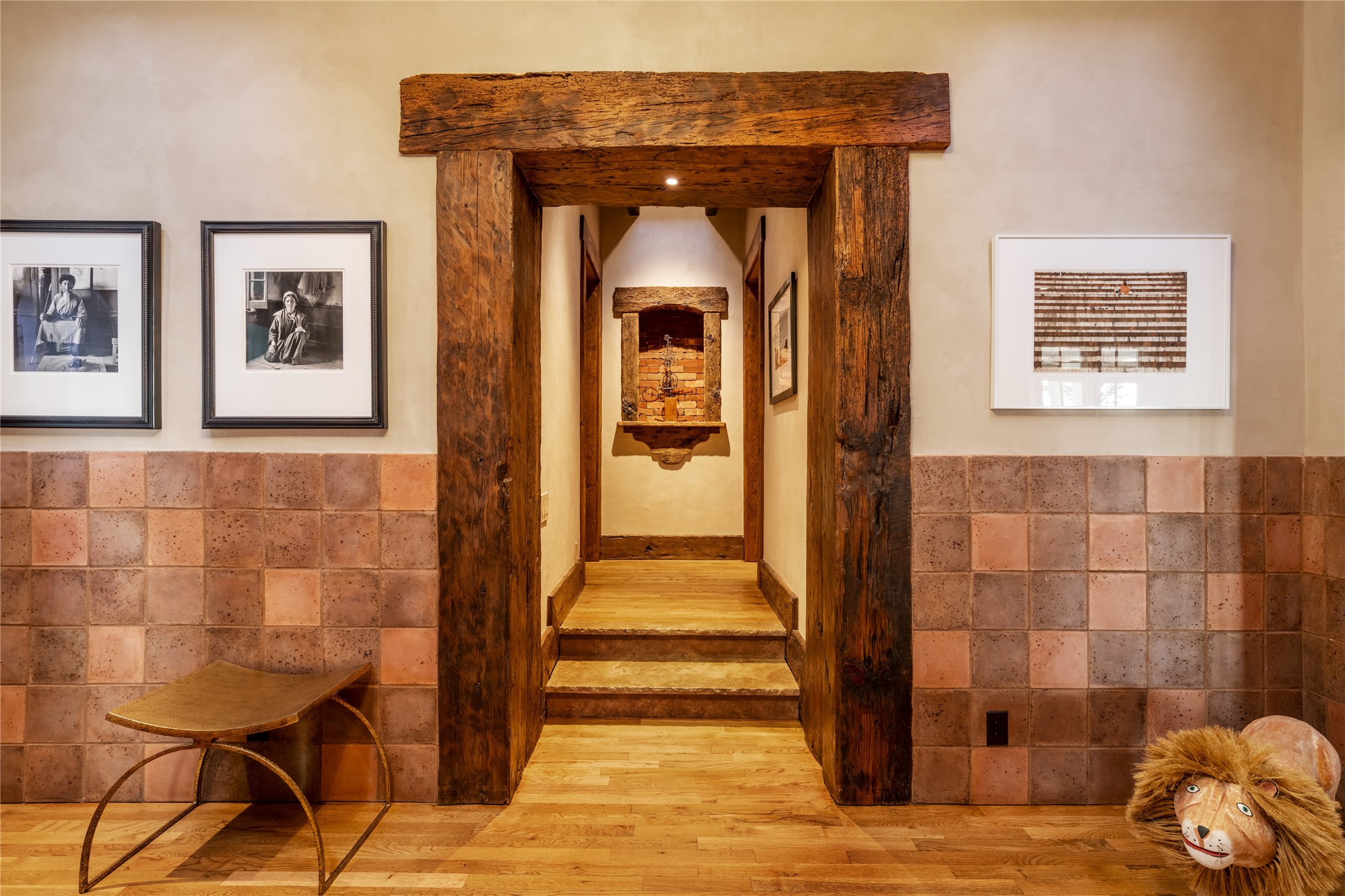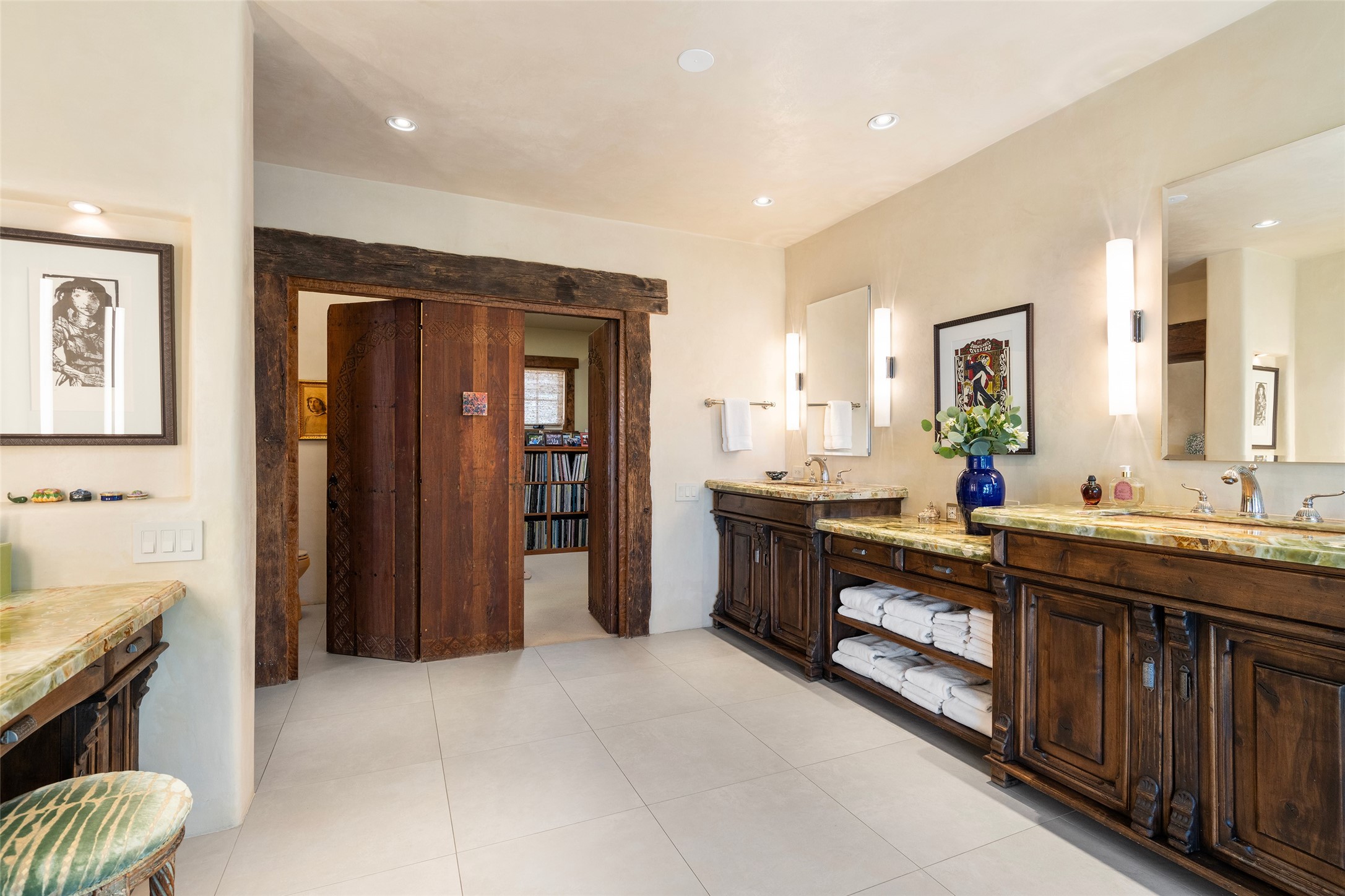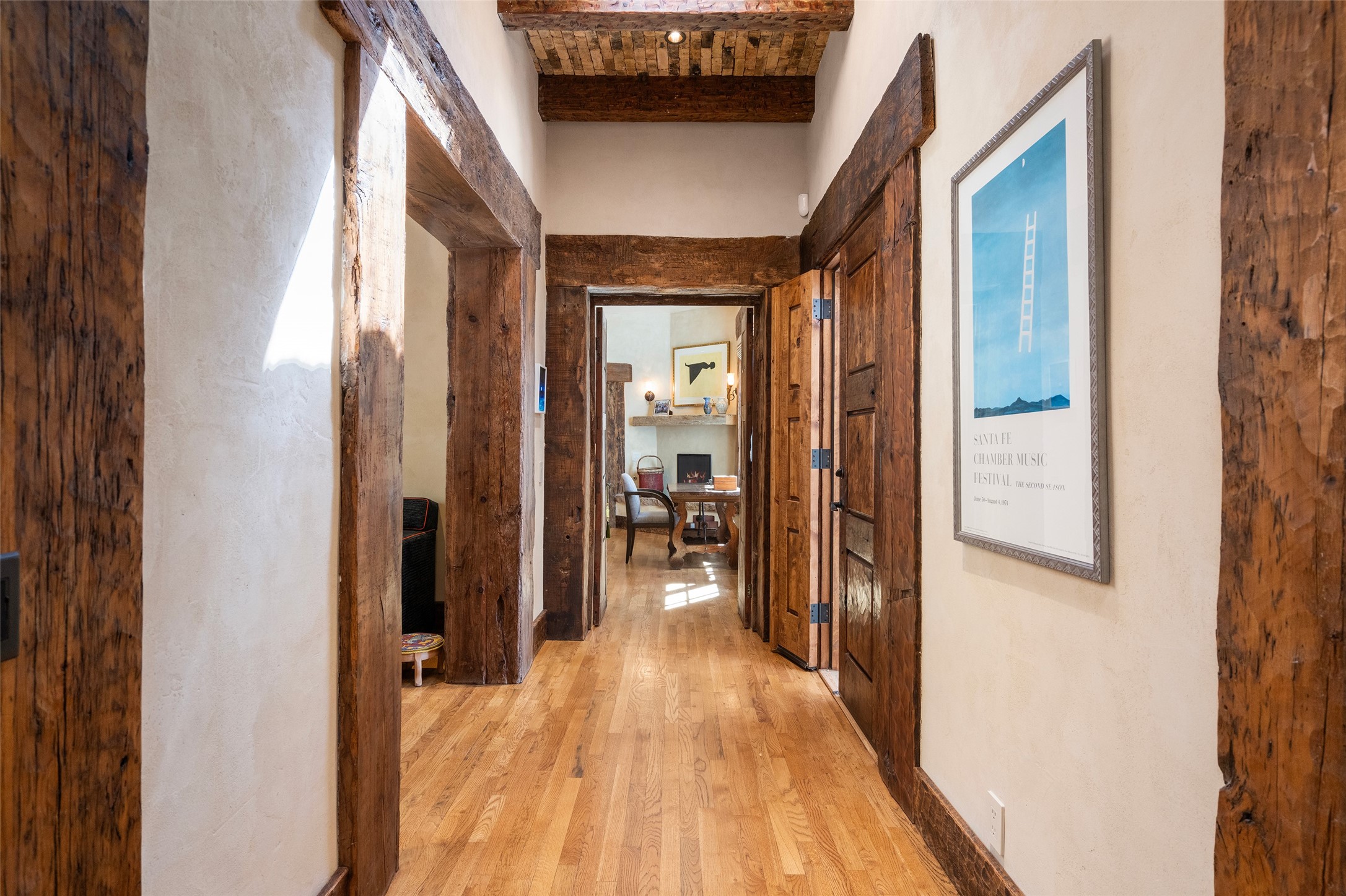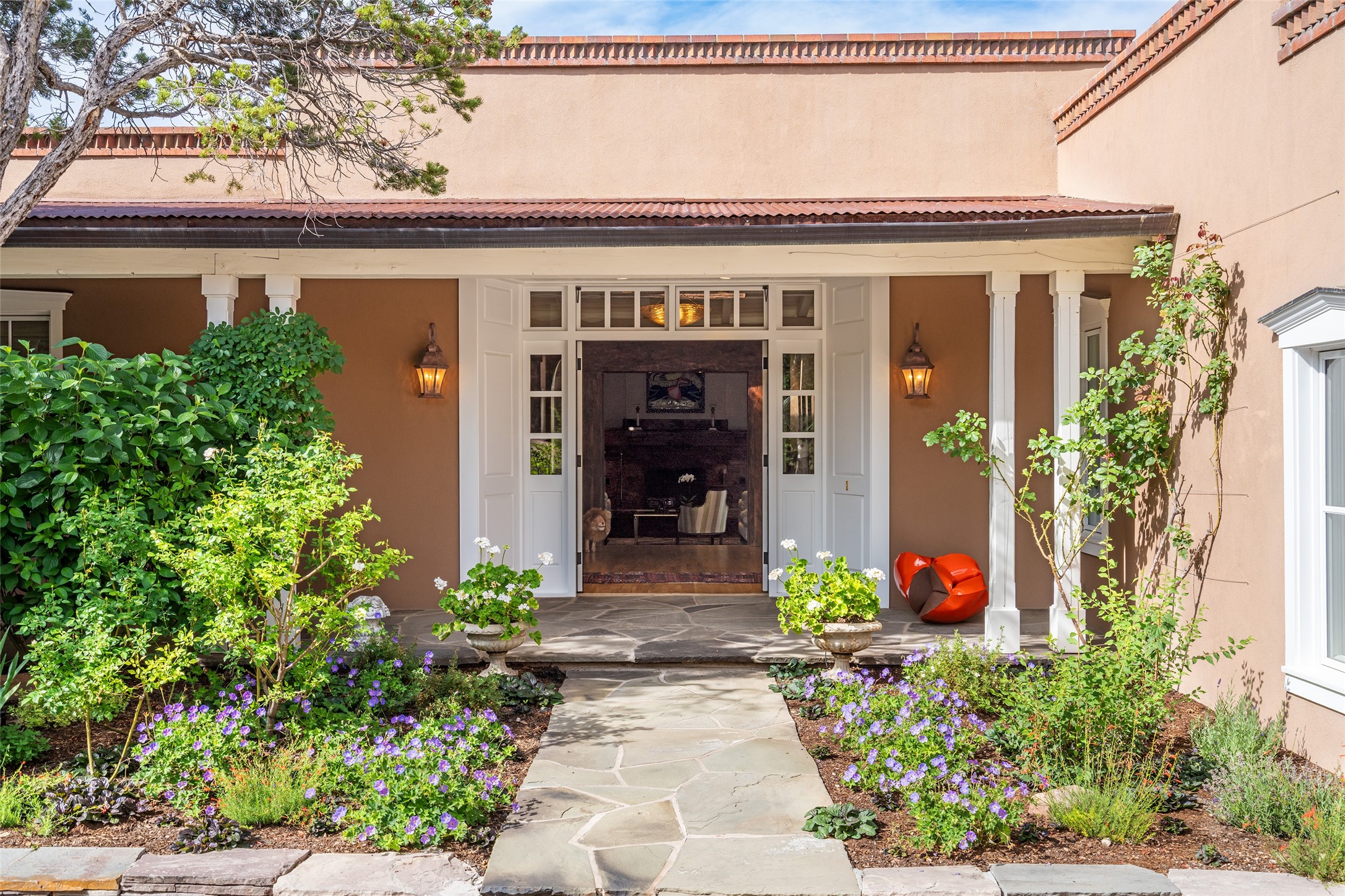This gated oasis tastefully blends territorial-style with southwestern character reminiscent of old-world Europe. The property offers privacy, elegance, and tranquil views of the Jemez Mountains. The home features a deep wrap-around veranda --perfect for outdoor entertaining or peaceful evenings surrounded by lush, mature gardens and glorious trees. Inside, unique architectural touches abound, including roughhewn wood accents and soaring brick ceilings that add warmth and texture throughout. The elegant living room features a large stone fireplace and is adjoined by the dining room that seamlessly integrates with the gourmet kitchen -- a culinary dream, with a large island, honed stone countertop, top-tier appliances, and a separate butler's pantry with an additional dishwasher and sink. The spacious floor plan includes three bedrooms and four baths. The primary suite is generous, with access to the veranda, a private study, two spacious walk-in closets, and a luxurious bath. The separate guest wing with two gracious guest suites enjoys privacy and ensures welcoming accommodations. An oversized two-car garage completes this stunning property. More than a home, this is a secluded sanctuary that blends timeless design with modern comfort.