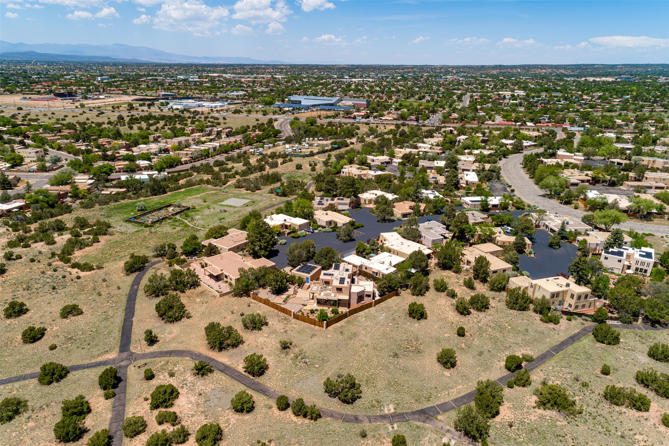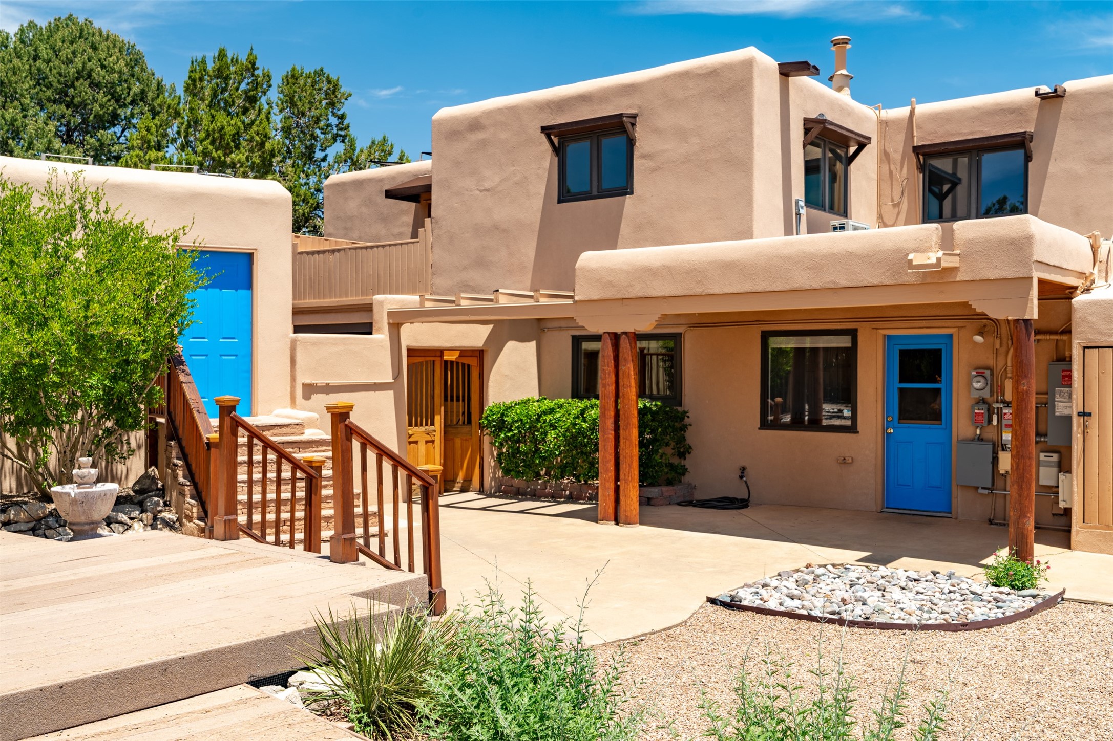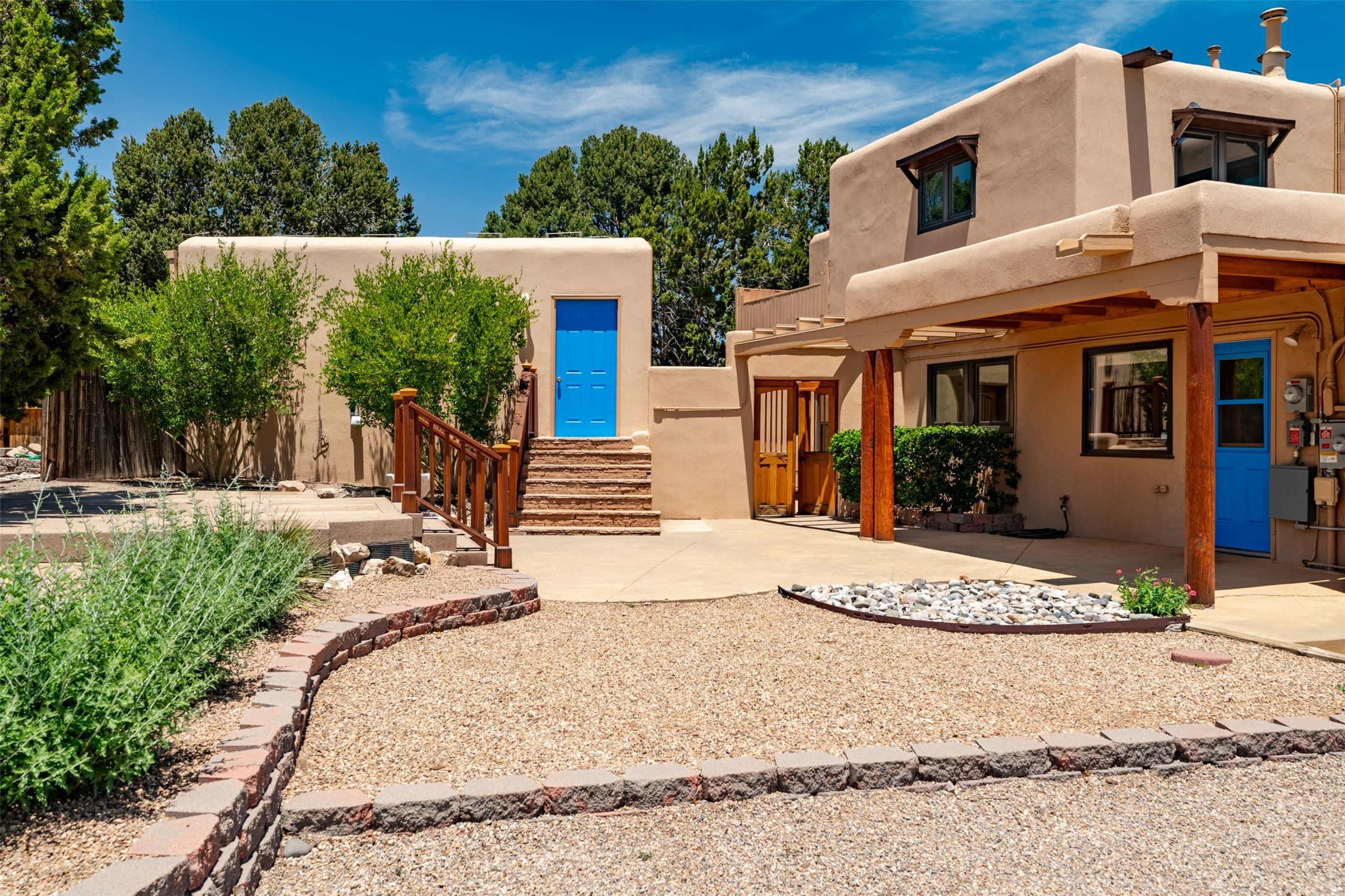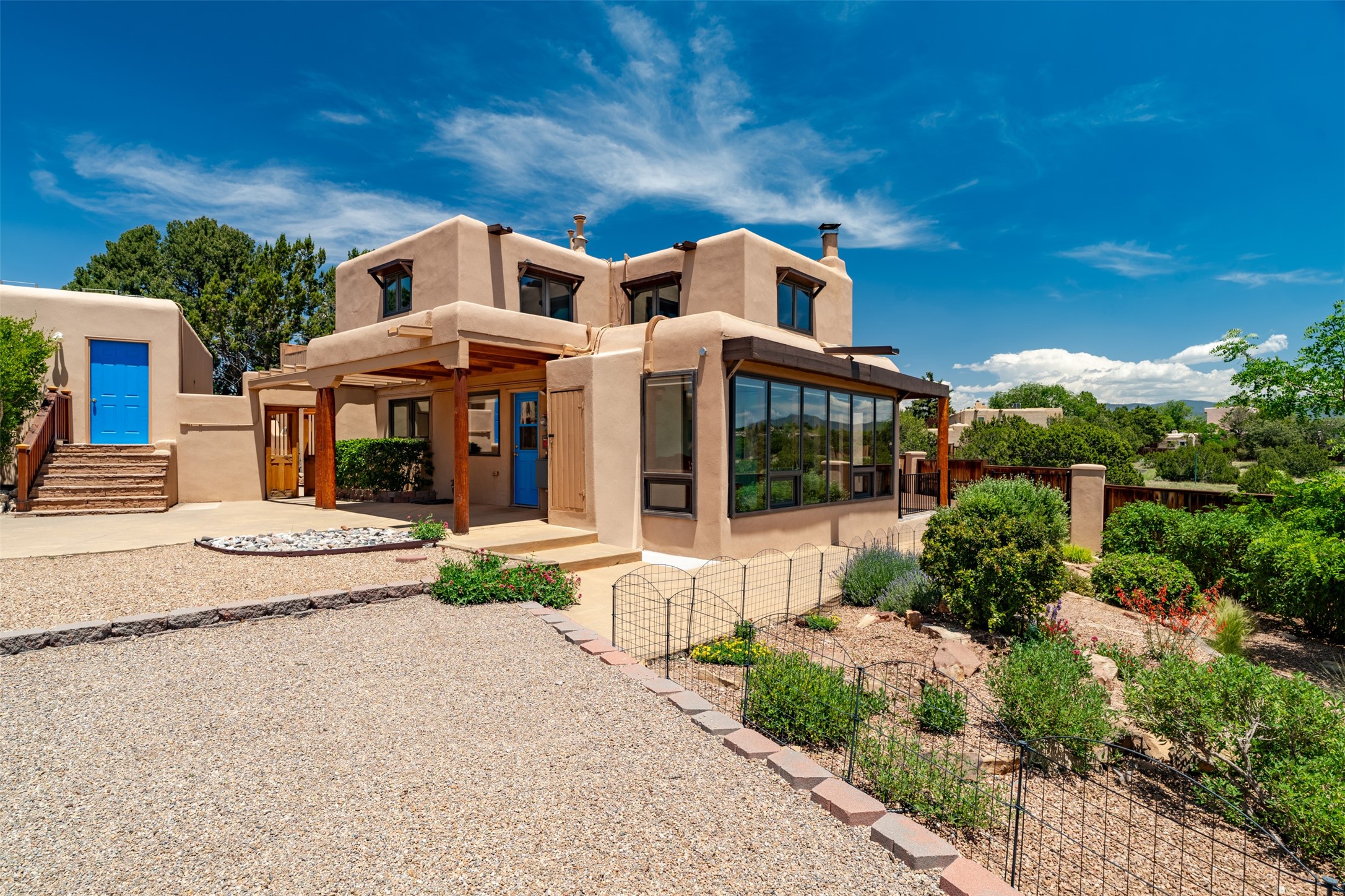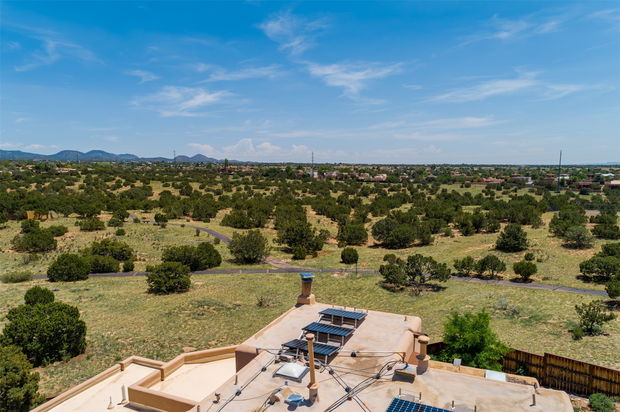 Nestled amid sweeping views and exquisite natural surroundings, this remarkable 4-bedroom, two story, home is a serene and sustainable retreat with a perfect blend of comfort, character, and eco-conscious upgrades. The luxurious, newer (2020) 600 sq ft primary suite on the main floor offers privacy and indulgence, complete with its own mini-split system, a spa-like bathroom, and direct access to outdoor living spaces. Three additional bedrooms are upstairs, where a sunny second-floor deck invites morning coffee or sunset unwinding.Skylights throughout the home bathe the interiors in natural light, highlighting thoughtful details like American clay walls, wood-beamed ceilings, and not one, but two fireplaces--including a charming corner Kiva in the dining room and a striking centerpiece hearth in the living room with a cozy built-in window seat.The bright, eat-in kitchen is a delight with newer appliances, abundant cabinetry, a classic white subway tile backsplash, and views that inspire. Comfort is ensured year-round with two-zone HVAC, refrigerated A/C, mini-splits, and tankless hot water in both upstairs baths.Outside, this home continues to impress with lush xeriscaping, a fenced garden area, and a fully fenced yard. A detached two-car garage includes an extra storage room, while multiple portals and decks provide ideal spots for dining, relaxing, or stargazing. Eco-conscious buyers will appreciate the complete solar electric system and 900-gallon rainwater catchment.This home is a rare find--where views, design, and sustainability come together in perfect harmony.This home is tucked away at the end of a cul-de-sac, with acres of open space and walking trails behind the house. Park Plazas has 8-9 miles of hiking trails, tennis courts, a community garden and is an oasis in the center of Santa Fe close to restaurants, shopping and other amenities, Don't miss this spectacular home in this wonderful neighborhood.