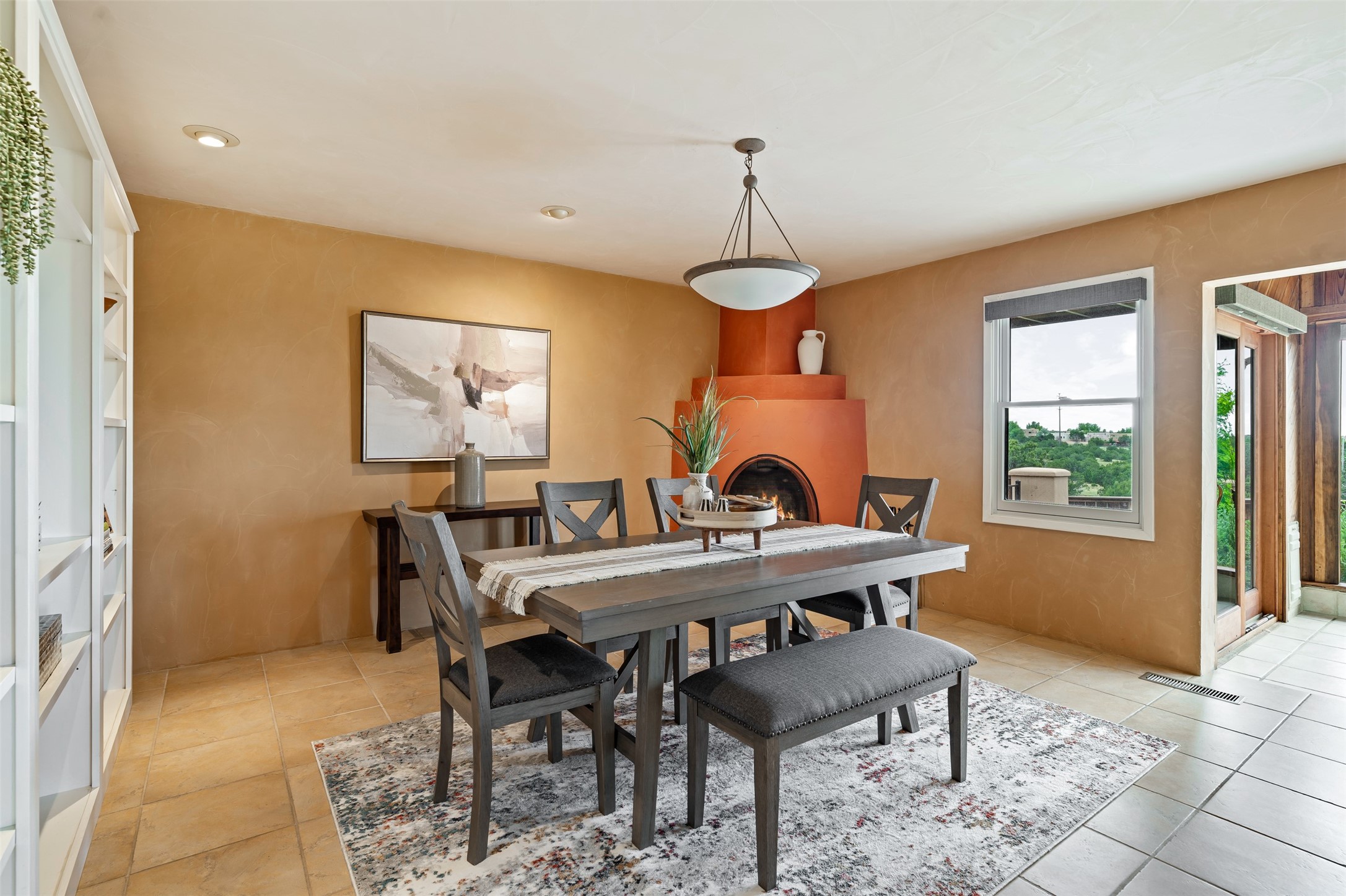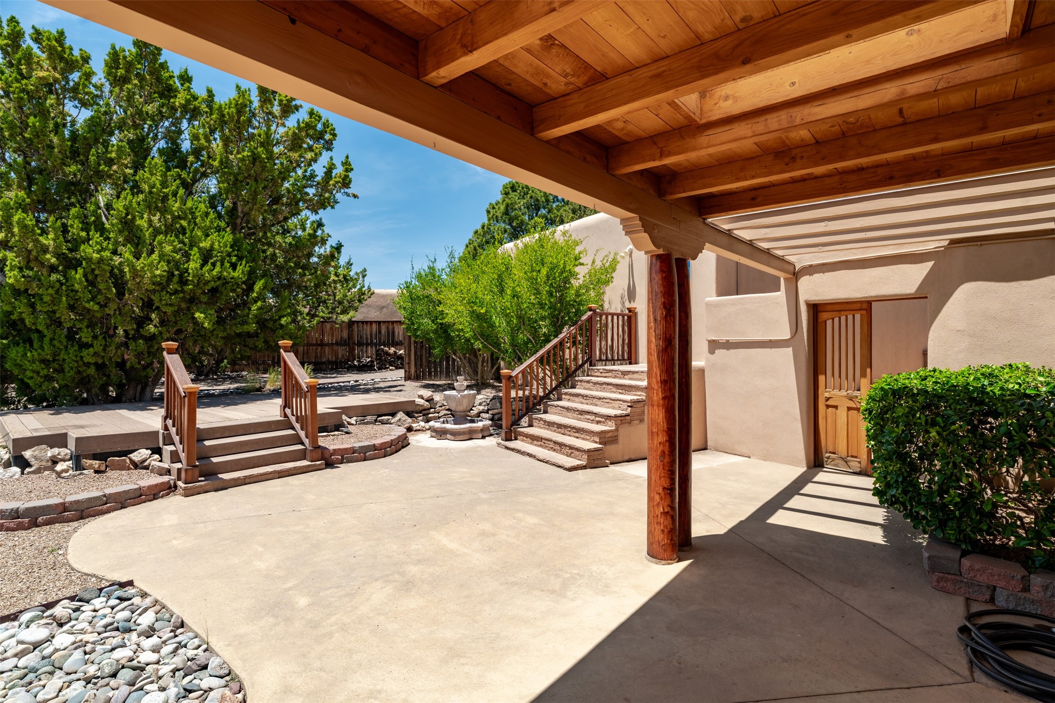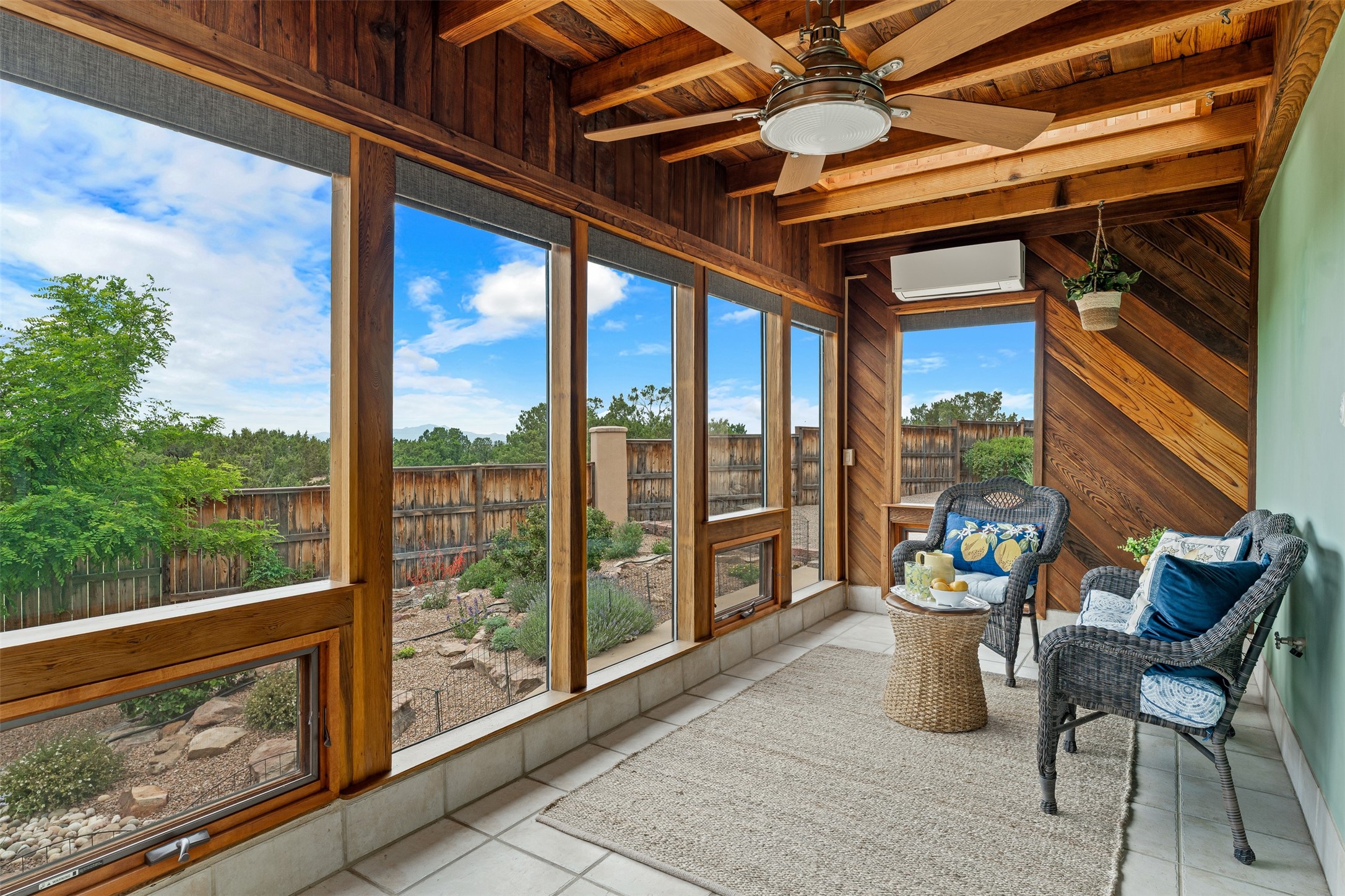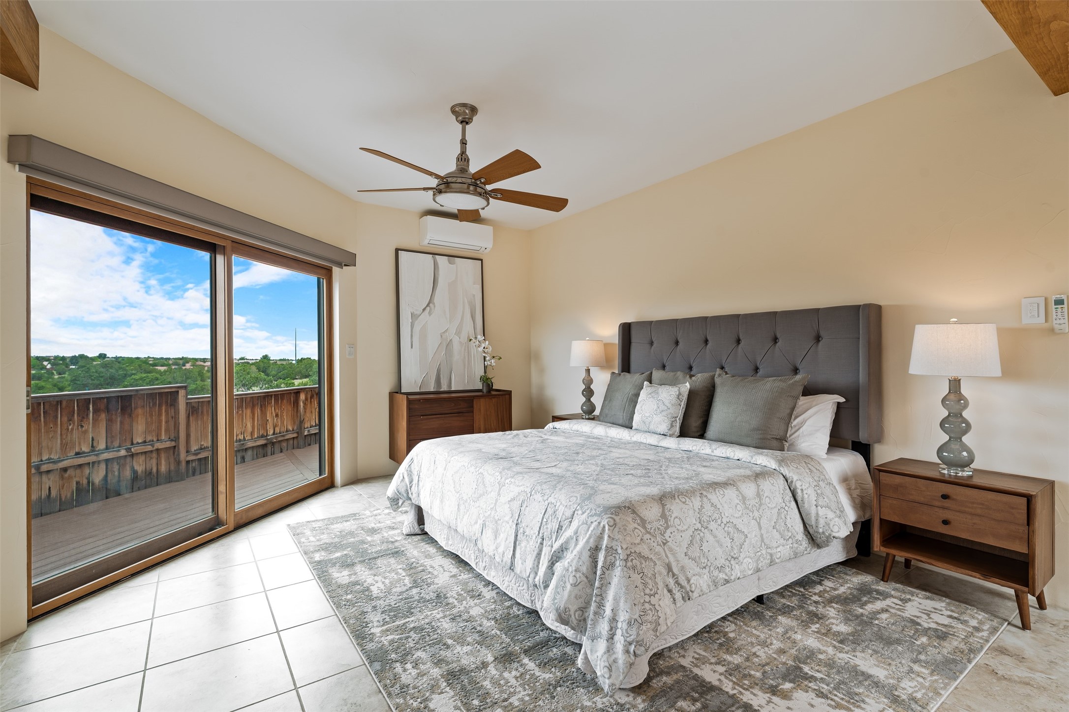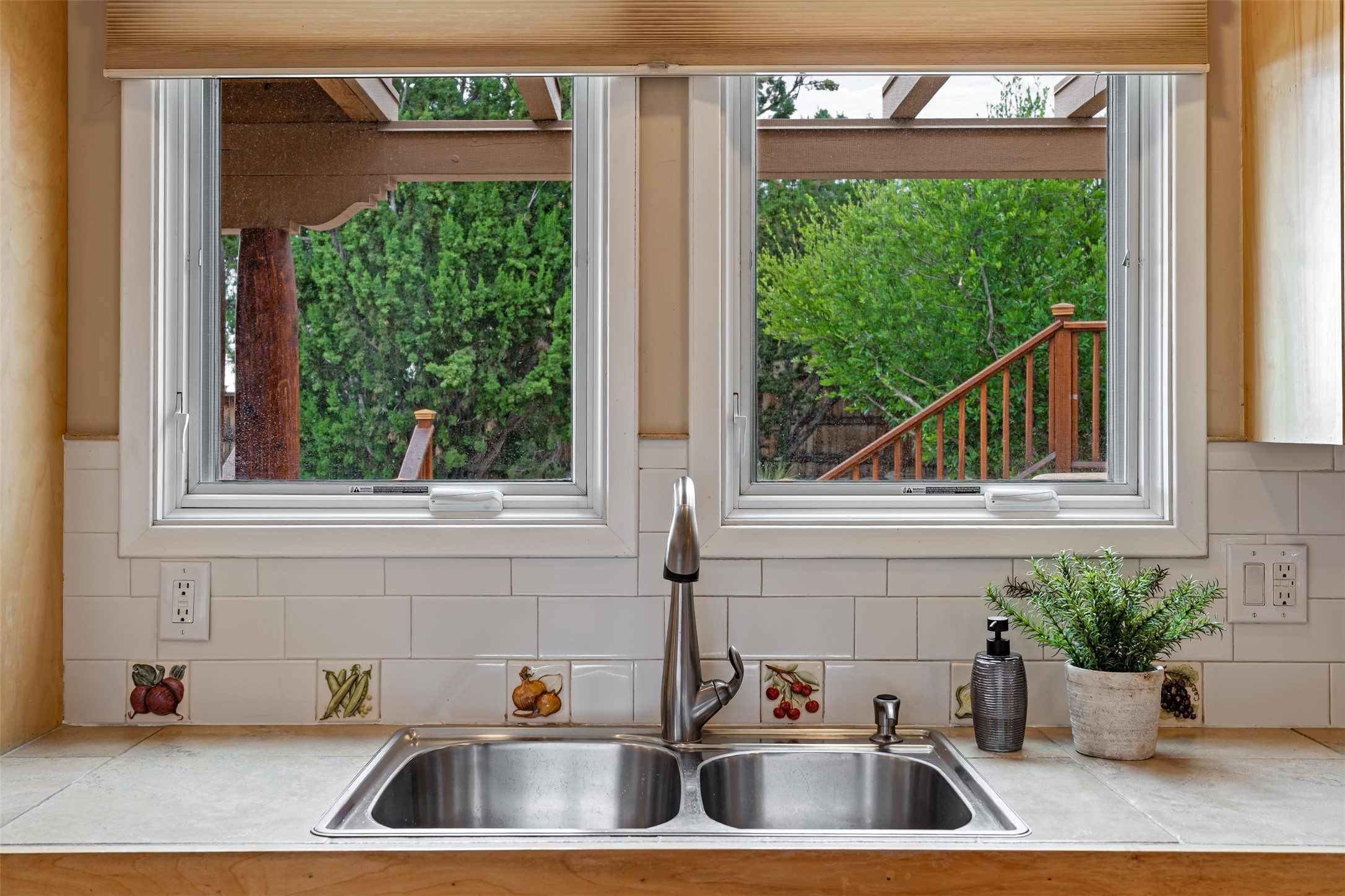 Nestled amid sweeping views and exquisite natural surroundings, this remarkable 4-bedroom, two story, home is a serene and sustainable retreat with a perfect blend of comfort, character, and eco-conscious upgrades. The luxurious, newer (2020) 600 sq ft primary suite on the main floor offers privacy and indulgence, complete with its own mini-split system, a spa-like bathroom, and direct access to outdoor living spaces. Three additional bedrooms are upstairs, where a sunny second-floor deck invites morning coffee or sunset unwinding.Skylights throughout the home bathe the interiors in natural light, highlighting thoughtful details like American clay walls, wood-beamed ceilings, and not one, but two fireplaces--including a charming corner Kiva in the dining room and a striking centerpiece hearth in the living room with a cozy built-in window seat.The bright, eat-in kitchen is a delight with newer appliances, abundant cabinetry, a classic white subway tile backsplash, and views that inspire. Comfort is ensured year-round with two-zone HVAC, refrigerated A/C, mini-splits, and tankless hot water in both upstairs baths.Outside, this home continues to impress with lush xeriscaping, a fenced garden area, and a fully fenced yard. A detached two-car garage includes an extra storage room, while multiple portals and decks provide ideal spots for dining, relaxing, or stargazing. Eco-conscious buyers will appreciate the complete solar electric system and 900-gallon rainwater catchment.This home is a rare find--where views, design, and sustainability come together in perfect harmony.This home is tucked away at the end of a cul-de-sac, with acres of open space and walking trails behind the house. Park Plazas has 8-9 miles of hiking trails, tennis courts, a community garden and is an oasis in the center of Santa Fe close to restaurants, shopping and other amenities, Don't miss this spectacular home in this wonderful neighborhood.