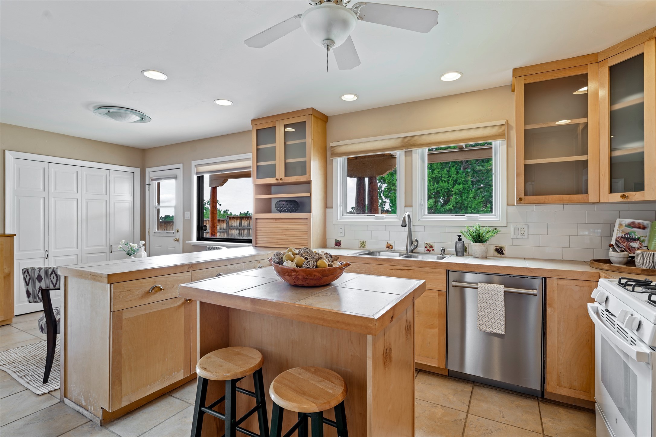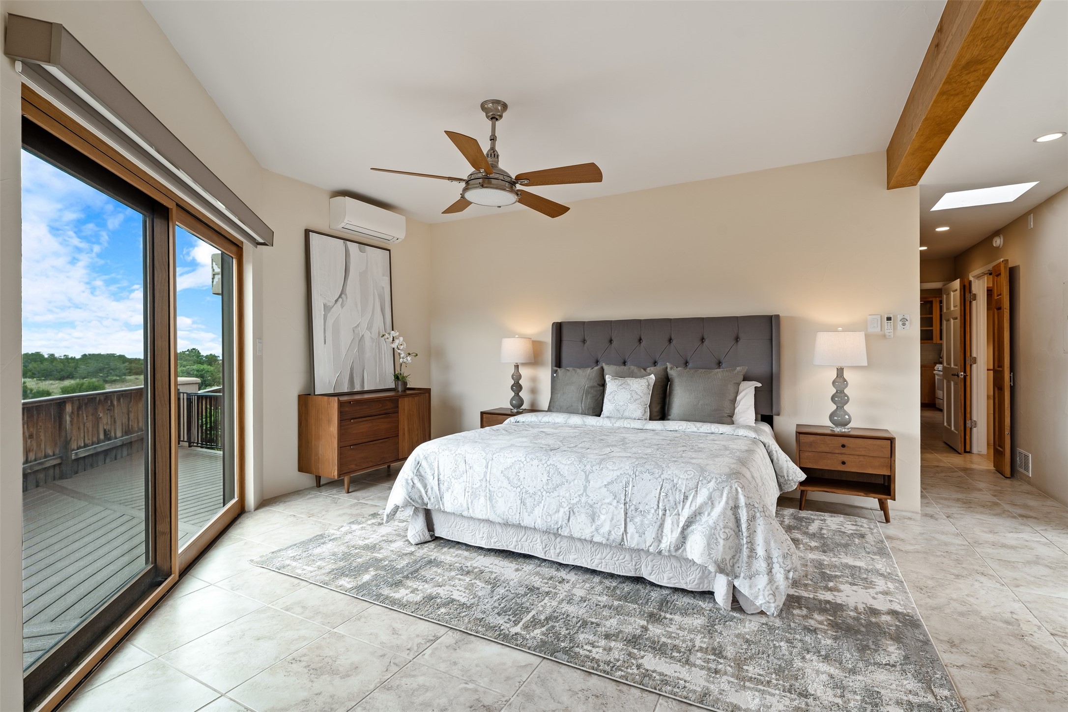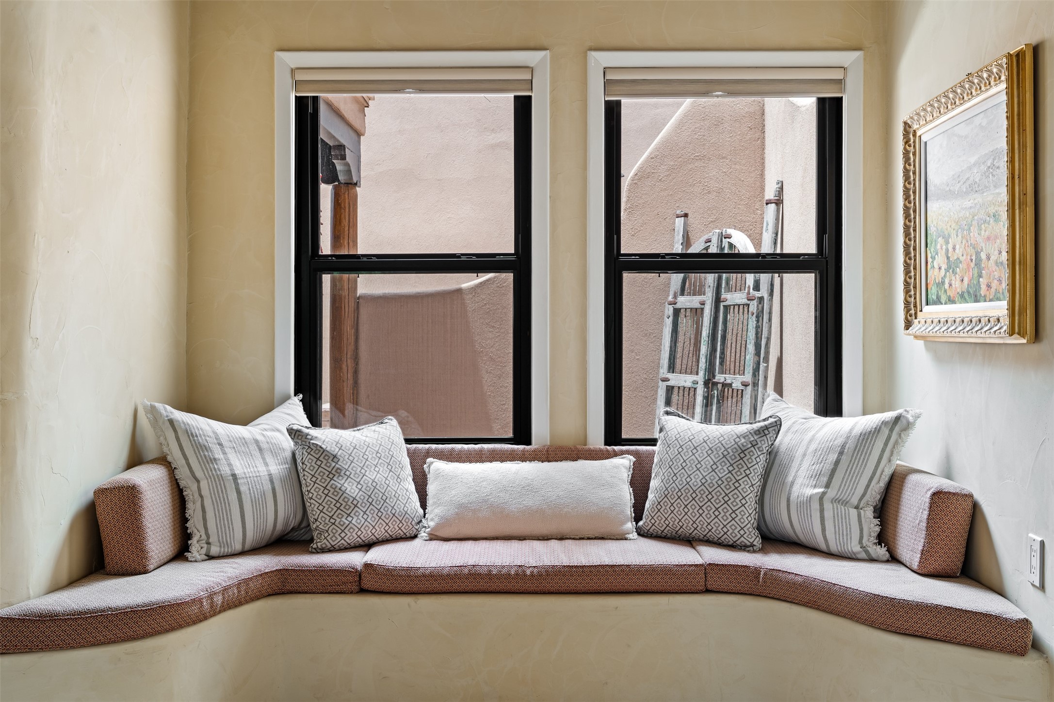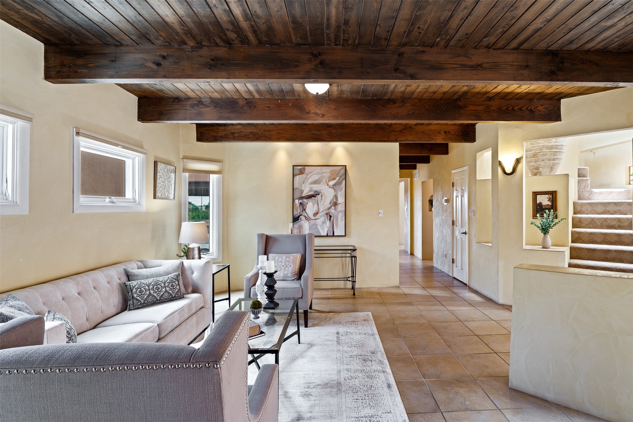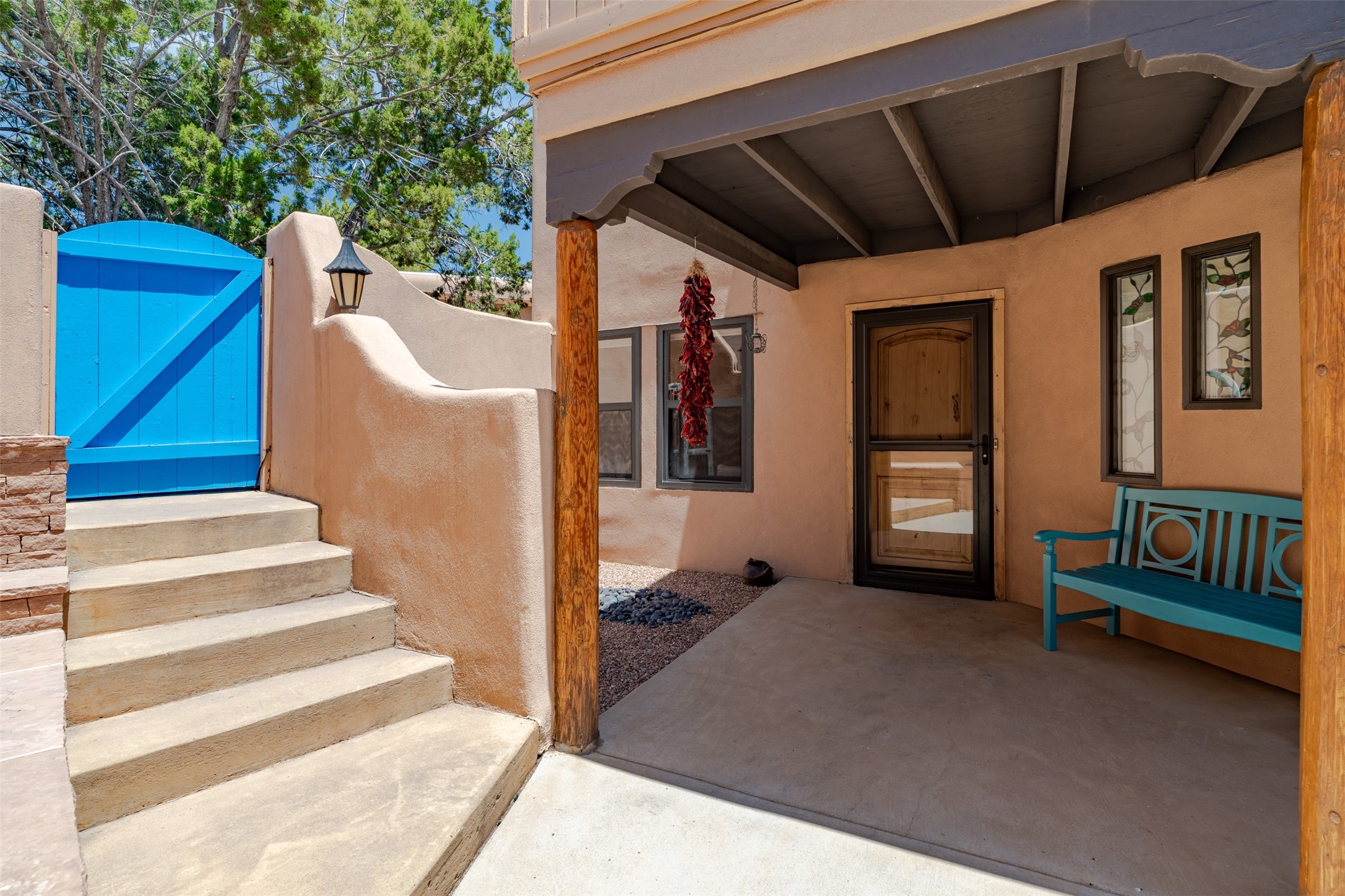 Nestled amid sweeping views and exquisite natural surroundings, this remarkable 4-bedroom, two story, home is a serene and sustainable retreat with a perfect blend of comfort, character, and eco-conscious upgrades. The luxurious, newer (2020) 600 sq ft primary suite on the main floor offers privacy and indulgence, complete with its own mini-split system, a spa-like bathroom, and direct access to outdoor living spaces. Three additional bedrooms are upstairs, where a sunny second-floor deck invites morning coffee or sunset unwinding.Skylights throughout the home bathe the interiors in natural light, highlighting thoughtful details like American clay walls, wood-beamed ceilings, and not one, but two fireplaces--including a charming corner Kiva in the dining room and a striking centerpiece hearth in the living room with a cozy built-in window seat.The bright, eat-in kitchen is a delight with newer appliances, abundant cabinetry, a classic white subway tile backsplash, and views that inspire. Comfort is ensured year-round with two-zone HVAC, refrigerated A/C, mini-splits, and tankless hot water in both upstairs baths.Outside, this home continues to impress with lush xeriscaping, a fenced garden area, and a fully fenced yard. A detached two-car garage includes an extra storage room, while multiple portals and decks provide ideal spots for dining, relaxing, or stargazing. Eco-conscious buyers will appreciate the complete solar electric system and 900-gallon rainwater catchment.This home is a rare find--where views, design, and sustainability come together in perfect harmony.This home is tucked away at the end of a cul-de-sac, with acres of open space and walking trails behind the house. Park Plazas has 8-9 miles of hiking trails, tennis courts, a community garden and is an oasis in the center of Santa Fe close to restaurants, shopping and other amenities, Don't miss this spectacular home in this wonderful neighborhood.