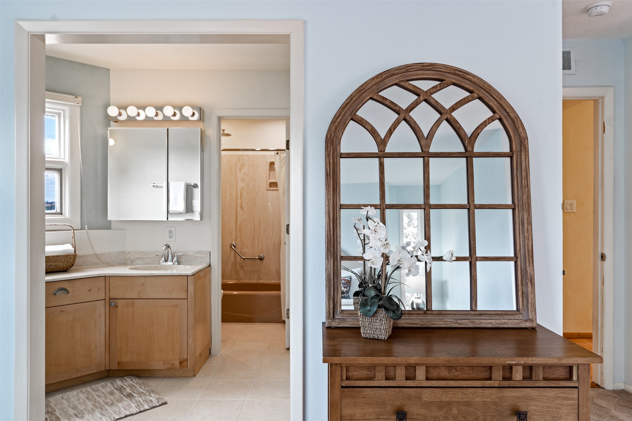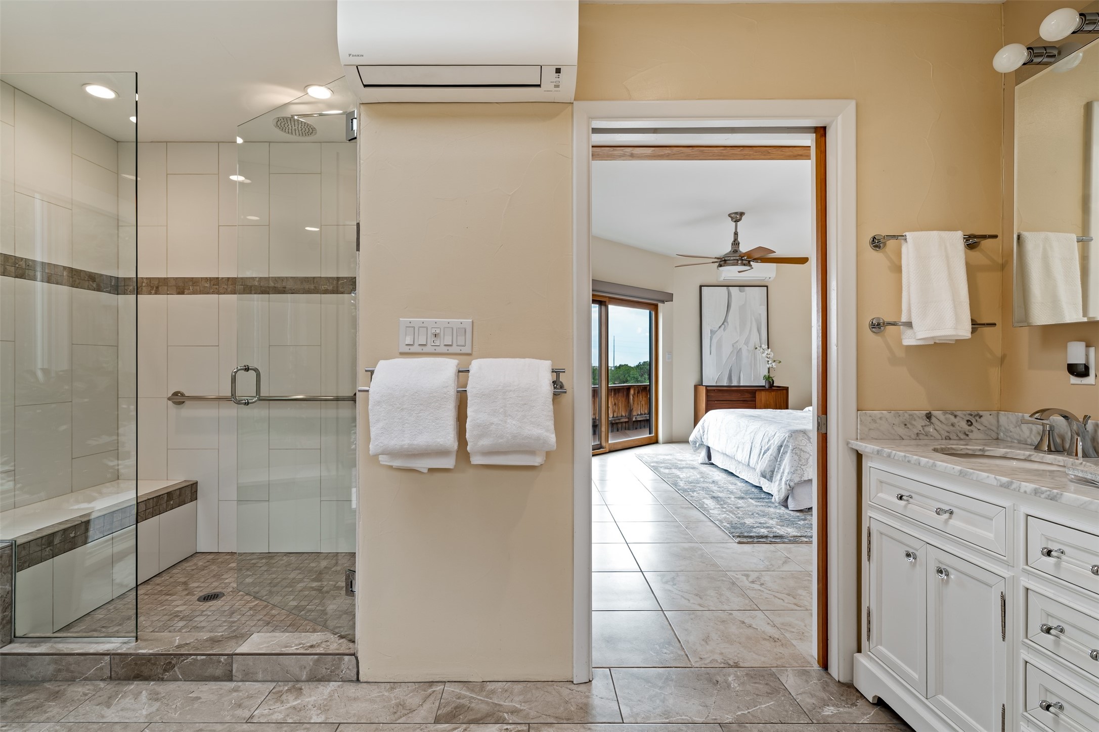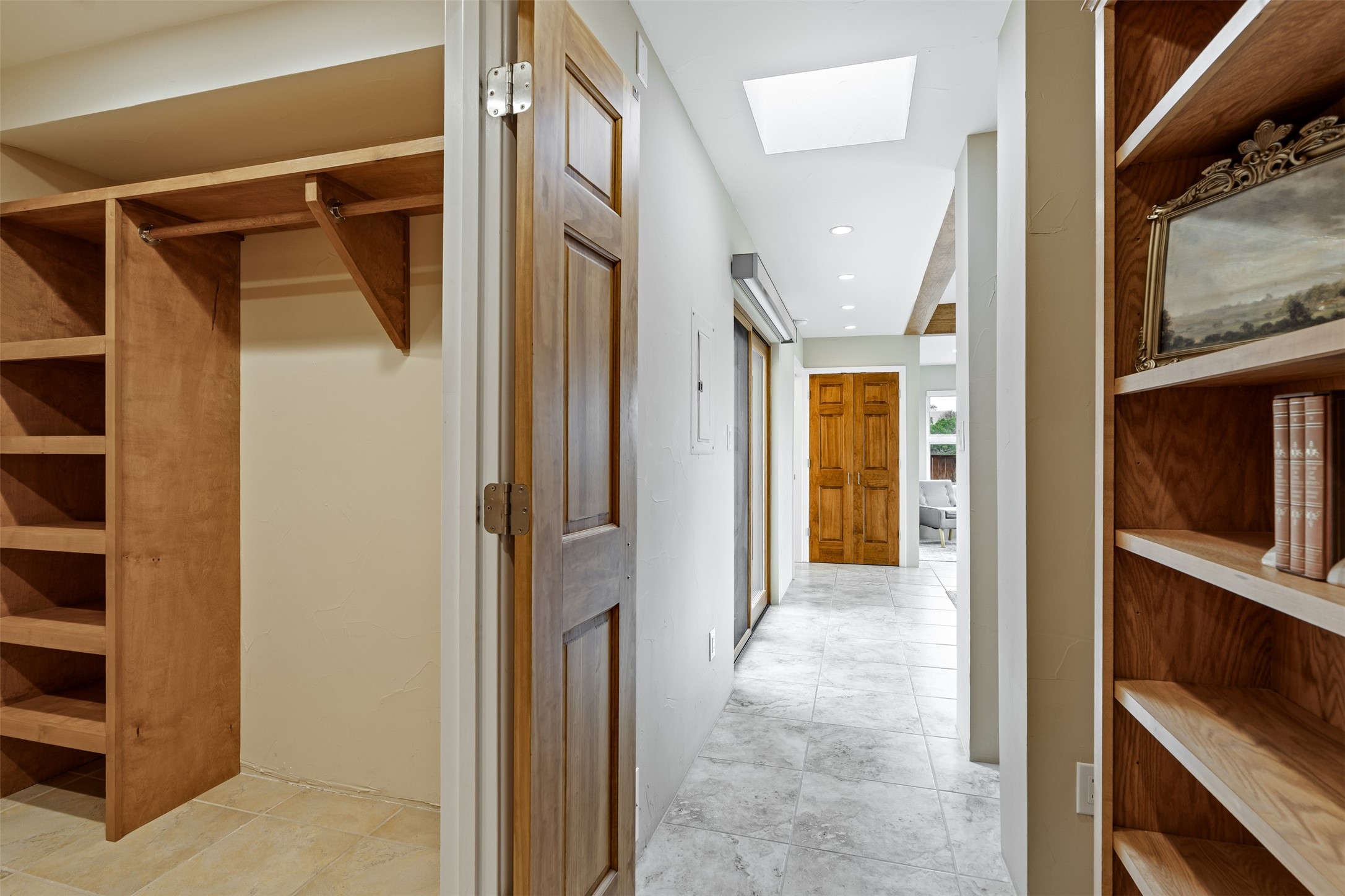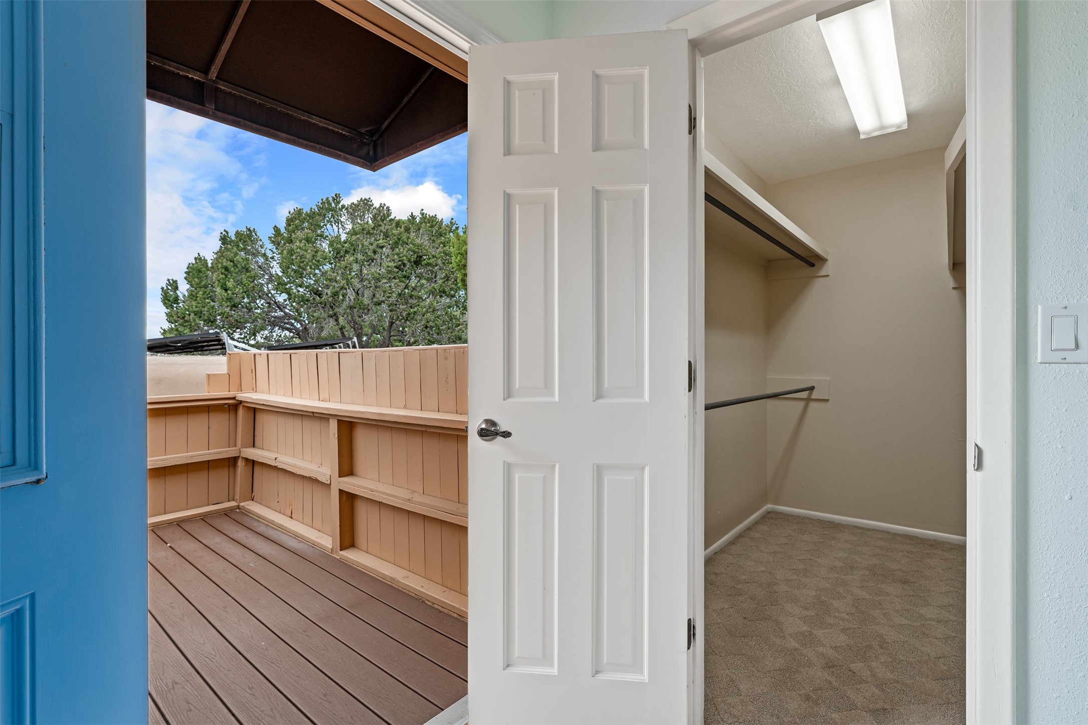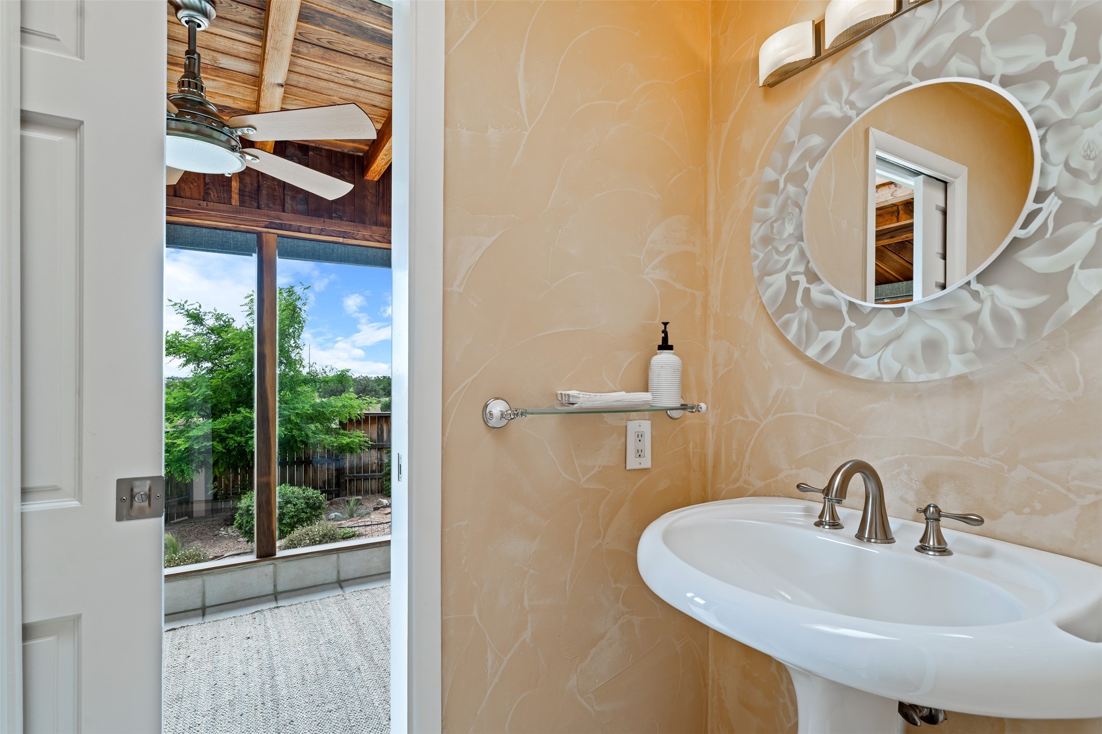 Nestled amid sweeping views and exquisite natural surroundings, this remarkable 4-bedroom, two story, home is a serene and sustainable retreat with a perfect blend of comfort, character, and eco-conscious upgrades. The luxurious, newer (2020) 600 sq ft primary suite on the main floor offers privacy and indulgence, complete with its own mini-split system, a spa-like bathroom, and direct access to outdoor living spaces. Three additional bedrooms are upstairs, where a sunny second-floor deck invites morning coffee or sunset unwinding.Skylights throughout the home bathe the interiors in natural light, highlighting thoughtful details like American clay walls, wood-beamed ceilings, and not one, but two fireplaces--including a charming corner Kiva in the dining room and a striking centerpiece hearth in the living room with a cozy built-in window seat.The bright, eat-in kitchen is a delight with newer appliances, abundant cabinetry, a classic white subway tile backsplash, and views that inspire. Comfort is ensured year-round with two-zone HVAC, refrigerated A/C, mini-splits, and tankless hot water in both upstairs baths.Outside, this home continues to impress with lush xeriscaping, a fenced garden area, and a fully fenced yard. A detached two-car garage includes an extra storage room, while multiple portals and decks provide ideal spots for dining, relaxing, or stargazing. Eco-conscious buyers will appreciate the complete solar electric system and 900-gallon rainwater catchment.This home is a rare find--where views, design, and sustainability come together in perfect harmony.This home is tucked away at the end of a cul-de-sac, with acres of open space and walking trails behind the house. Park Plazas has 8-9 miles of hiking trails, tennis courts, a community garden and is an oasis in the center of Santa Fe close to restaurants, shopping and other amenities, Don't miss this spectacular home in this wonderful neighborhood.