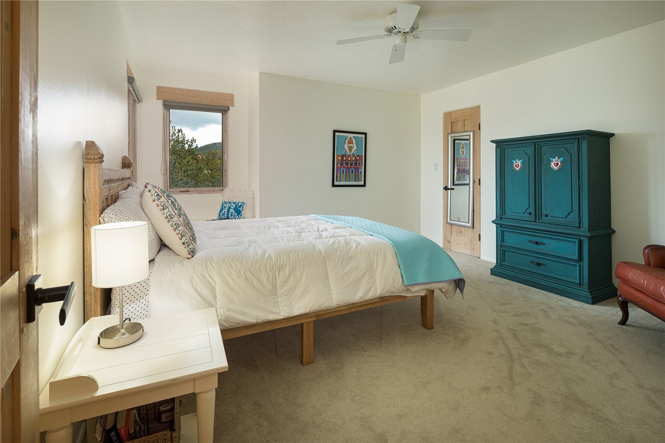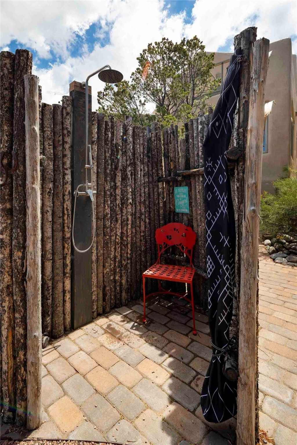 Set in the North Hills above Historic downtown Santa Fe, this serene, sophisticated home is an expressive mix of Soft Contemporary and Traditional styles. Gorgeous hardwood floors sweep from the foyer through the living/dining area with its double-sided kiva fireplace and adjacent deck. The kitchen continues the home's handsome palette with chocolate-colored countertops, maple cabinets and a sun-bathed alcove for casual meals. A few steps down from the kitchen is a den, with adjacent Laundry/Mudroom and double-door access to the sheltered back patio. A sleek, custom staircase leads to the home's four bedrooms. A soothing sanctuary, the Primary bedroom has a coved ceiling, fireplace, private view deck and ensuite, remodeled bath with walk-in, glass-walled shower. In the back garden, a moss rock wall borders an expansive, paver patio, with water feature. The atmosphere turns magical as the path glides toward the lower garden with its outdoor shower and hot tub. A new, high-efficiency boiler, solar and on-demand hot water heater add to the appeal of this refined offering. Residents of the Estancia Primera community enjoy an outdoor pool, tennis courts, and clubhouse. Walking trails enable quick access to downtown. Hiking trails and the Ski Basin are a short drive away.