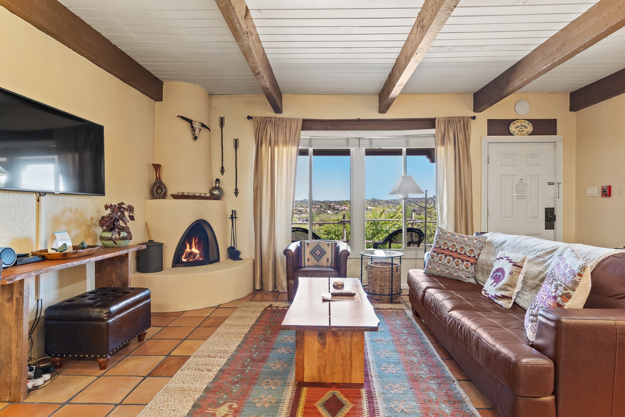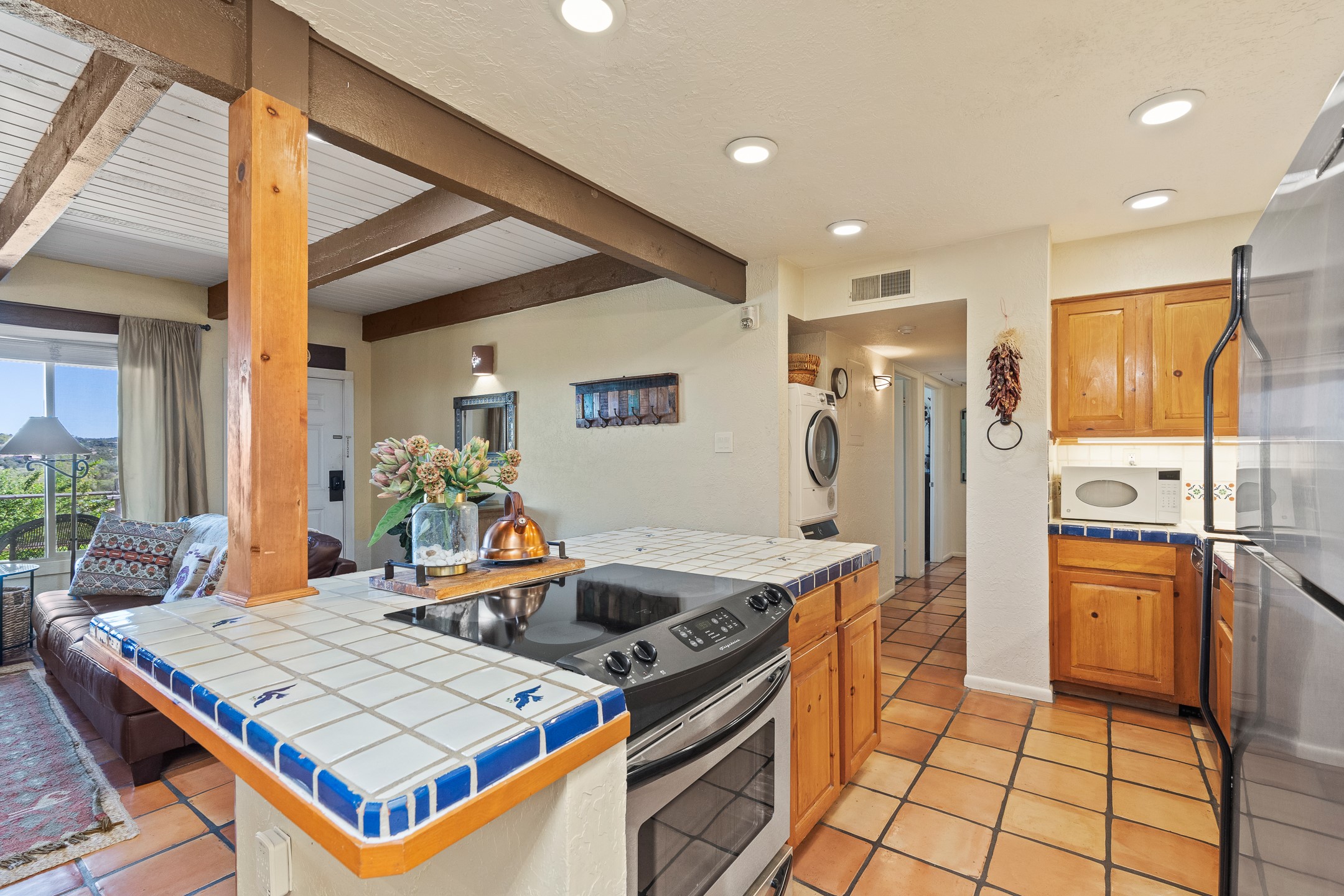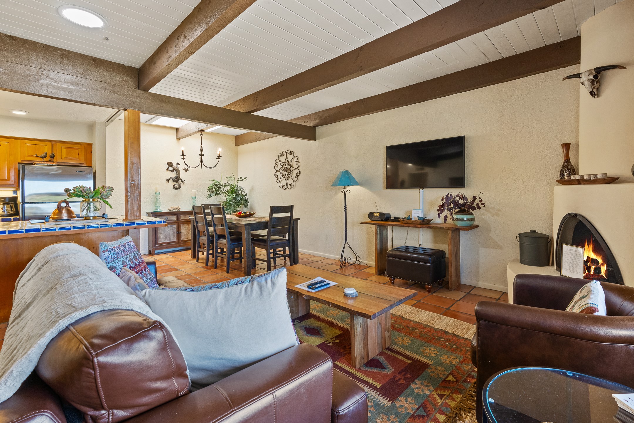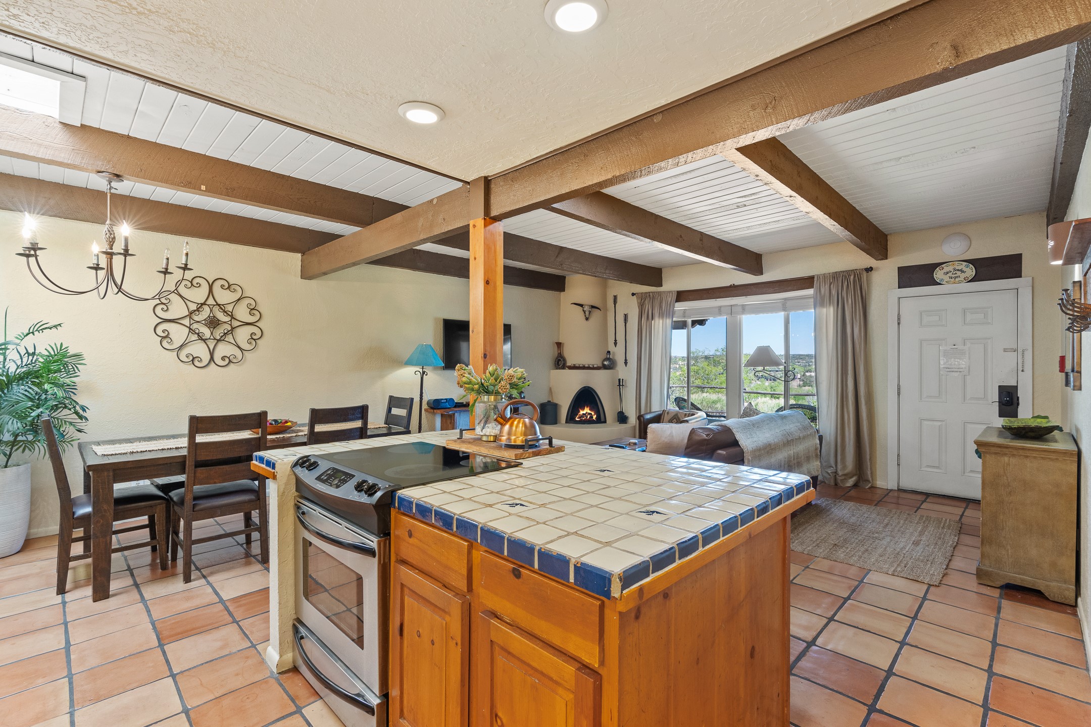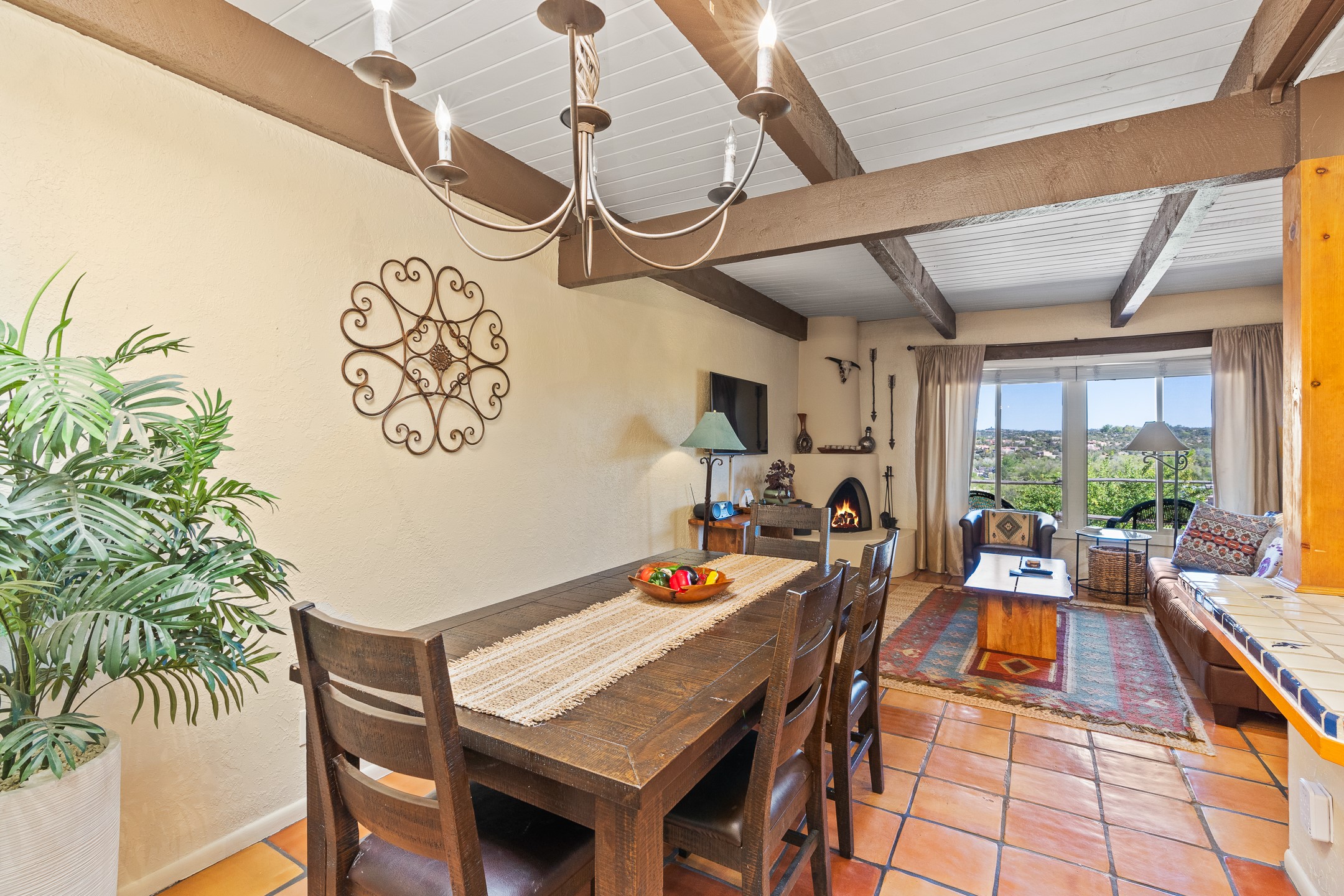 Walk to the plaza from this extremely comfortable single level, 2 bedroom, 2 bath condo with sweeping views! Also has convenient, nearby parking, with NO STEPS! All tile flooring throughout, NO carpeting, beamed ceiling in LR, custom tile countertops and showers. Hand-made cabinets too. Skylights and large, new windows bring in lots of natural light. Stay cozy on cool nights with the wood burning kiva, and cool in the warmer months with the new central refrigerated air-conditioning. This condo offers hard to find amenities in the downtown area: ample parking, easy access, awesome views, single level living, all appliances, including Bosch washer/dryer, and ALL FURNISHINGS INCLUDED!. Perfect vacation home, or full-time residence. On-site management offers a short-term vacation rental program. HOA does not restrict rentals. New roof in 2024. New HVAC in 2025.