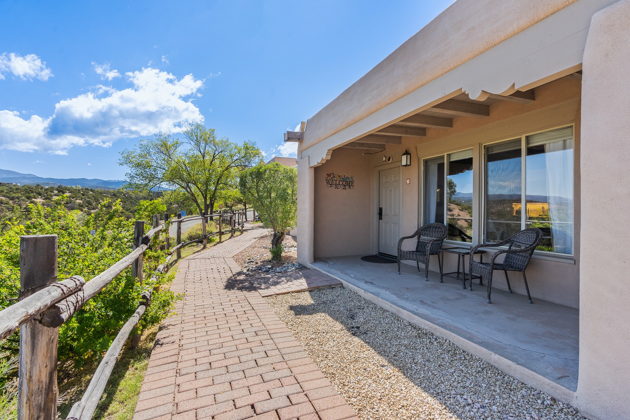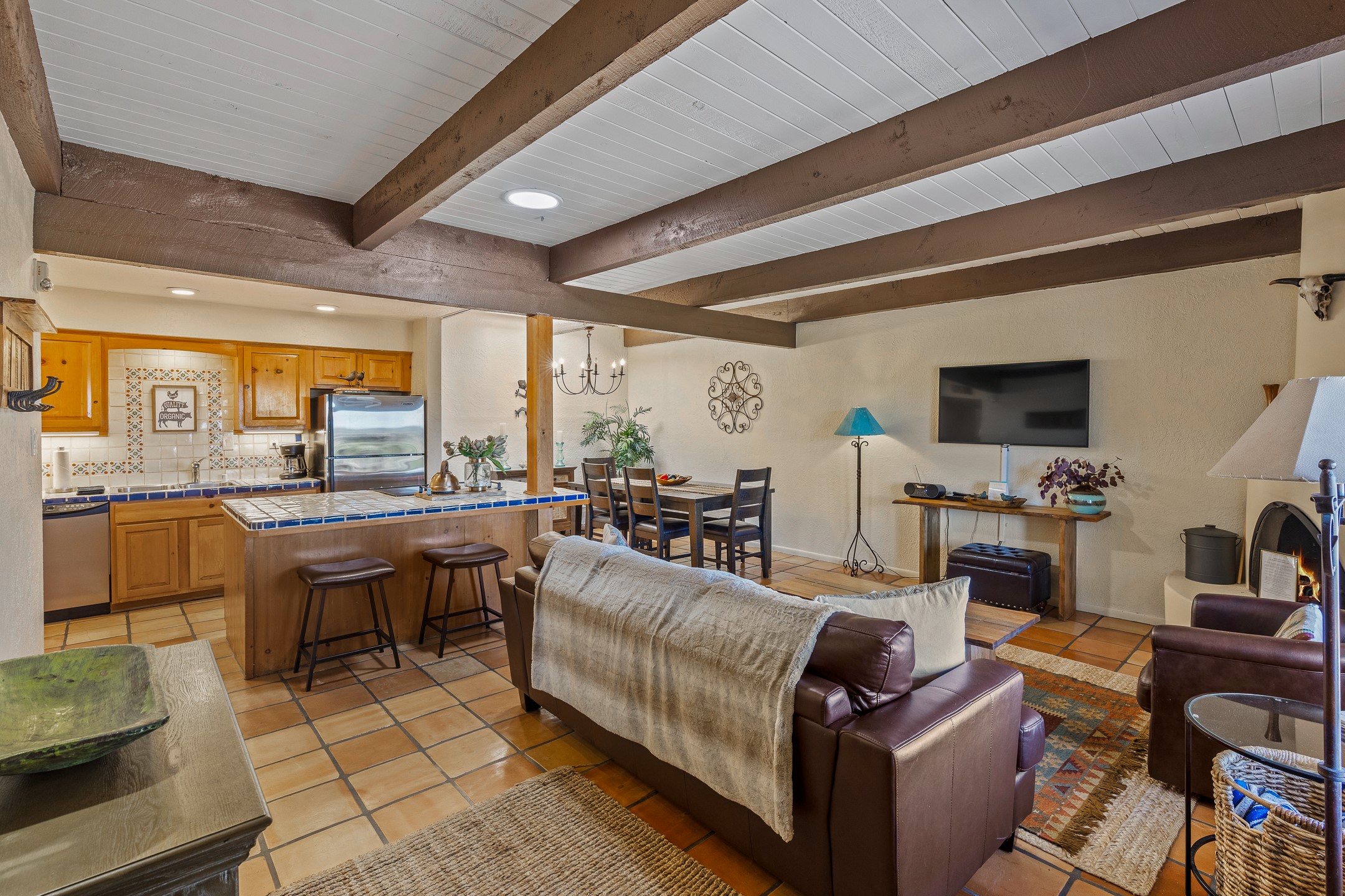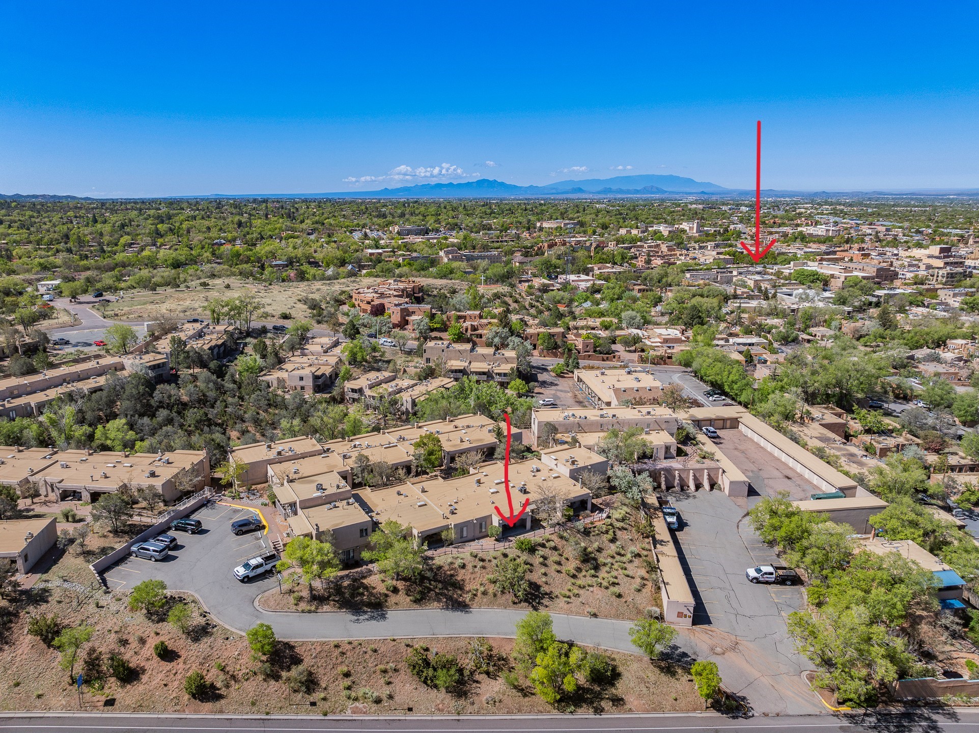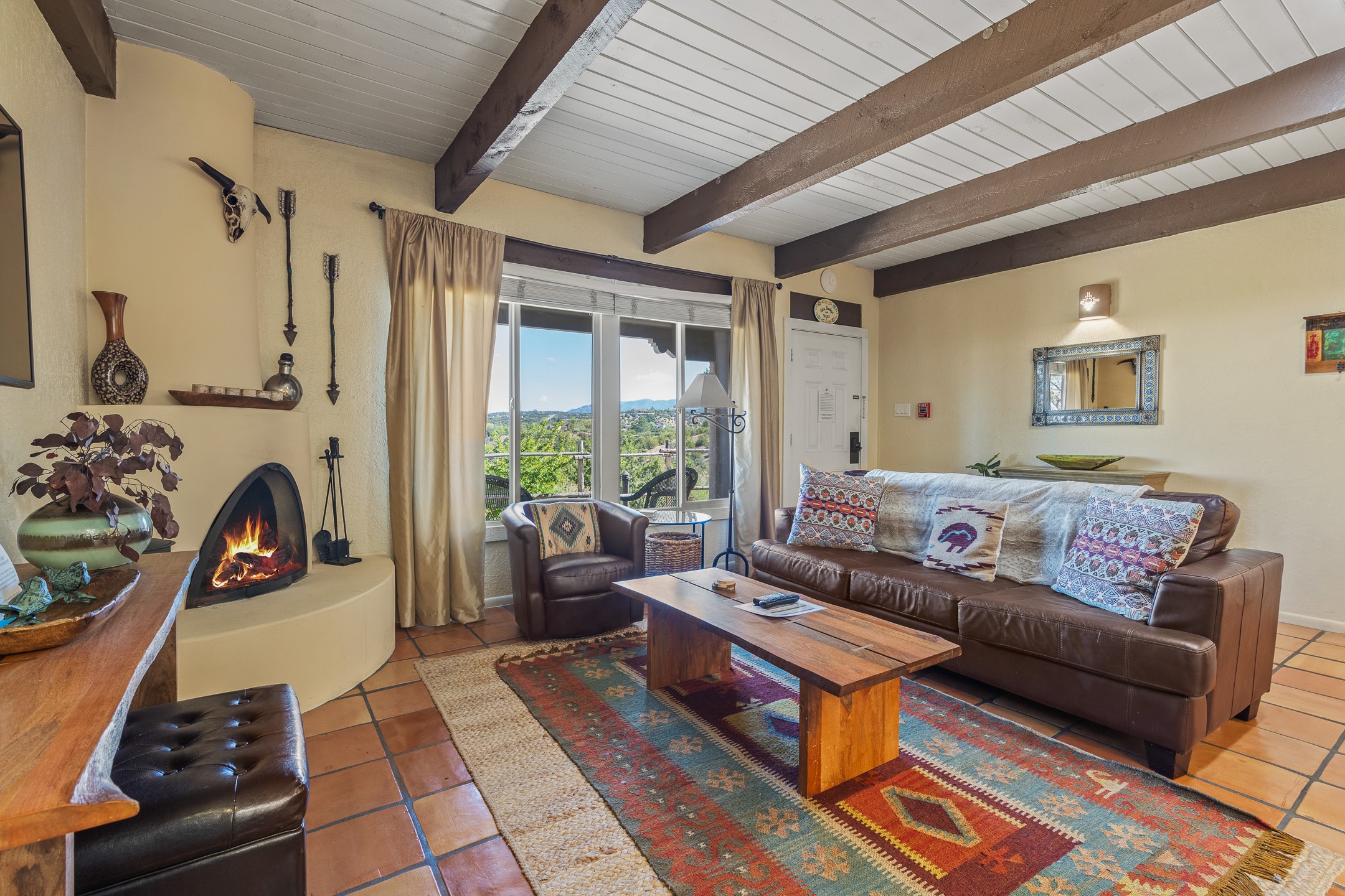 Walk to the plaza from this extremely comfortable single level, 2 bedroom, 2 bath condo with sweeping views! Also has convenient, nearby parking, with NO STEPS! All tile flooring throughout, NO carpeting, beamed ceiling in LR, custom tile countertops and showers. Hand-made cabinets too. Skylights and large, new windows bring in lots of natural light. Stay cozy on cool nights with the wood burning kiva, and cool in the warmer months with the new central refrigerated air-conditioning. This condo offers hard to find amenities in the downtown area: ample parking, easy access, awesome views, single level living, all appliances, including Bosch washer/dryer, and ALL FURNISHINGS INCLUDED!. Perfect vacation home, or full-time residence. On-site management offers a short-term vacation rental program. HOA does not restrict rentals. New roof in 2024. New HVAC in 2025.