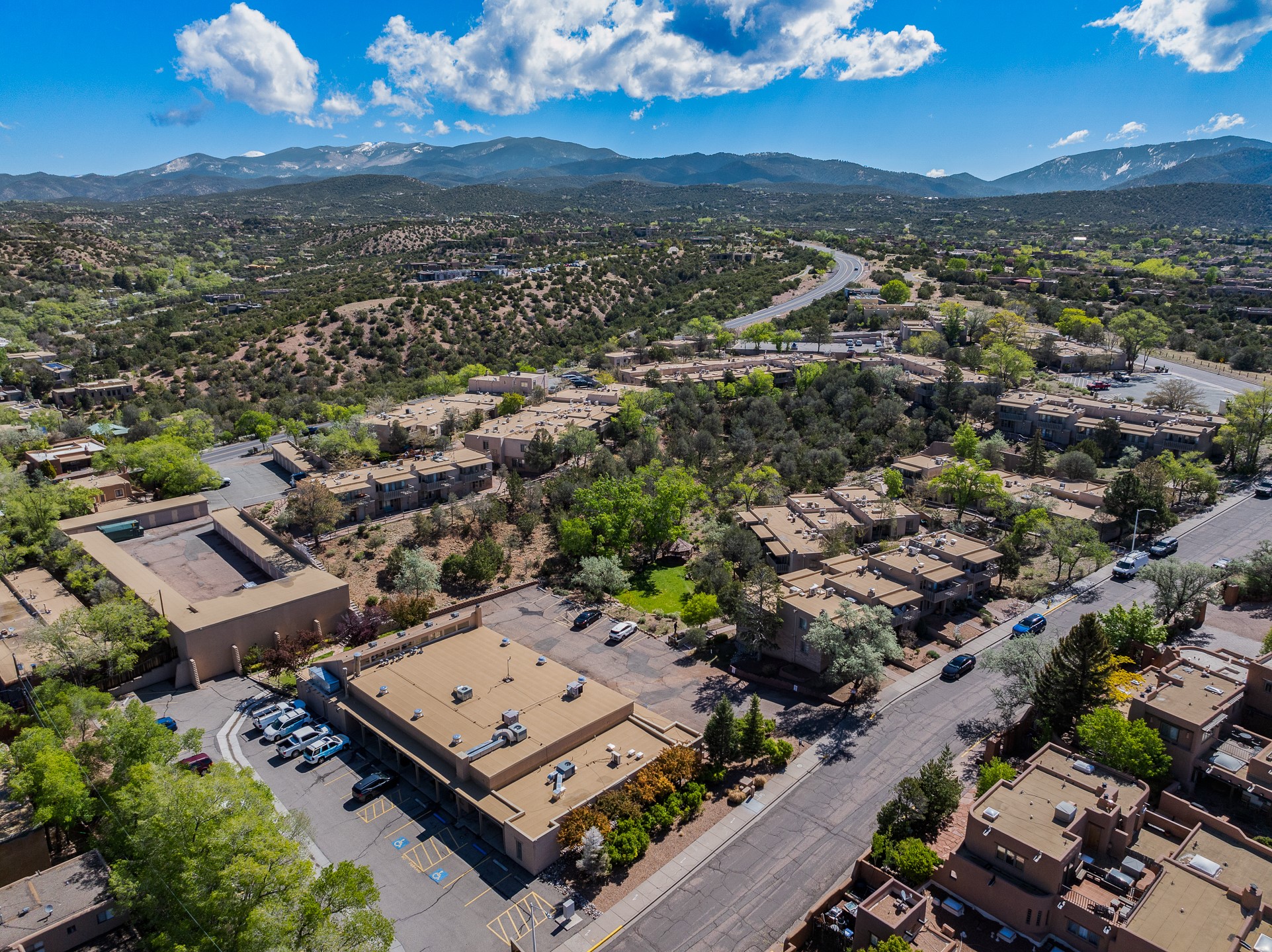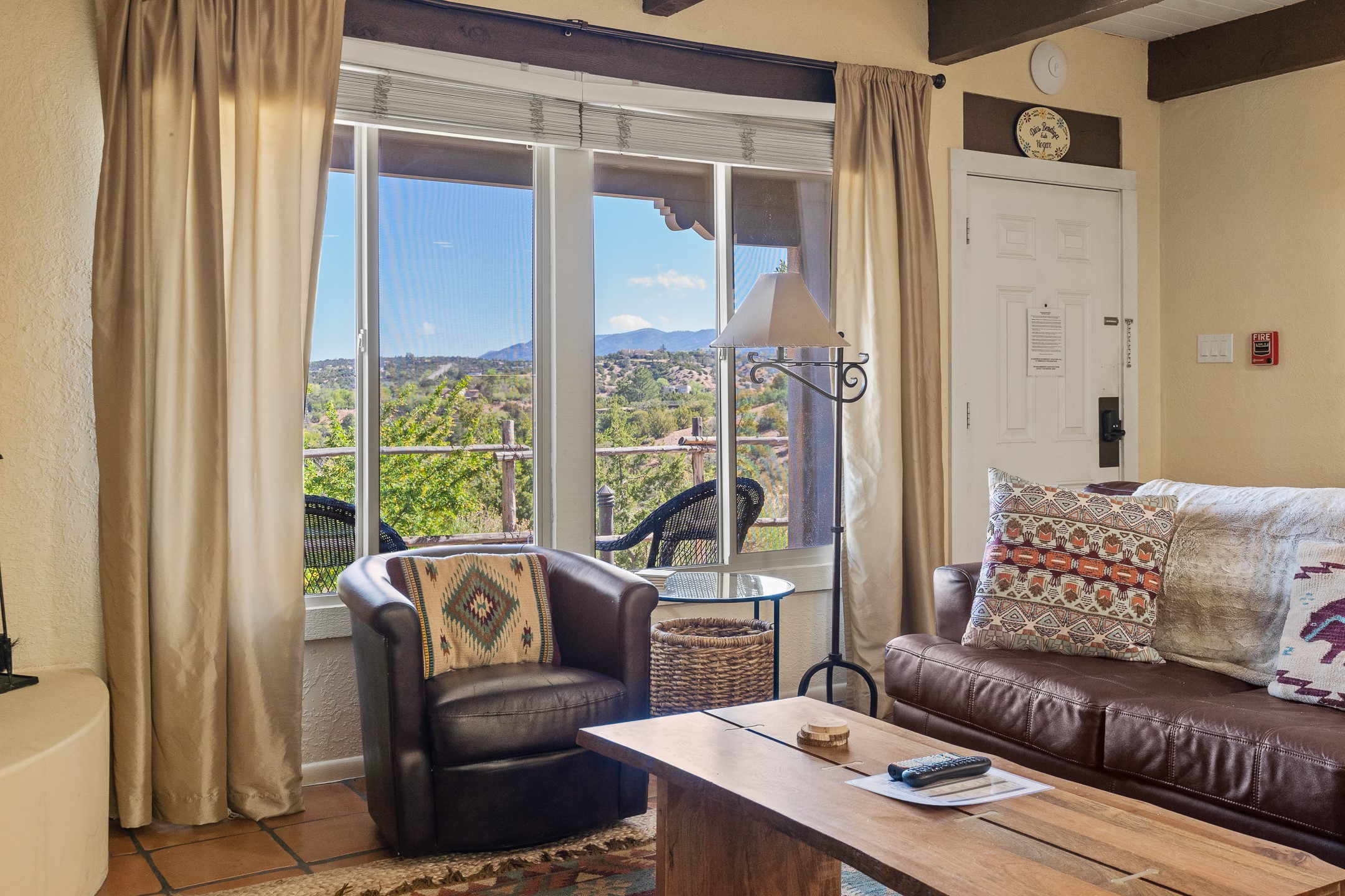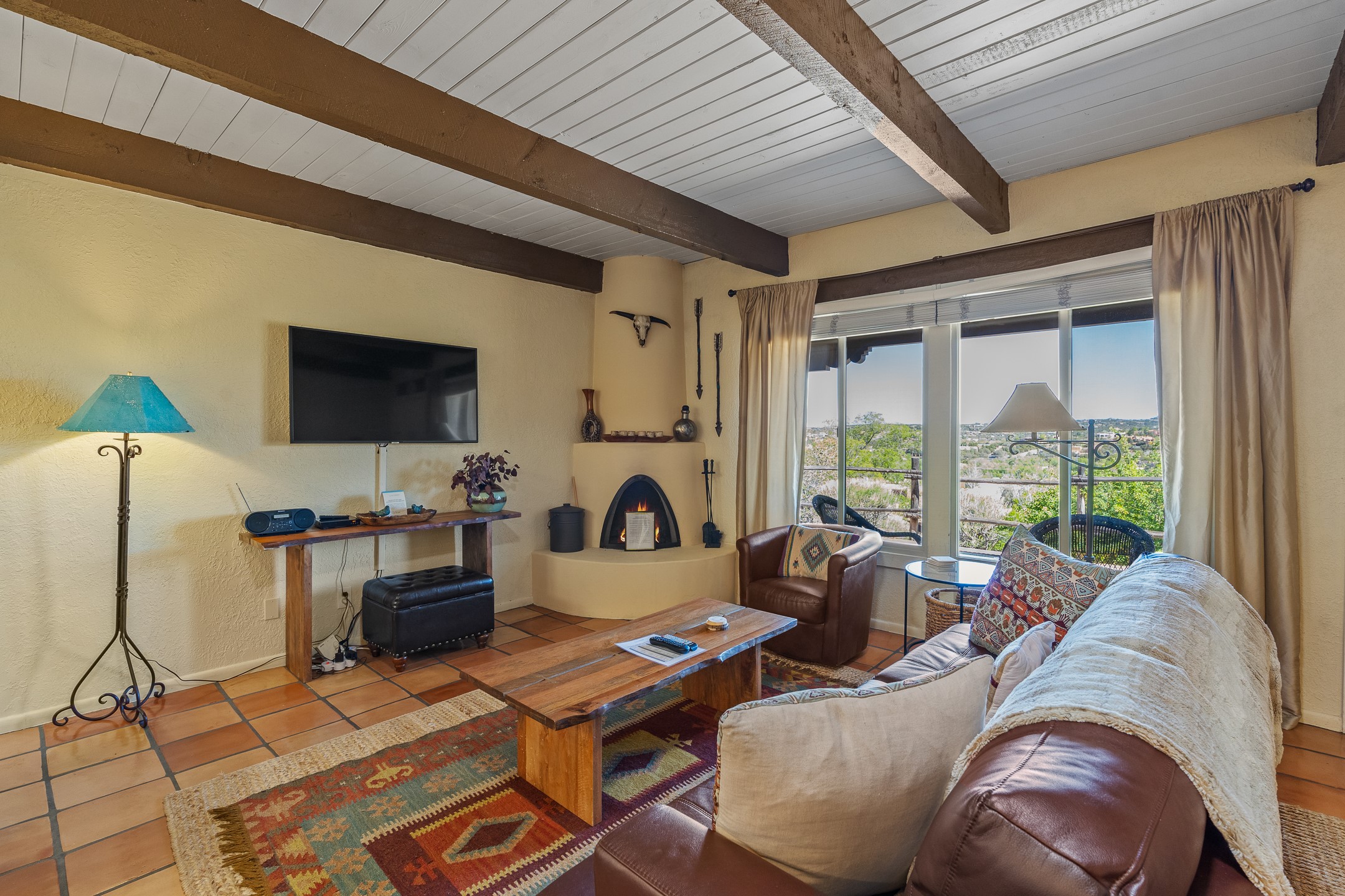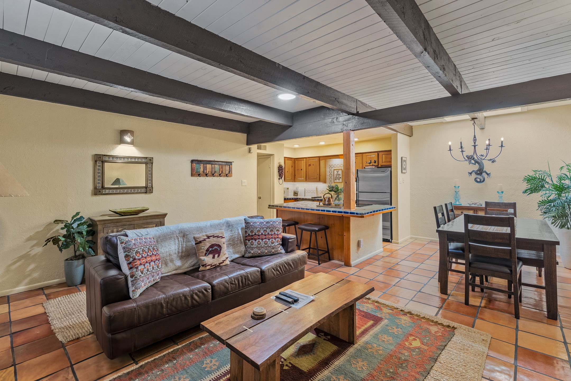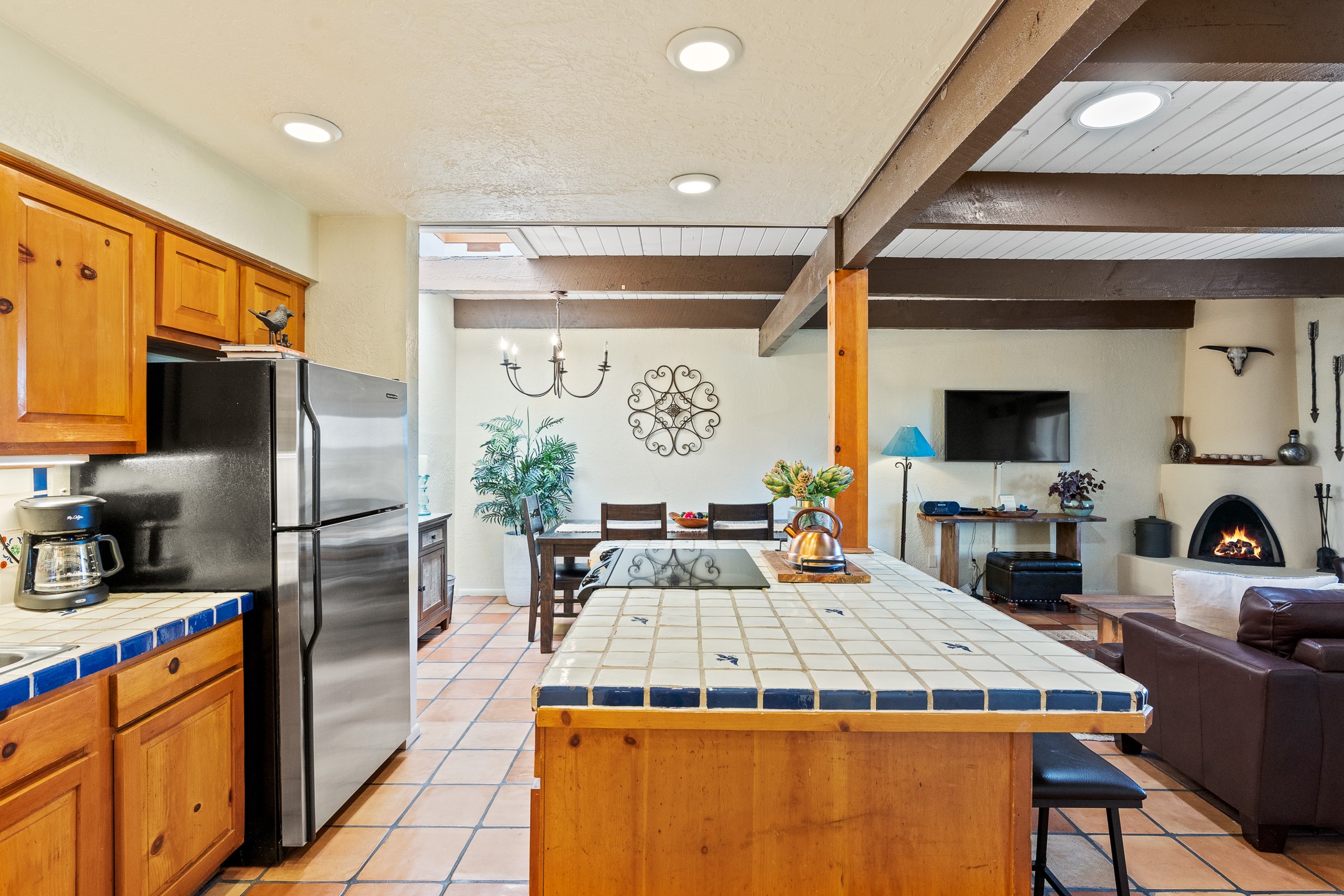 Walk to the plaza from this extremely comfortable single level, 2 bedroom, 2 bath condo with sweeping views! Also has convenient, nearby parking, with NO STEPS! All tile flooring throughout, NO carpeting, beamed ceiling in LR, custom tile countertops and showers. Hand-made cabinets too. Skylights and large, new windows bring in lots of natural light. Stay cozy on cool nights with the wood burning kiva, and cool in the warmer months with the new central refrigerated air-conditioning. This condo offers hard to find amenities in the downtown area: ample parking, easy access, awesome views, single level living, all appliances, including Bosch washer/dryer, and ALL FURNISHINGS INCLUDED!. Perfect vacation home, or full-time residence. On-site management offers a short-term vacation rental program. HOA does not restrict rentals. New roof in 2024. New HVAC in 2025.