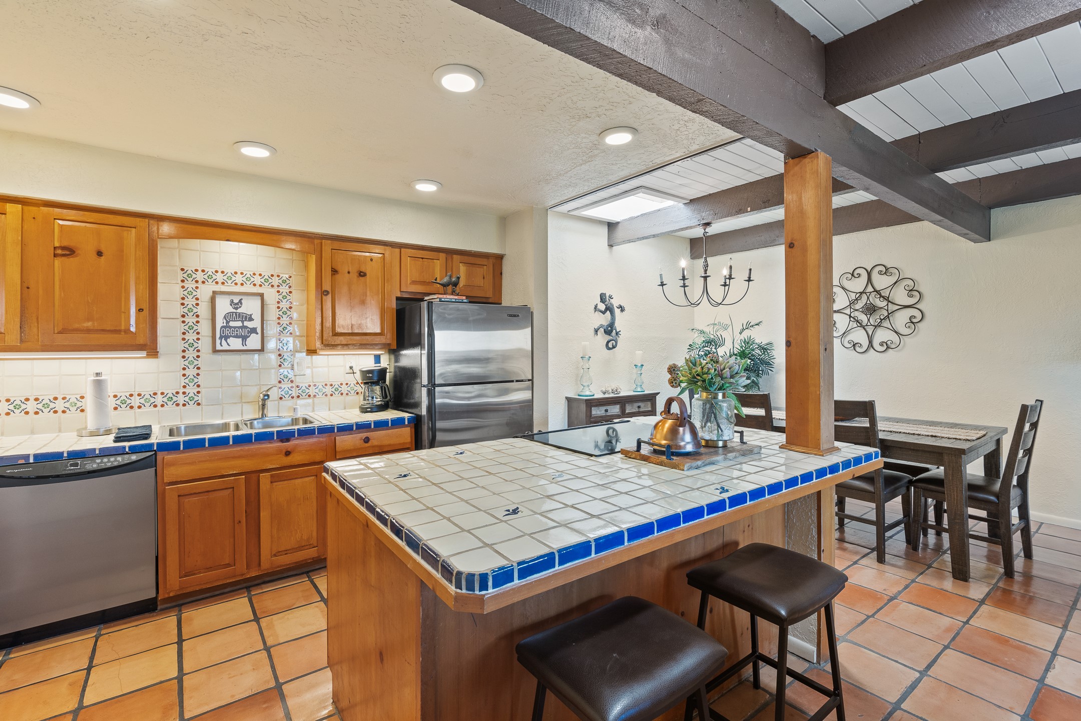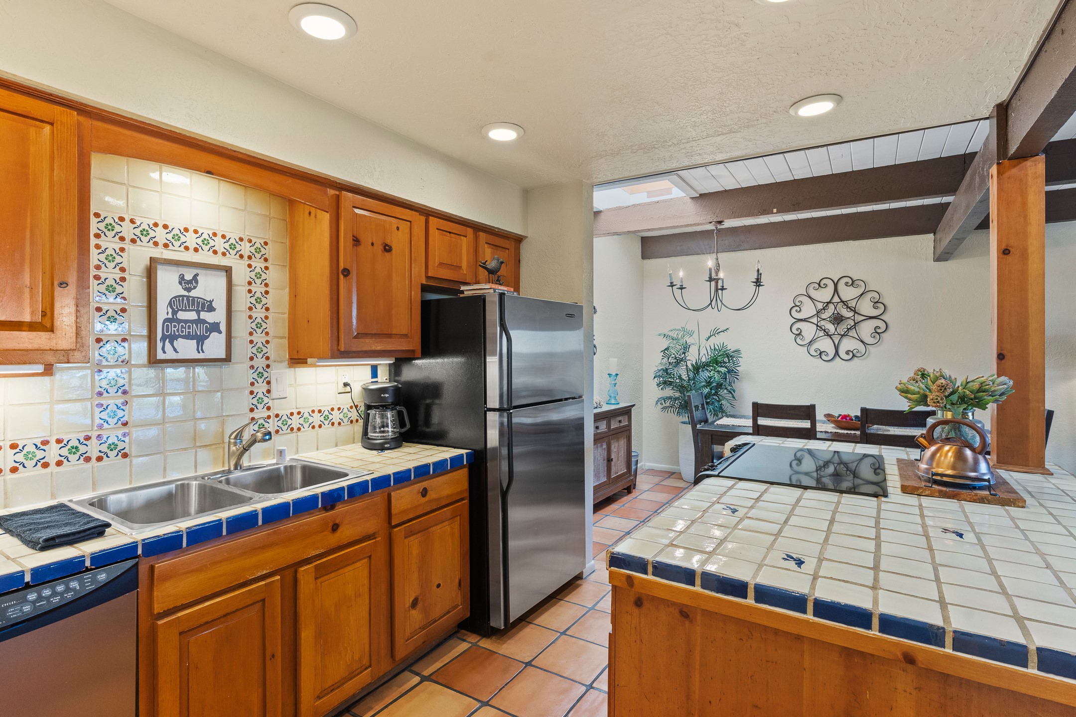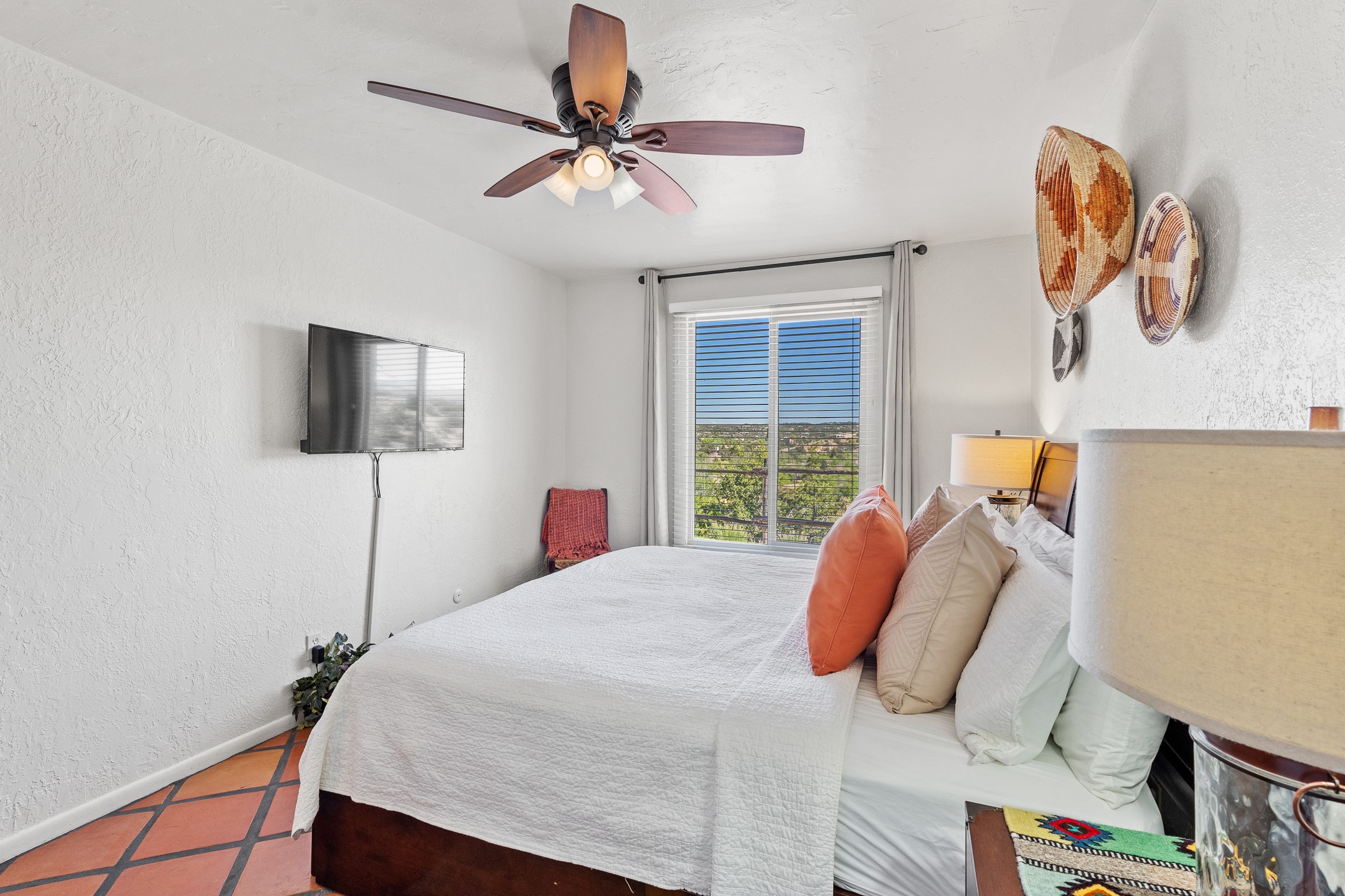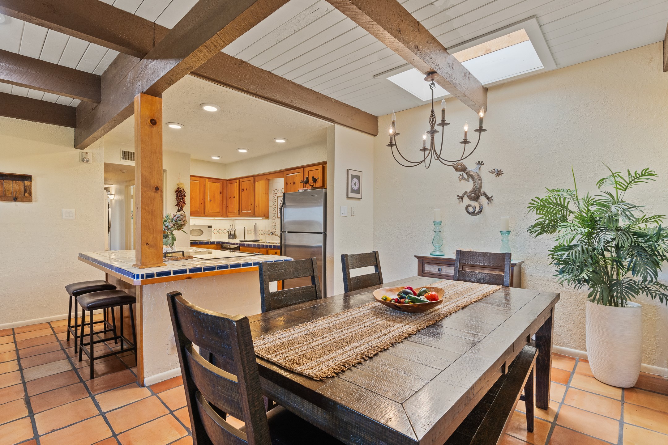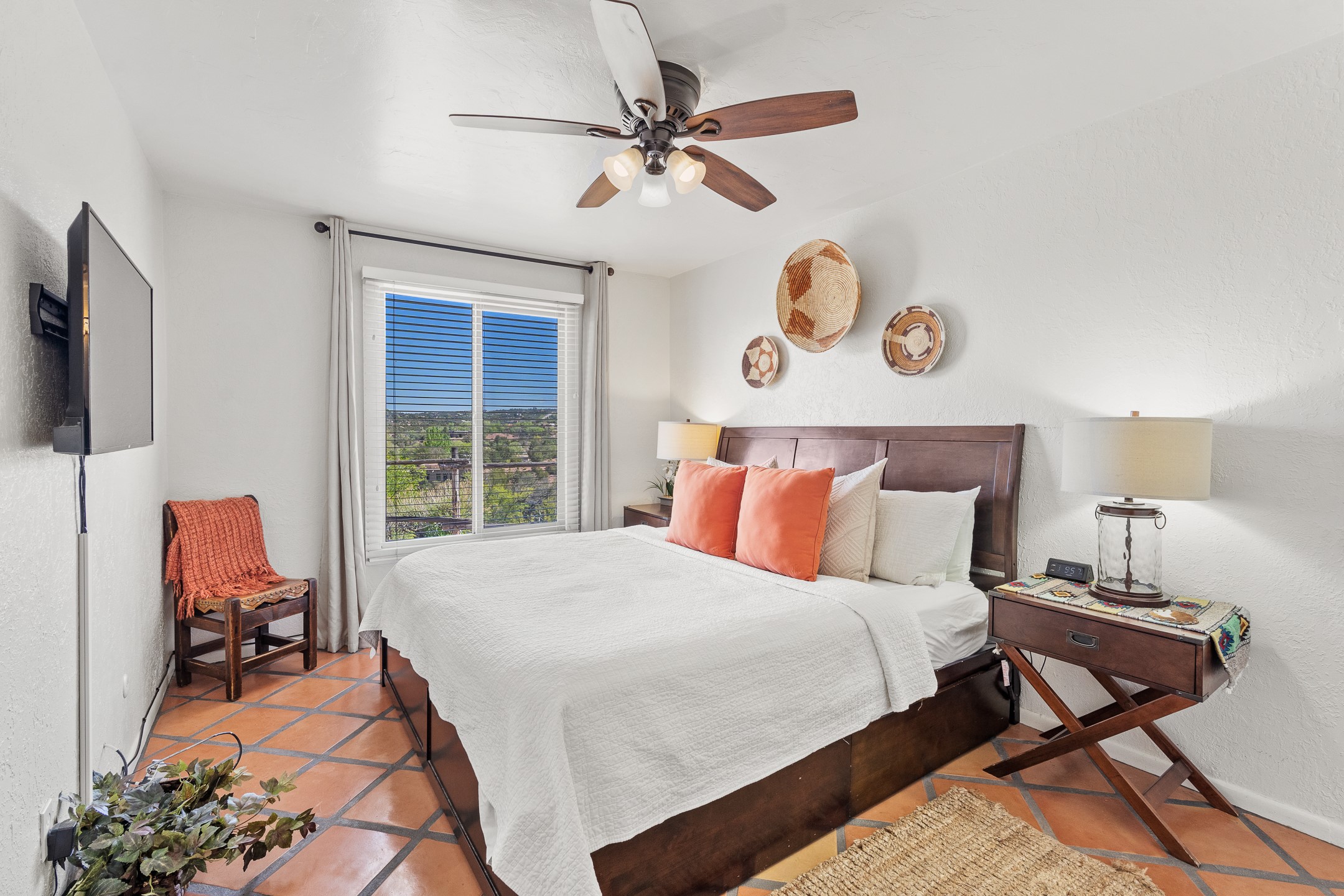 Walk to the plaza from this extremely comfortable single level, 2 bedroom, 2 bath condo with sweeping views! Also has convenient, nearby parking, with NO STEPS! All tile flooring throughout, NO carpeting, beamed ceiling in LR, custom tile countertops and showers. Hand-made cabinets too. Skylights and large, new windows bring in lots of natural light. Stay cozy on cool nights with the wood burning kiva, and cool in the warmer months with the new central refrigerated air-conditioning. This condo offers hard to find amenities in the downtown area: ample parking, easy access, awesome views, single level living, all appliances, including Bosch washer/dryer, and ALL FURNISHINGS INCLUDED!. Perfect vacation home, or full-time residence. On-site management offers a short-term vacation rental program. HOA does not restrict rentals. New roof in 2024. New HVAC in 2025.
