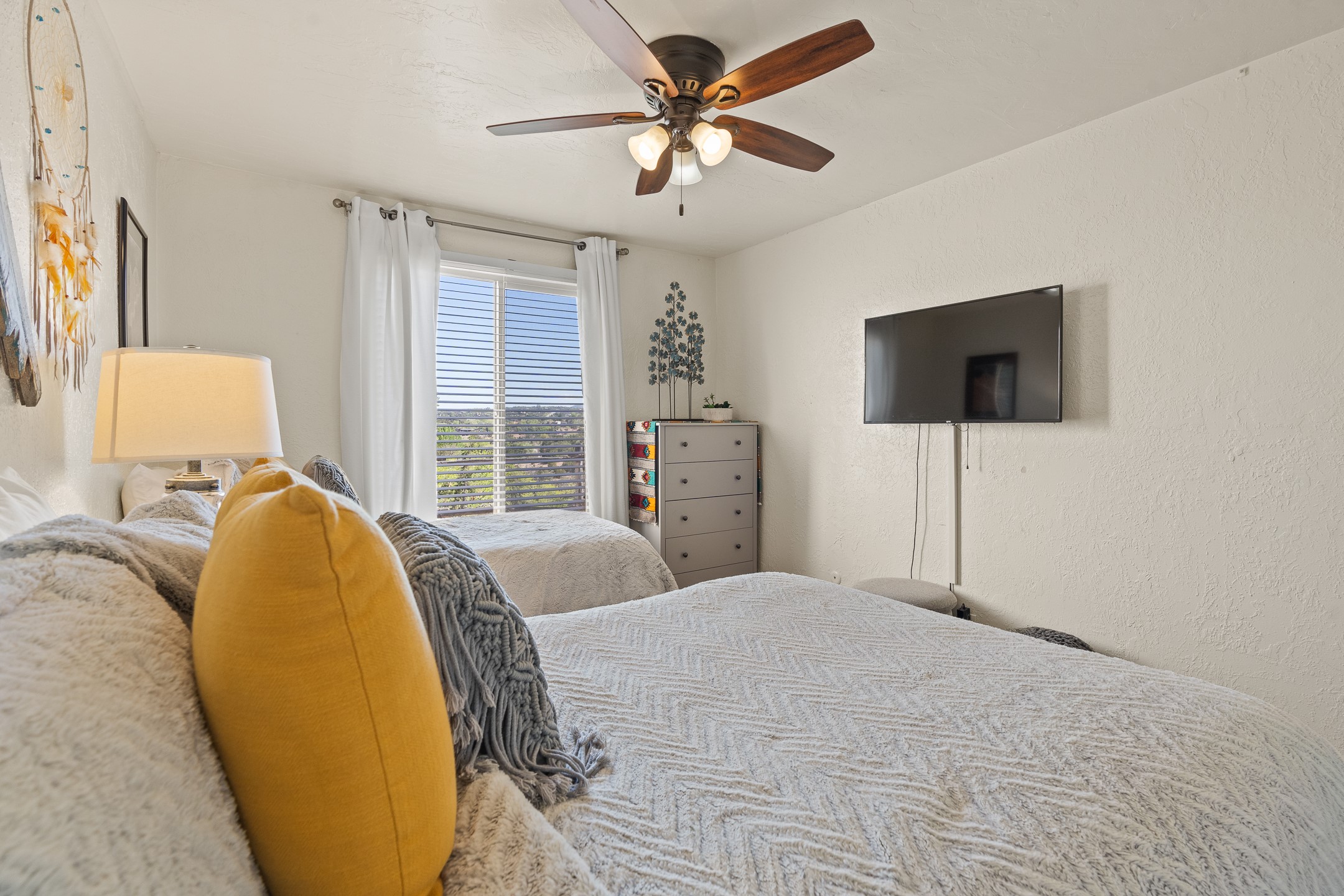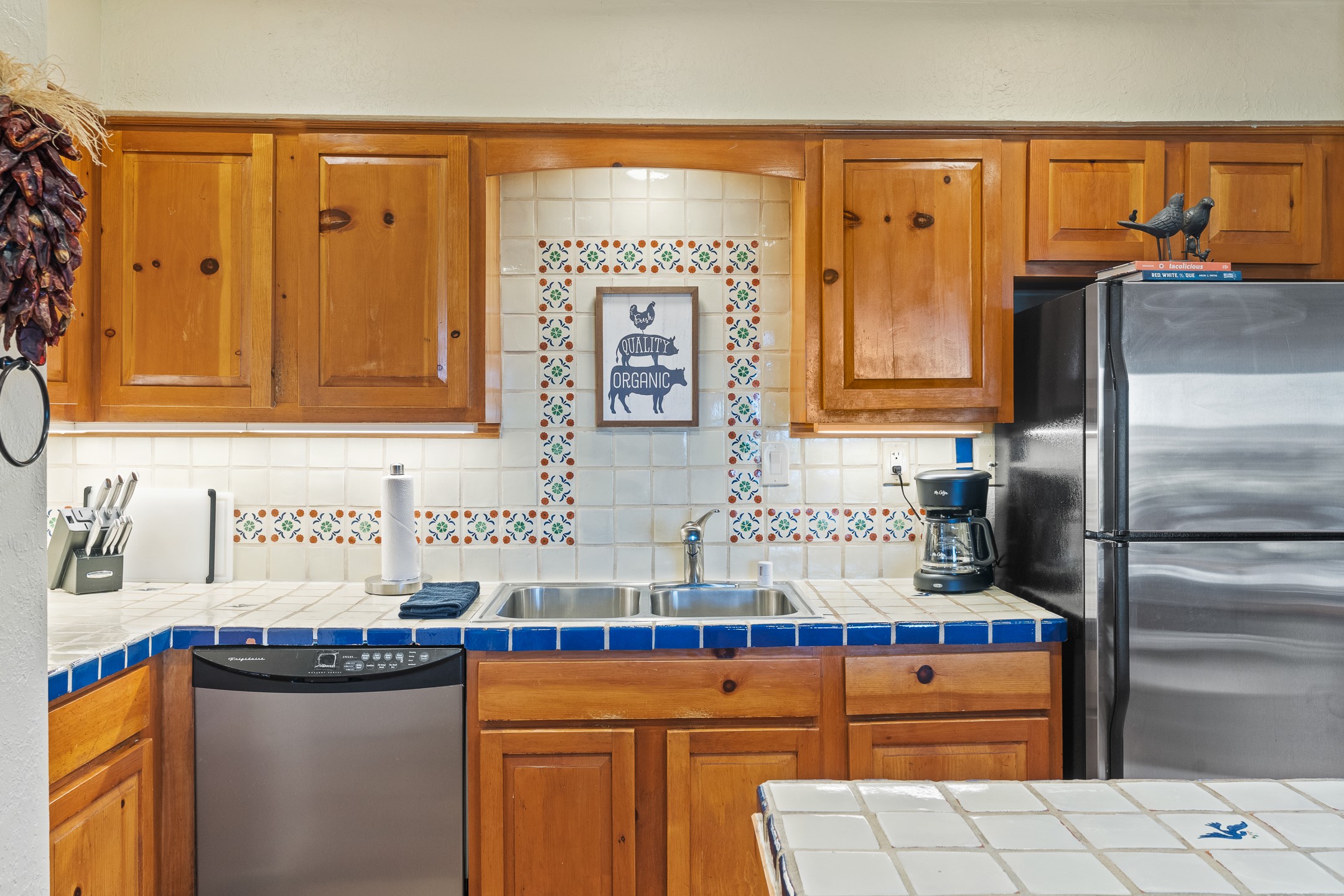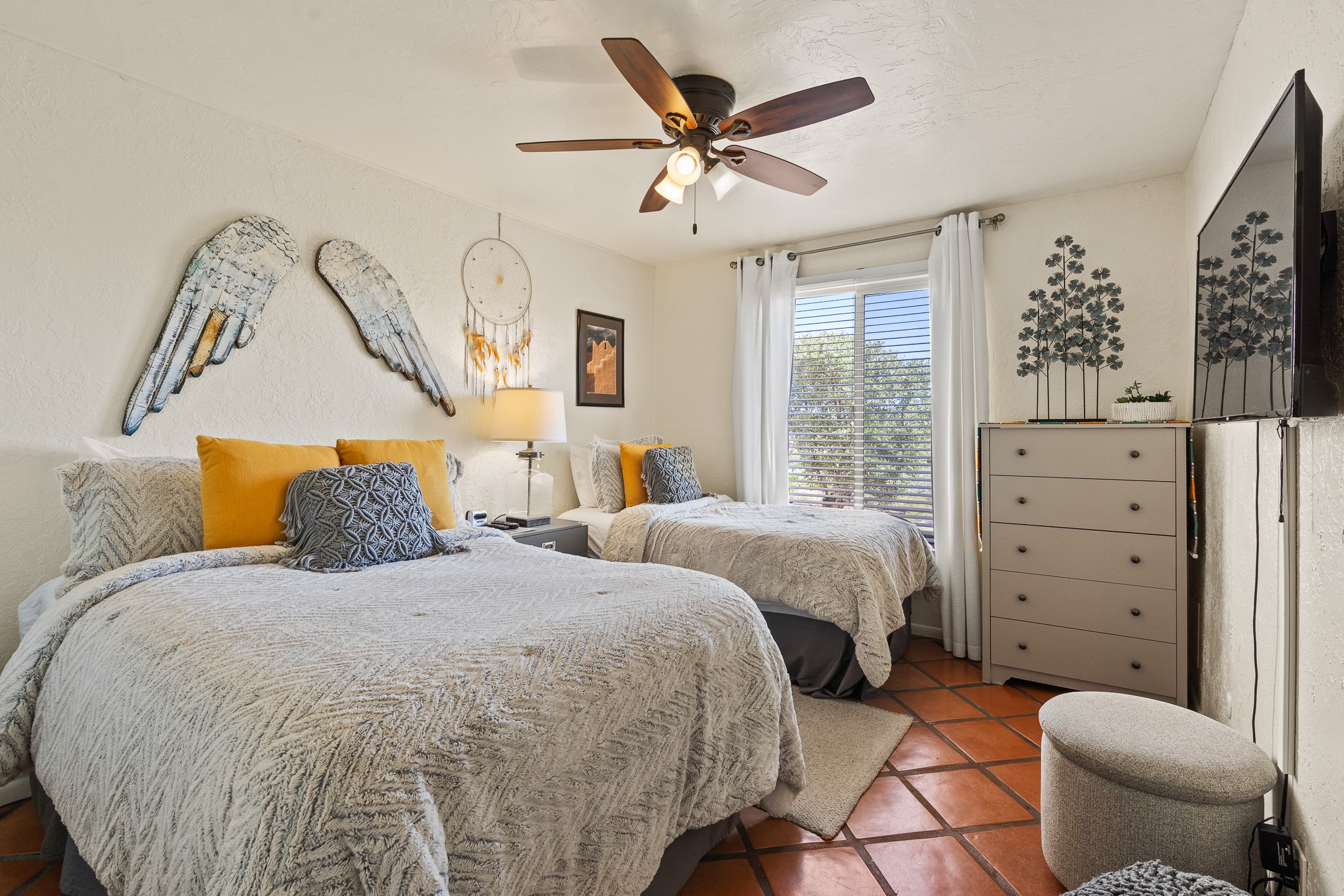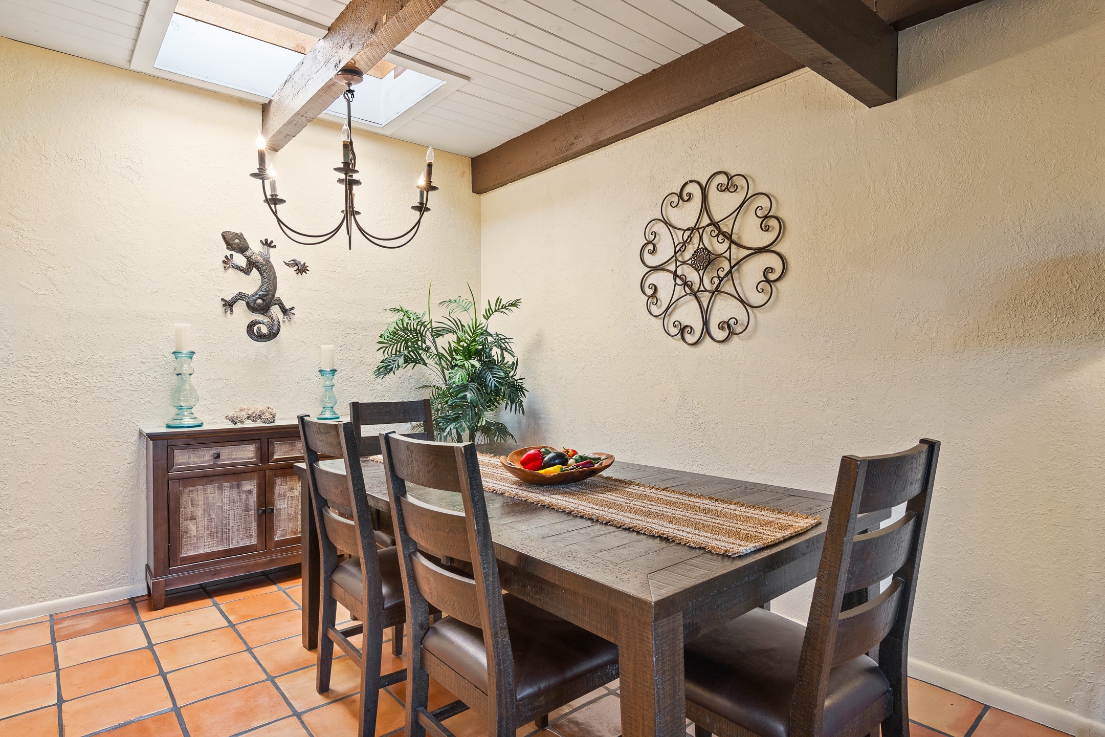 Walk to the plaza from this extremely comfortable single level, 2 bedroom, 2 bath condo with sweeping views! Also has convenient, nearby parking, with NO STEPS! All tile flooring throughout, NO carpeting, beamed ceiling in LR, custom tile countertops and showers. Hand-made cabinets too. Skylights and large, new windows bring in lots of natural light. Stay cozy on cool nights with the wood burning kiva, and cool in the warmer months with the new central refrigerated air-conditioning. This condo offers hard to find amenities in the downtown area: ample parking, easy access, awesome views, single level living, all appliances, including Bosch washer/dryer, and ALL FURNISHINGS INCLUDED!. Perfect vacation home, or full-time residence. On-site management offers a short-term vacation rental program. HOA does not restrict rentals. New roof in 2024. New HVAC in 2025.