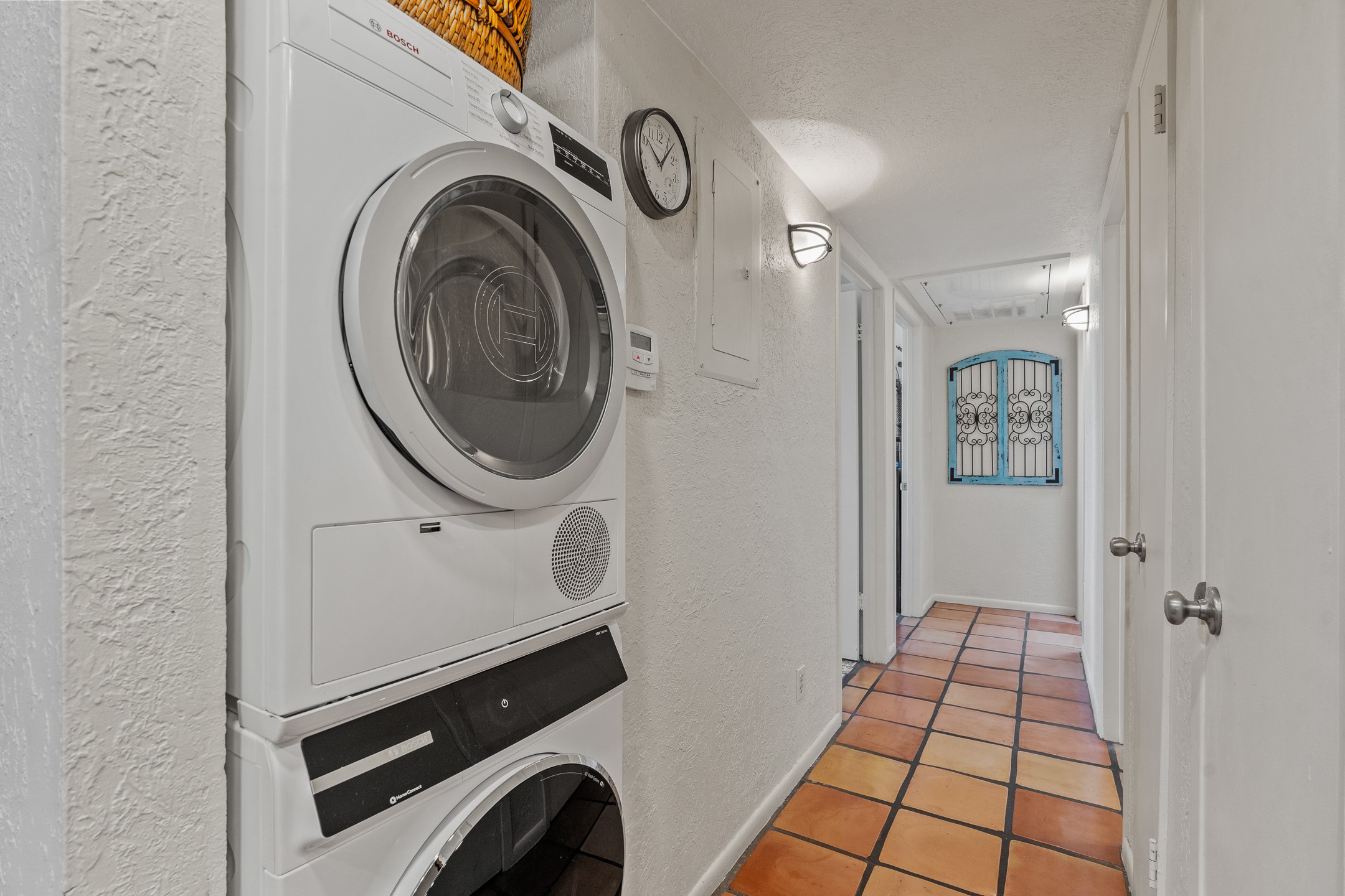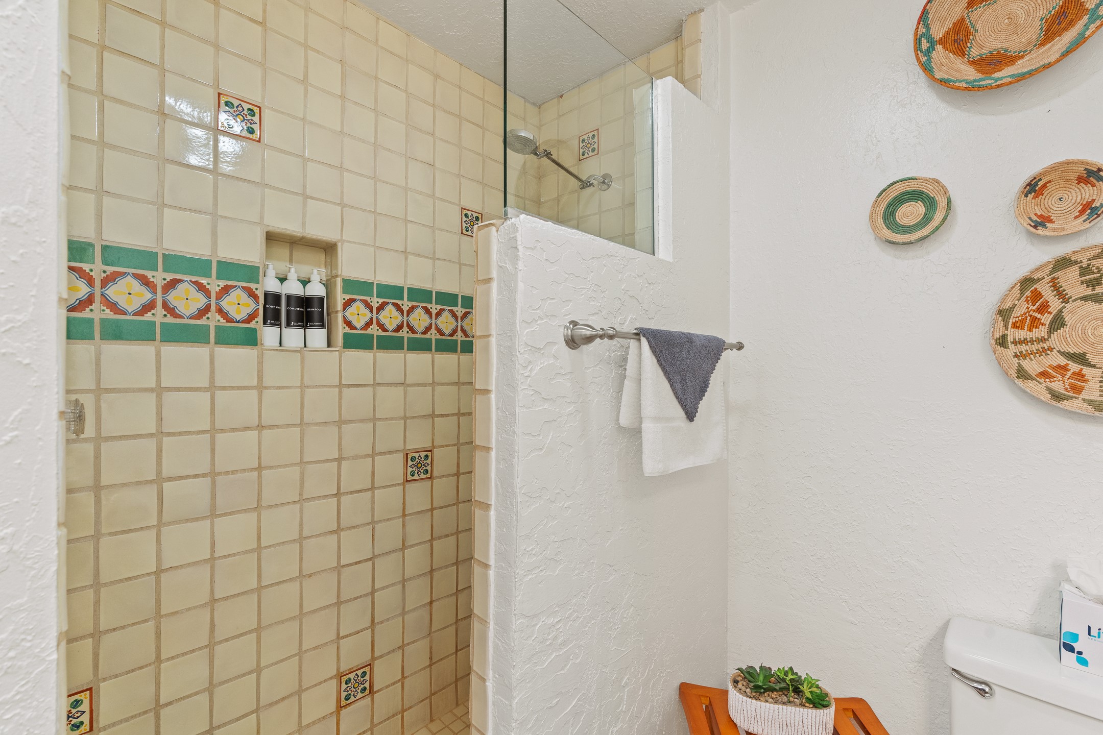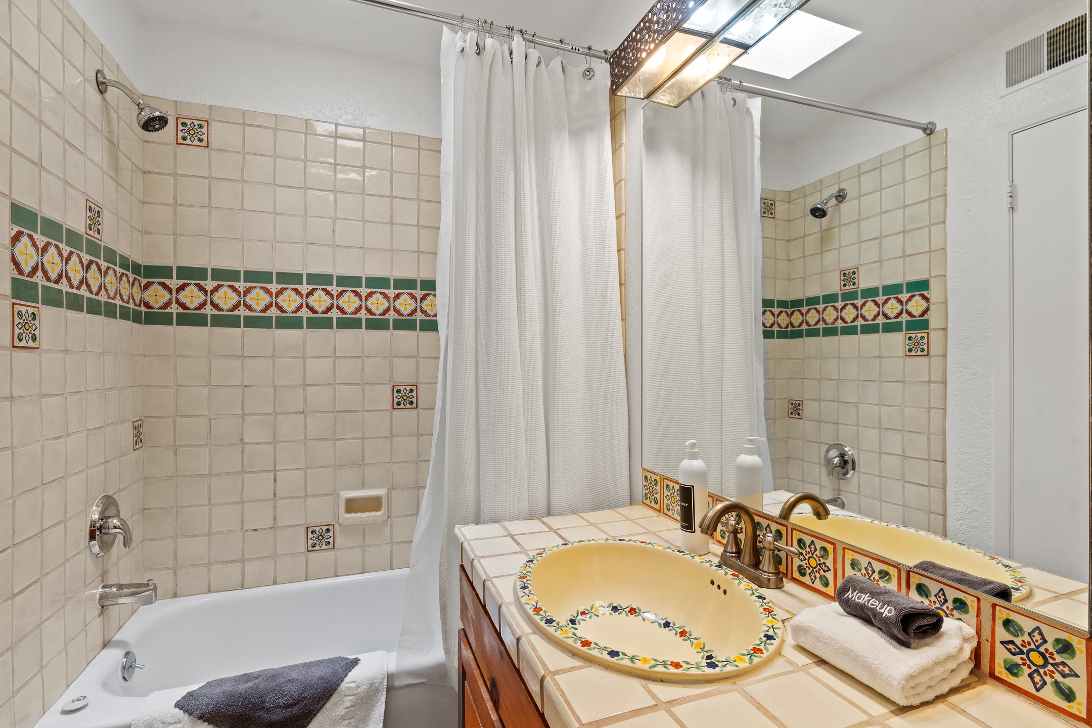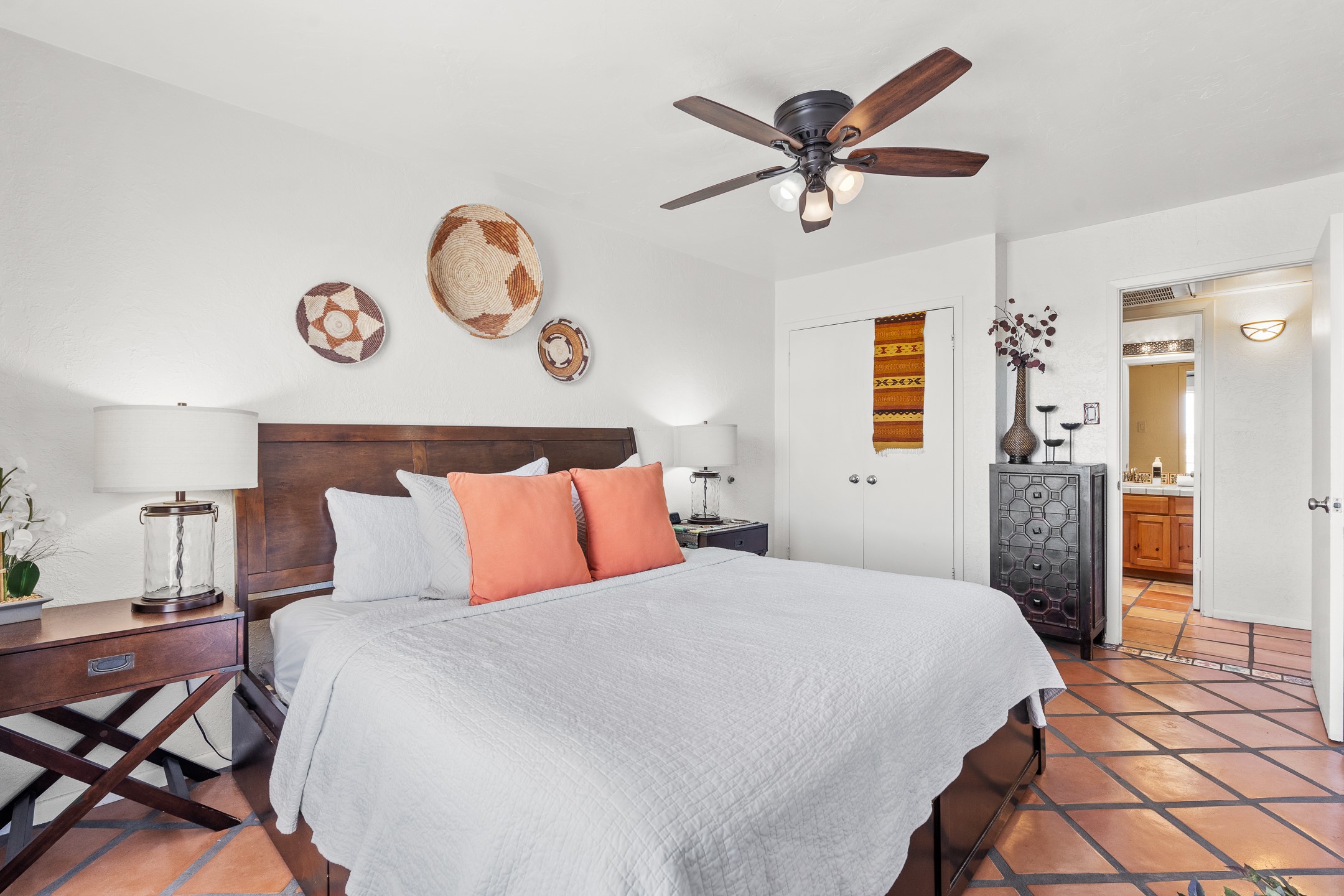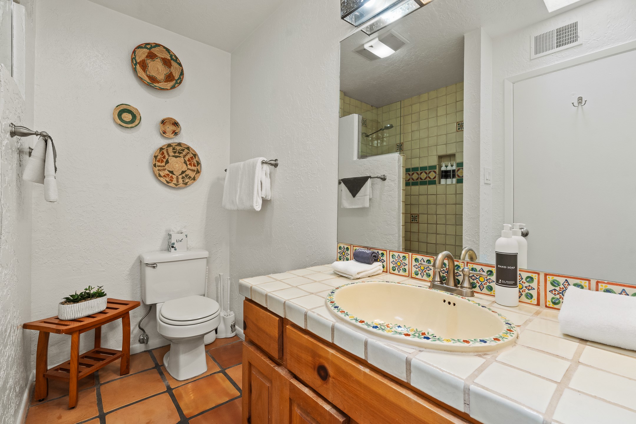 Walk to the plaza from this extremely comfortable single level, 2 bedroom, 2 bath condo with sweeping views! Also has convenient, nearby parking, with NO STEPS! All tile flooring throughout, NO carpeting, beamed ceiling in LR, custom tile countertops and showers. Hand-made cabinets too. Skylights and large, new windows bring in lots of natural light. Stay cozy on cool nights with the wood burning kiva, and cool in the warmer months with the new central refrigerated air-conditioning. This condo offers hard to find amenities in the downtown area: ample parking, easy access, awesome views, single level living, all appliances, including Bosch washer/dryer, and ALL FURNISHINGS INCLUDED!. Perfect vacation home, or full-time residence. On-site management offers a short-term vacation rental program. HOA does not restrict rentals. New roof in 2024. New HVAC in 2025.