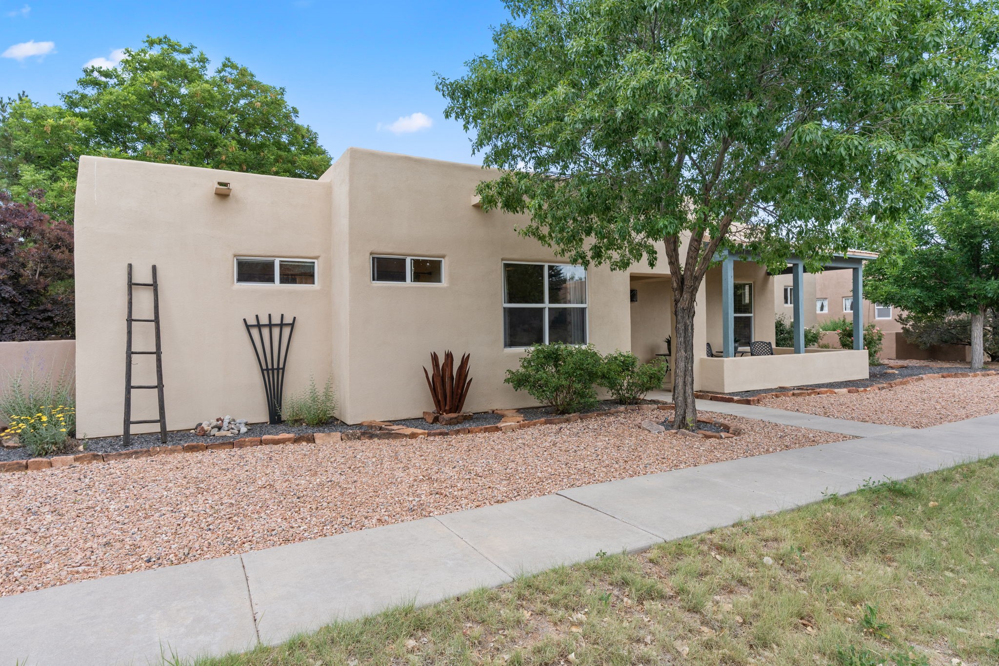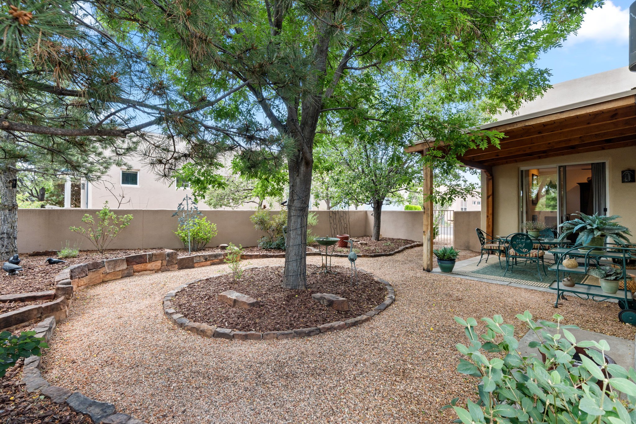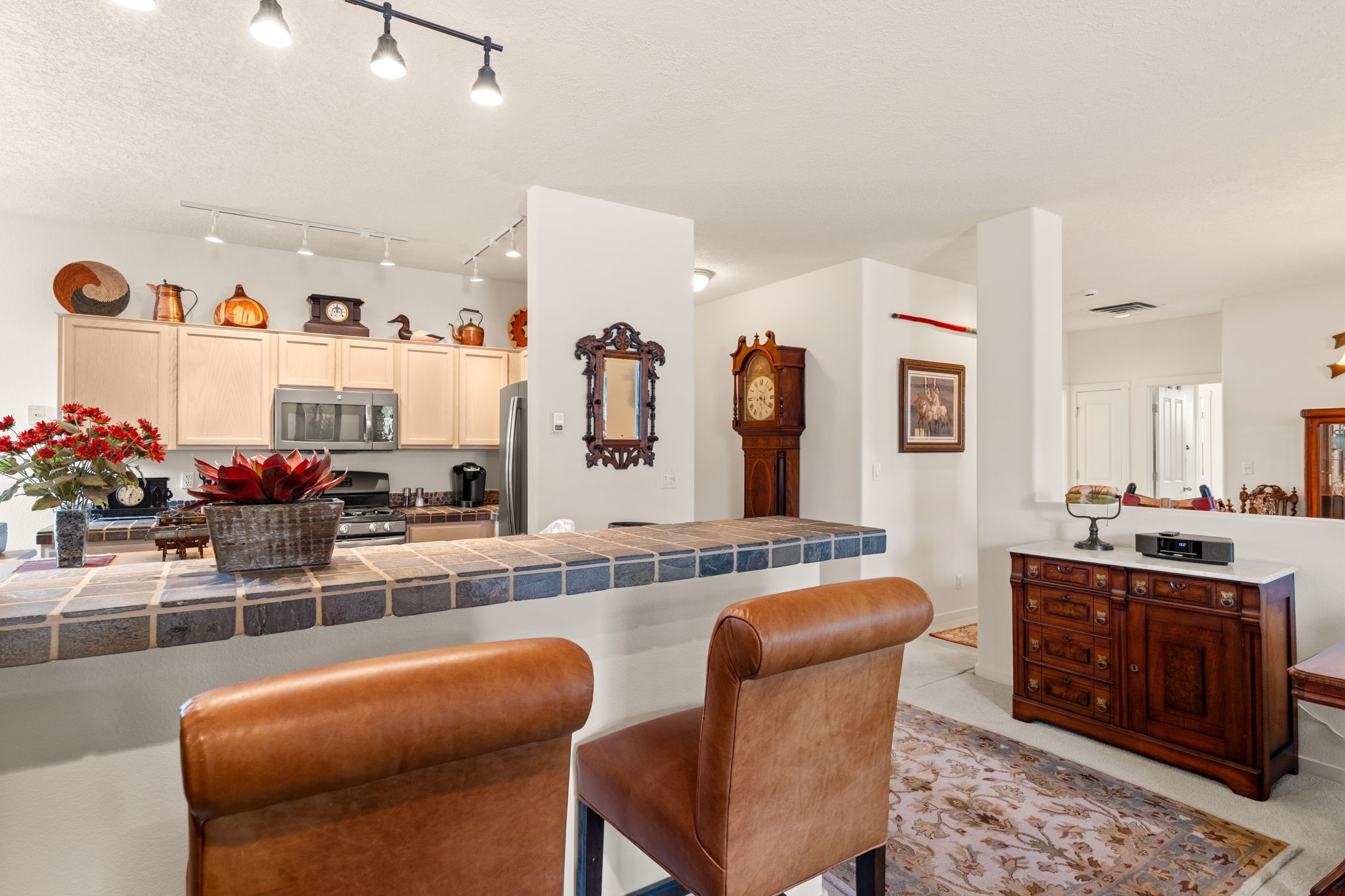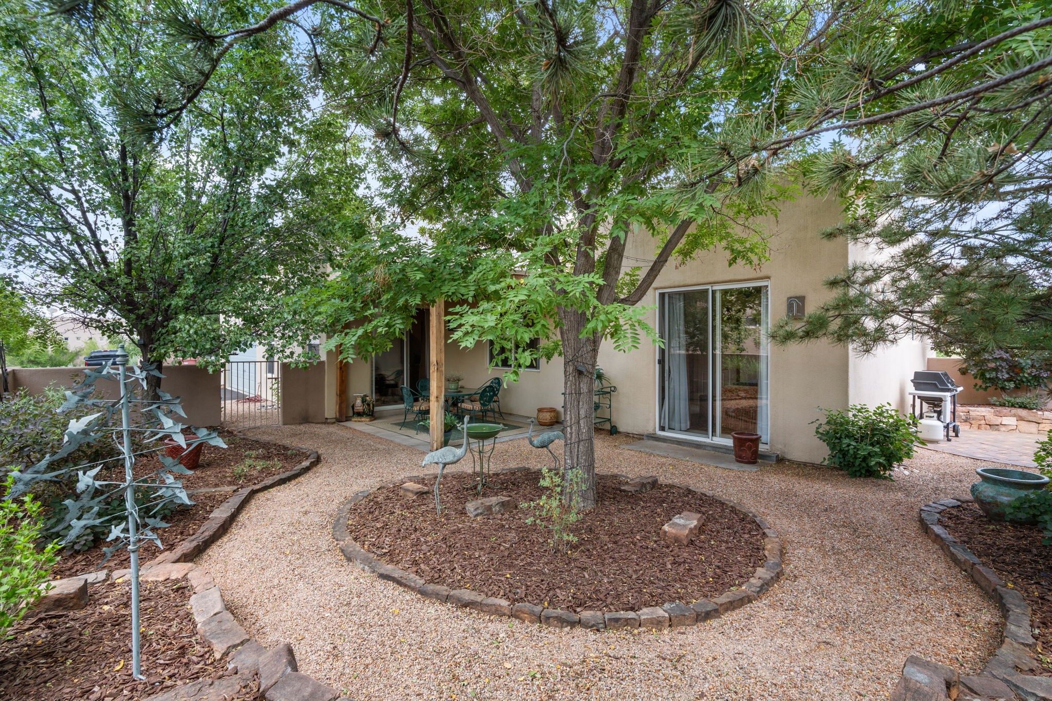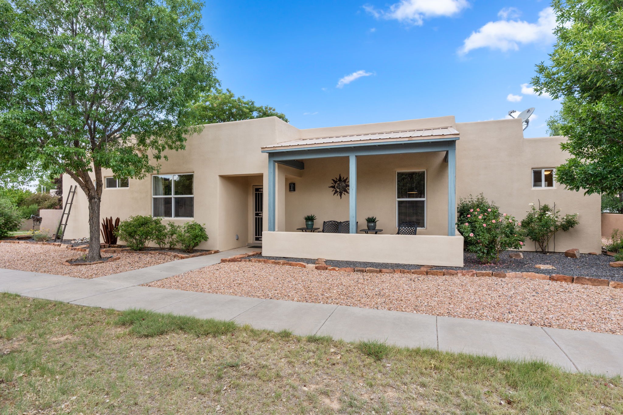 Nestled in the serene beauty of Rancho Viejo, this pristine 2-bedroom, 2-bath home is a rare find--graced with lush grassy promenades on two sides, offering both privacy and charm. The welcoming covered front portal overlooks the tranquil south promenade, a perfect spot to enjoy morning coffee or evening breezes.Step inside to a tiled entryway that opens into a bright and airy living room, featuring high ceilings, a cozy gas fireplace, and a large sliding glass door that leads to a covered rear portal--ideal for al fresco dining or relaxing with friends. The fenced backyard is a private sanctuary, meticulously landscaped and designed for peace and quiet.The thoughtfully appointed kitchen boasts tiled countertops, newer slate appliances, abundant cabinetry, and ample counter space, complemented by a generous pantry for all your culinary needs.The front bedroom enjoys views of the green south promenade, while the primary suite offers a quiet retreat overlooking the beautifully manicured backyard. On the west side, a circular brick patio opens to the expansive west promenade, a serene and spacious setting perfect for unwinding or entertaining.This home radiates a sense of care and tranquility throughout--immaculately maintained and move-in ready. With its exceptional setting and timeless appeal, this Rancho Viejo treasure won't last long. Don't miss the opportunity to make it yours!