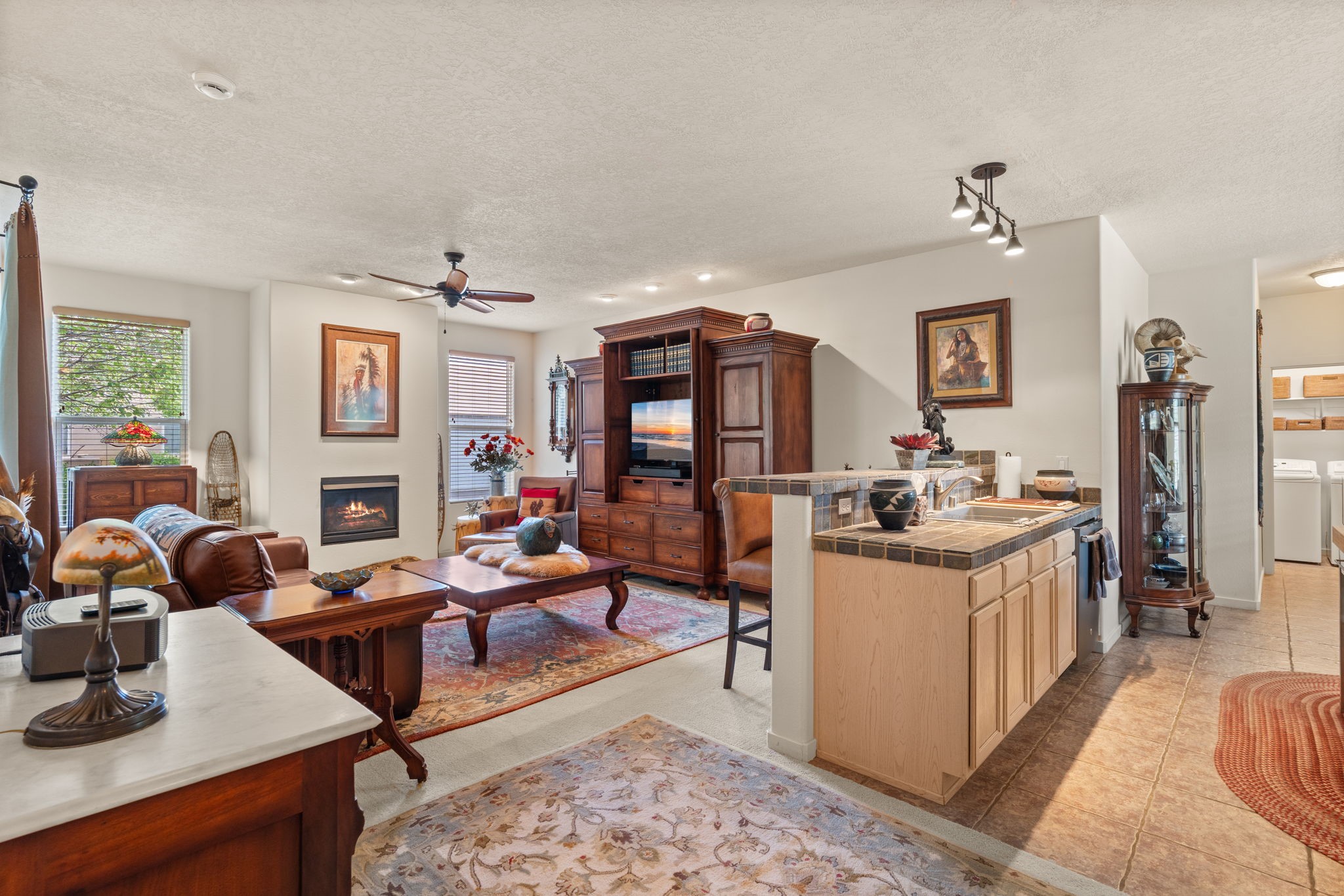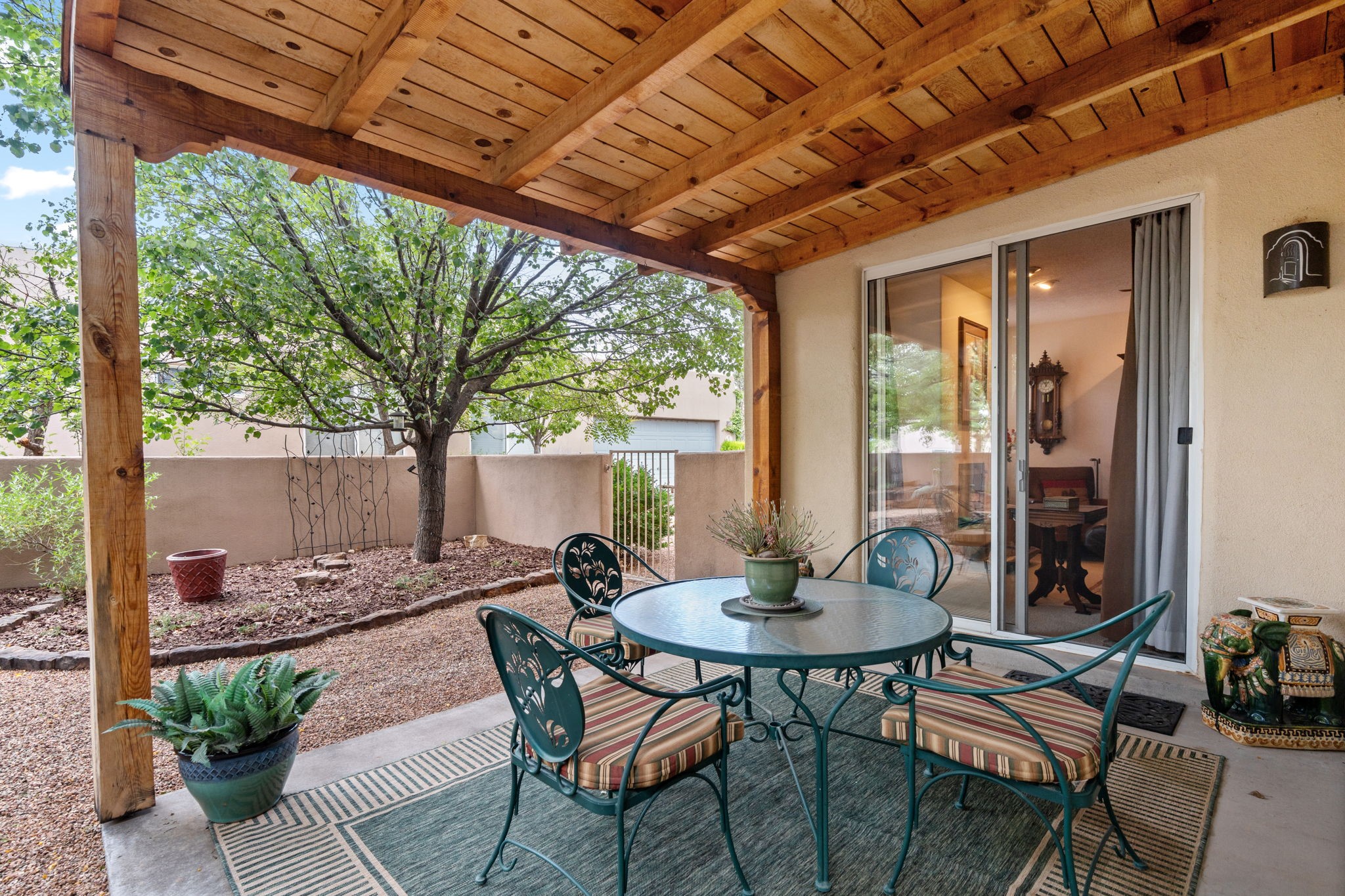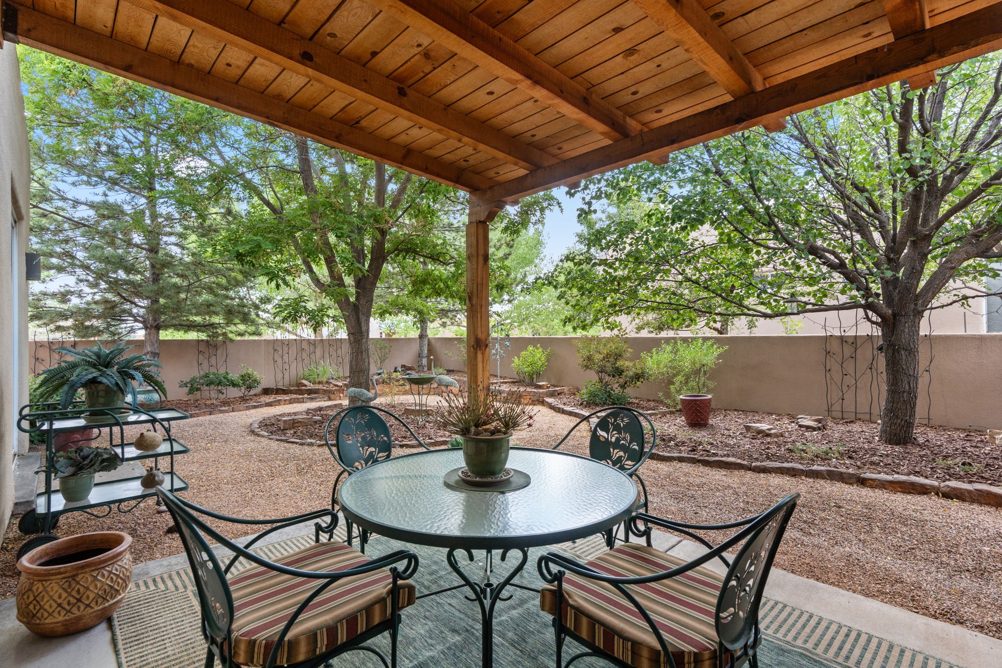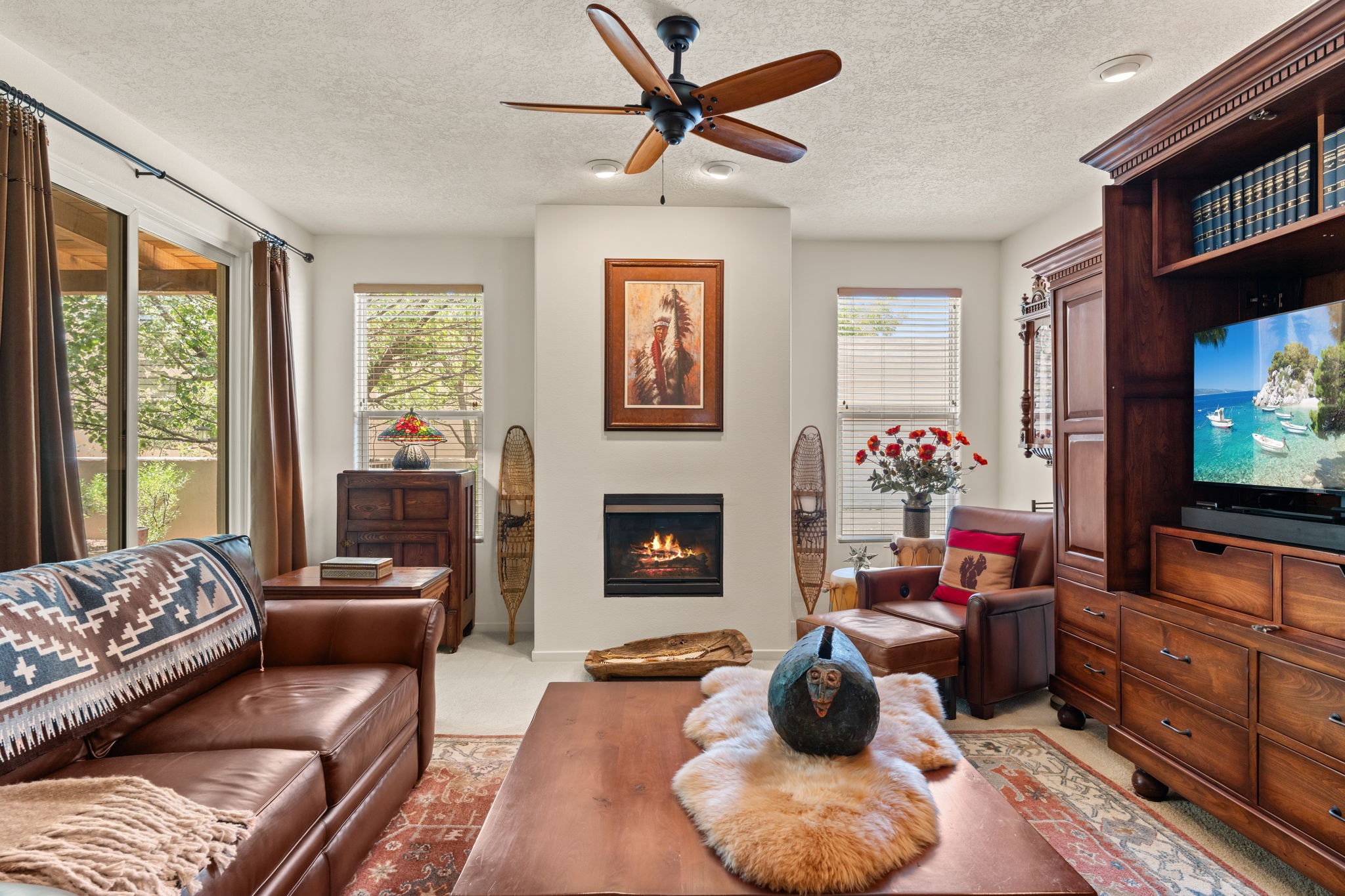 Nestled in the serene beauty of Rancho Viejo, this pristine 2-bedroom, 2-bath home is a rare find--graced with lush grassy promenades on two sides, offering both privacy and charm. The welcoming covered front portal overlooks the tranquil south promenade, a perfect spot to enjoy morning coffee or evening breezes.Step inside to a tiled entryway that opens into a bright and airy living room, featuring high ceilings, a cozy gas fireplace, and a large sliding glass door that leads to a covered rear portal--ideal for al fresco dining or relaxing with friends. The fenced backyard is a private sanctuary, meticulously landscaped and designed for peace and quiet.The thoughtfully appointed kitchen boasts tiled countertops, newer slate appliances, abundant cabinetry, and ample counter space, complemented by a generous pantry for all your culinary needs.The front bedroom enjoys views of the green south promenade, while the primary suite offers a quiet retreat overlooking the beautifully manicured backyard. On the west side, a circular brick patio opens to the expansive west promenade, a serene and spacious setting perfect for unwinding or entertaining.This home radiates a sense of care and tranquility throughout--immaculately maintained and move-in ready. With its exceptional setting and timeless appeal, this Rancho Viejo treasure won't last long. Don't miss the opportunity to make it yours!