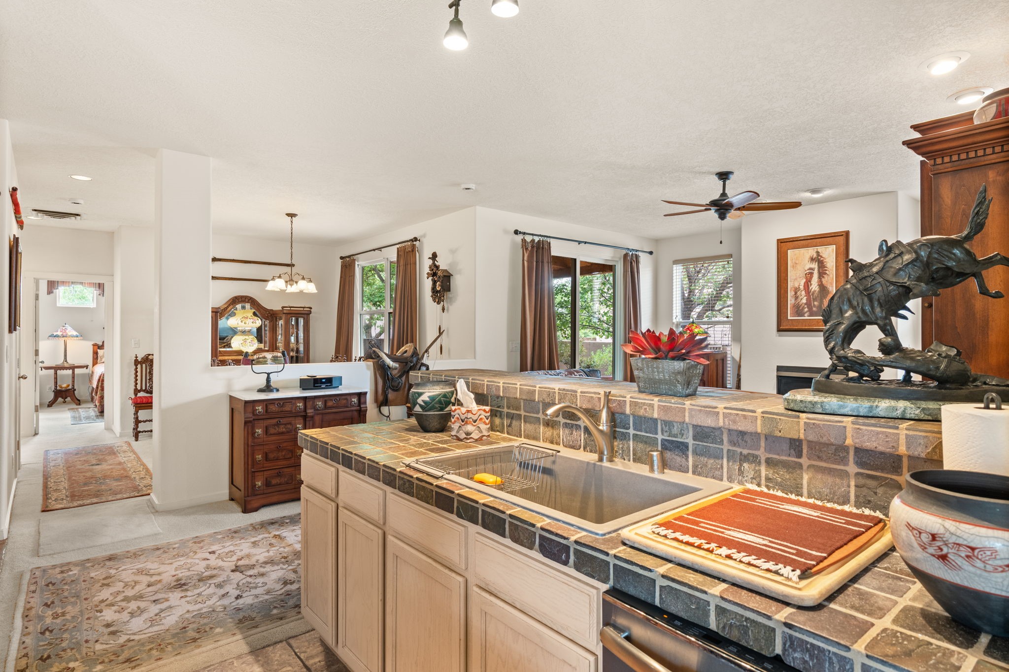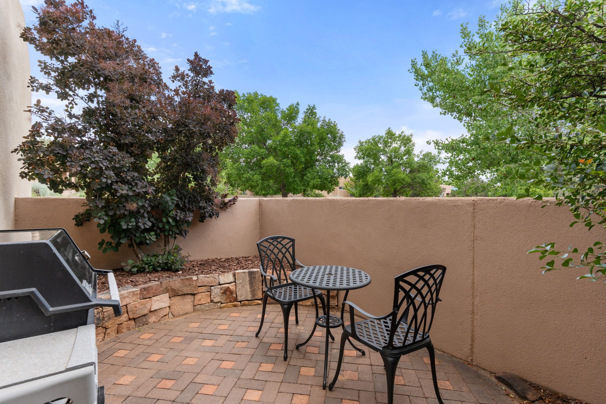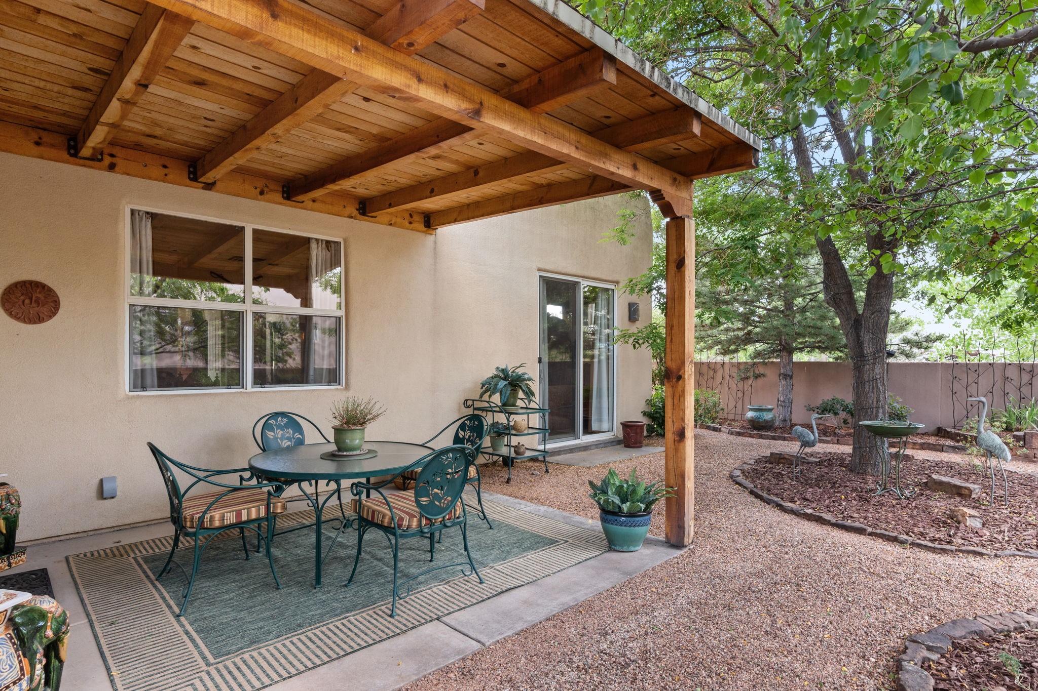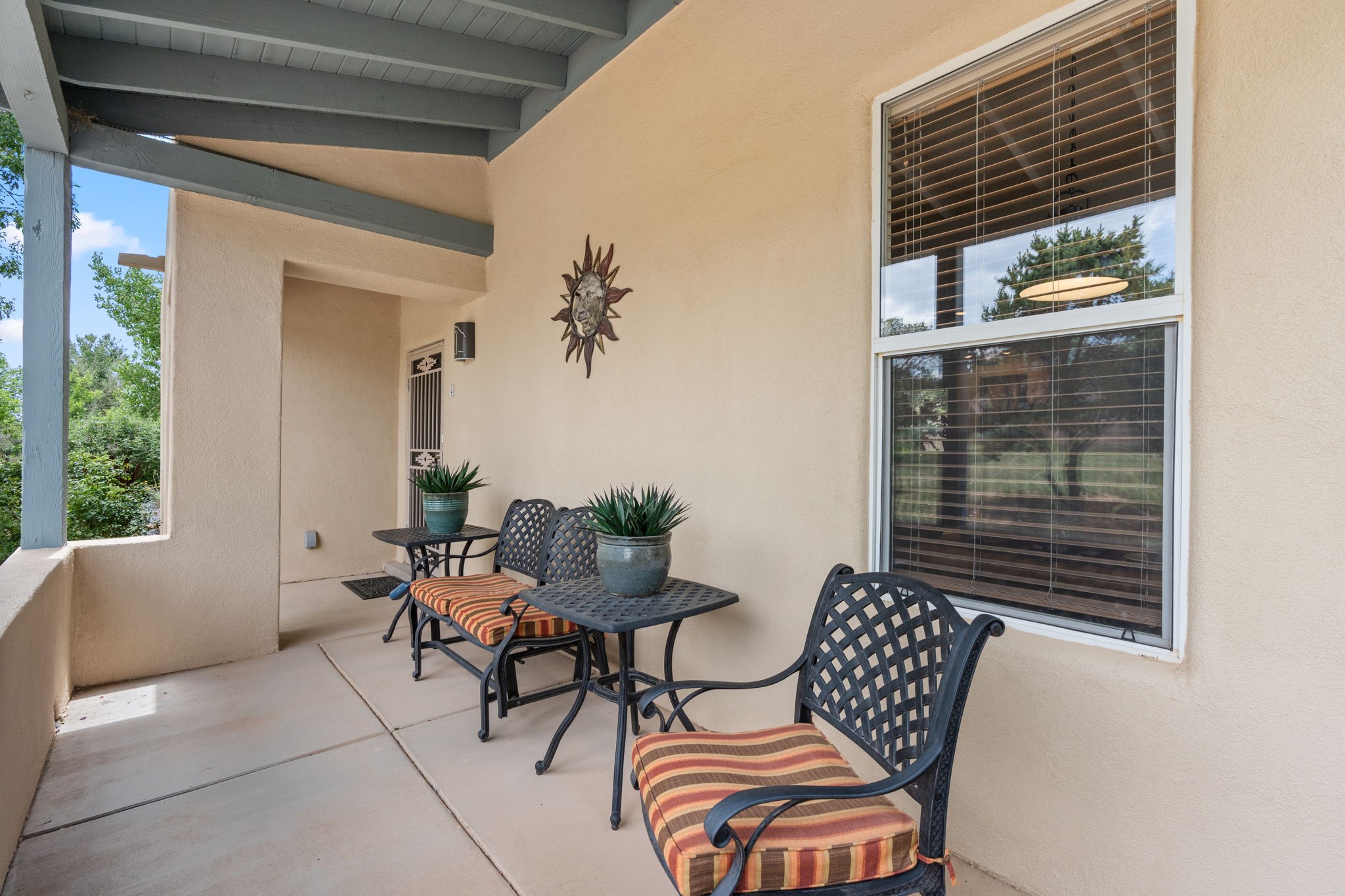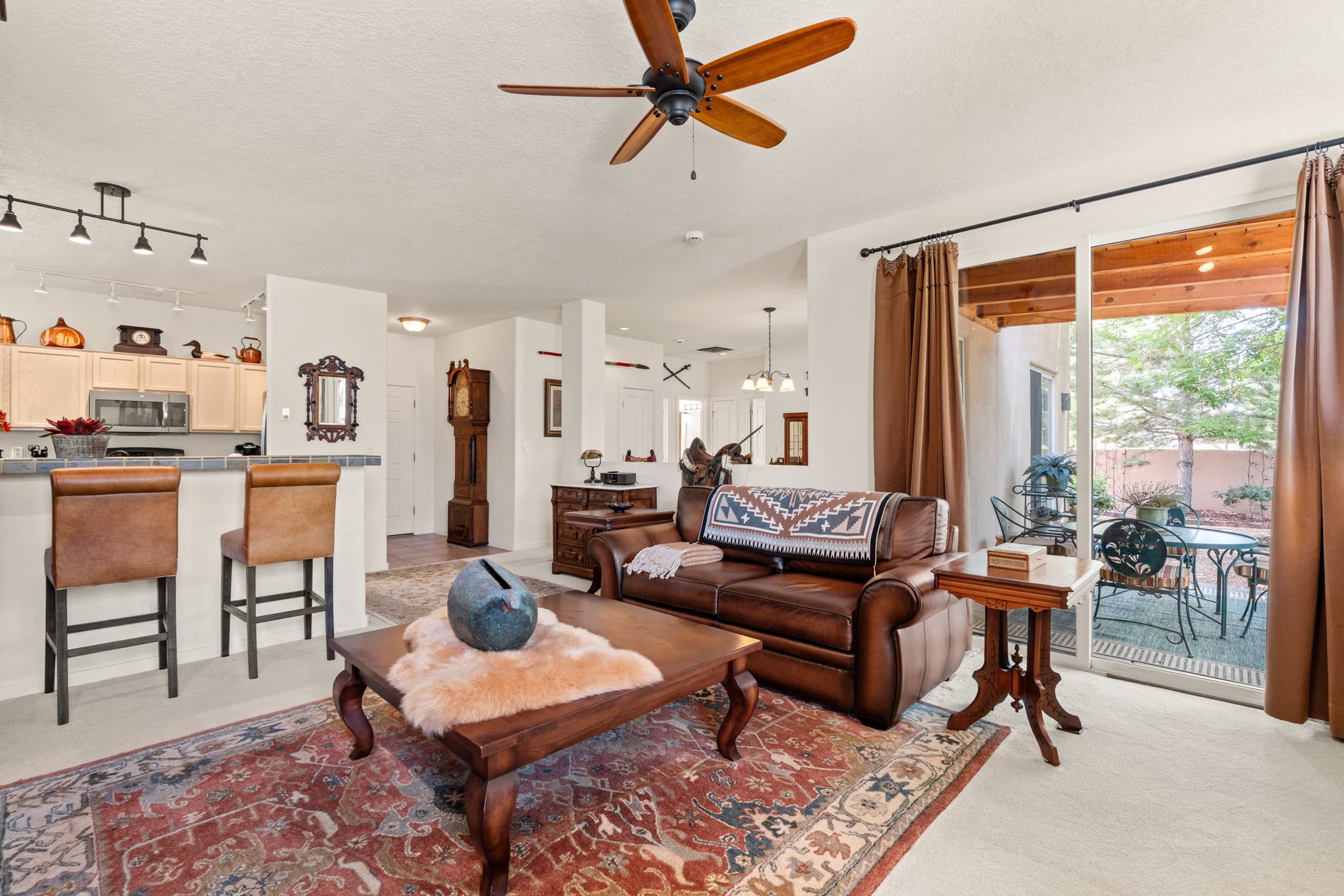 Nestled in the serene beauty of Rancho Viejo, this pristine 2-bedroom, 2-bath home is a rare find--graced with lush grassy promenades on two sides, offering both privacy and charm. The welcoming covered front portal overlooks the tranquil south promenade, a perfect spot to enjoy morning coffee or evening breezes.Step inside to a tiled entryway that opens into a bright and airy living room, featuring high ceilings, a cozy gas fireplace, and a large sliding glass door that leads to a covered rear portal--ideal for al fresco dining or relaxing with friends. The fenced backyard is a private sanctuary, meticulously landscaped and designed for peace and quiet.The thoughtfully appointed kitchen boasts tiled countertops, newer slate appliances, abundant cabinetry, and ample counter space, complemented by a generous pantry for all your culinary needs.The front bedroom enjoys views of the green south promenade, while the primary suite offers a quiet retreat overlooking the beautifully manicured backyard. On the west side, a circular brick patio opens to the expansive west promenade, a serene and spacious setting perfect for unwinding or entertaining.This home radiates a sense of care and tranquility throughout--immaculately maintained and move-in ready. With its exceptional setting and timeless appeal, this Rancho Viejo treasure won't last long. Don't miss the opportunity to make it yours!