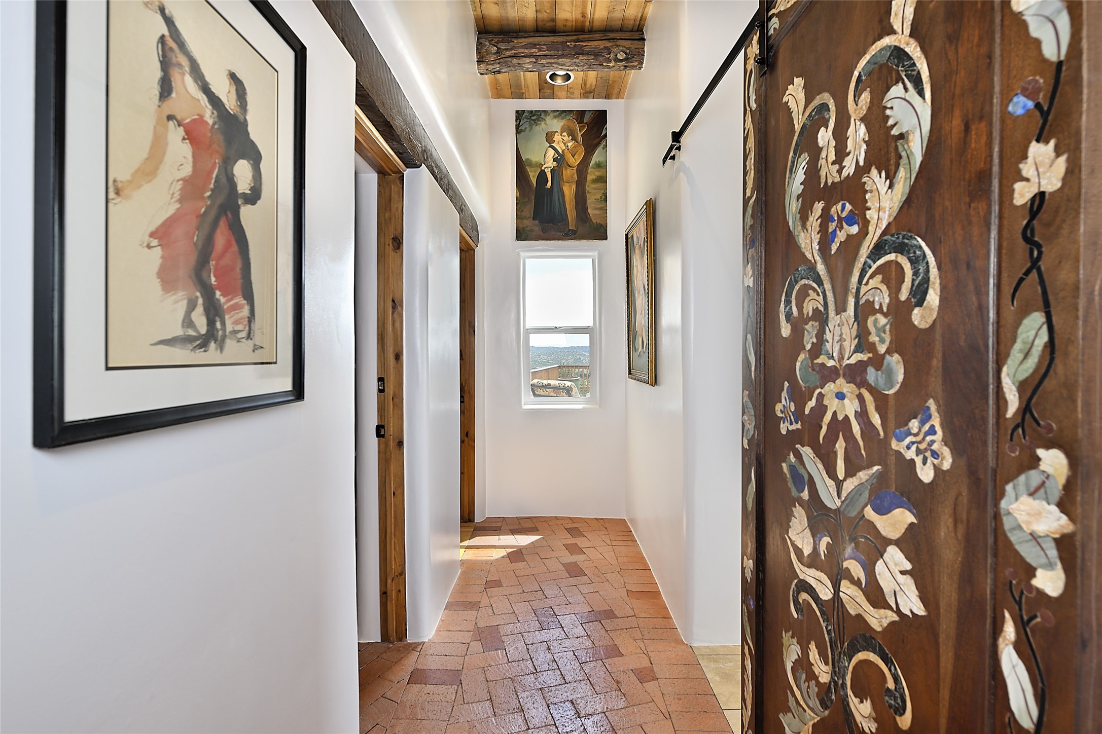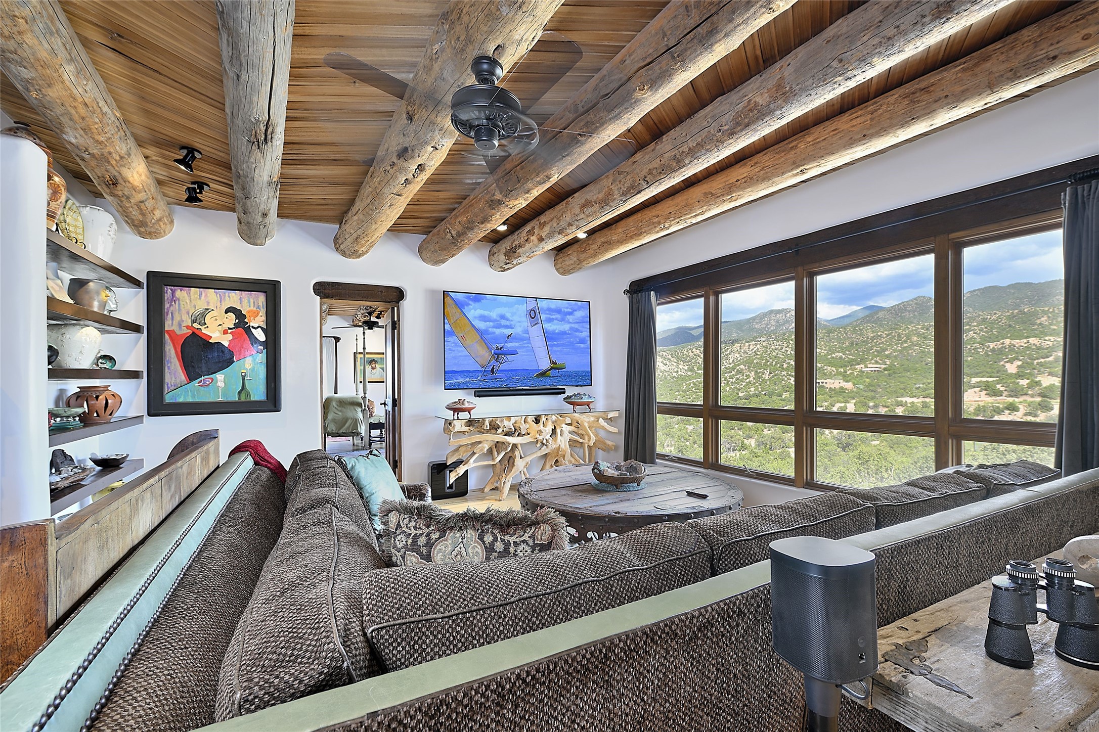 Welcome to this breathtaking 10-acre estate in the prestigious Tesuque community, where luxury meets unparalleled natural beauty. Quite possibly the best views in Tesuque, perched majestically on a private mountaintop, lovingly nicknamed "Top of Tesuque," offering 360-degree panoramic views that make you feel as though you're sitting atop the world. Spanning approximately 6,614 sq ft, this 4-bedroom home is a masterpiece of design and function, featuring many new upgrades for a modern lifestyle. This fully restored and expanded adobe home seamlessly blends classic Santa Fe design with modern upgrades, preserving its timeless charm. This property has a new roof, lighting, stucco. Truly turn-key in every way. Inside, the floor plan seamlessly blends indoor and outdoor living, creating an ideal setting for both relaxation and entertaining, including 6 Kiva Fireplaces as well as 1 wood-burning stove. The brand-new kitchen features handcrafted solid wood cabinetry and top-of-the-line luxury appliances, perfect for any culinary enthusiast, while the adjacent dining and living areas boast spectacular views. The primary bedroom suite includes a separate sitting room, offering a private retreat within the home. Enjoy the convenience of a dedicated office space and den, a media room, as well as a game room complete with a wet bar, perfect for hosting guests. Step outside to the covered portal with outdoor kitchen & TV, complete with matching granite countertops, where you can entertain in style. The outdoor kitchen has all new (never been used) grill, pizza oven and smoker! Terraced gardens also feature a brand-new (never been used) Sauna and Hot Tub. A newly built garage has an observation deck on top. There are new entrance gates for privacy, a new driveway surface, and new additional parking areas ensure privacy and convenience. The addition of an electric lift from ground level to main level of residence also ensures accessibility and ease for loading and unloading. Mexican Porcelain tile terrace at the front entrance welcomes you. There is an enclosed dog park, as well as fully irrigated garden beds surrounding the house. The property is beautifully illuminated with 40 handmade copper light fixtures, adding a timeless touch to the outdoor spaces. With no HOA restrictions, this home offers the freedom and tranquility you've been searching for in the village of Tesuque.