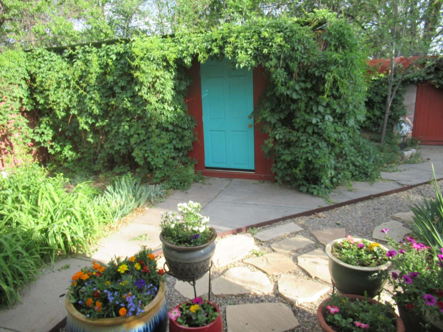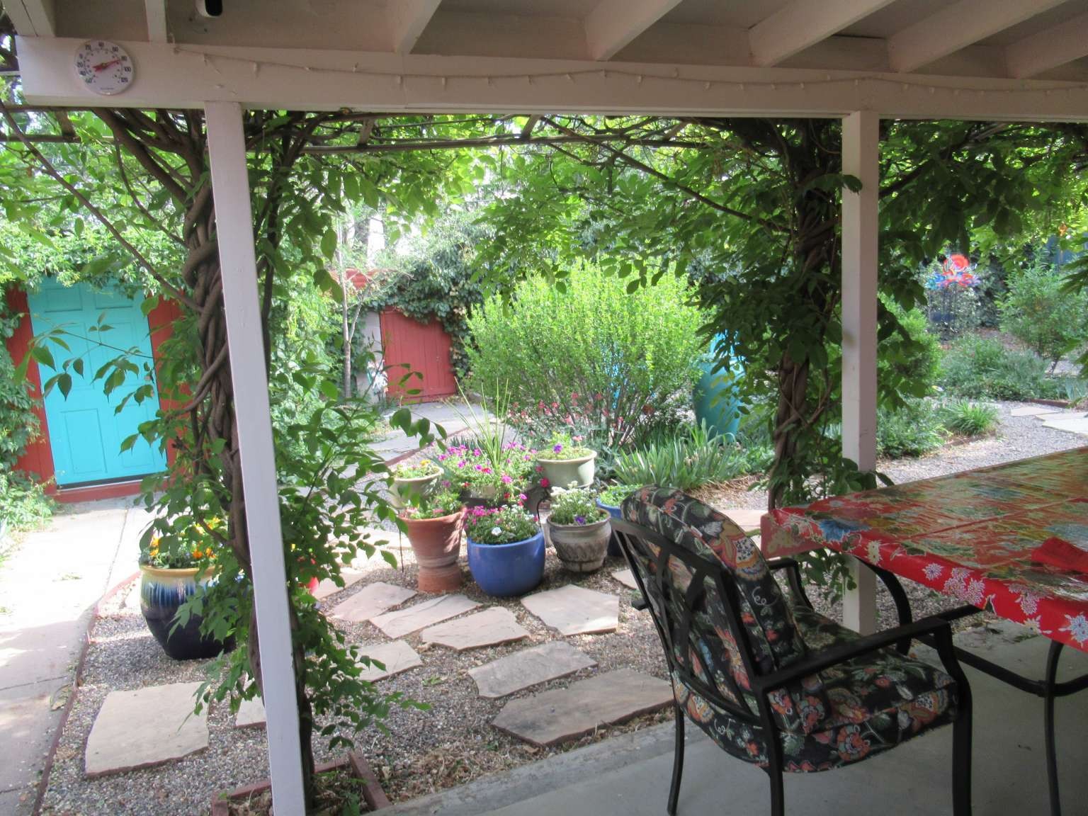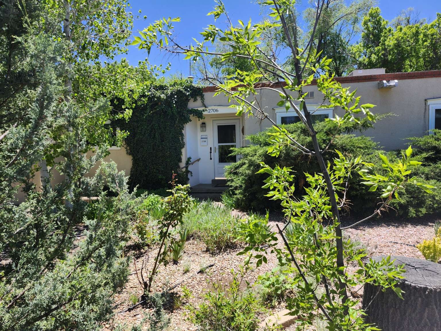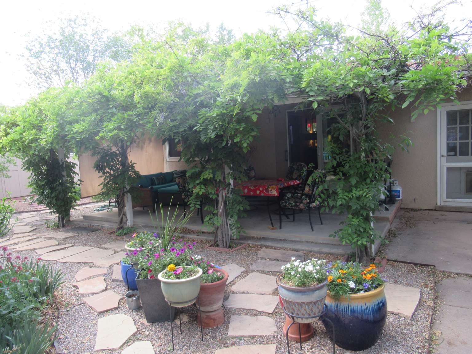 Lovely house centrally located in Santa Fe. Approx. 1532 sf +/- 4 BR, 2 BA, with den/studio and laundry room. 1963 Stamm house, Territorial style. Great location in the Mid-Town area near many schools and parks (close to Mid-Town project in central Santa Fe). Main rooms (LR, 3 BRs, Hall) have wood floors; kitchen, bathrooms and laundry room have tile floors; den and 4th BR are carpeted. Large modern upgraded kitchen with stainless steel appliances, lots of cabinetry storage and countertops. All appliances included, including washer and dryer. Great spaces for offices and studios. Forced air heat (natural gas); new evaporative cooler. Large covered back patio on raised slab off kitchen. Nicely landscaped large yards with mature landscaping, drip irrigation systems. Backyard is very private and green, facing a green-belt with large trees. Three secure out-buildings in the backyard: a workshop with electricity, a Tuff Shed for dry storage, and another shed for additional garden/materials storage. House is built on a crawl space for easy upgrades. Has a chimney ready for a wood stove or fireplace if desired.