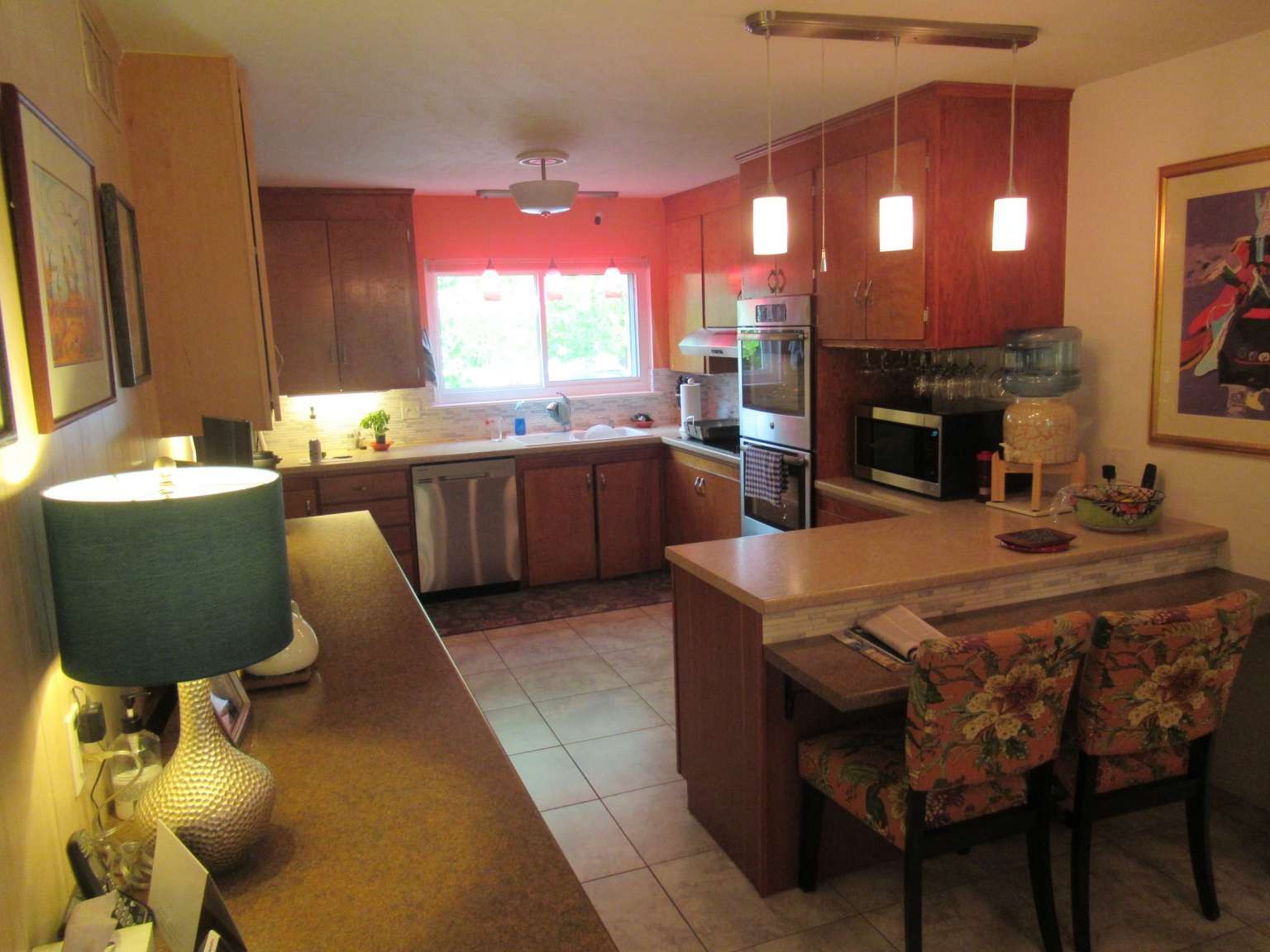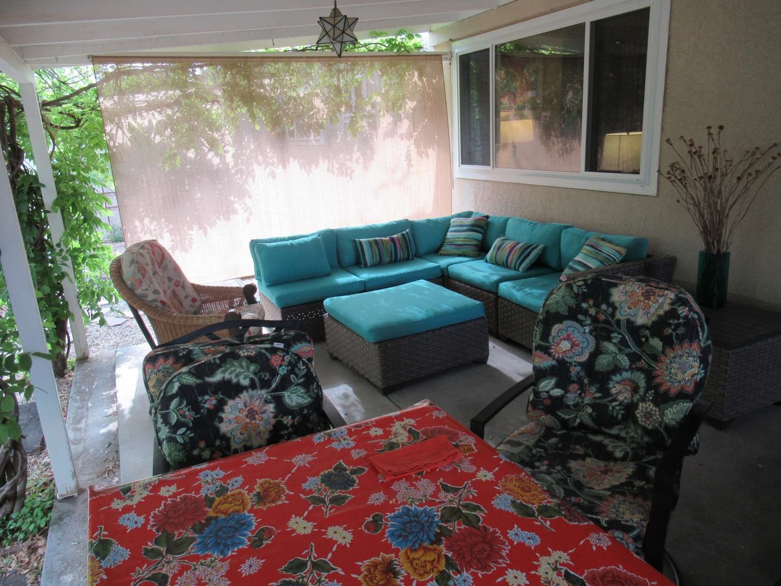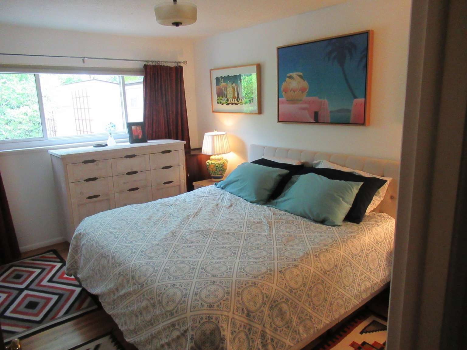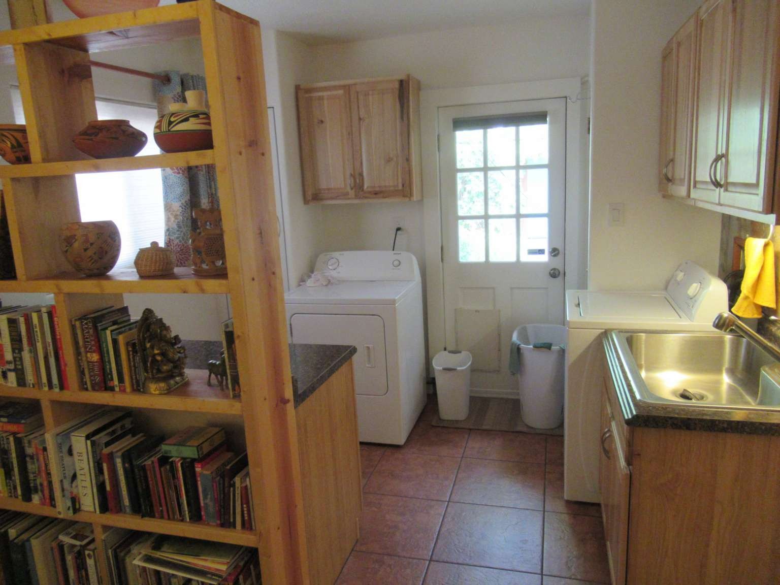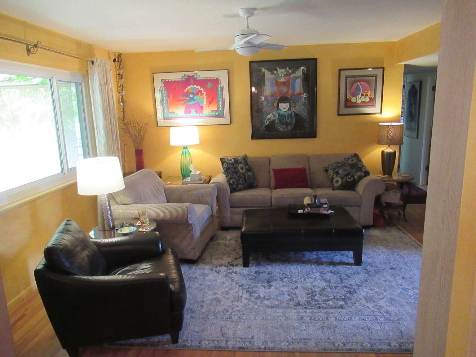 Lovely house centrally located in Santa Fe. Approx. 1532 sf +/- 4 BR, 2 BA, with den/studio and laundry room. 1963 Stamm house, Territorial style. Great location in the Mid-Town area near many schools and parks (close to Mid-Town project in central Santa Fe). Main rooms (LR, 3 BRs, Hall) have wood floors; kitchen, bathrooms and laundry room have tile floors; den and 4th BR are carpeted. Large modern upgraded kitchen with stainless steel appliances, lots of cabinetry storage and countertops. All appliances included, including washer and dryer. Great spaces for offices and studios. Forced air heat (natural gas); new evaporative cooler. Large covered back patio on raised slab off kitchen. Nicely landscaped large yards with mature landscaping, drip irrigation systems. Backyard is very private and green, facing a green-belt with large trees. Three secure out-buildings in the backyard: a workshop with electricity, a Tuff Shed for dry storage, and another shed for additional garden/materials storage. House is built on a crawl space for easy upgrades. Has a chimney ready for a wood stove or fireplace if desired.