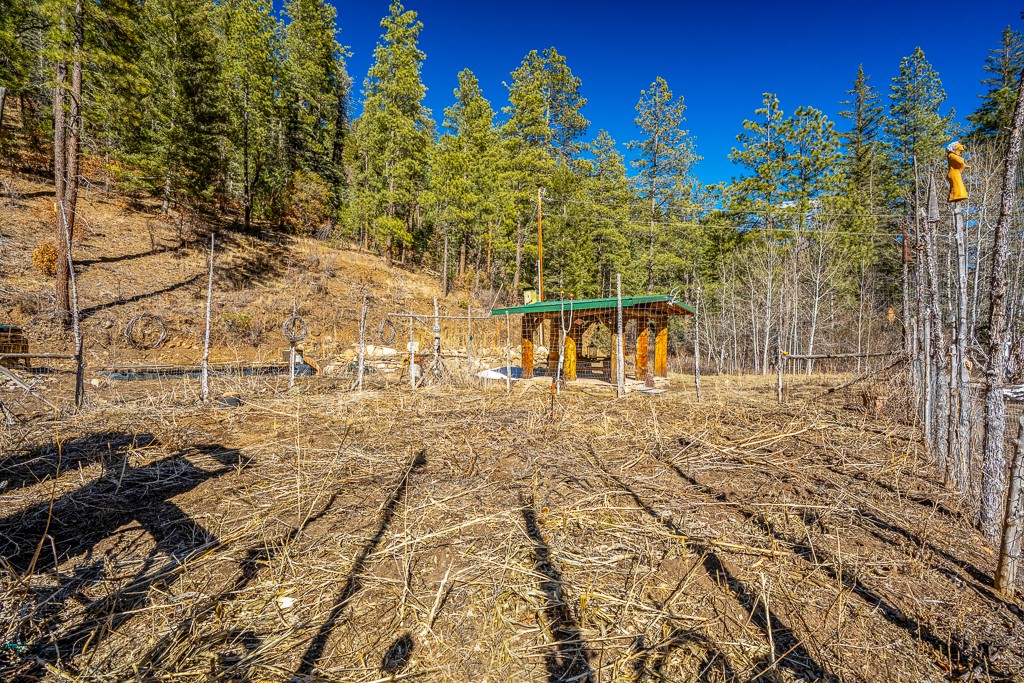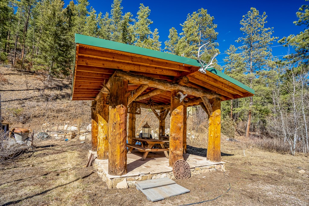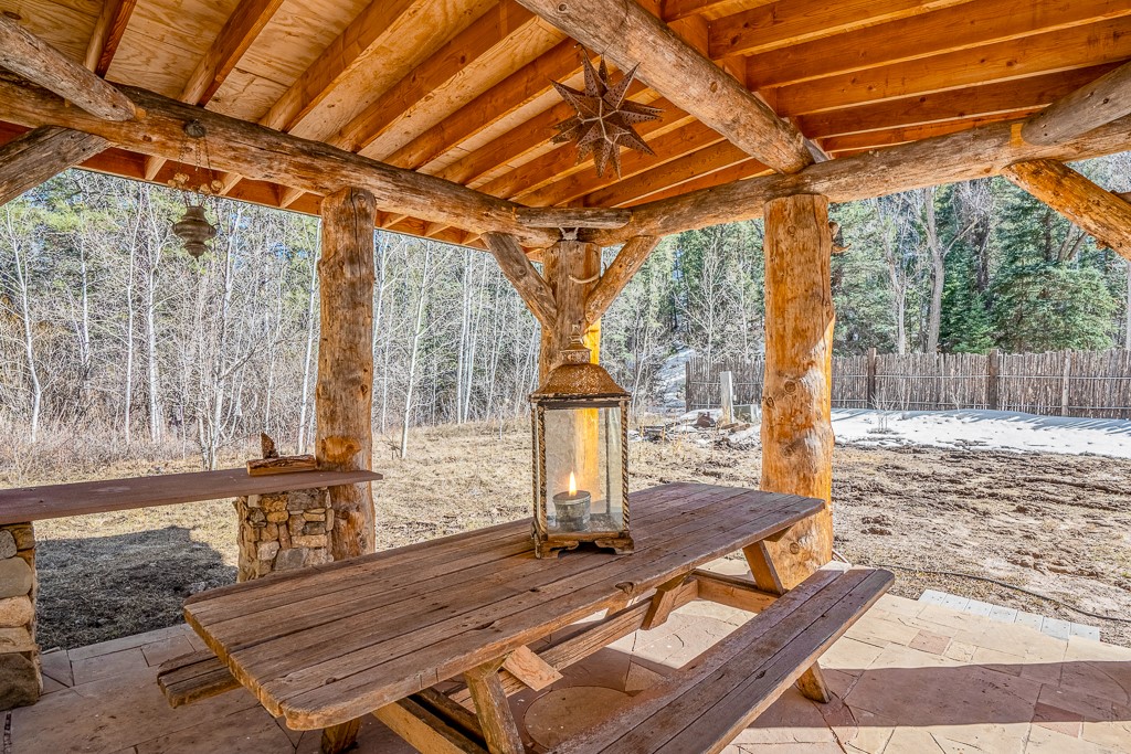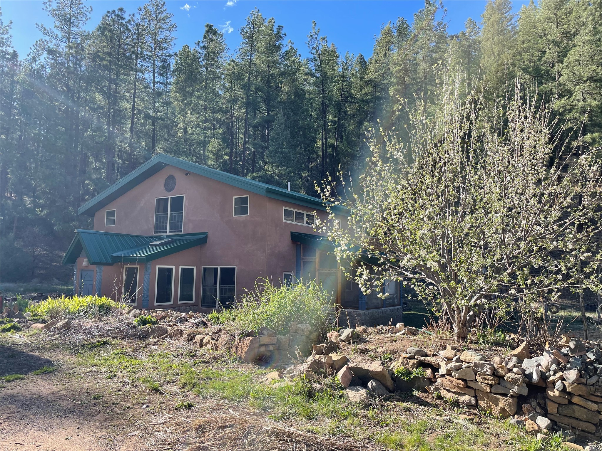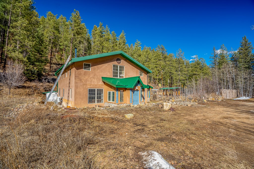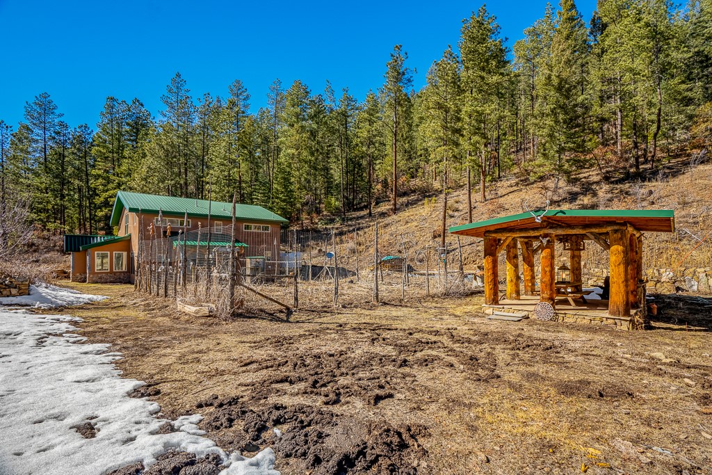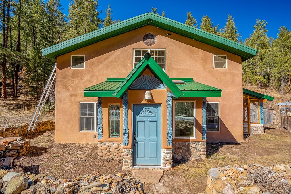 This exceptional pumice-crete home is a handcrafted sanctuary in the heart of the Santa Fe National Forest--set in a gated, 12-home enclave surrounded by thousands of acres of woodland and close to the gorgeous Pecos Wilderness and world class fishing in the Pecos River. Inside, Santa Fe-style elegance includes diamond plaster walls, hand-carved vigas, and flagstone floors. Built to endure, its 11-inch non-combustible walls and metal roof offer exceptional wildfire resilience.Just outside, an intermittent mountain stream runs through with aspen, ponderosa, and wildflower-filled canyon. Wildlife and serenity abound, and trails begin at your doorstep. Fully on-grid but off the beaten path--no cell service, no noise, total peace, with satellite internet available for those who need to check in with the world. The arts and culture of Santa Fe is just an hour away. Property features two large, high-ceilinged bedrooms upstairs, with 100-year old oak floors, as well as a bonus room perfect for art studio or office space. A smaller bedroom is on the first floor. Outdoor spaces abound, with an attached sunroom, fenced garden area, and gazebo perfect for summer cookouts. Two adjacent parcels also available. This is a one-of-a-kind chance to create a secure, nature-connected lifestyle in a rapidly changing world.