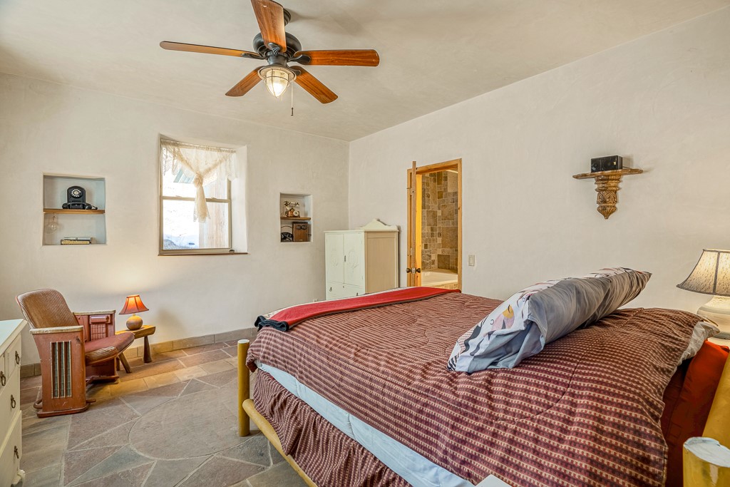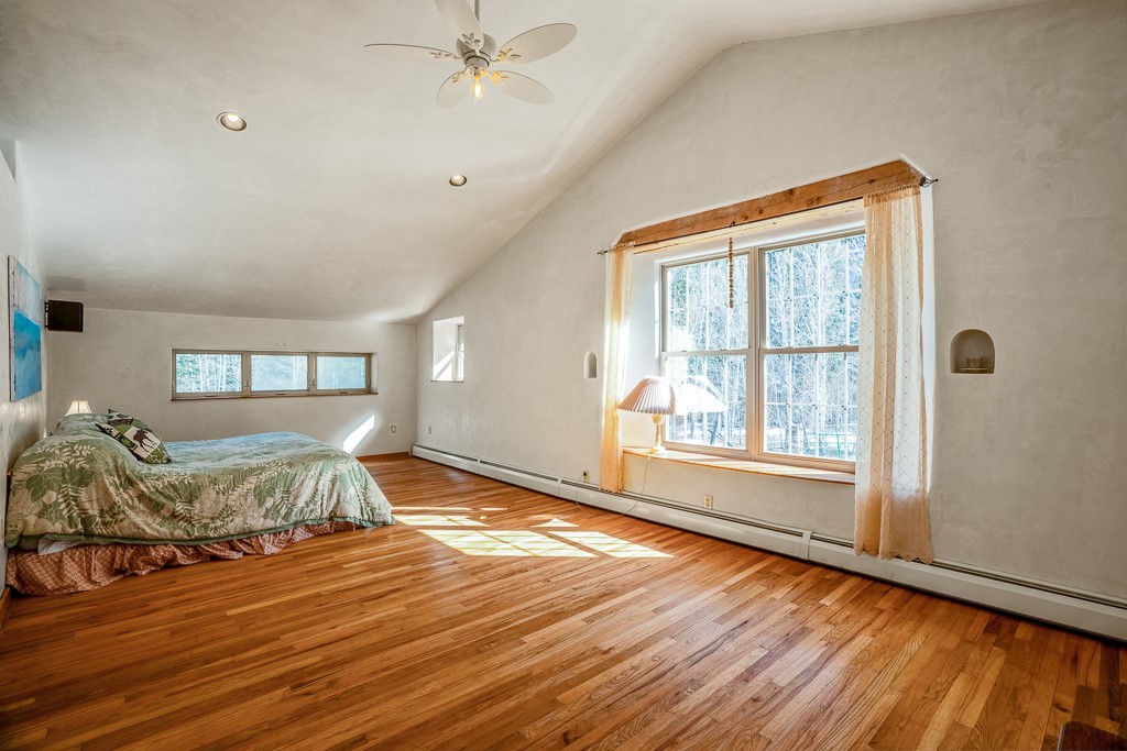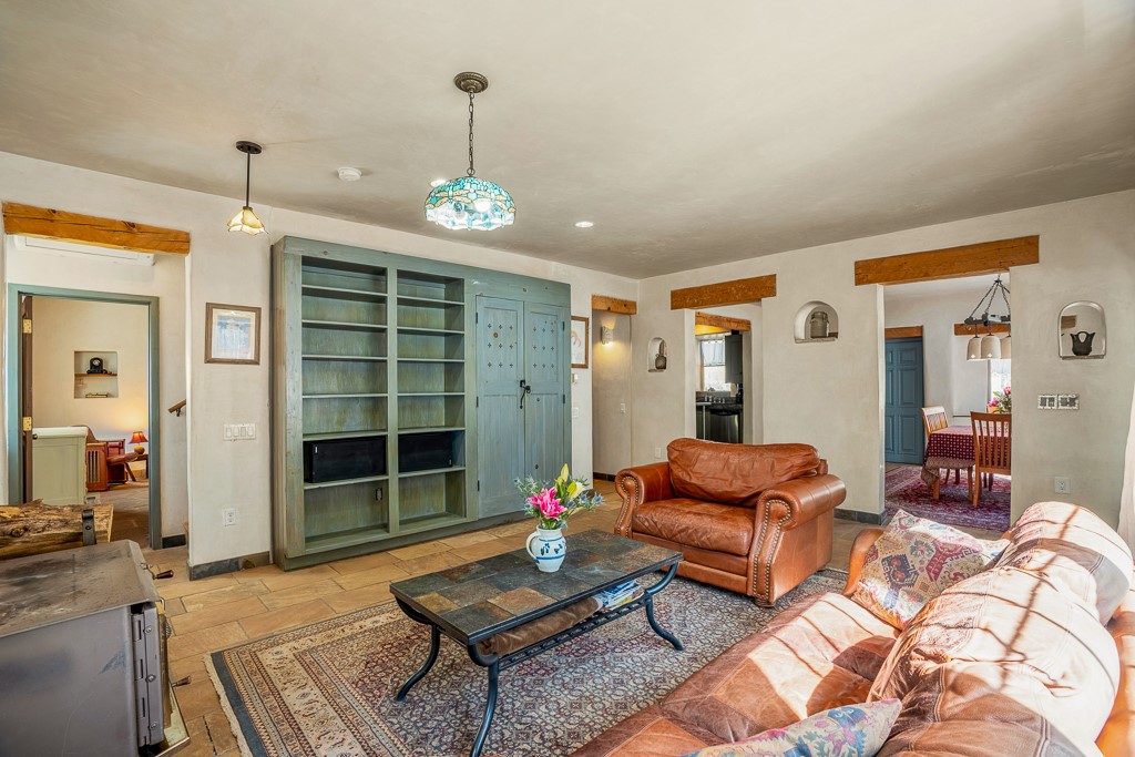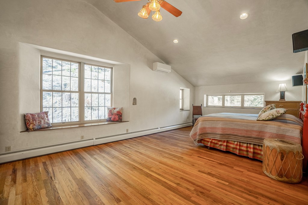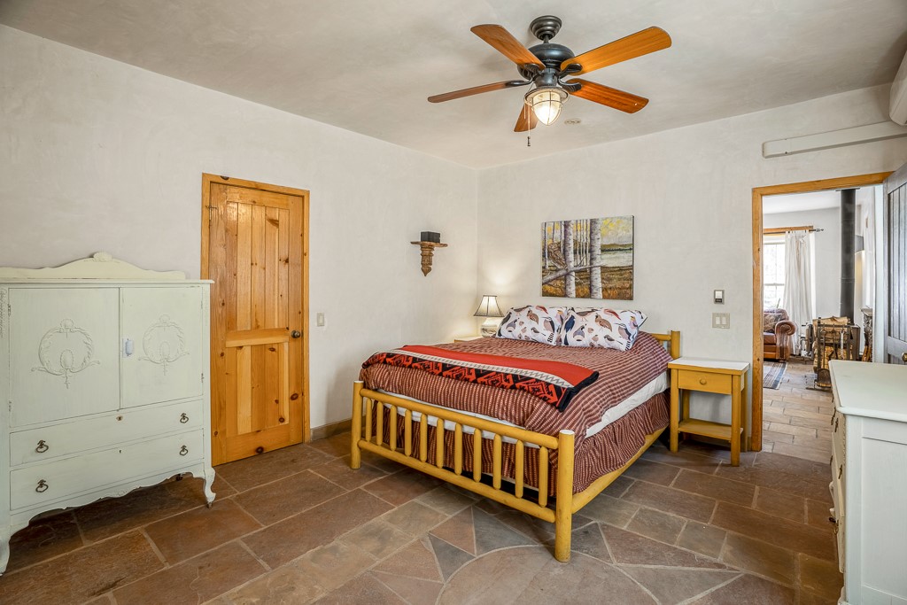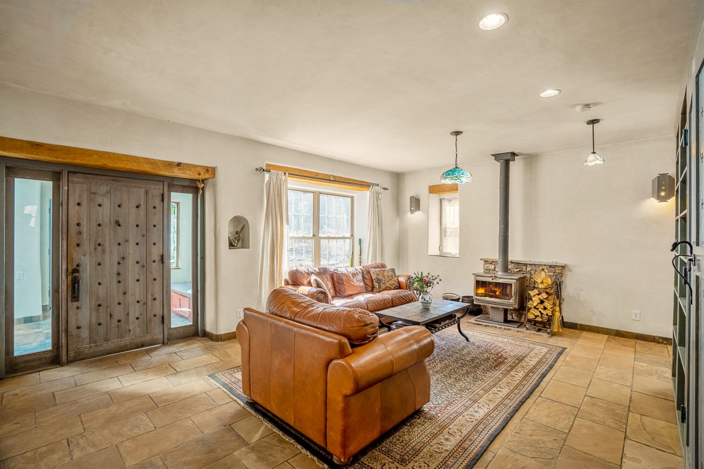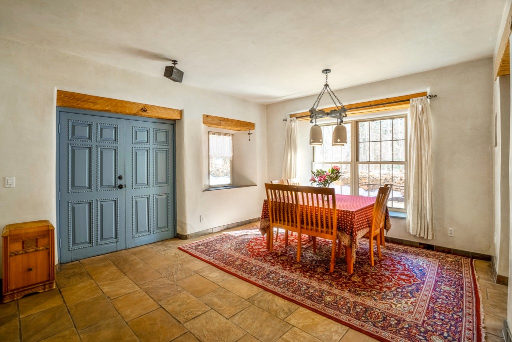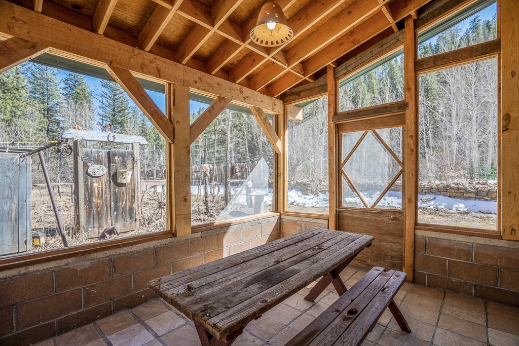This exceptional pumice-crete home is a handcrafted sanctuary in the heart of the Santa Fe National Forest--set in a gated, 12-home enclave surrounded by thousands of acres of woodland and close to the gorgeous Pecos Wilderness and world class fishing in the Pecos River. Inside, Santa Fe-style elegance includes diamond plaster walls, hand-carved vigas, and flagstone floors. Built to endure, its 11-inch non-combustible walls and metal roof offer exceptional wildfire resilience.Just outside, an intermittent mountain stream runs through with aspen, ponderosa, and wildflower-filled canyon. Wildlife and serenity abound, and trails begin at your doorstep. Fully on-grid but off the beaten path--no cell service, no noise, total peace, with satellite internet available for those who need to check in with the world. The arts and culture of Santa Fe is just an hour away. Property features two large, high-ceilinged bedrooms upstairs, with 100-year old oak floors, as well as a bonus room perfect for art studio or office space. A smaller bedroom is on the first floor. Outdoor spaces abound, with an attached sunroom, fenced garden area, and gazebo perfect for summer cookouts. Two adjacent parcels also available. This is a one-of-a-kind chance to create a secure, nature-connected lifestyle in a rapidly changing world.