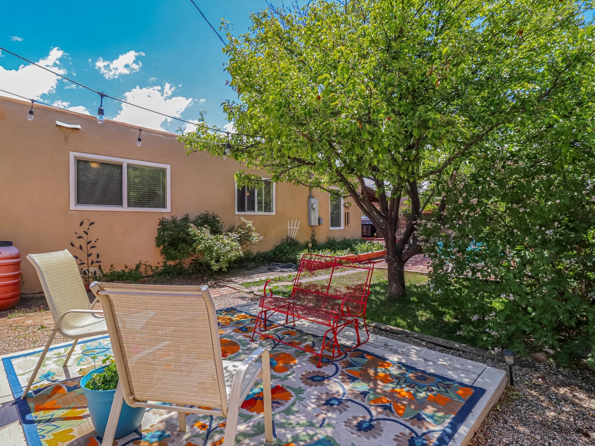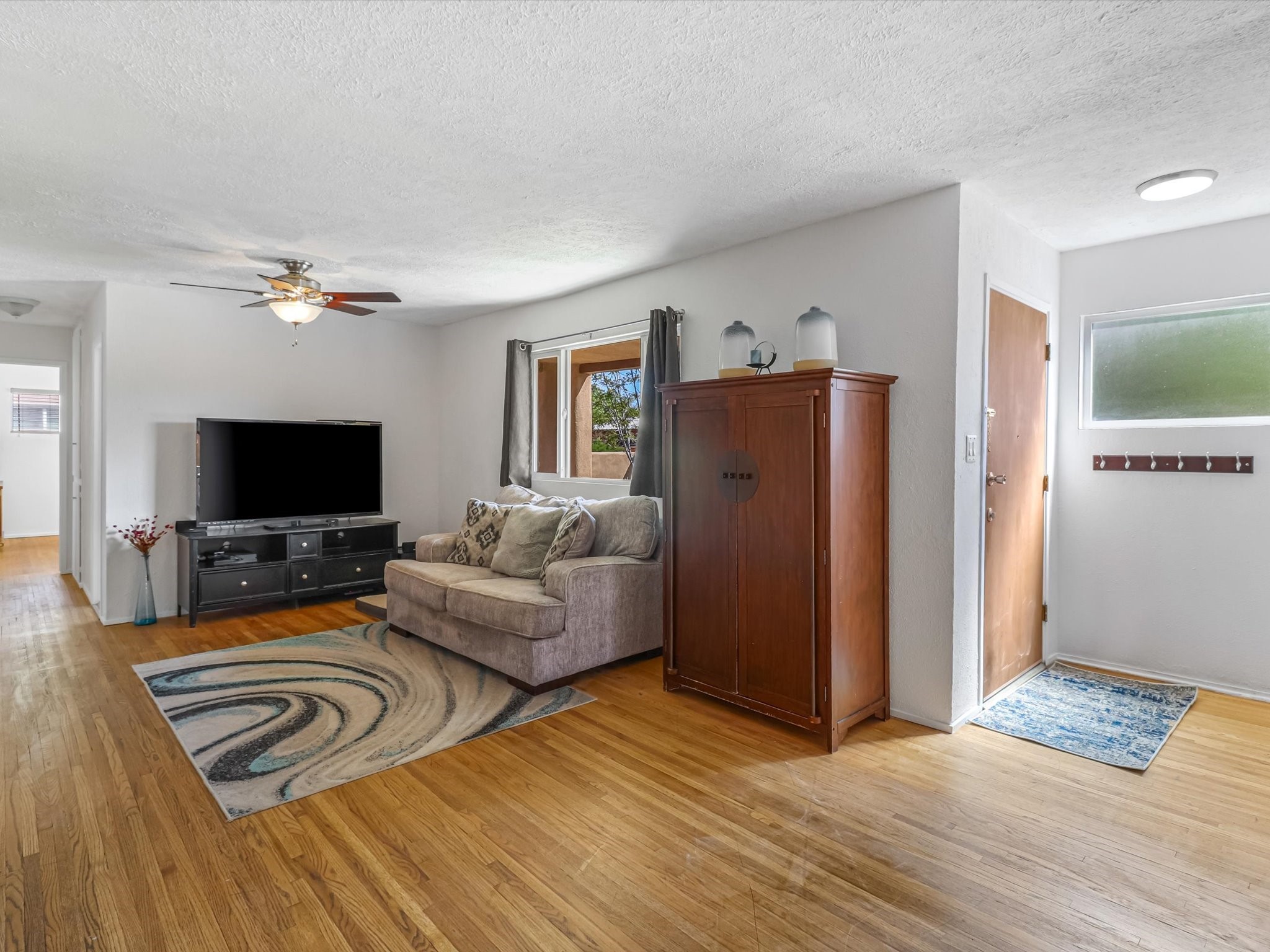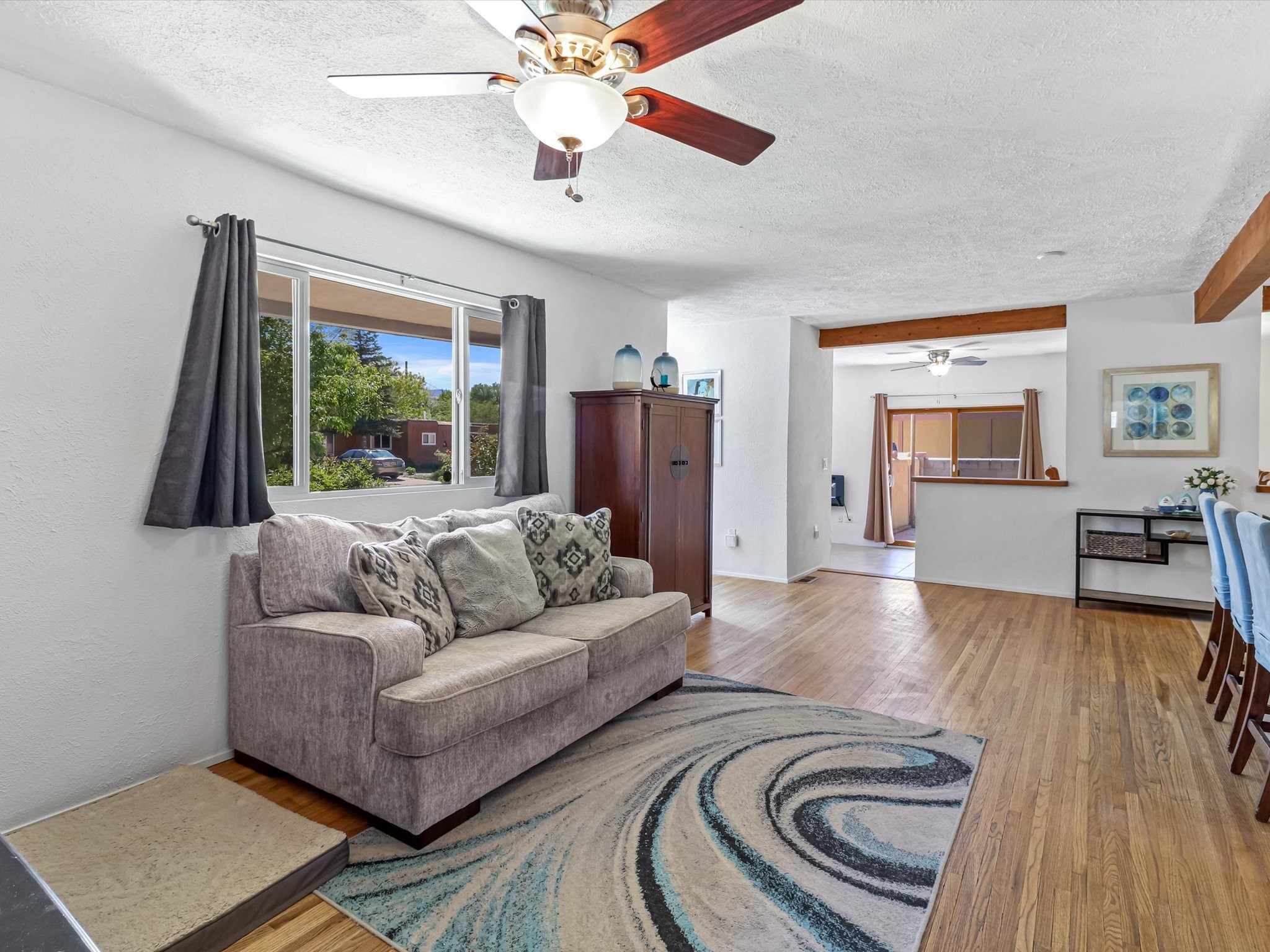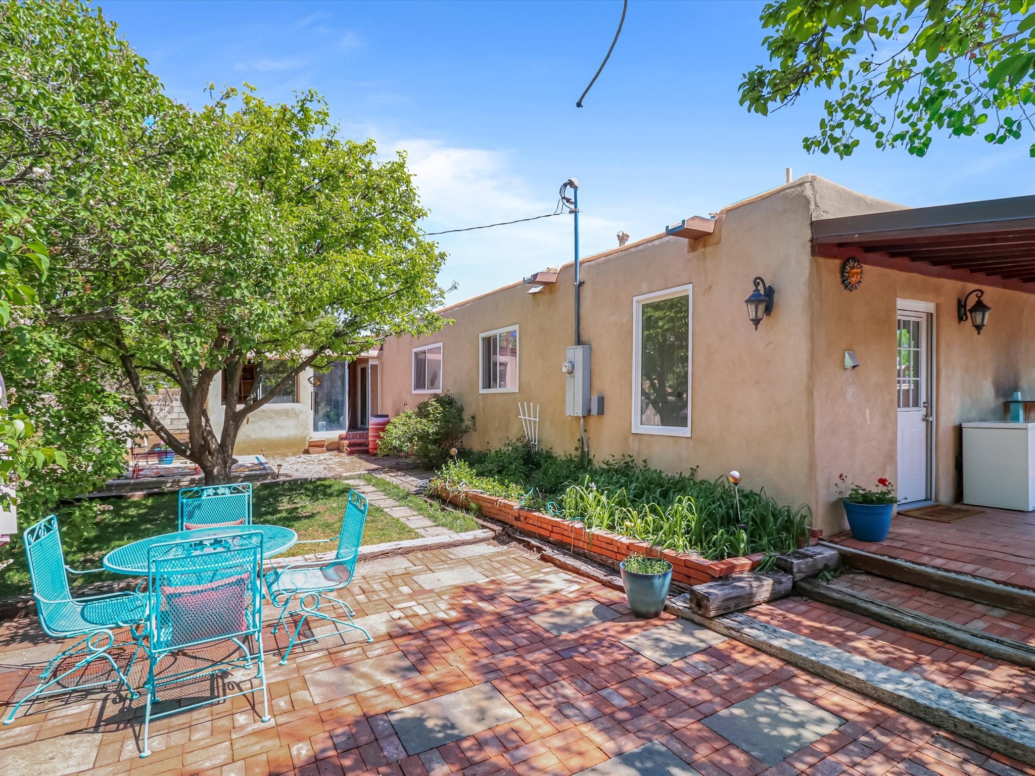This inviting 3-bedroom, 2-bath home offers an open floor plan and timeless character. Built in 1954, the residence features original wood floors throughout, blending classic charm with modern flow. The attractive open concept living and dining areas are great for everyday living and entertaining.The exterior invokes a peaceful oasis--lush with flowers and mature fruit trees, the outdoor space is perfect for relaxing or hosting gatherings. Nestled in the highly sought-after Casa Solana neighborhood, this home offers comfort, charm, and convenience just minutes from Santa Fe's popular downtown area.