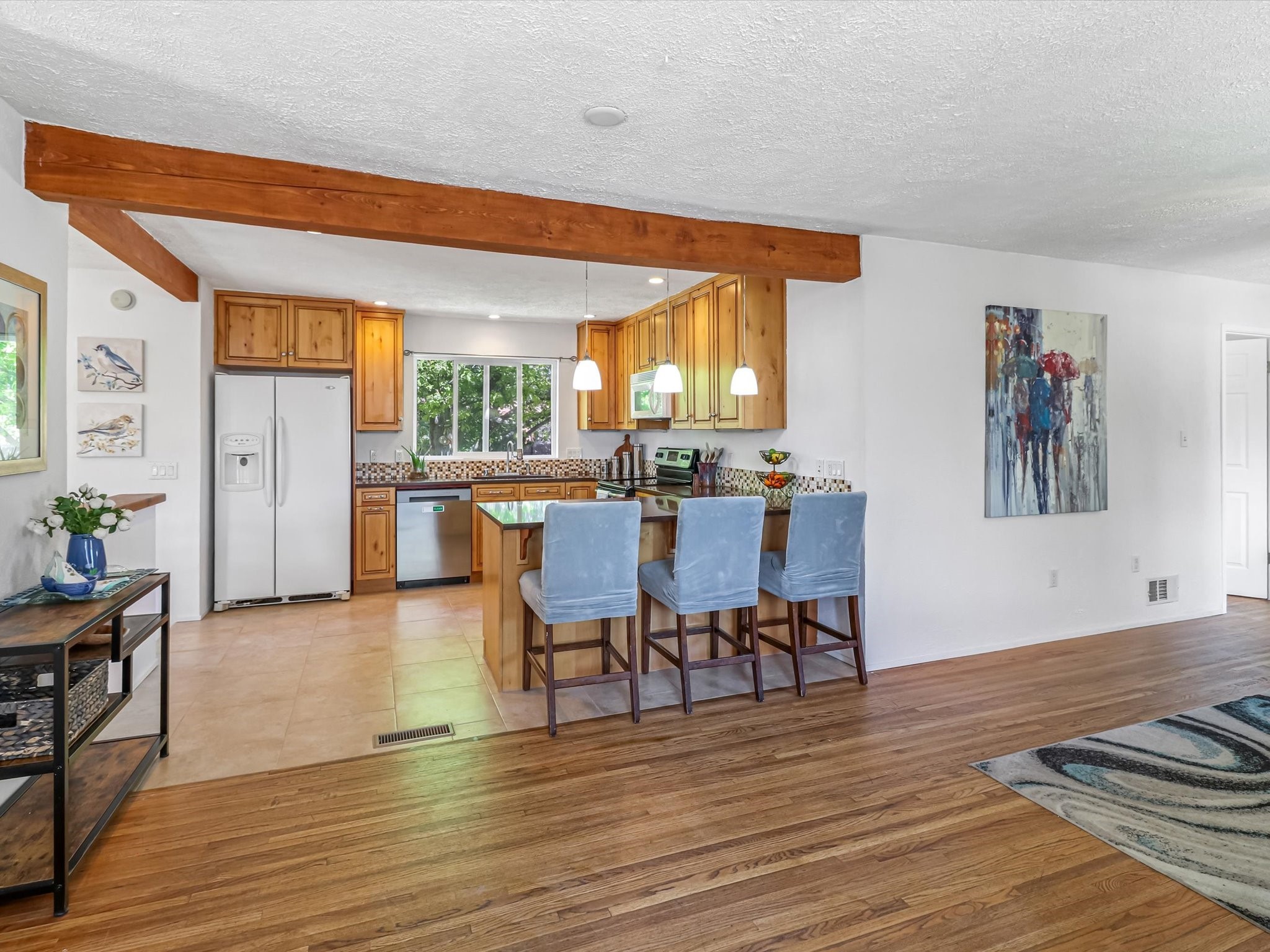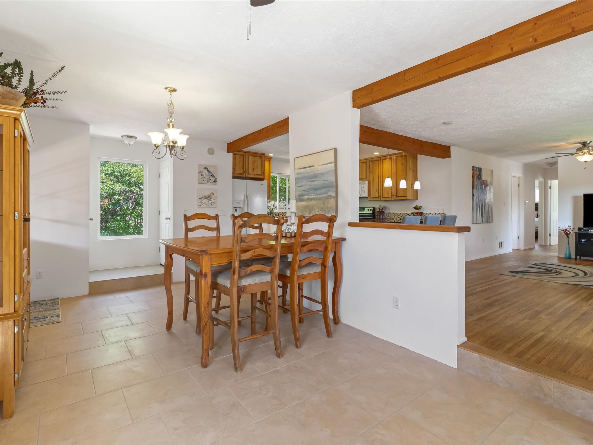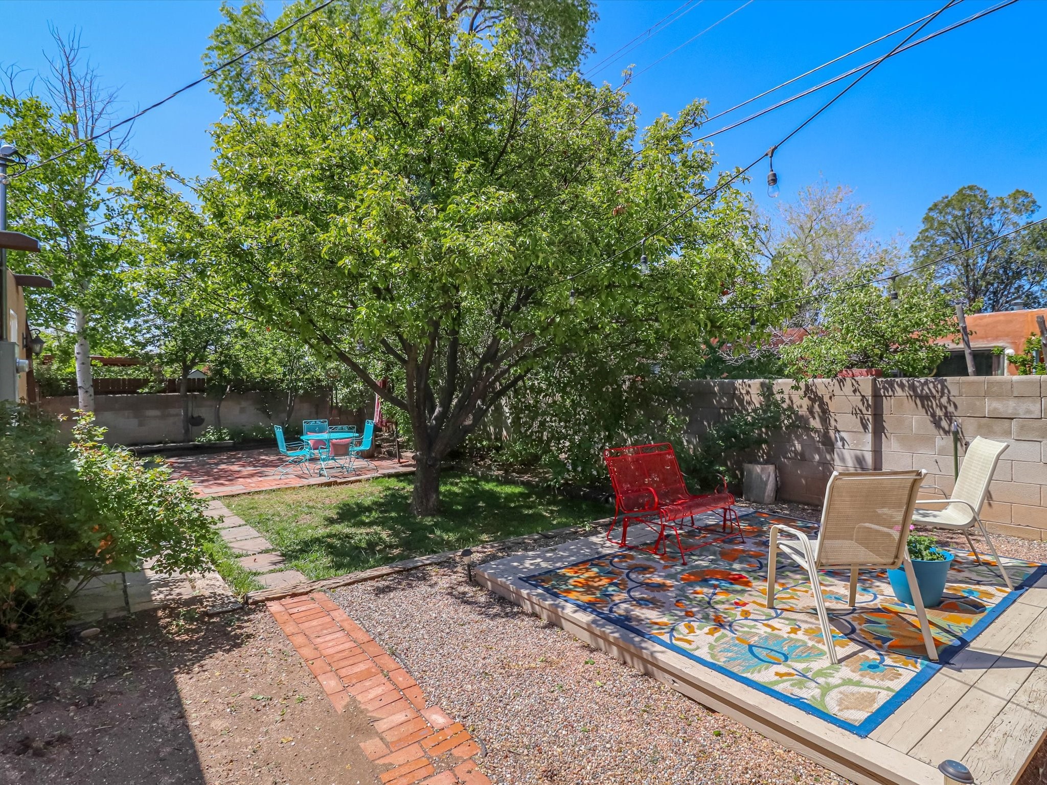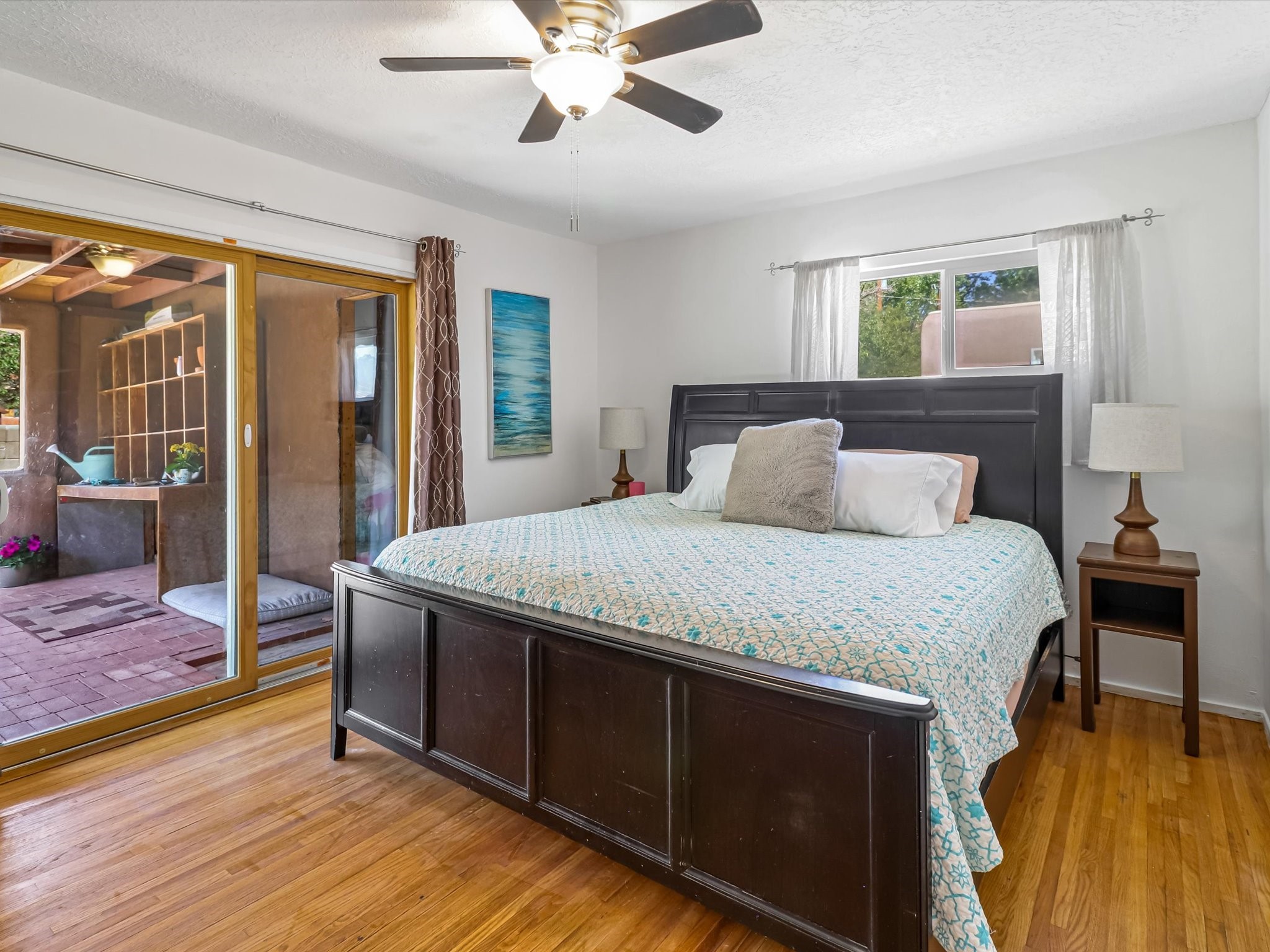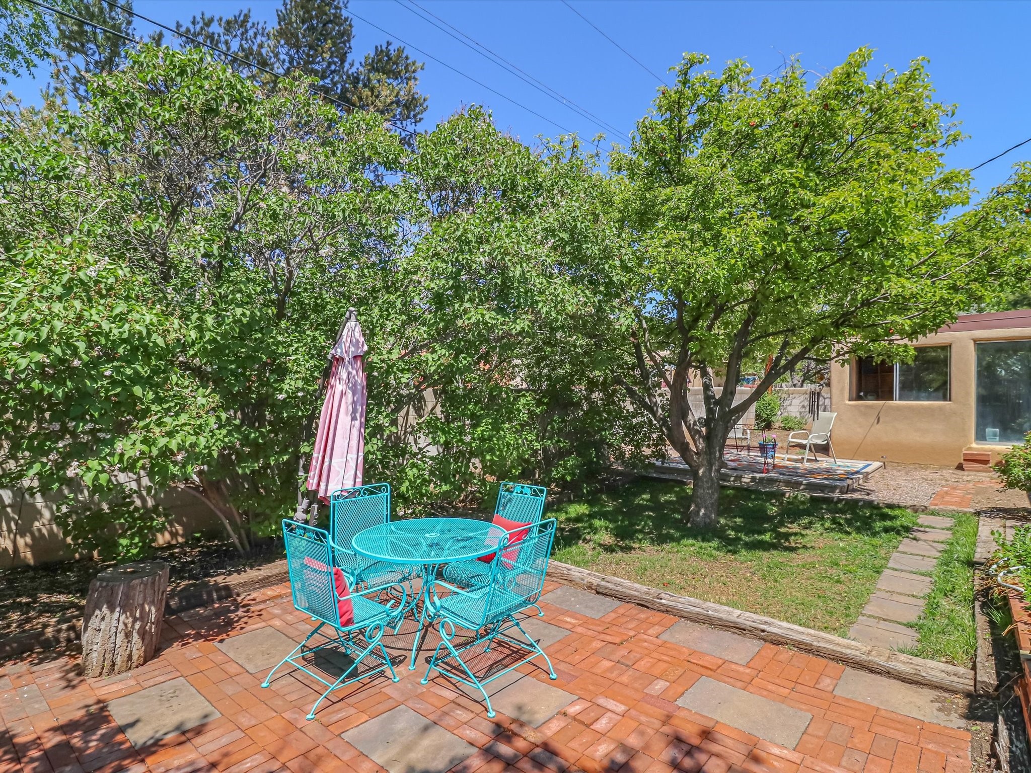 This inviting 3-bedroom, 2-bath home offers an open floor plan and timeless character. Built in 1954, the residence features original wood floors throughout, blending classic charm with modern flow. The attractive open concept living and dining areas are great for everyday living and entertaining.The exterior invokes a peaceful oasis--lush with flowers and mature fruit trees, the outdoor space is perfect for relaxing or hosting gatherings. Nestled in the highly sought-after Casa Solana neighborhood, this home offers comfort, charm, and convenience just minutes from Santa Fe's popular downtown area.
