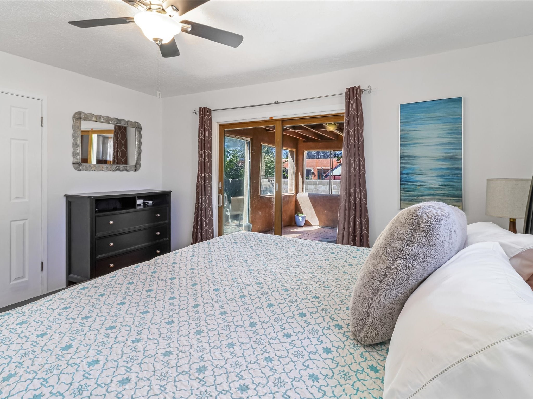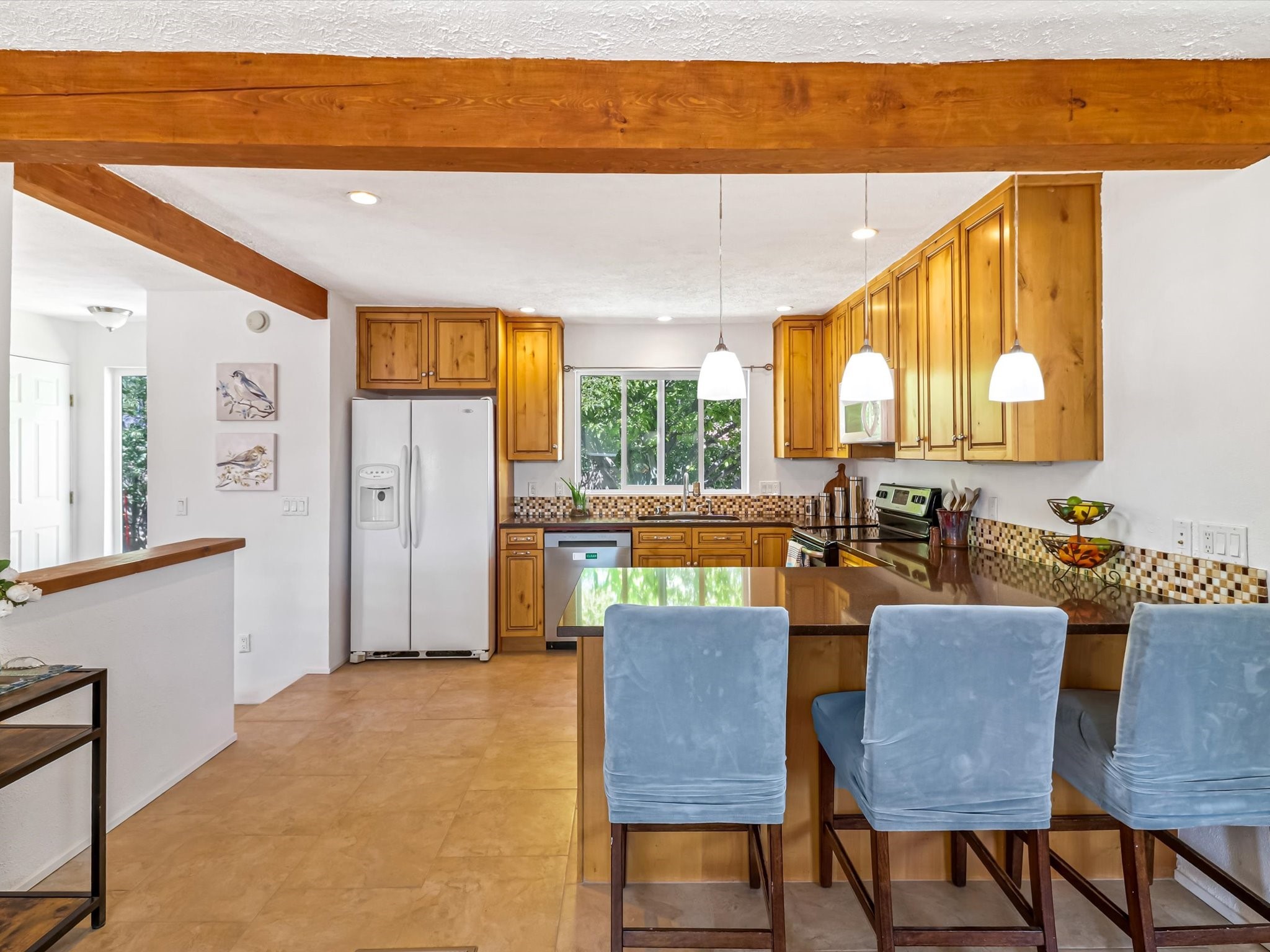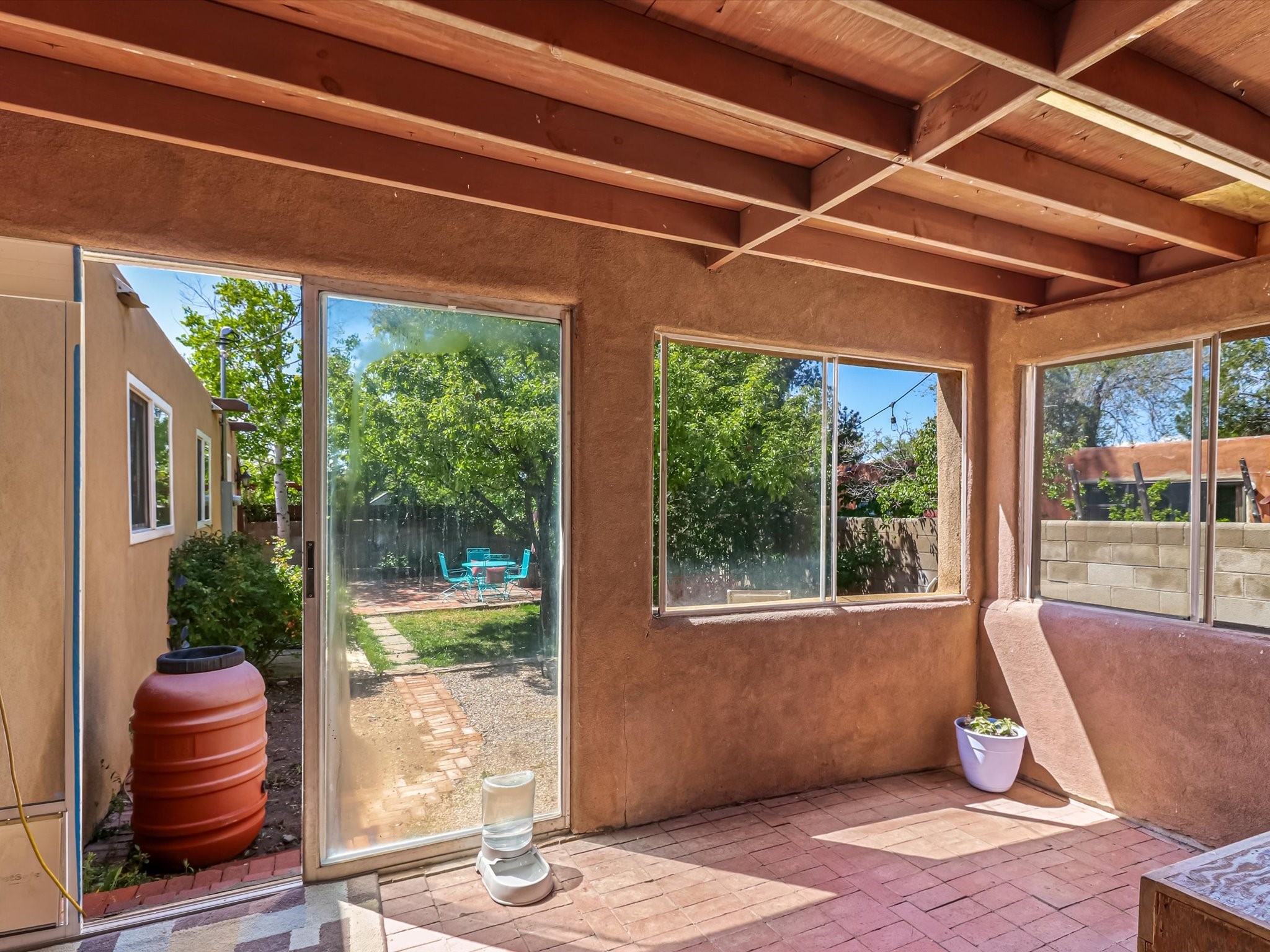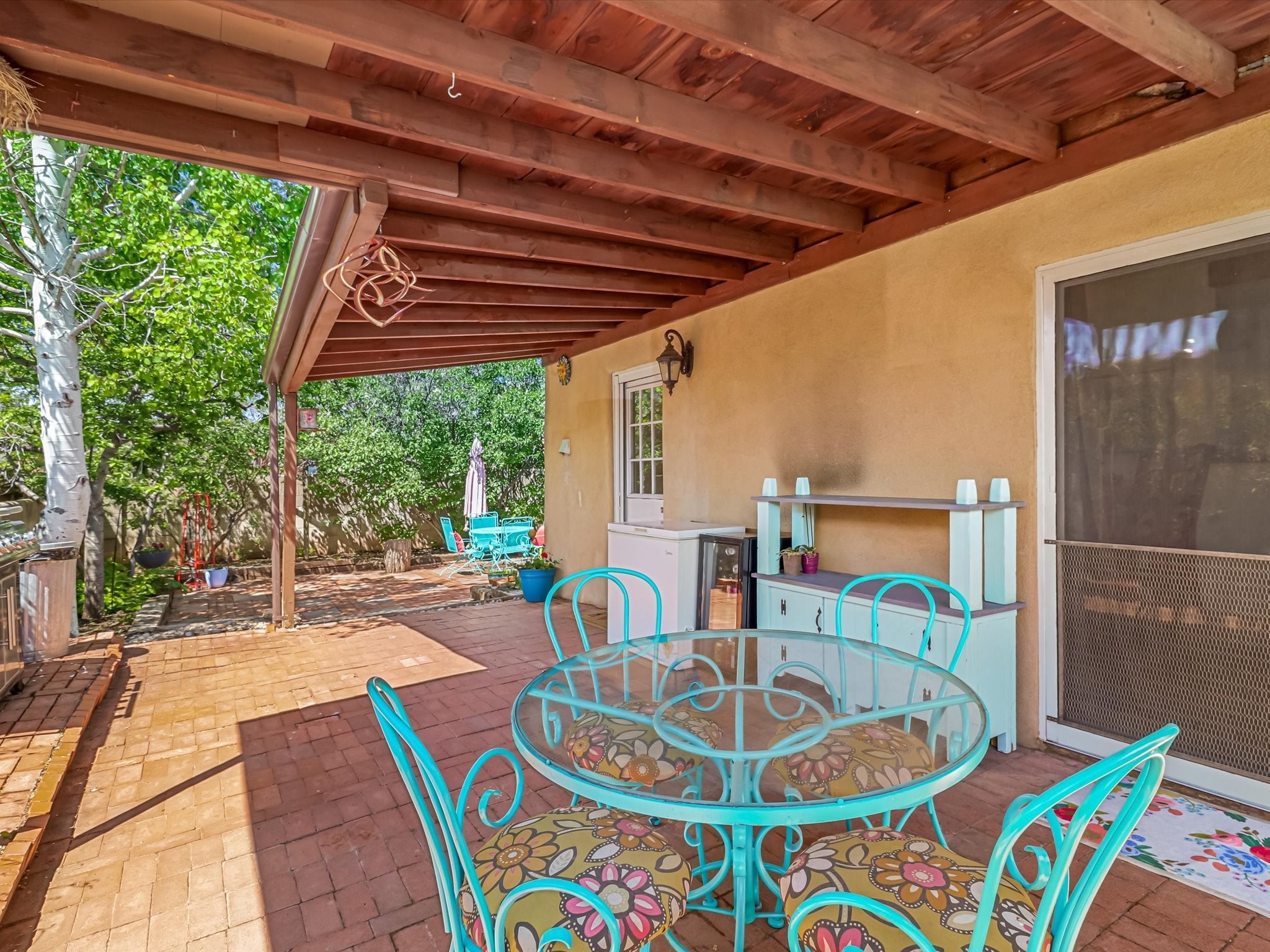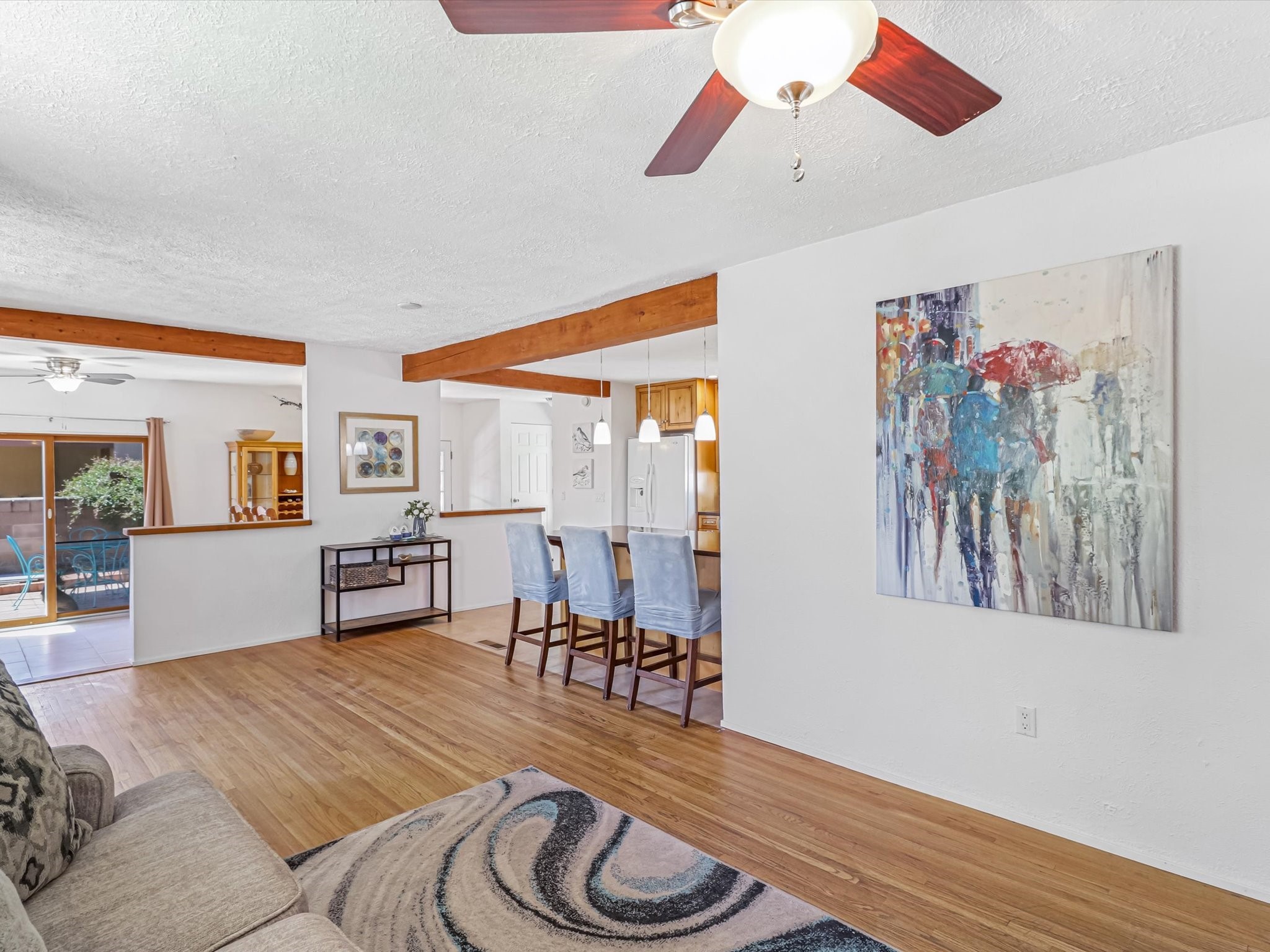 This inviting 3-bedroom, 2-bath home offers an open floor plan and timeless character. Built in 1954, the residence features original wood floors throughout, blending classic charm with modern flow. The attractive open concept living and dining areas are great for everyday living and entertaining.The exterior invokes a peaceful oasis--lush with flowers and mature fruit trees, the outdoor space is perfect for relaxing or hosting gatherings. Nestled in the highly sought-after Casa Solana neighborhood, this home offers comfort, charm, and convenience just minutes from Santa Fe's popular downtown area.