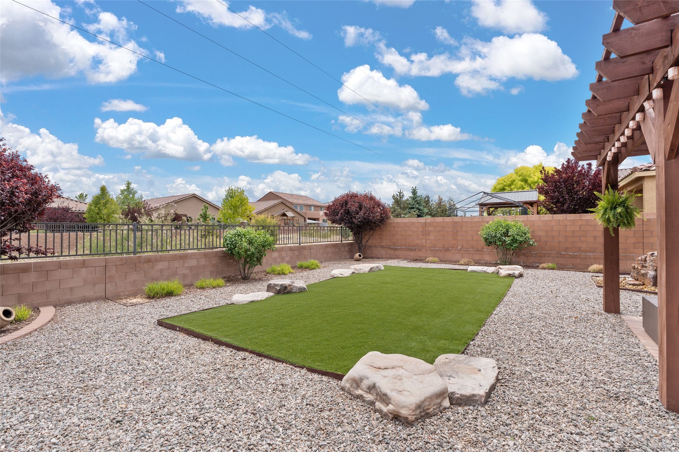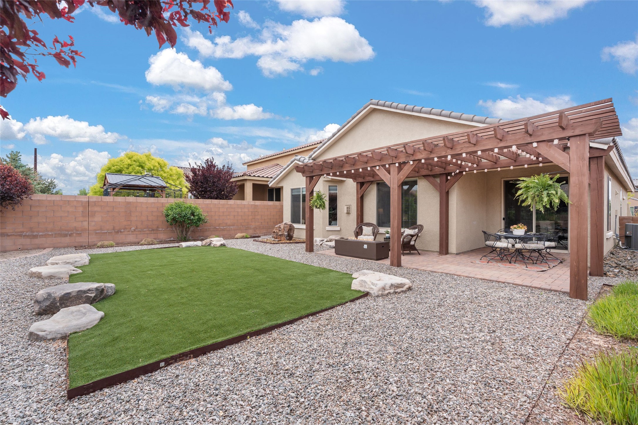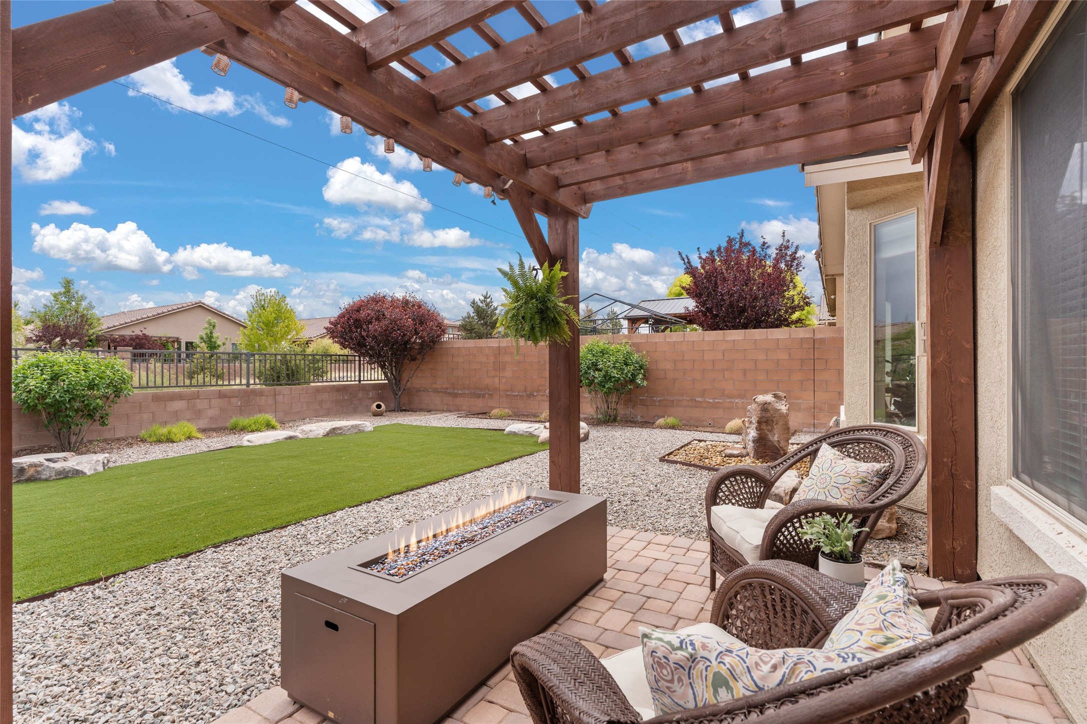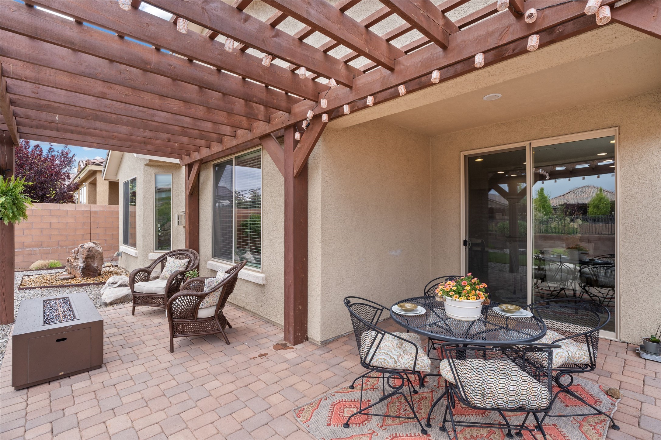 Enjoy the desirable lifestyle of Las Soleras in this beautiful community conveniently located for easy access to downtown Santa Fe, Albuquerque, Los Alamos, the Rail Runner as well as schools, healthcare, shopping, dining and cultural destinations. This 3 bedroom/2 bathroom home was thoughtfully designed and offers a large open plan Living Room, Dining Area and Kitchen and excellent separation between the Primary ensuite Bedroom and the other bedrooms. Enter the Primary Bedroom Ensuite from a foyer off the Living Room and enjoy the generously sized bedroom, a large bathroom with a linen and walk-in closet. Other bedrooms and bathroom are towards the front of the home and adjacent to the long entry hallway opening up to the Living/Dining and Kitchen. The Kitchen has granite counter tops, all wood cabinetry, a Pantry and ample room for cooking and entertaining. Walk outside to a beautiful and welcoming trellis covered patio and green turf back yard area that is ideal for dining and lounging to the trickling sound from the stone water feature. Las Soleras has an extensive trail system for walking and running as well as Las Soleras Park for birdwatching, outdoor sports, picnicking and includes essential amenities like parking restrooms, a leisure playground and a shelter available for use. This is a versatile home that can fit any type of lifestyle so schedule your showing today!