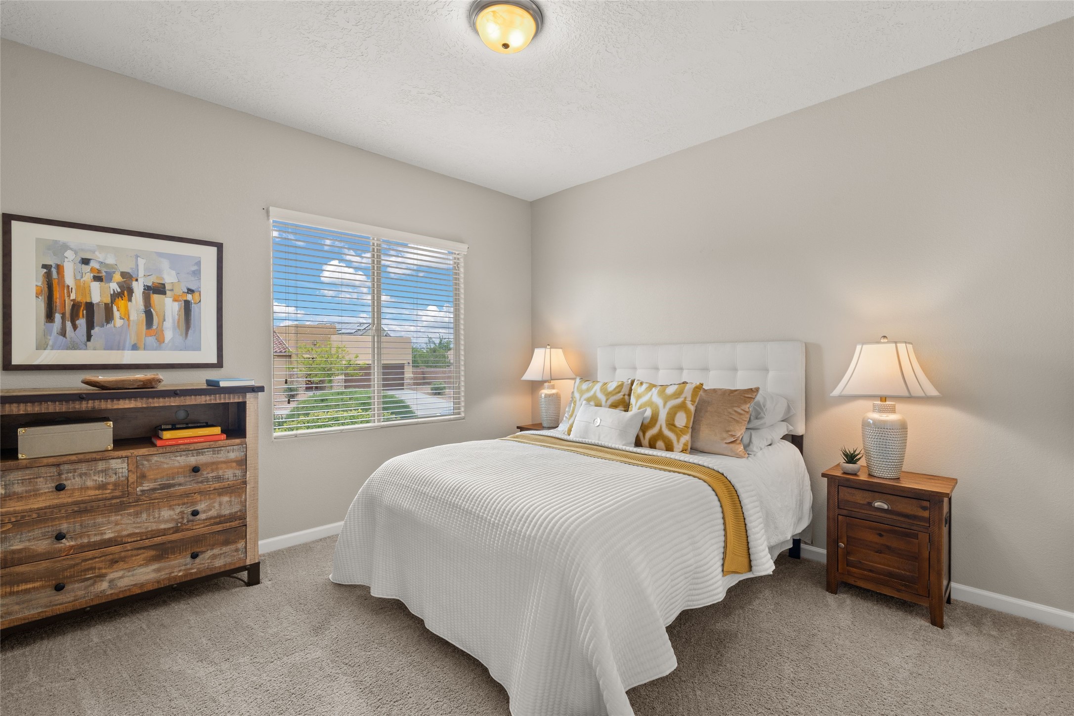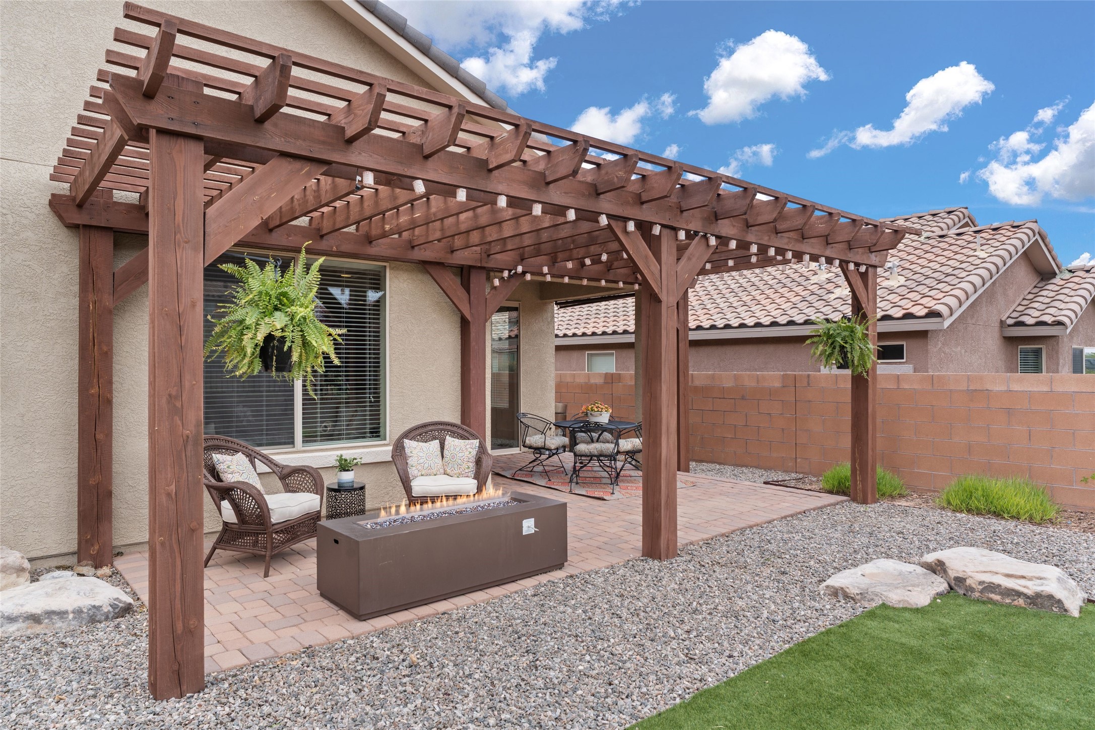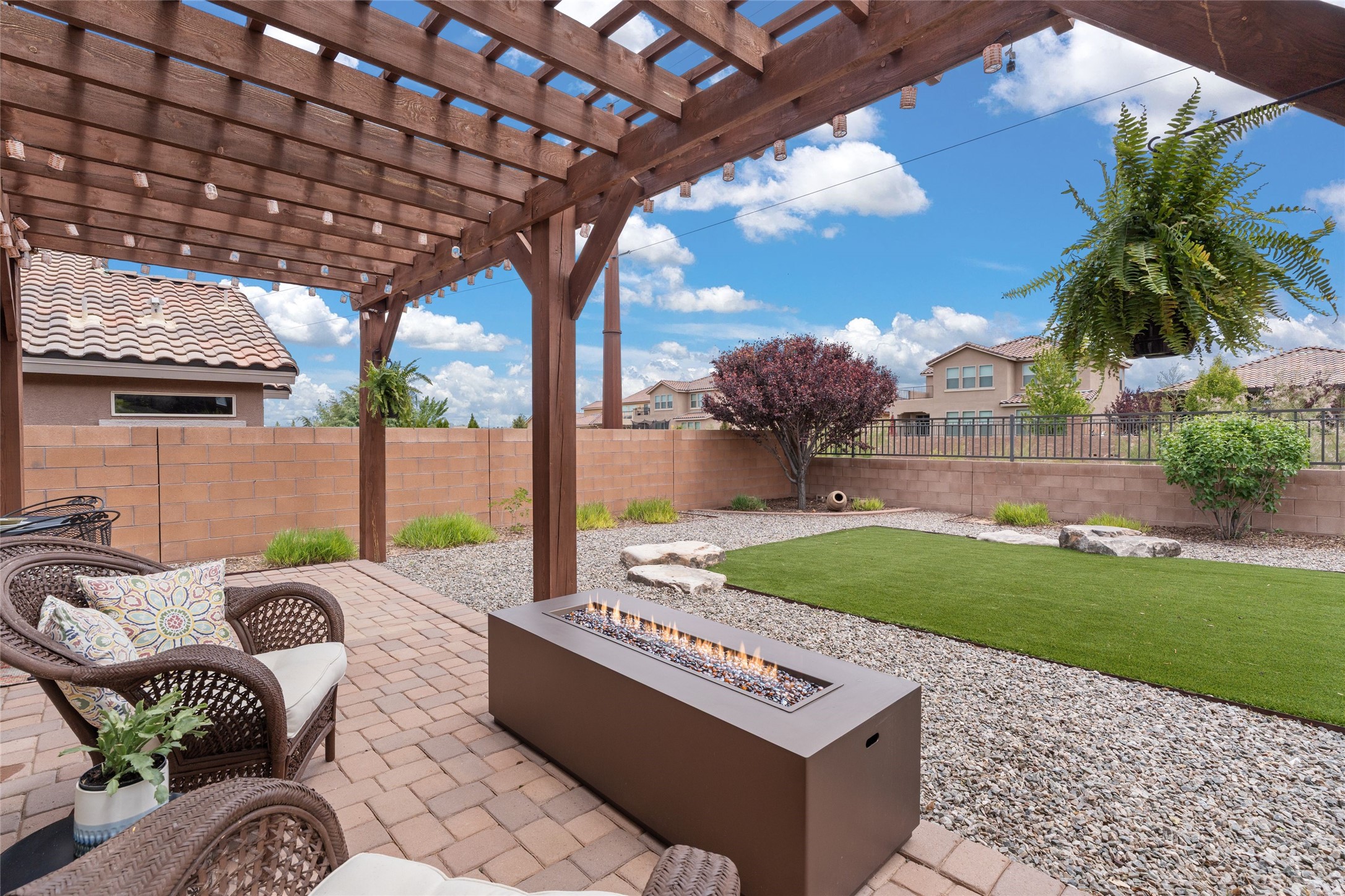 Enjoy the desirable lifestyle of Las Soleras in this beautiful community conveniently located for easy access to downtown Santa Fe, Albuquerque, Los Alamos, the Rail Runner as well as schools, healthcare, shopping, dining and cultural destinations. This 3 bedroom/2 bathroom home was thoughtfully designed and offers a large open plan Living Room, Dining Area and Kitchen and excellent separation between the Primary ensuite Bedroom and the other bedrooms. Enter the Primary Bedroom Ensuite from a foyer off the Living Room and enjoy the generously sized bedroom, a large bathroom with a linen and walk-in closet. Other bedrooms and bathroom are towards the front of the home and adjacent to the long entry hallway opening up to the Living/Dining and Kitchen. The Kitchen has granite counter tops, all wood cabinetry, a Pantry and ample room for cooking and entertaining. Walk outside to a beautiful and welcoming trellis covered patio and green turf back yard area that is ideal for dining and lounging to the trickling sound from the stone water feature. Las Soleras has an extensive trail system for walking and running as well as Las Soleras Park for birdwatching, outdoor sports, picnicking and includes essential amenities like parking restrooms, a leisure playground and a shelter available for use. This is a versatile home that can fit any type of lifestyle so schedule your showing today!
