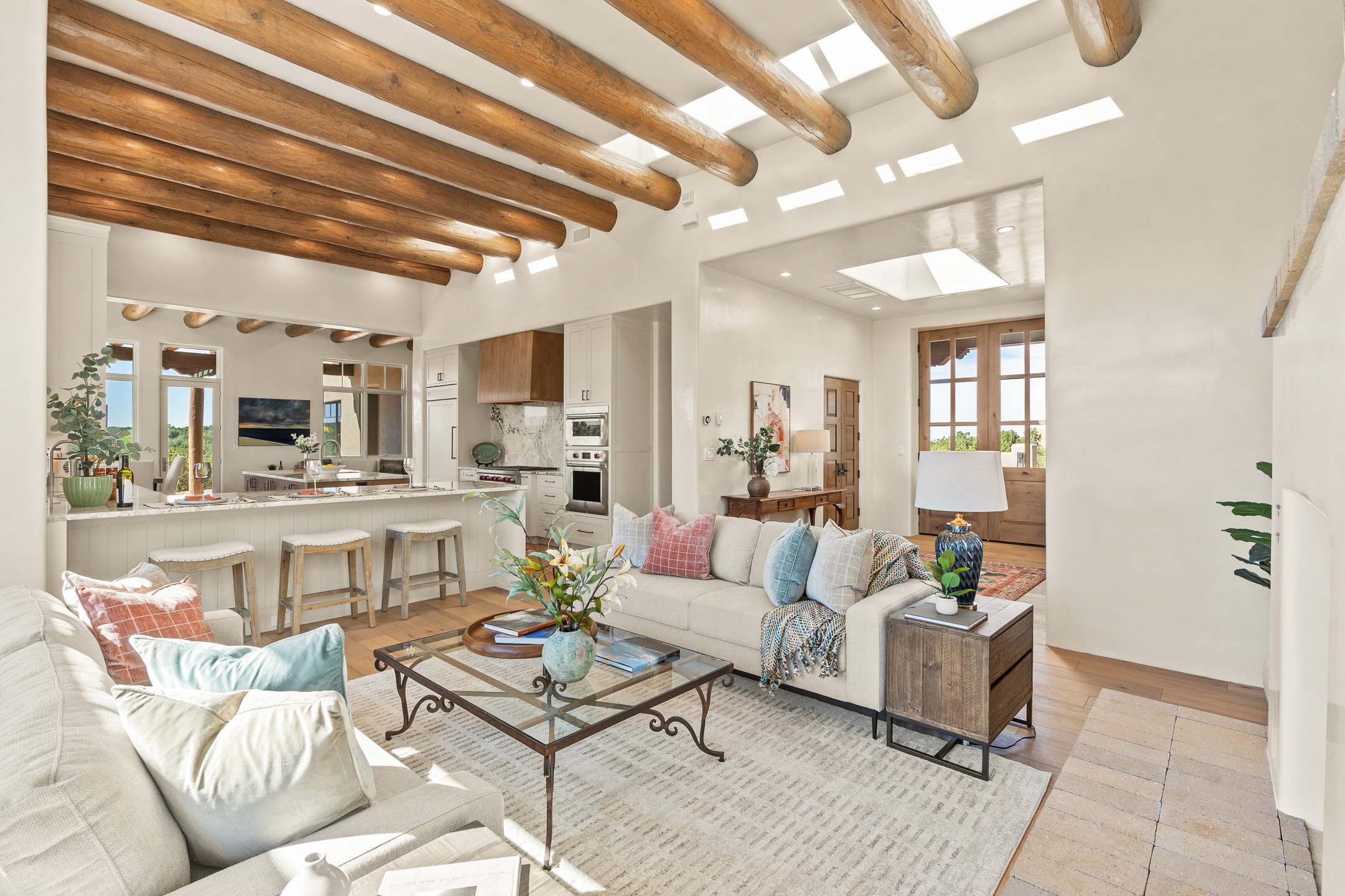 Newly constructed and just 15 minutes from The Plaza, this stunning 3,251 sq. ft. single-level home is bathed in soft natural light and offers sweeping views of the Sangre de Cristo Mountains. From the moment you enter, the sophisticated blend of Southwestern and contemporary architecture is evident, featuring hand-troweled diamond plaster walls, white oak flooring, and striking vigas. Expansive picture windows, accented with divided light transoms, frame dramatic mountain views, bringing Santa Fe's natural light into every room. The kitchen is a natural gathering spot with a generous island and sink for prep and socializing, an eat-in bar for casual dining, a 6-burner Wolf gas cooktop, Subzero appliances, custom cabinetry, and a perfectly positioned sink that captures the mountain vistas. The deep east-facing brick portal, accessible from the living and dining areas, extends the Southwestern experience outdoors with high ceilings, vigas, and a traditional wood-burning kiva fireplace. Tucked in the southeast wing, the private primary suite features a corner gas fireplace and direct access to the rear portal, offering seclusion and views. The ensuite bath includes dual vanities, a deep soaking tub, walk-in shower, and a closet spacious enough for even the most devoted shopper. The large laundry room connects directly to the primary closet for convenience. The guest wing offers two ensuite bedrooms with full bathrooms, designed for visitor comfort and privacy. In-floor radiant heat, forced air heating, central air conditioning, and a spacious 3-car garage add exceptional comfort and value. A special bonus: 6 Sierra Ct is located in Colinas Verdes, a distinct neighborhood with its own HOA within the gates of Las Campanas. Discover a home where elegance, comfort, and the beauty of Santa Fe come together seamlessly--your sanctuary awaits at 6 Sierra Ct.