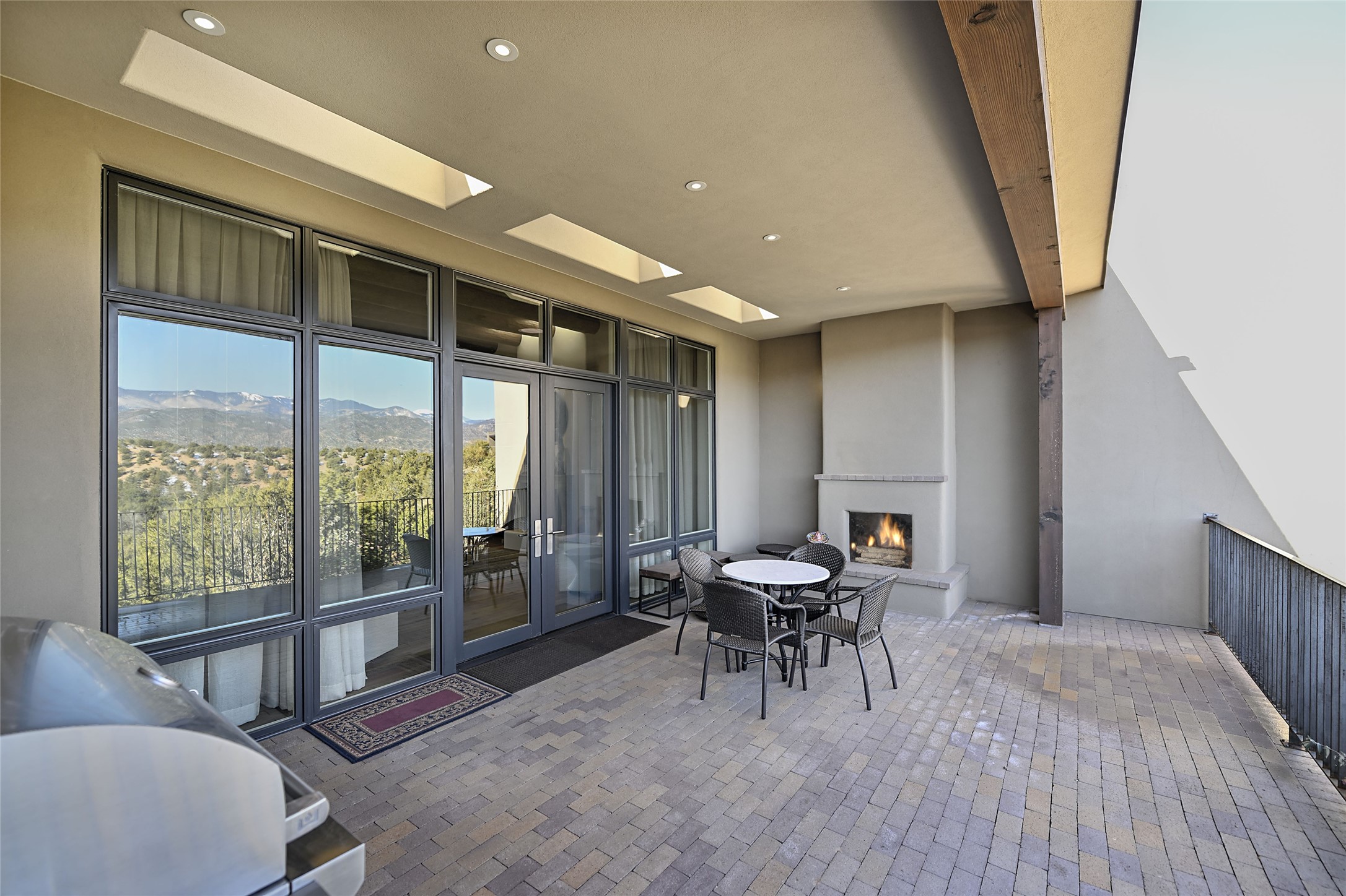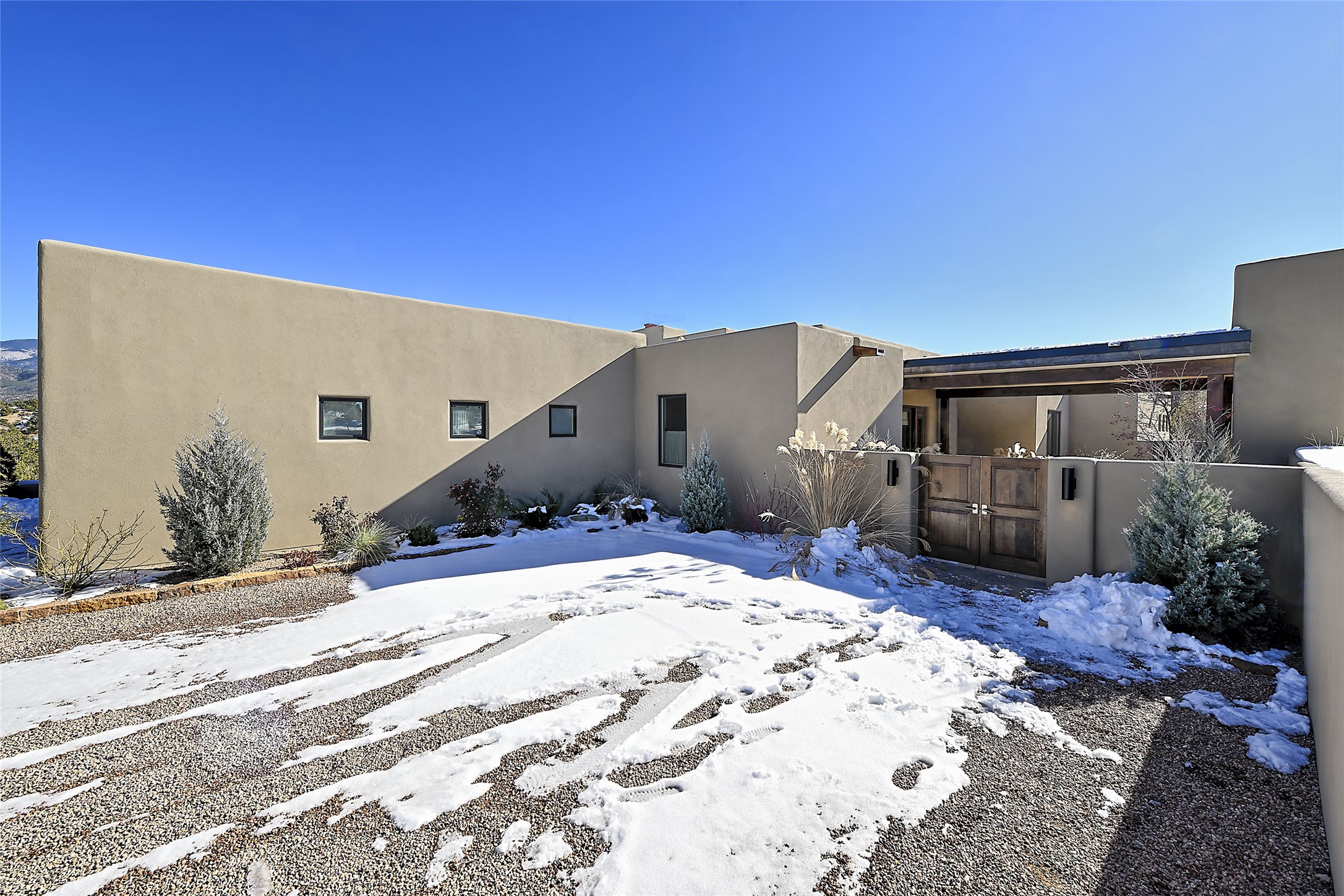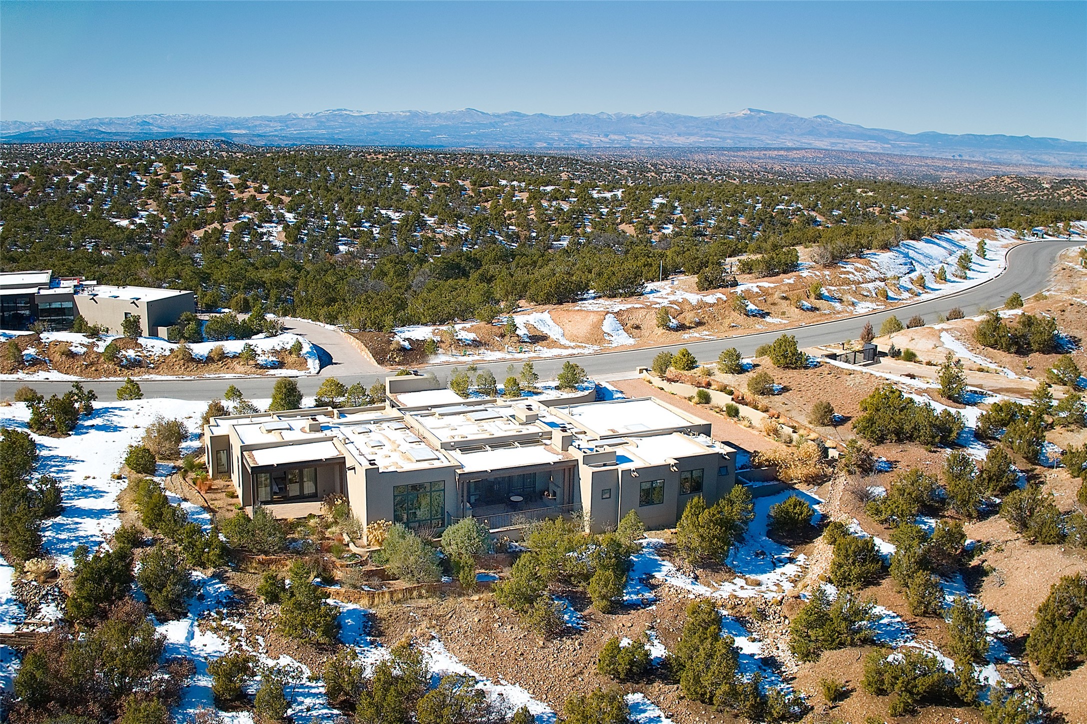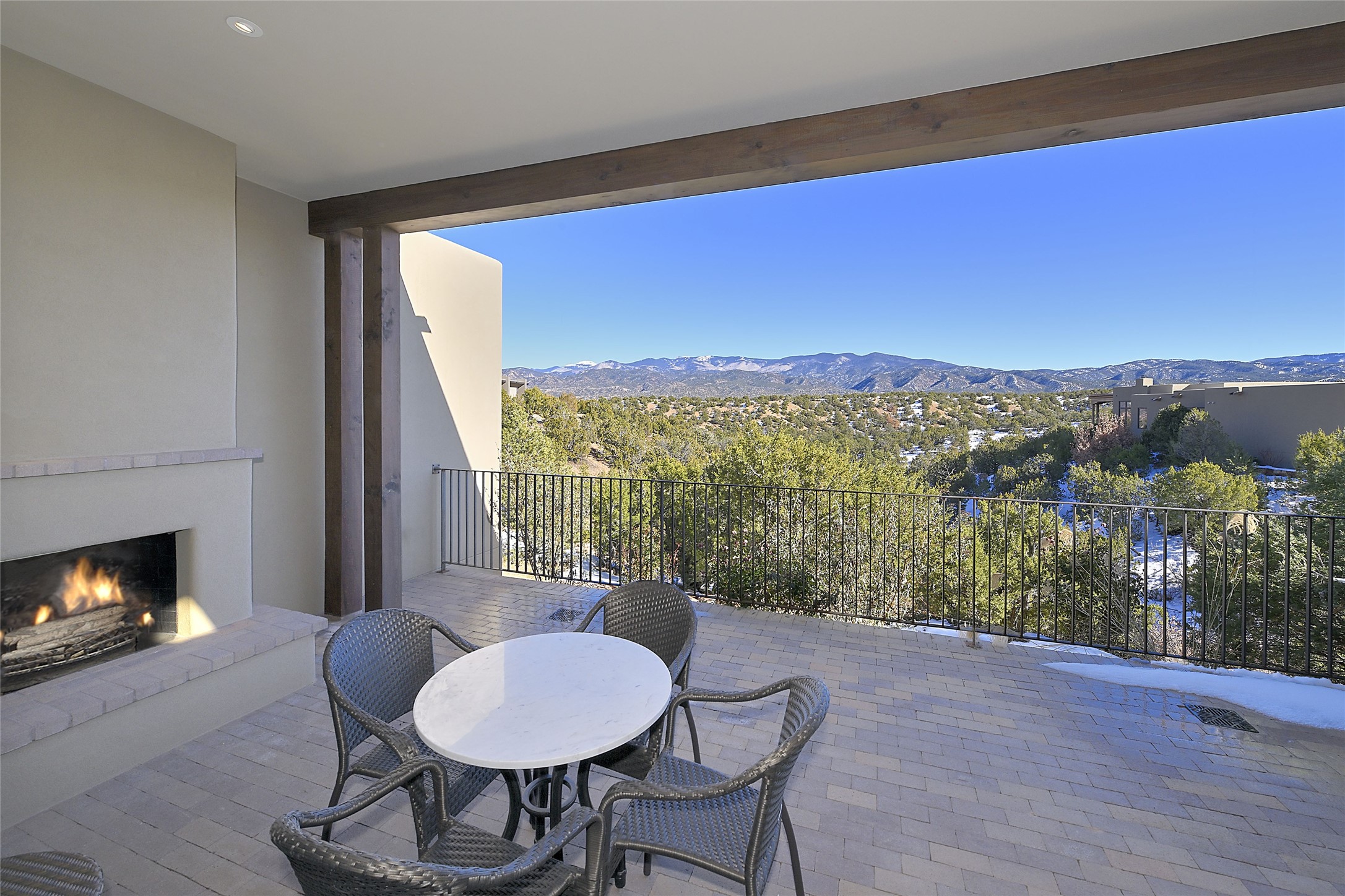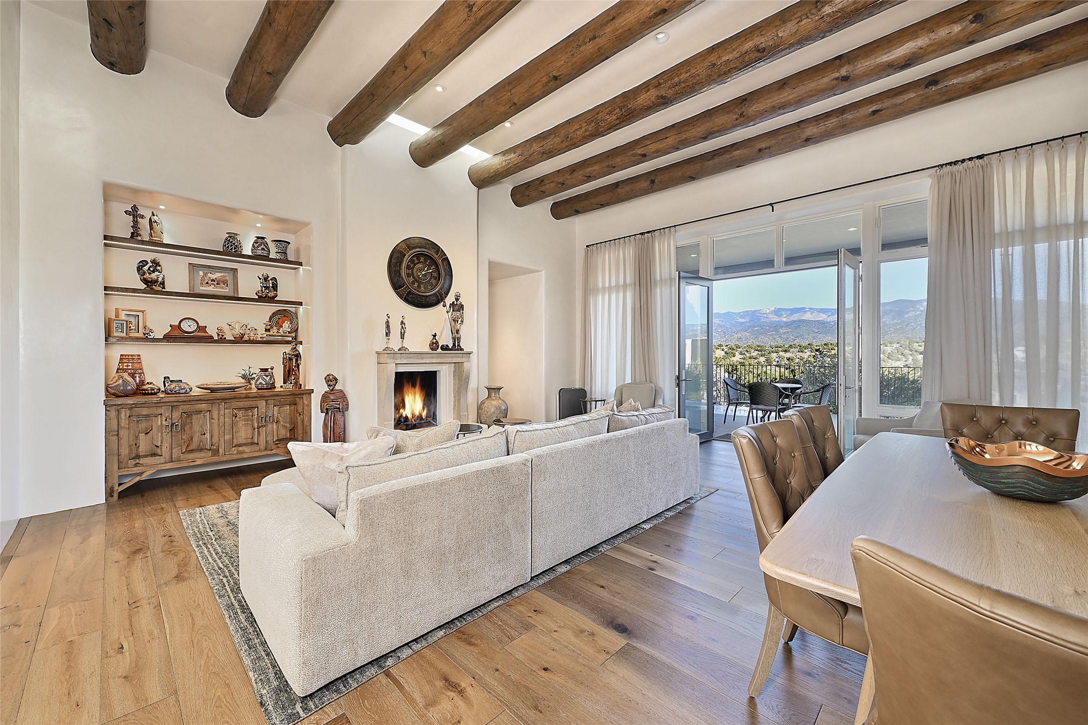 Monte Sereno 3 bedroom 3.5 bath soft Contemporary home on almost 1.5 acres with magnificent Sangre de Cristomountain views from all living areas (with dedicated open space to the immediate east of the home). Built in 2022 by Woods/Design Builder. White oak floors and plaster walls and ceilings throughout. Open concept living/kitchen for ease of entertaining and living. Grand living area has high ceilings with broad vigas, wood burning fireplace and built in shelves and cabinetry. Generous gourmet kitchen is appointed with Taj Mahal countertops, an oversized island, Wolf wall oven, range and microwave, SubZero fridge, Cove dishwasher, mini beverage fridge, and 2 handcrafted Shaws farmhouse sinks. Adjacent to the kitchen is a hearth/breakfast room with gas kiva fireplace and large view windows with auto window shades. Split bedroom plan. Primary suite has built in shelving, gas fireplace, French doors to private patio with mountain views and ensuite bath with large walk-in closet with built-ins and island with drawers. Both guest bedrooms are ensuite baths. Outdoor areas include a front, gated portal with wood burning, lighted, stone fireplace and a rear portal with wood burning fireplace and built in Wolf grill. Monte Sereno is a unique master-planned community situated in the pion and juniper studded hills, with miles of private walking trails - located between the Santa Fe Opera and the historic Santa Fe Plaza.