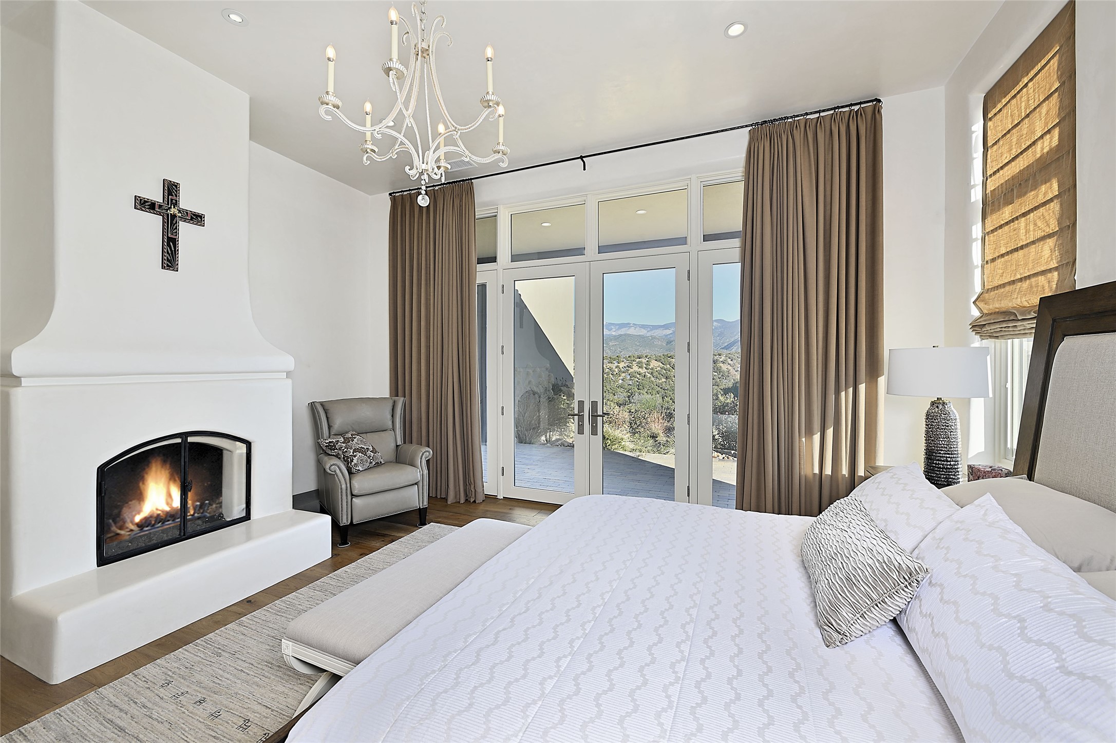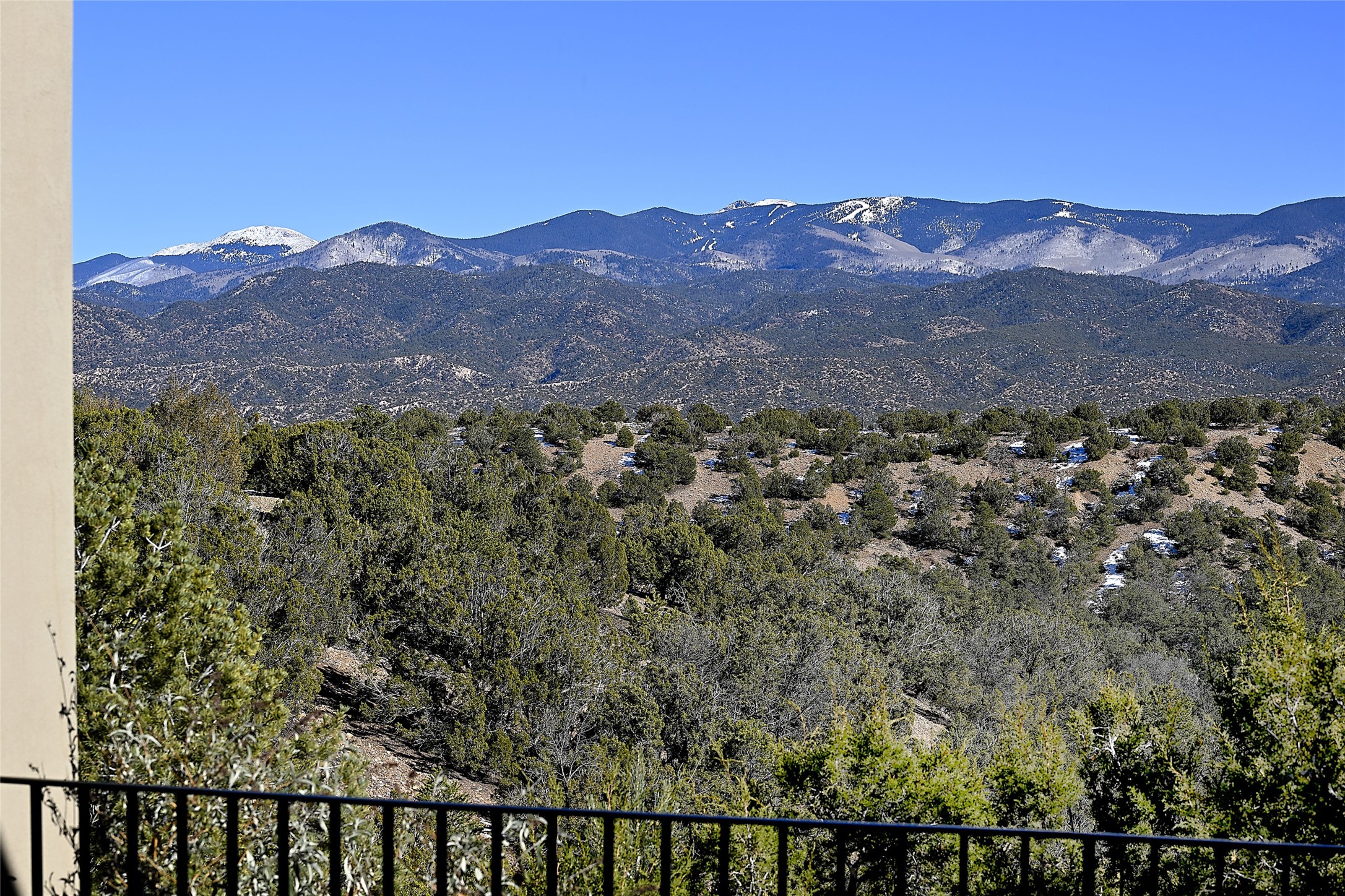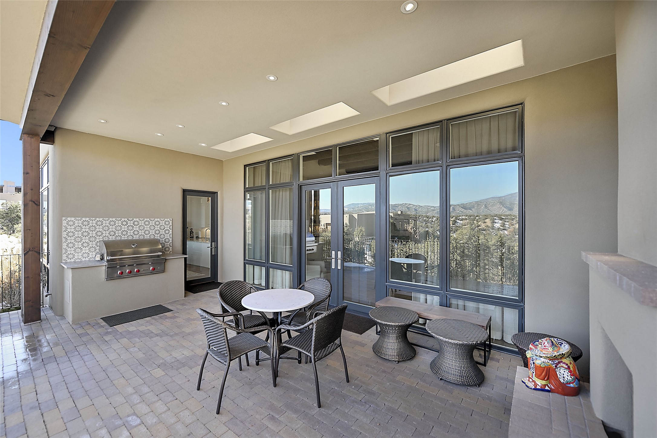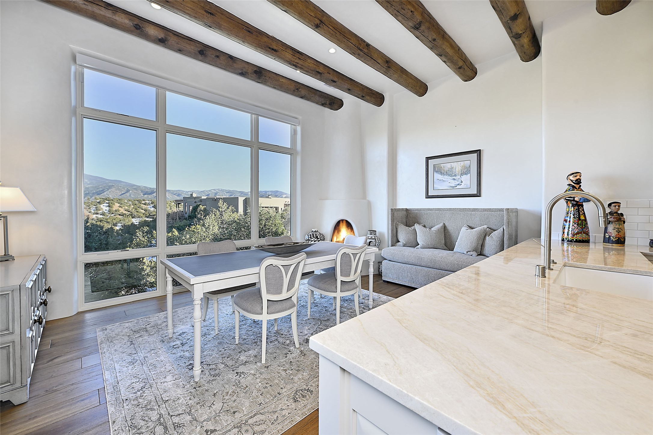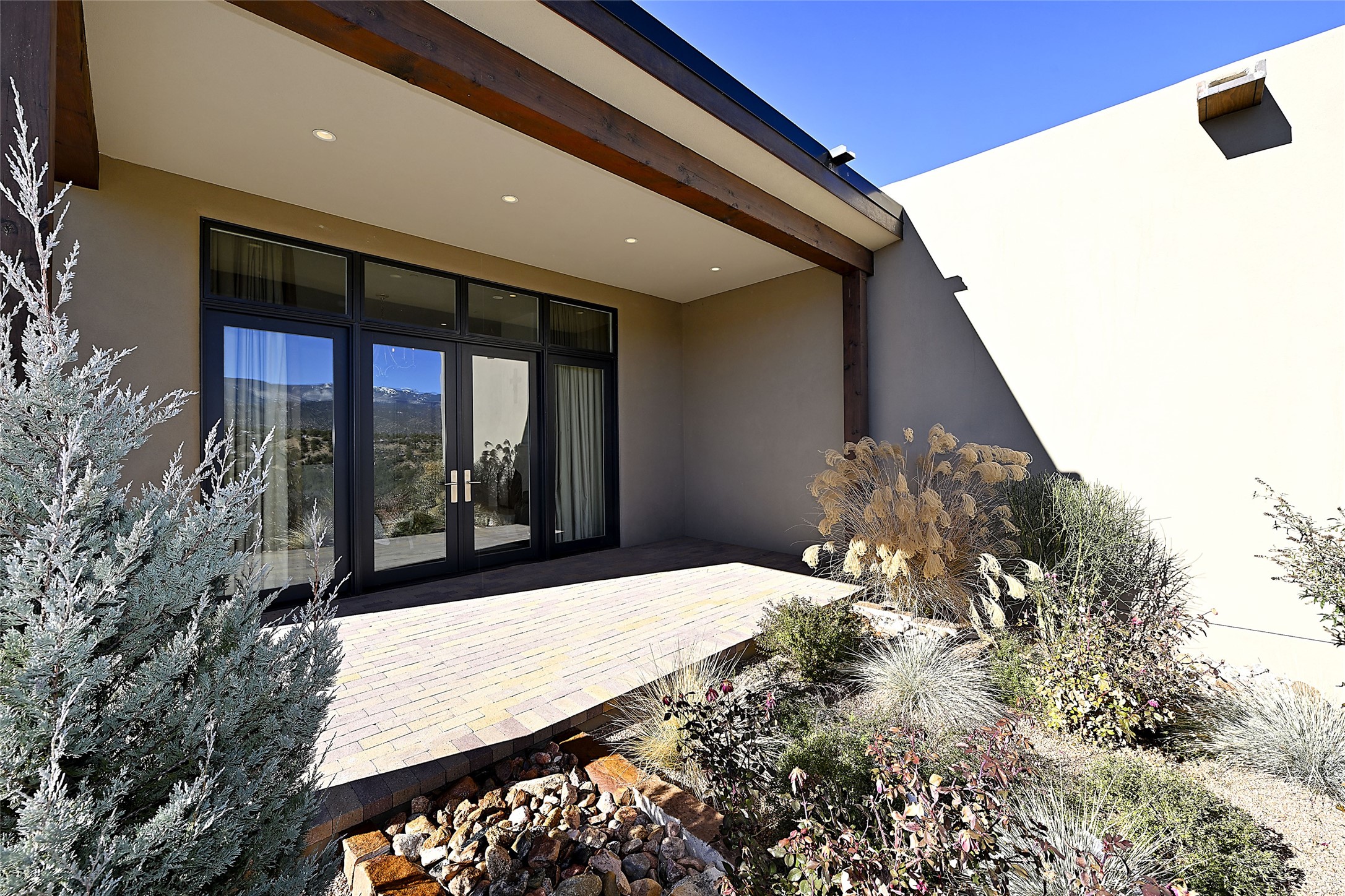 Monte Sereno 3 bedroom 3.5 bath soft Contemporary home on almost 1.5 acres with magnificent Sangre de Cristomountain views from all living areas (with dedicated open space to the immediate east of the home). Built in 2022 by Woods/Design Builder. White oak floors and plaster walls and ceilings throughout. Open concept living/kitchen for ease of entertaining and living. Grand living area has high ceilings with broad vigas, wood burning fireplace and built in shelves and cabinetry. Generous gourmet kitchen is appointed with Taj Mahal countertops, an oversized island, Wolf wall oven, range and microwave, SubZero fridge, Cove dishwasher, mini beverage fridge, and 2 handcrafted Shaws farmhouse sinks. Adjacent to the kitchen is a hearth/breakfast room with gas kiva fireplace and large view windows with auto window shades. Split bedroom plan. Primary suite has built in shelving, gas fireplace, French doors to private patio with mountain views and ensuite bath with large walk-in closet with built-ins and island with drawers. Both guest bedrooms are ensuite baths. Outdoor areas include a front, gated portal with wood burning, lighted, stone fireplace and a rear portal with wood burning fireplace and built in Wolf grill. Monte Sereno is a unique master-planned community situated in the pion and juniper studded hills, with miles of private walking trails - located between the Santa Fe Opera and the historic Santa Fe Plaza.