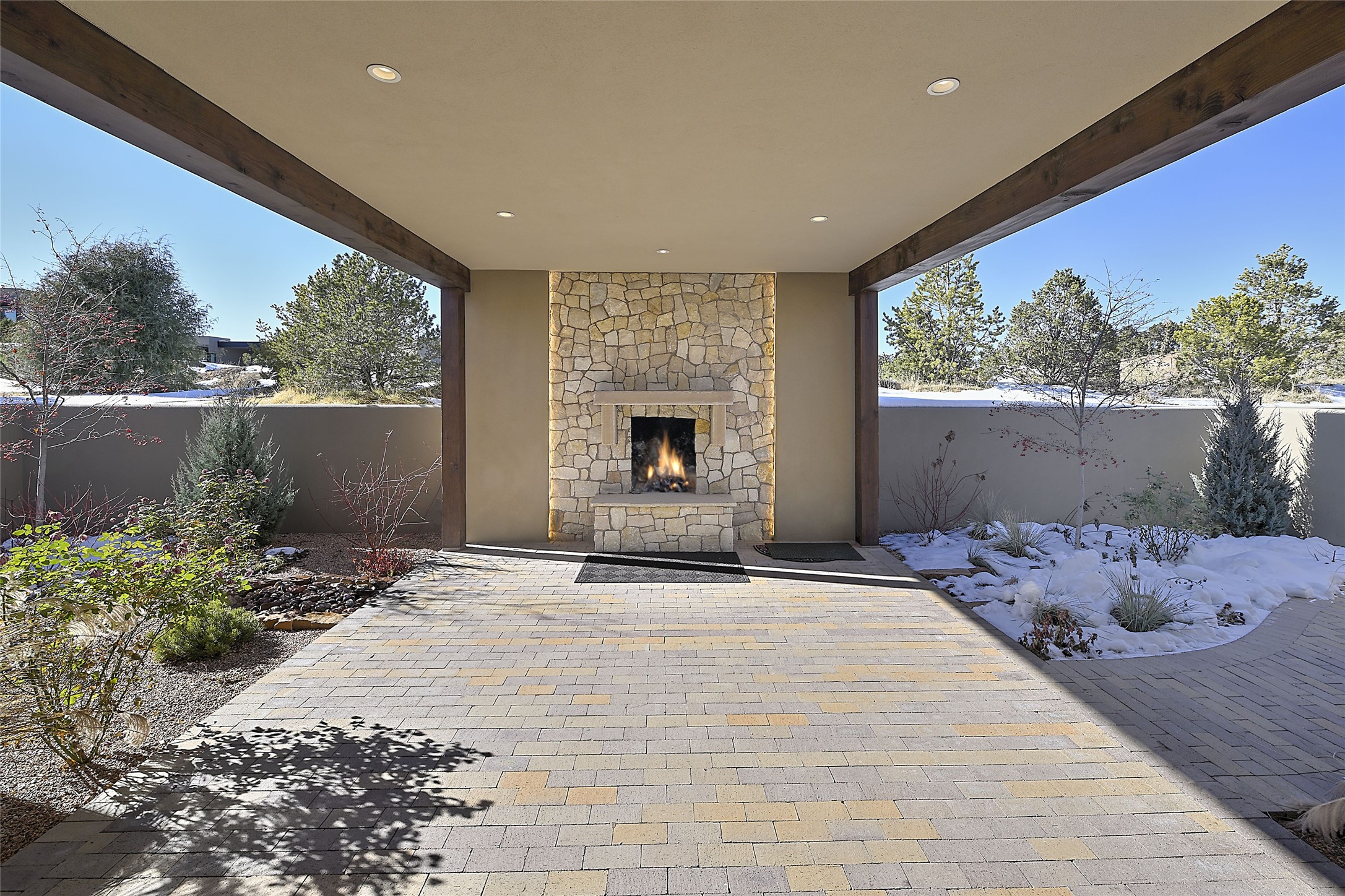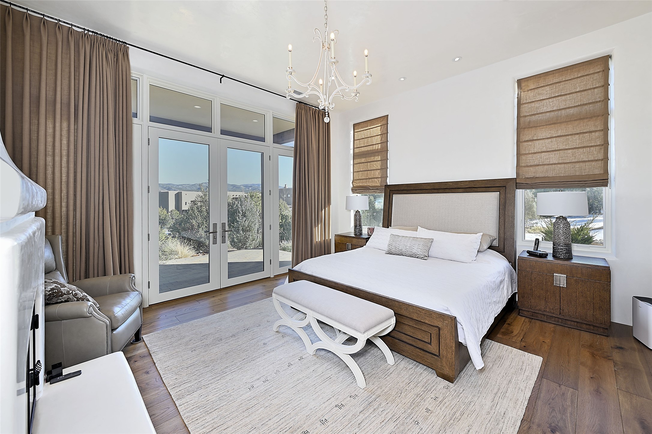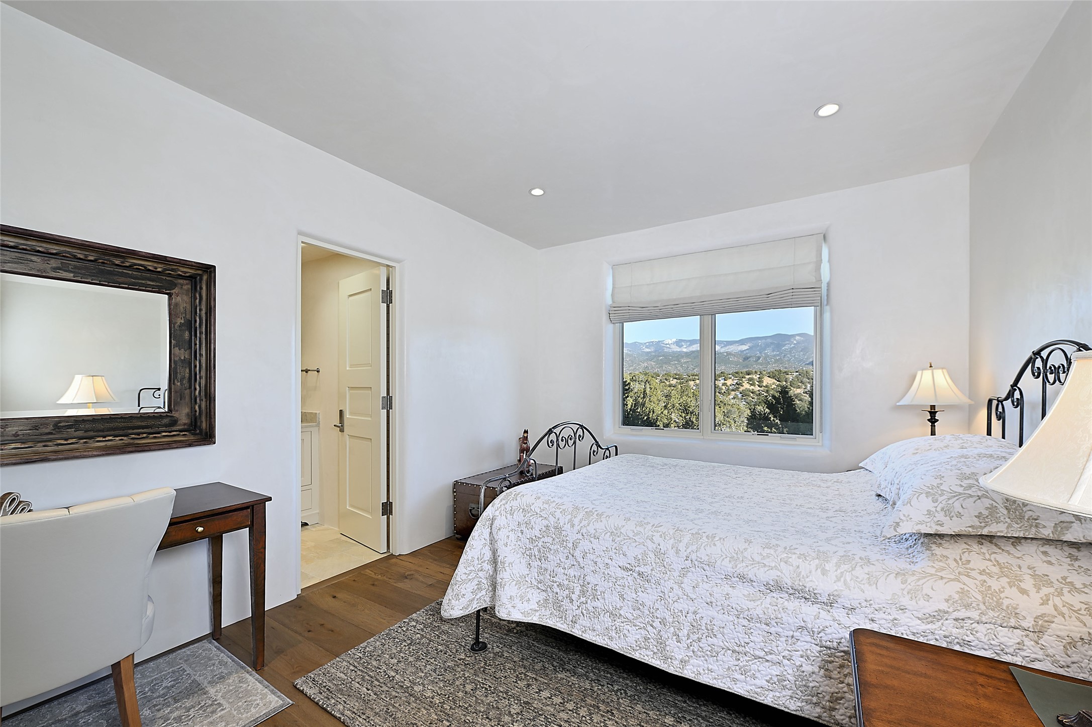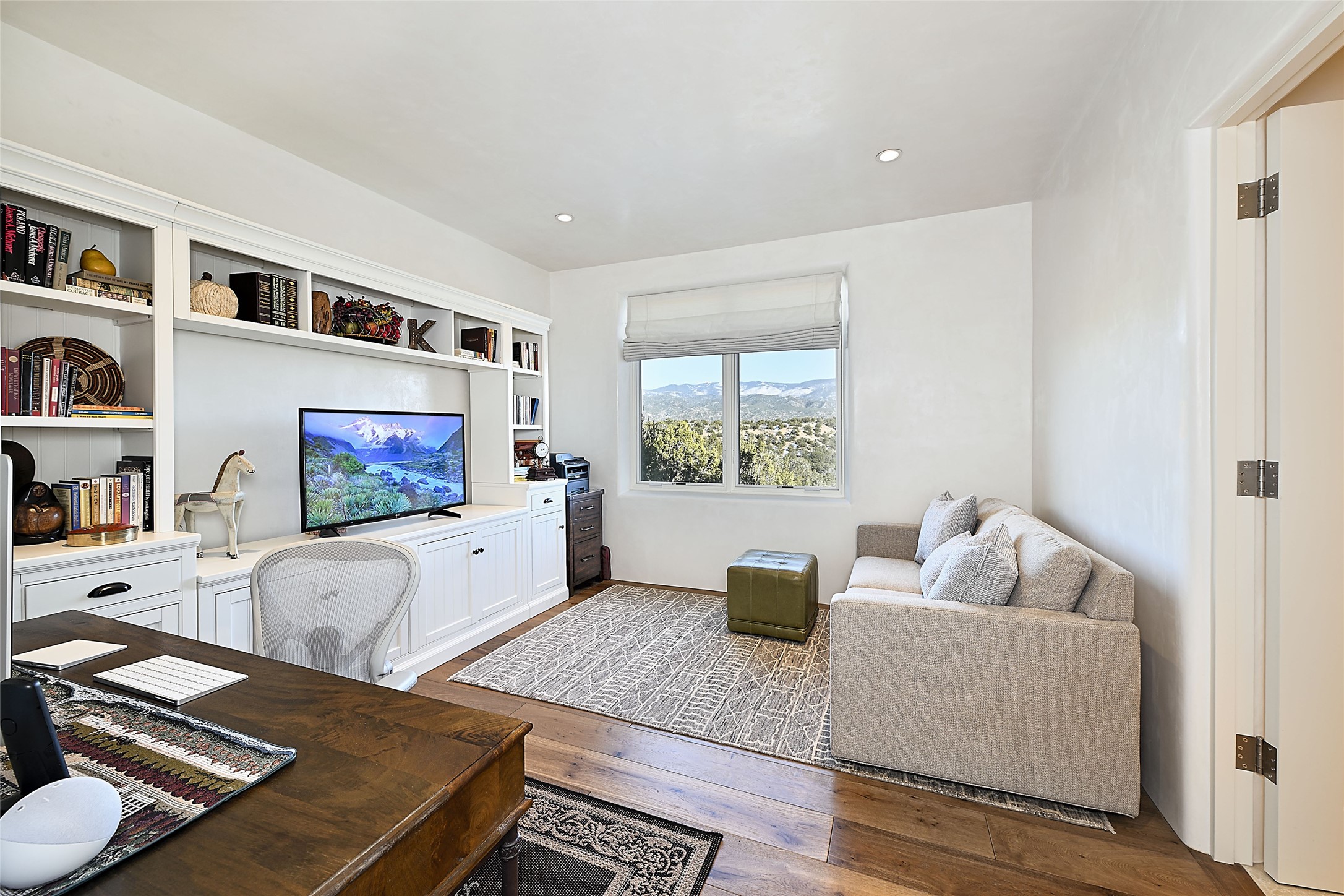 Monte Sereno 3 bedroom 3.5 bath soft Contemporary home on almost 1.5 acres with magnificent Sangre de Cristomountain views from all living areas (with dedicated open space to the immediate east of the home). Built in 2022 by Woods/Design Builder. White oak floors and plaster walls and ceilings throughout. Open concept living/kitchen for ease of entertaining and living. Grand living area has high ceilings with broad vigas, wood burning fireplace and built in shelves and cabinetry. Generous gourmet kitchen is appointed with Taj Mahal countertops, an oversized island, Wolf wall oven, range and microwave, SubZero fridge, Cove dishwasher, mini beverage fridge, and 2 handcrafted Shaws farmhouse sinks. Adjacent to the kitchen is a hearth/breakfast room with gas kiva fireplace and large view windows with auto window shades. Split bedroom plan. Primary suite has built in shelving, gas fireplace, French doors to private patio with mountain views and ensuite bath with large walk-in closet with built-ins and island with drawers. Both guest bedrooms are ensuite baths. Outdoor areas include a front, gated portal with wood burning, lighted, stone fireplace and a rear portal with wood burning fireplace and built in Wolf grill. Monte Sereno is a unique master-planned community situated in the pion and juniper studded hills, with miles of private walking trails - located between the Santa Fe Opera and the historic Santa Fe Plaza.