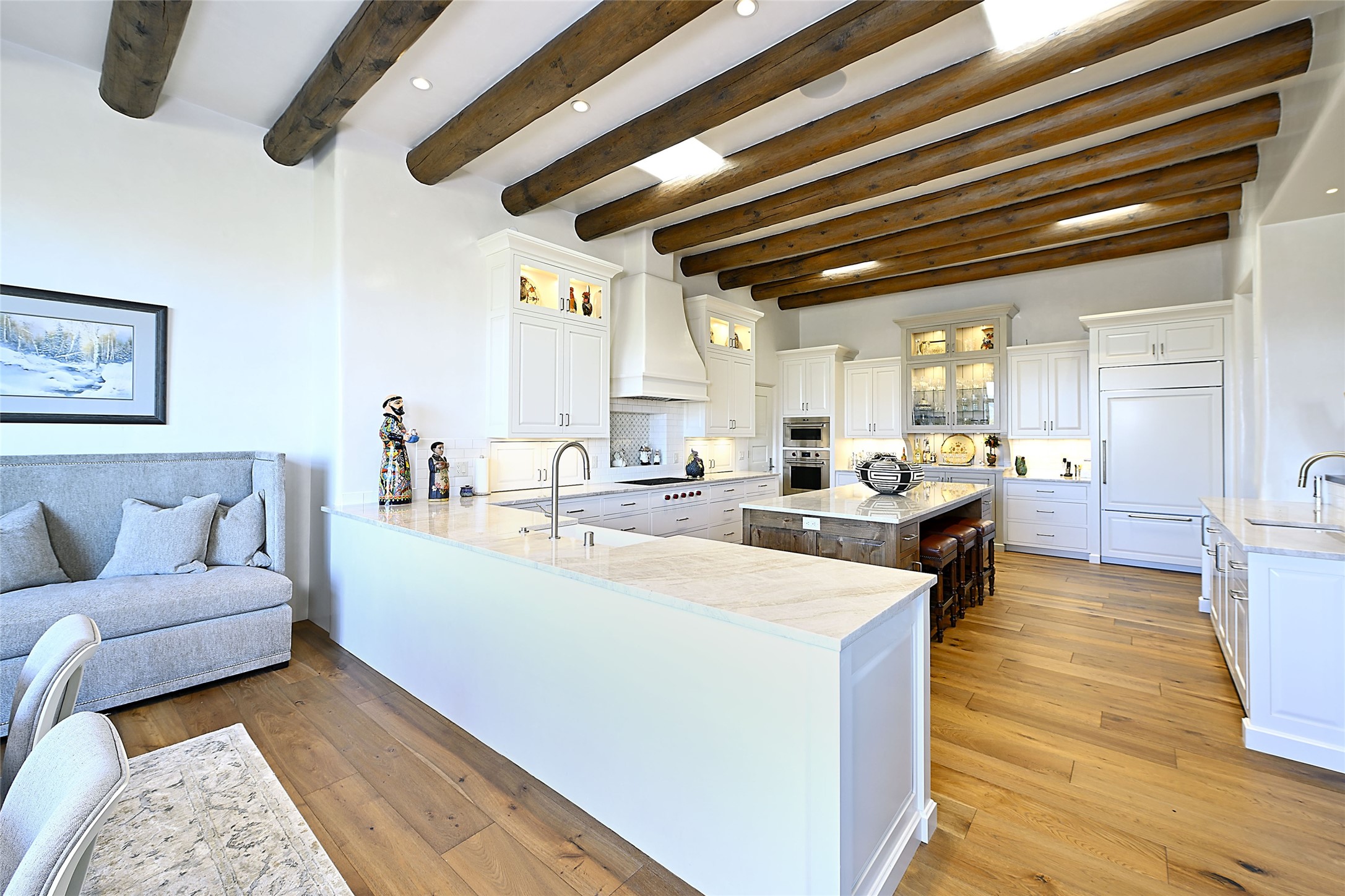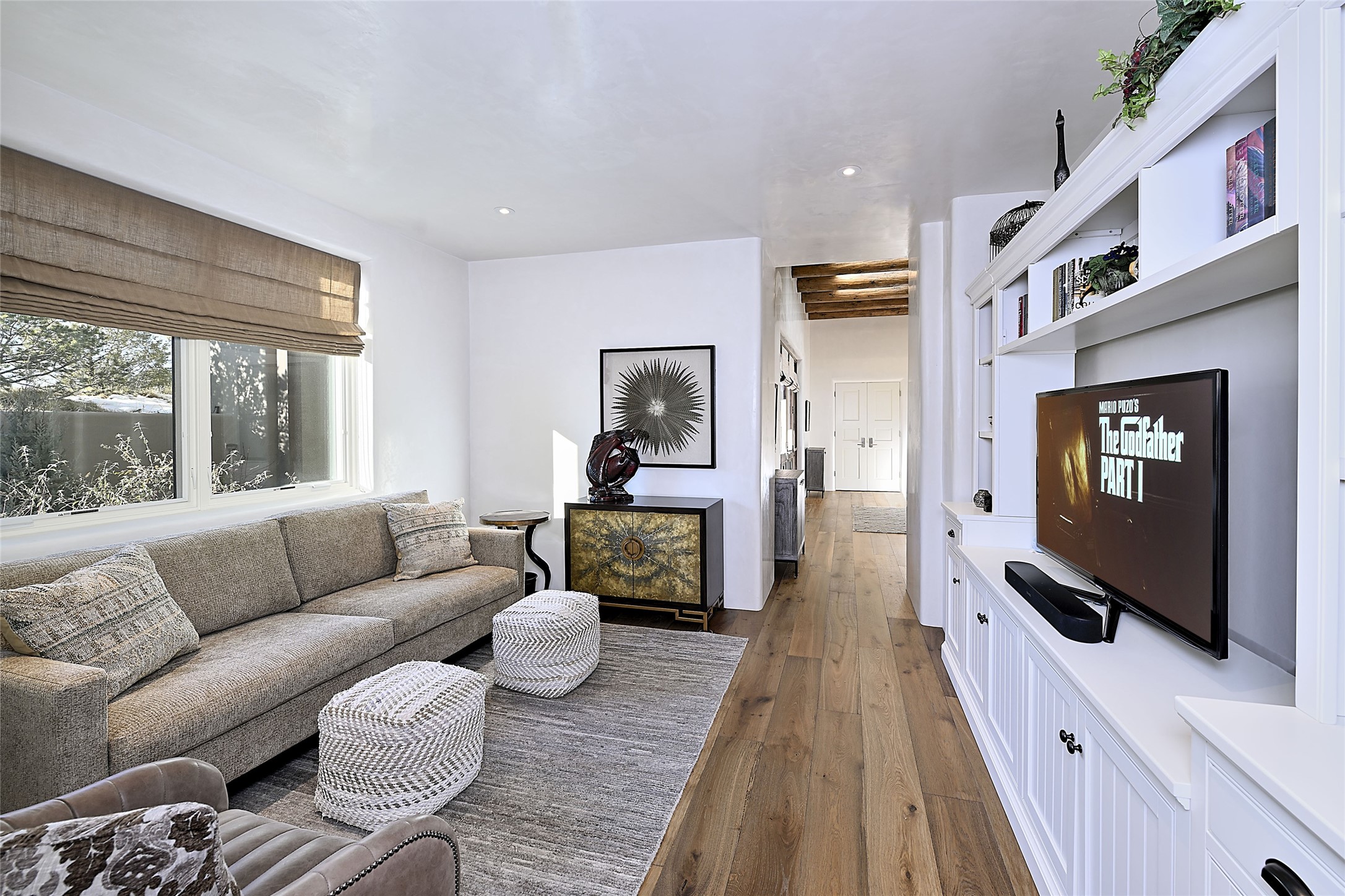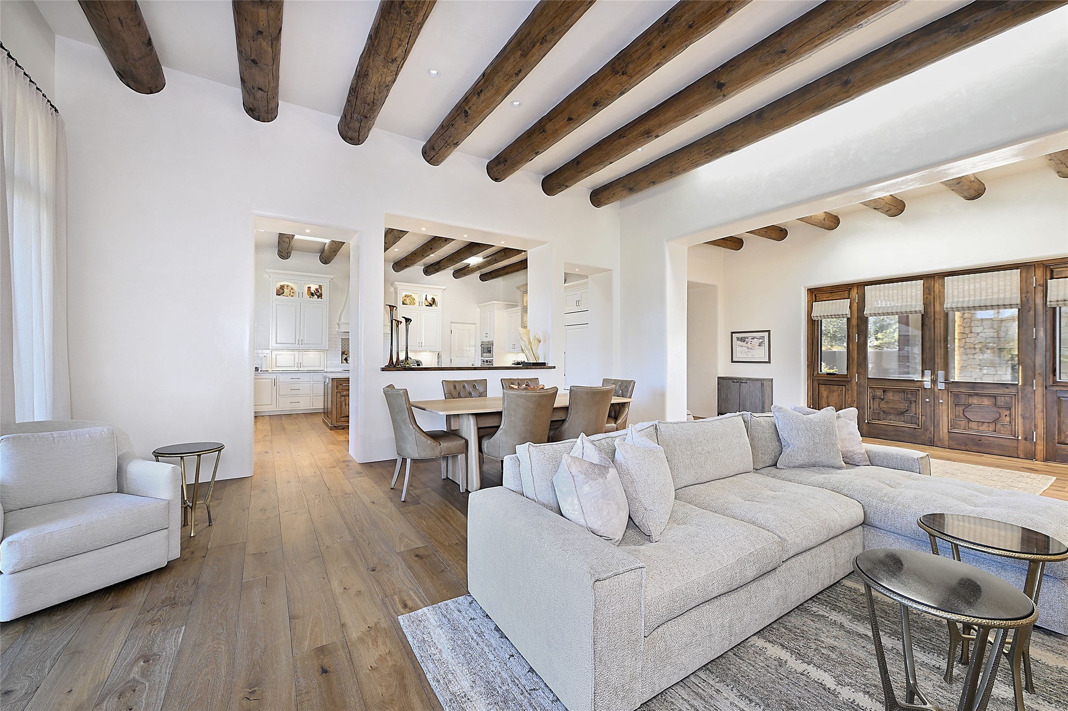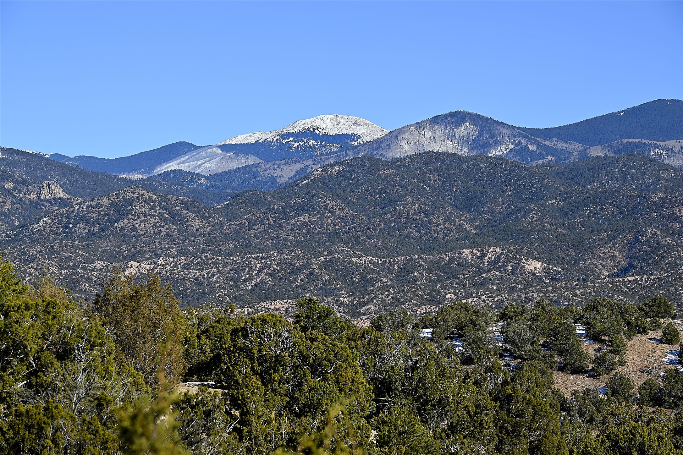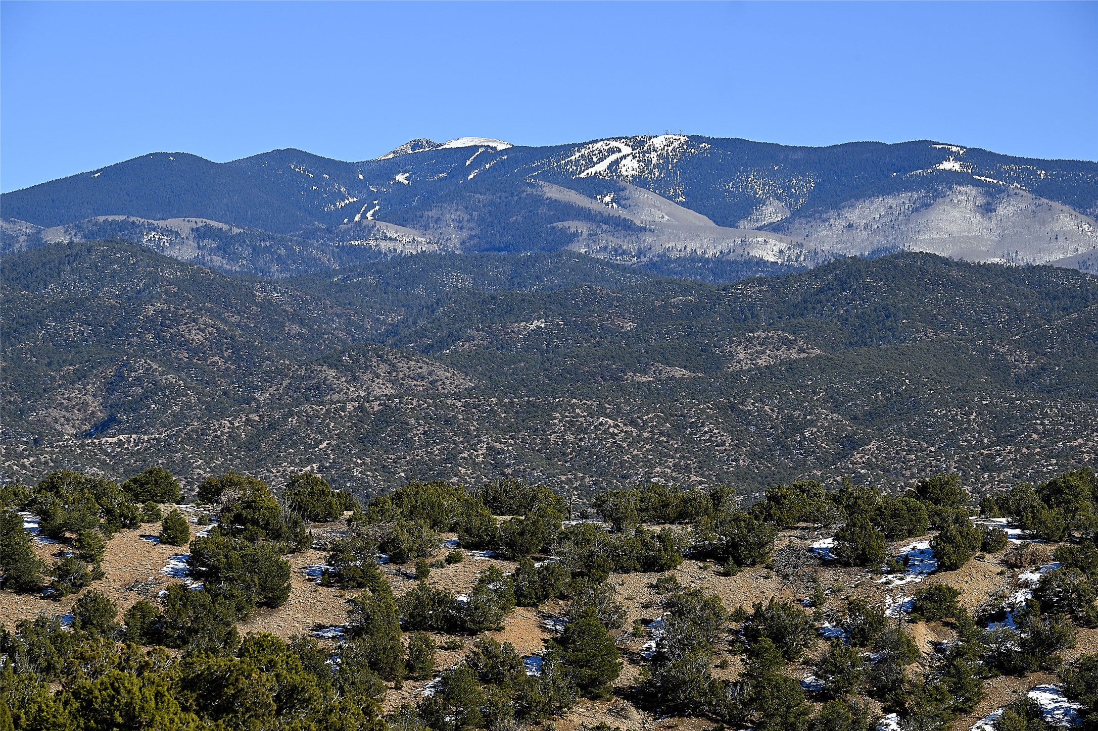 Monte Sereno 3 bedroom 3.5 bath soft Contemporary home on almost 1.5 acres with magnificent Sangre de Cristomountain views from all living areas (with dedicated open space to the immediate east of the home). Built in 2022 by Woods/Design Builder. White oak floors and plaster walls and ceilings throughout. Open concept living/kitchen for ease of entertaining and living. Grand living area has high ceilings with broad vigas, wood burning fireplace and built in shelves and cabinetry. Generous gourmet kitchen is appointed with Taj Mahal countertops, an oversized island, Wolf wall oven, range and microwave, SubZero fridge, Cove dishwasher, mini beverage fridge, and 2 handcrafted Shaws farmhouse sinks. Adjacent to the kitchen is a hearth/breakfast room with gas kiva fireplace and large view windows with auto window shades. Split bedroom plan. Primary suite has built in shelving, gas fireplace, French doors to private patio with mountain views and ensuite bath with large walk-in closet with built-ins and island with drawers. Both guest bedrooms are ensuite baths. Outdoor areas include a front, gated portal with wood burning, lighted, stone fireplace and a rear portal with wood burning fireplace and built in Wolf grill. Monte Sereno is a unique master-planned community situated in the pion and juniper studded hills, with miles of private walking trails - located between the Santa Fe Opera and the historic Santa Fe Plaza.