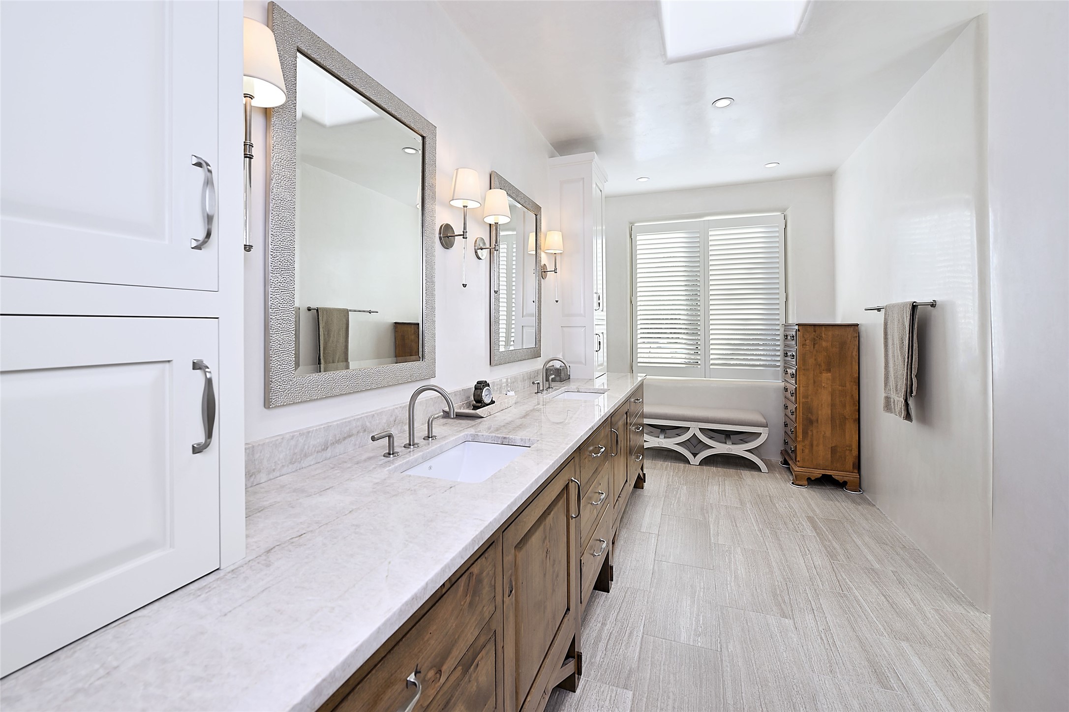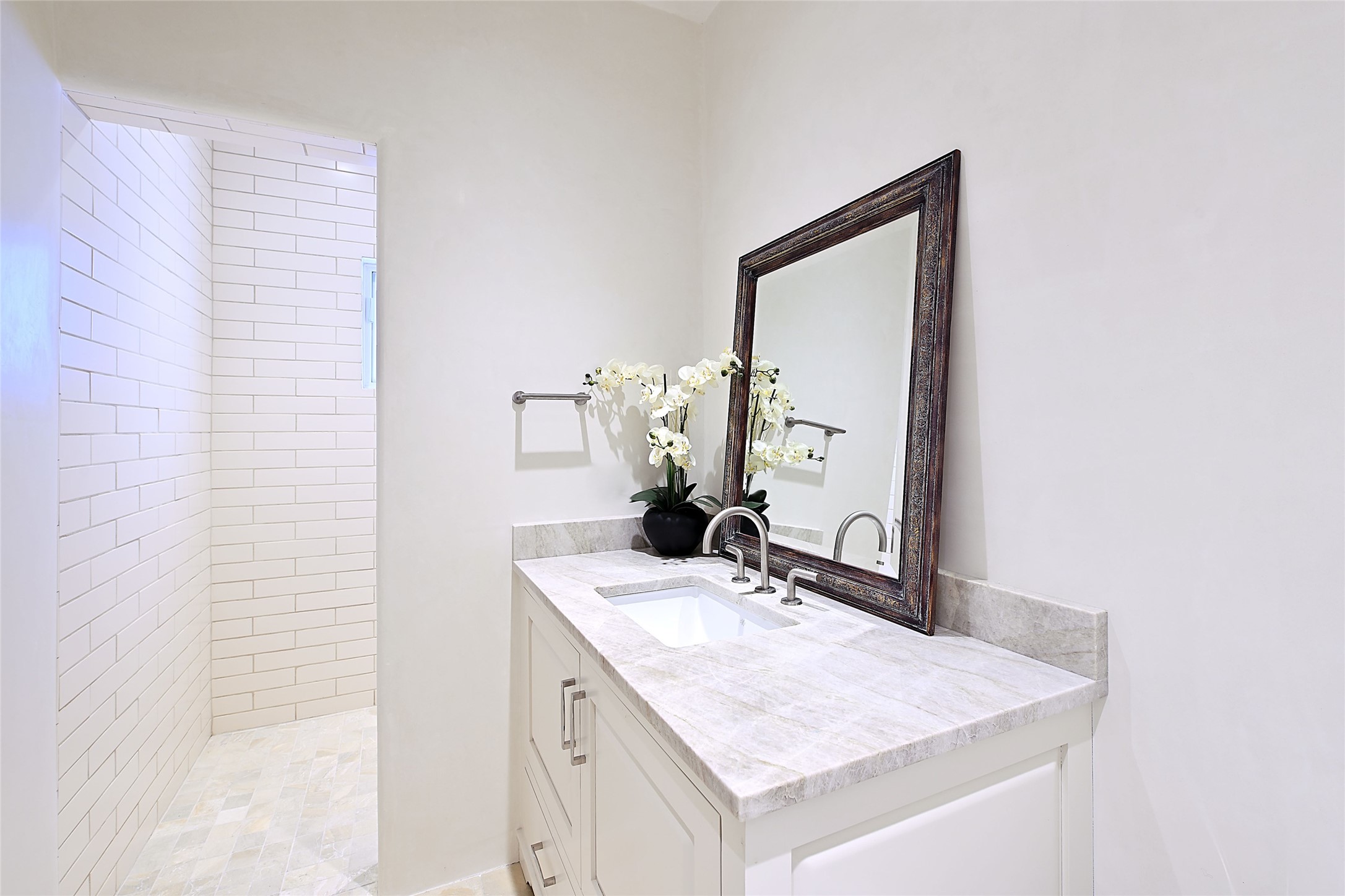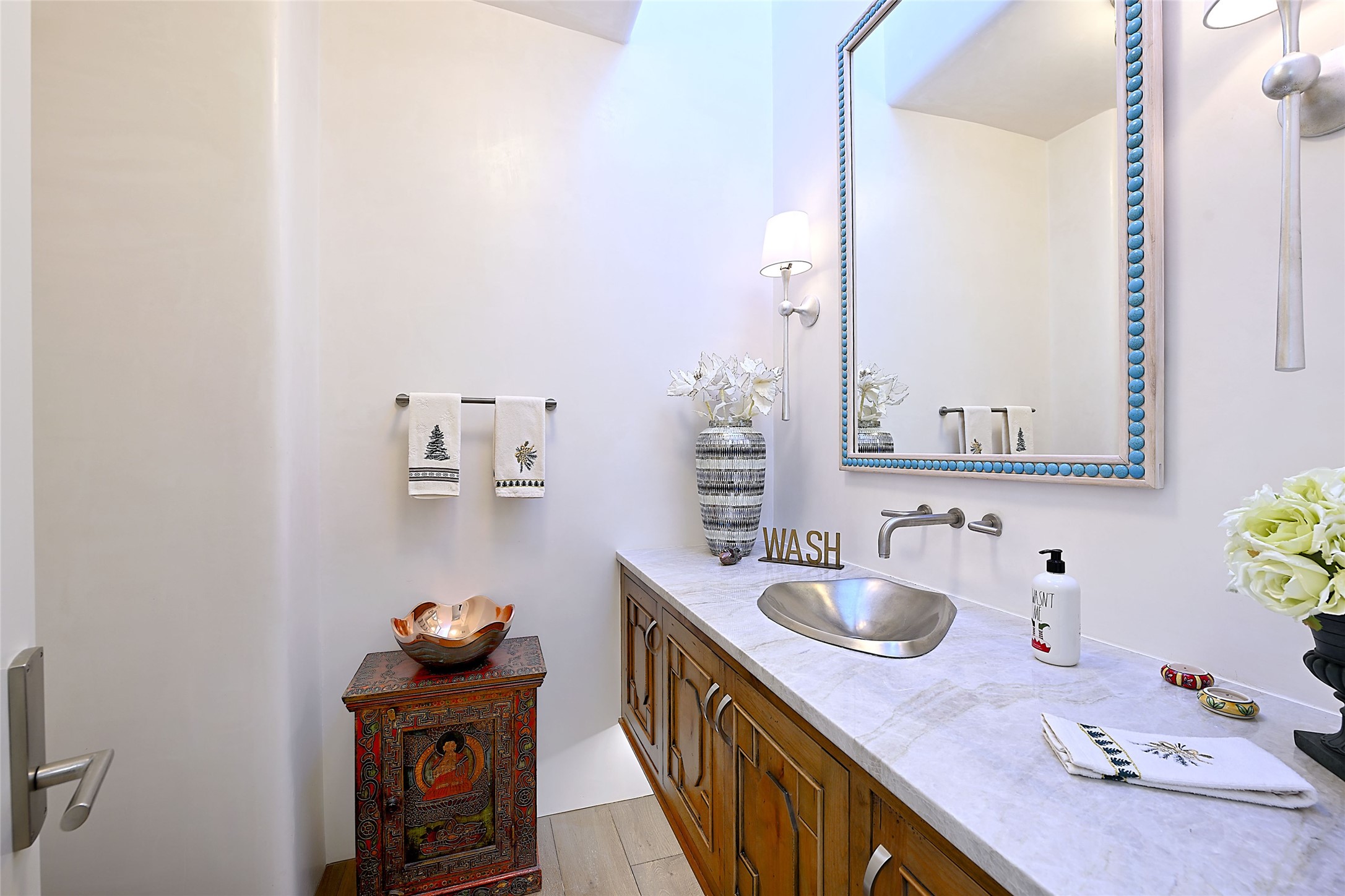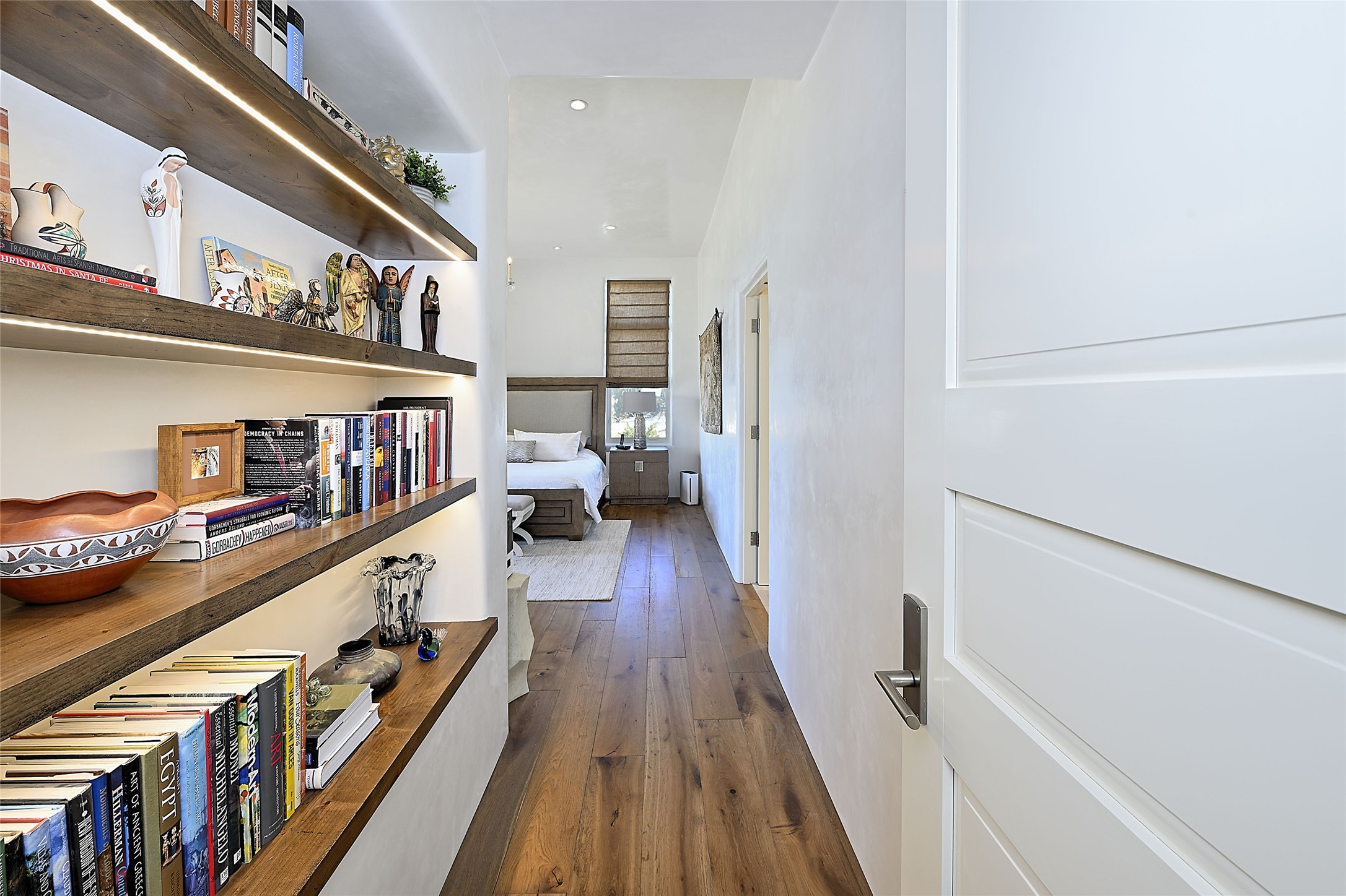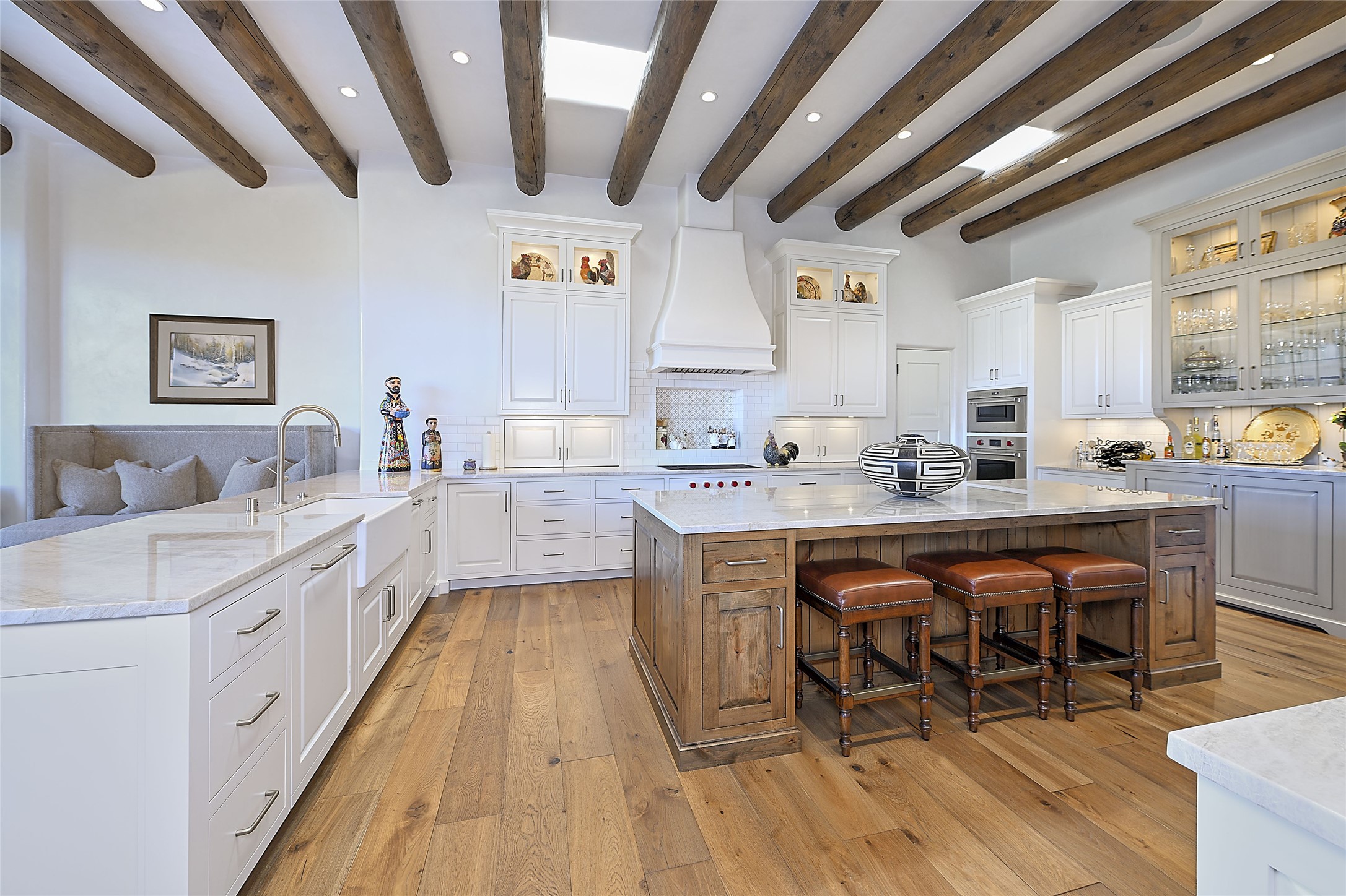 Monte Sereno 3 bedroom 3.5 bath soft Contemporary home on almost 1.5 acres with magnificent Sangre de Cristomountain views from all living areas (with dedicated open space to the immediate east of the home). Built in 2022 by Woods/Design Builder. White oak floors and plaster walls and ceilings throughout. Open concept living/kitchen for ease of entertaining and living. Grand living area has high ceilings with broad vigas, wood burning fireplace and built in shelves and cabinetry. Generous gourmet kitchen is appointed with Taj Mahal countertops, an oversized island, Wolf wall oven, range and microwave, SubZero fridge, Cove dishwasher, mini beverage fridge, and 2 handcrafted Shaws farmhouse sinks. Adjacent to the kitchen is a hearth/breakfast room with gas kiva fireplace and large view windows with auto window shades. Split bedroom plan. Primary suite has built in shelving, gas fireplace, French doors to private patio with mountain views and ensuite bath with large walk-in closet with built-ins and island with drawers. Both guest bedrooms are ensuite baths. Outdoor areas include a front, gated portal with wood burning, lighted, stone fireplace and a rear portal with wood burning fireplace and built in Wolf grill. Monte Sereno is a unique master-planned community situated in the pion and juniper studded hills, with miles of private walking trails - located between the Santa Fe Opera and the historic Santa Fe Plaza.