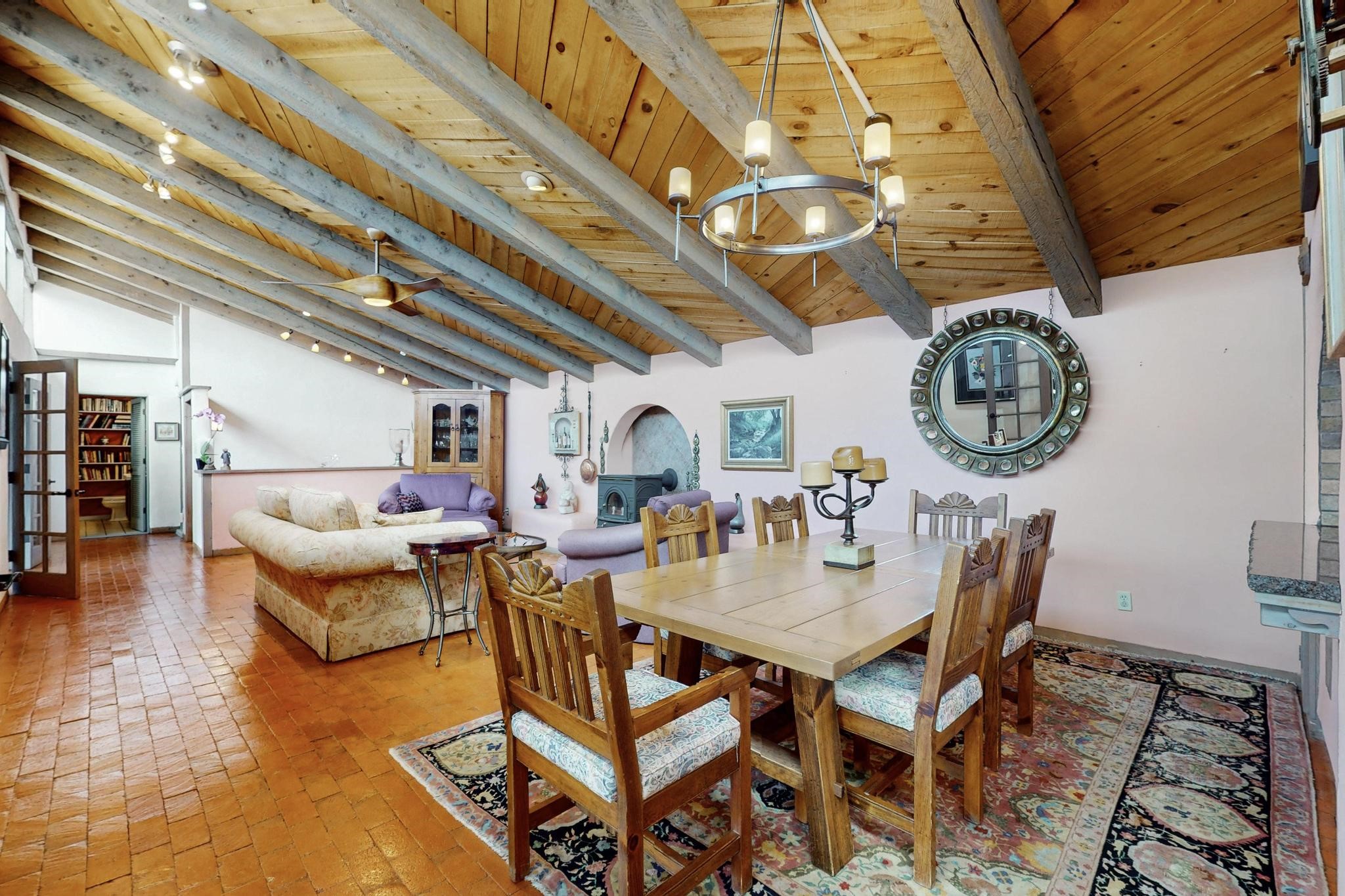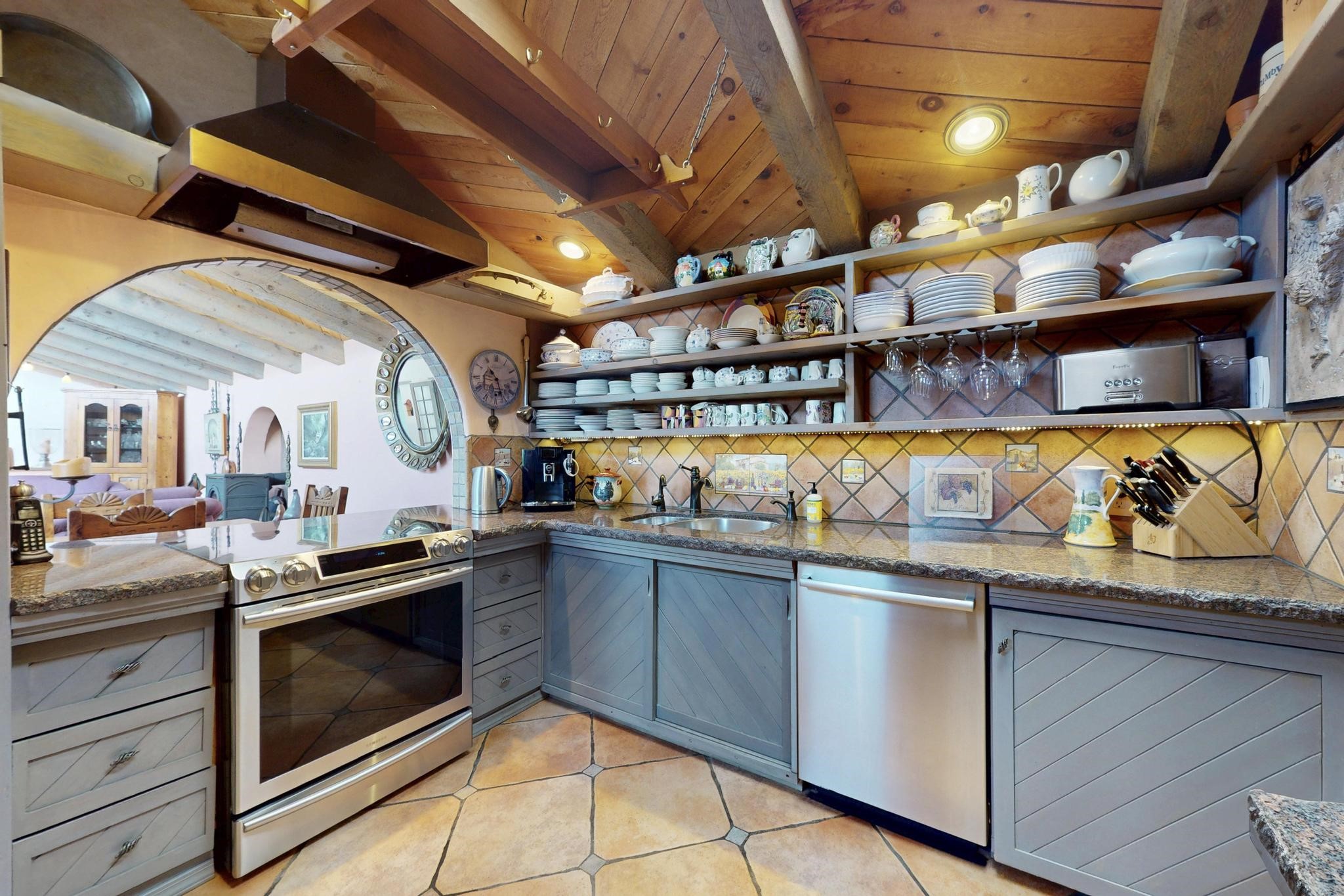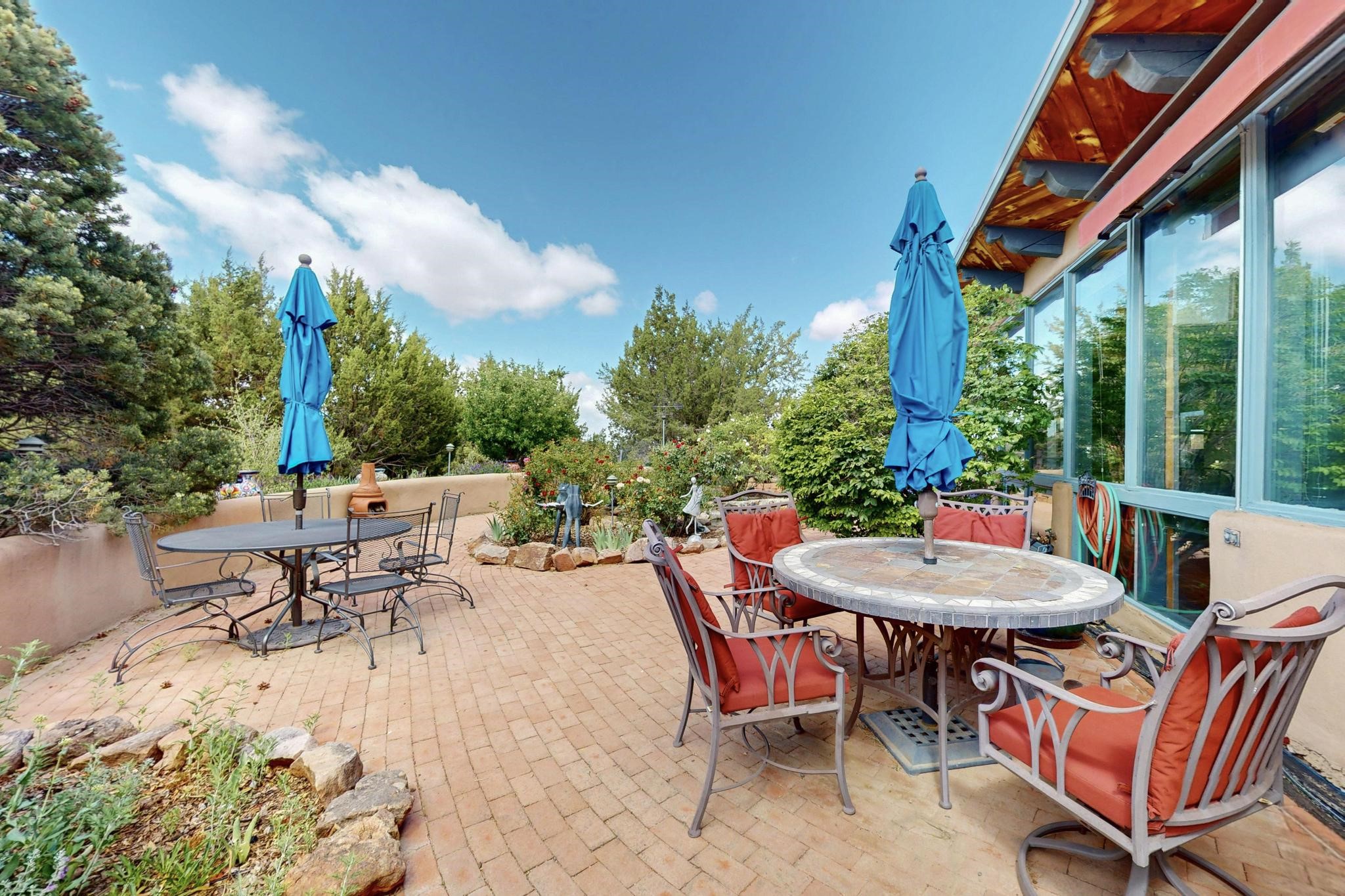 First time on the market! One-of-a-kind pitched roof propanel passive solar beauty with Old World Charm. Like a Swiss Chalet with a dash of Mid-Century Modern. A rarity in Eldorado! Set back off the road on a circular drive, with nary a house in sight, is this gorgeously maintained and landscaped 1.50 acre lot replete with a bubbling Koi and goldfish pond. A multitude of exterior dining and entertaining areas. Meander through the totally dripped irrigated garden which leads the way into a sun drenched, and massive, brick floor Atrium. In fact, the whole house has brick floors and Post and Beam high ceilings with French doors galore! Oversized Living/Dining room with floor to ceiling windows and remote controlled blinds. The wood stove has a catalytic converter which keeps the room toasty through those long winter nights with an 75% to 81% efficiency rating. Split bedroom floor plan. A fabulous Master with a Vermont casting wood stove, en-suite bath with an on-demand gas water heater and a remote controlled awning to keep the bright morning light at bay. Ginormous cedar closet in dressing room/walk-in closet which is the size of a NYC studio apartment! Both the Living Room and Bedrooms have mini-splits and ceiling fans. European-style kitchen has a warming drawer, open shelving and tons of cupboards. A wonderful long pantry with a utility area and space for all your pots, pans, spices and sundries. Outside the kitchen door is a dedicated gas connection for the BBQ. A long and wide two car detached tandem garage has tons of storage and a climate controlled wine room suitable for hundreds of bottles. One of a kind unique beauty.There's nothing like it!