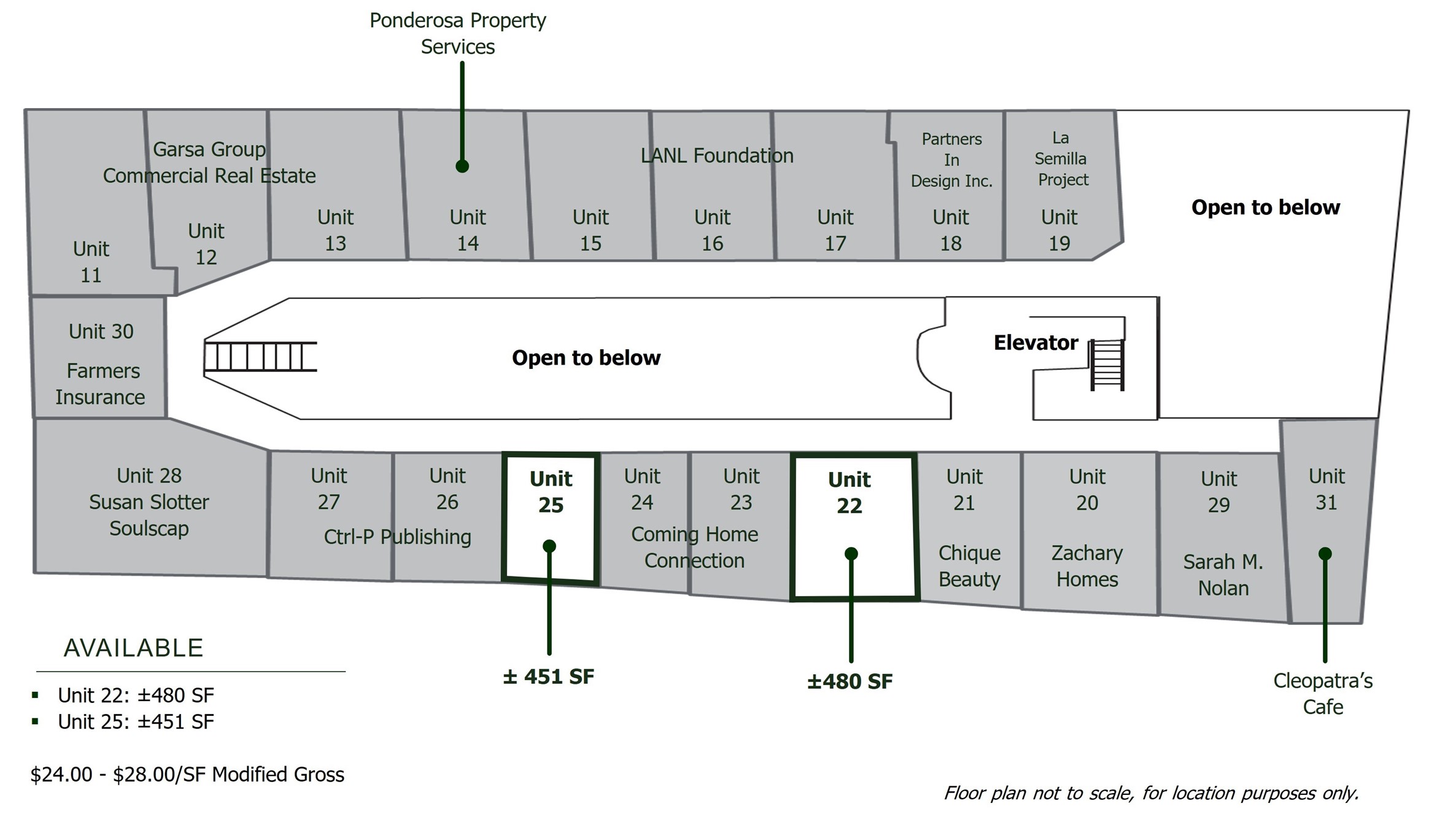 AVAILABLE: Lower Level (Retail): Unit 1-B: 700 SF, Upper Level (office/studio): Unit 22: 480 SF, Unit 25: 451 SF | ZONING: BCD, Business Capital District | HIGHLIGHTS: Open and airy mall design, Just steps away from the District Court House, Close to the Railyard District, Downtown Santa Fe and state buildings, Co tenants include: Mexico Lindo, Pizza Centro, Yin Yang Restaurant, Paleteria Oasis, Revolution Bakery, Antique Shops, Professional Offices