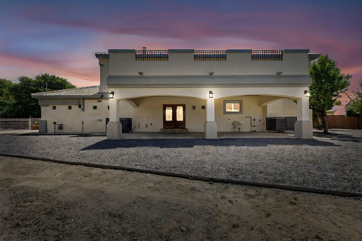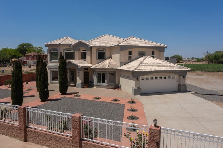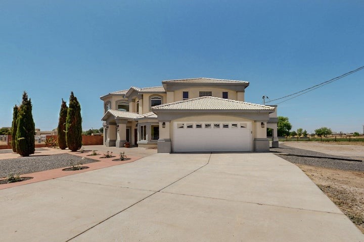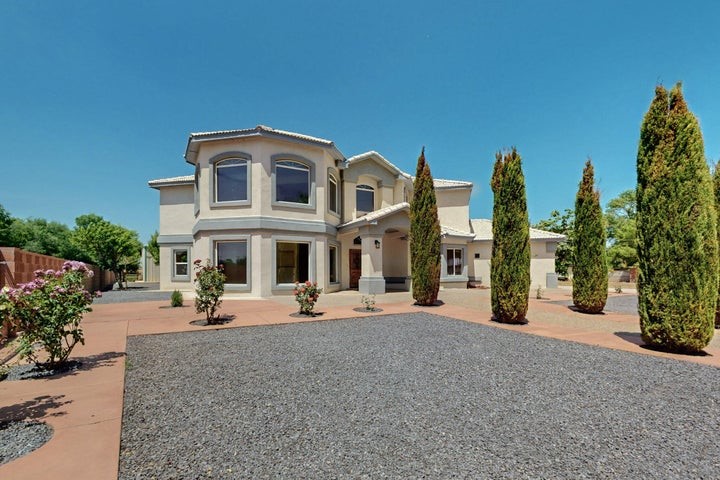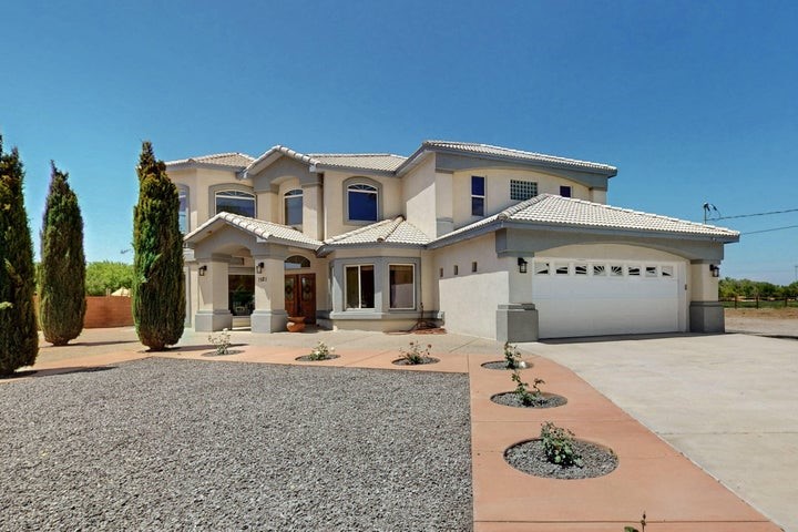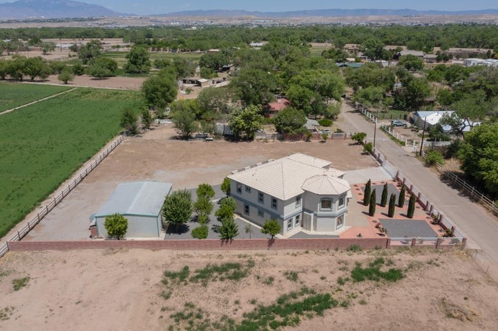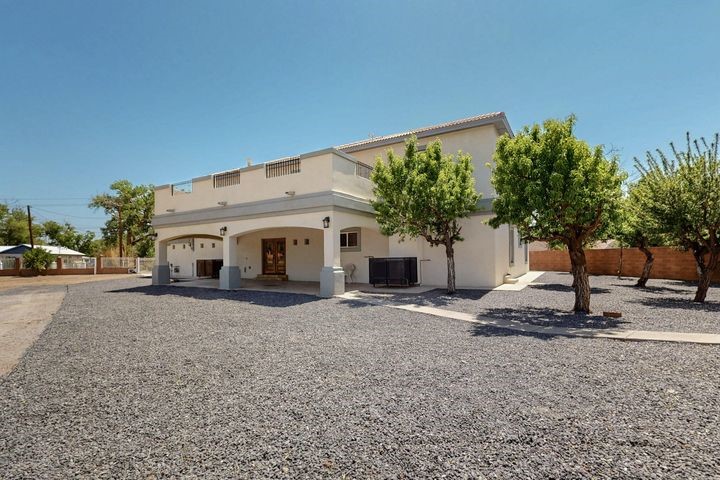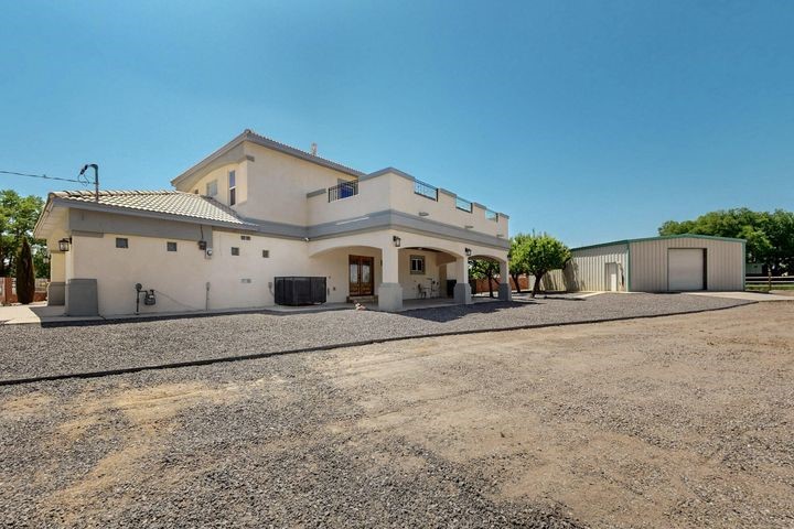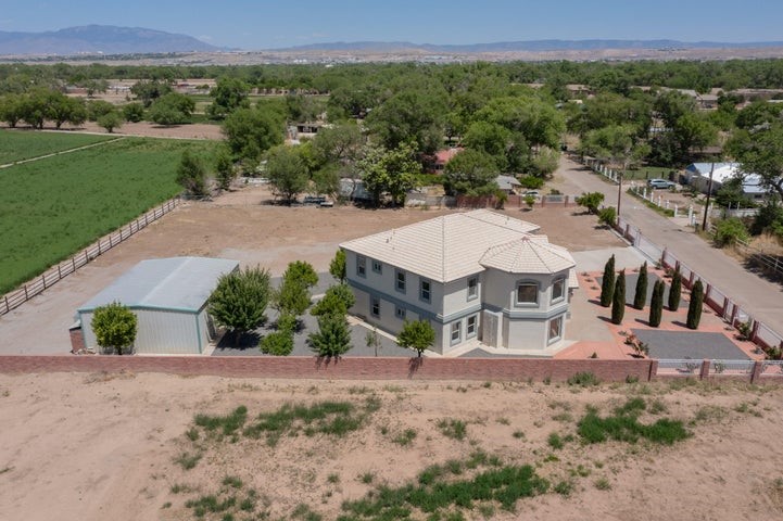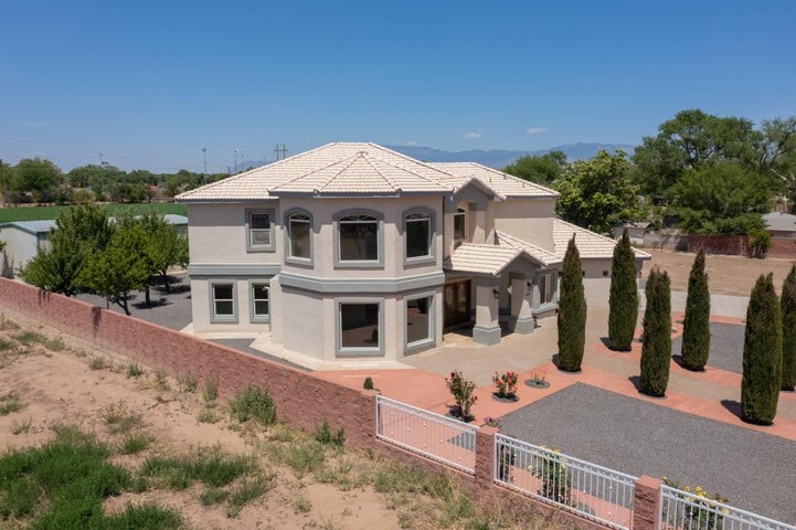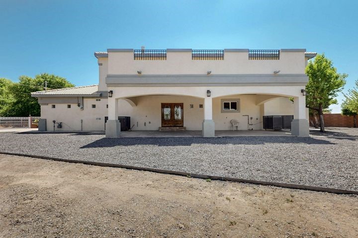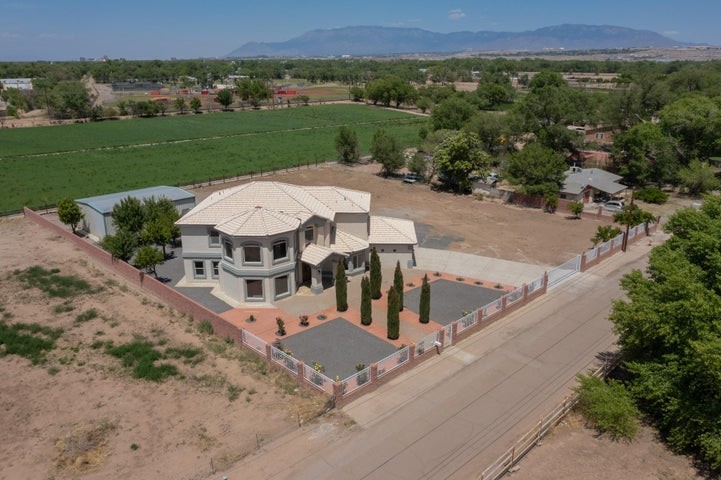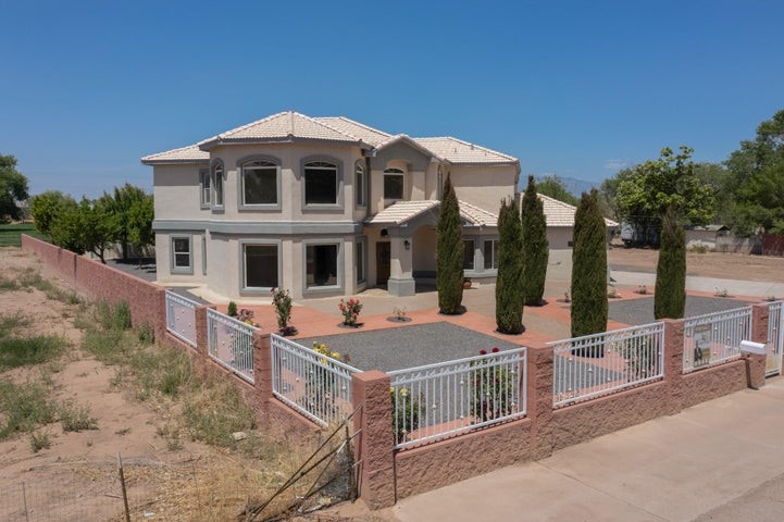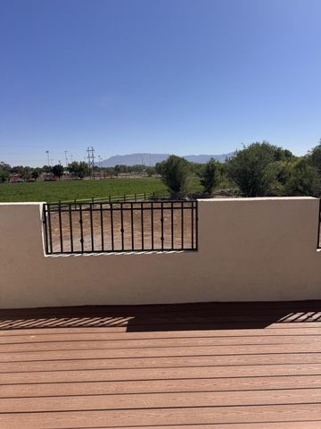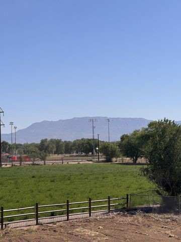 Owner to owner financing available! This one-of-a-kind luxury home is nestled in a highly sought-after, tucked-away neighborhood with million-dollar views of the Sandia Mountains. Set on nearly an acre with an agricultural feel and neighboring green pastures, it offers ultimate privacy and tranquility. The home features a newly stuccoed exterior, fresh paint, tile roofing, soaring ceilings, radiant heated floors, and two combo units with refrigerated air. The oversized kitchen island anchors a spacious, updated interior perfect for entertaining. Step onto the expansive balcony with custom decking to take in the stunning views. A fully finished 2-car garage, a detached 4 car garage/Workshop and updated workshop add incredible functionality. Multiple fruit trees.