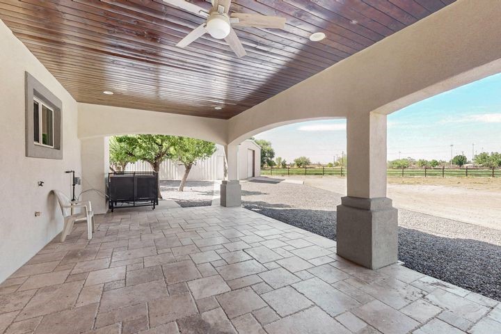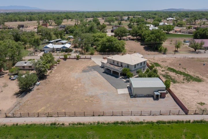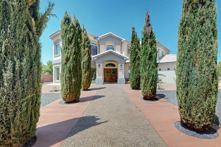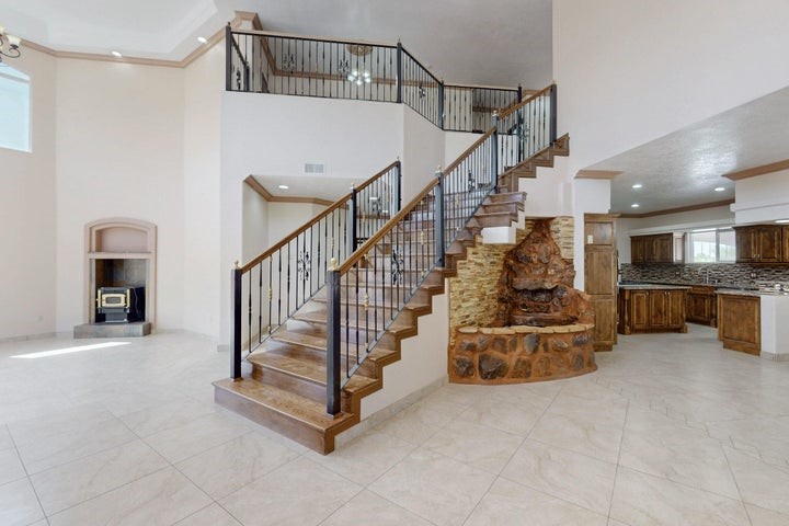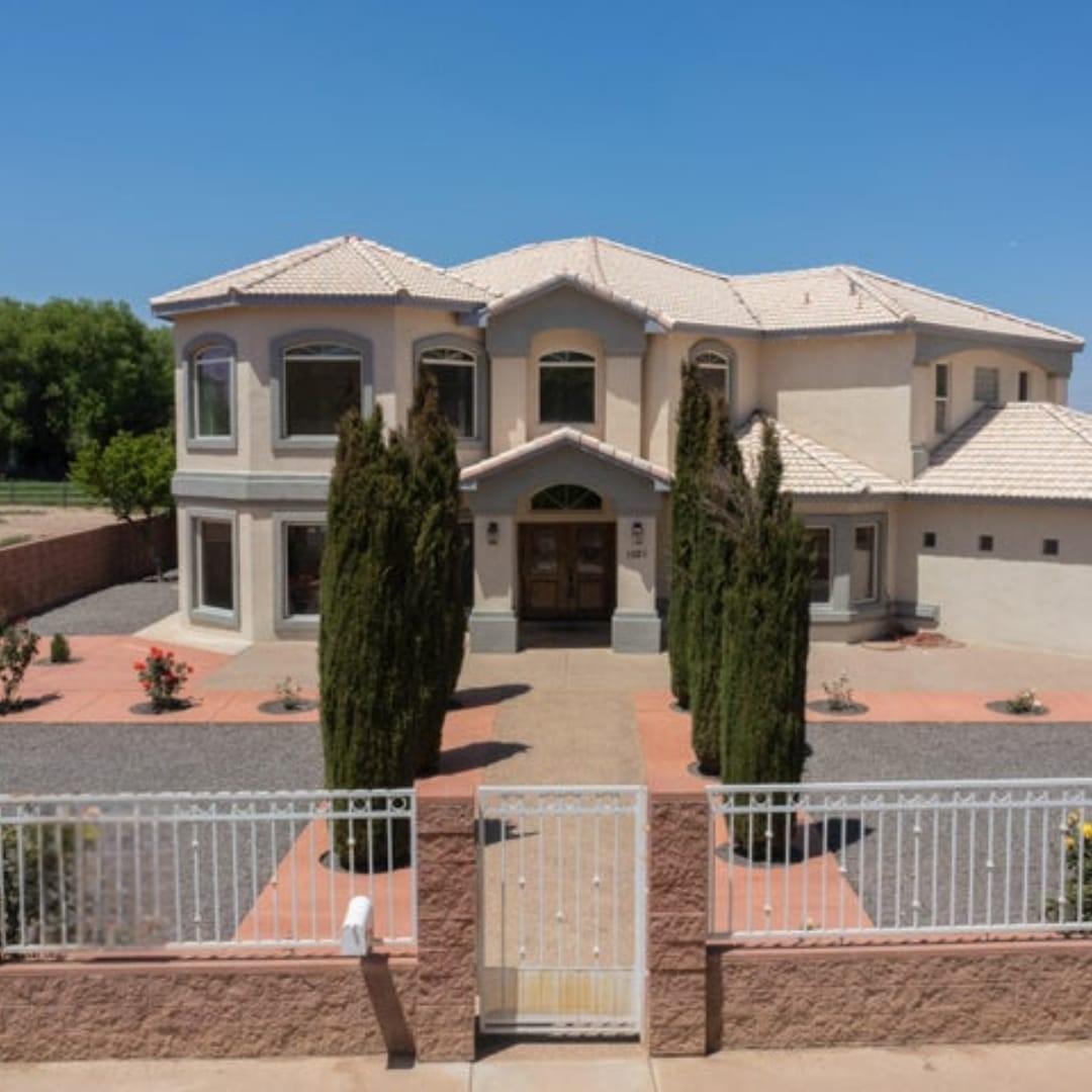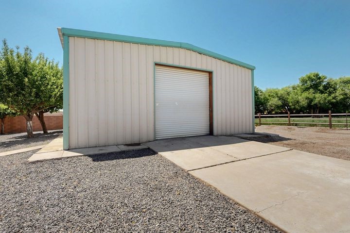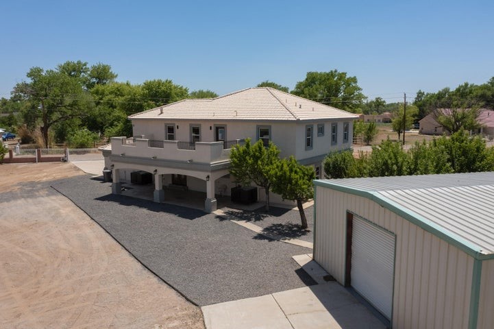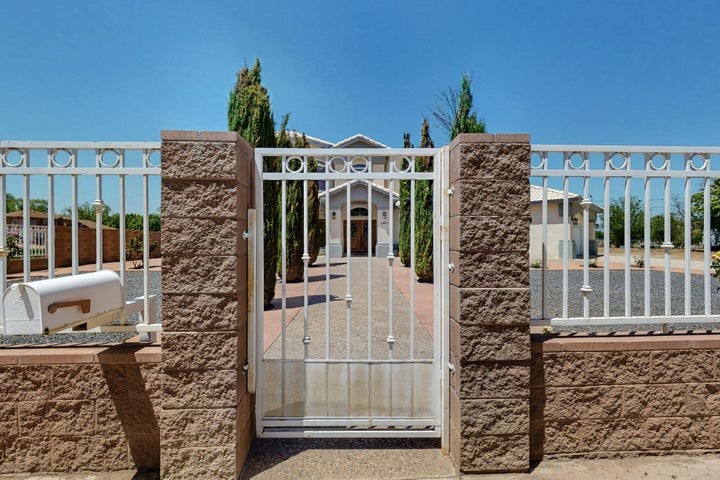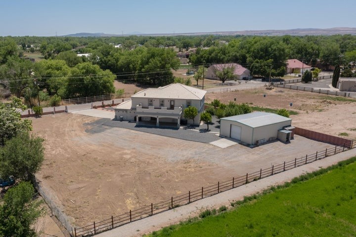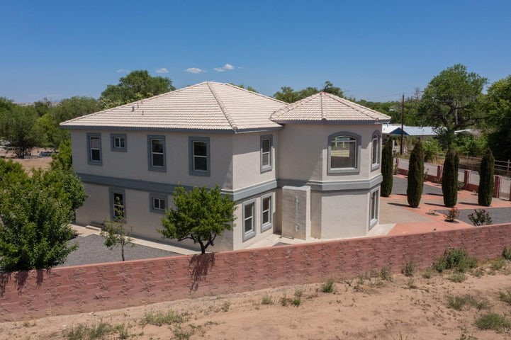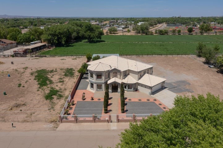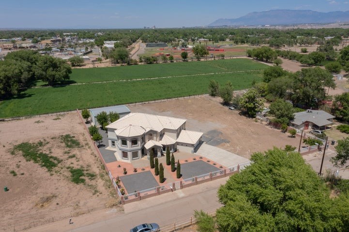 Owner to owner financing available! This one-of-a-kind luxury home is nestled in a highly sought-after, tucked-away neighborhood with million-dollar views of the Sandia Mountains. Set on nearly an acre with an agricultural feel and neighboring green pastures, it offers ultimate privacy and tranquility. The home features a newly stuccoed exterior, fresh paint, tile roofing, soaring ceilings, radiant heated floors, and two combo units with refrigerated air. The oversized kitchen island anchors a spacious, updated interior perfect for entertaining. Step onto the expansive balcony with custom decking to take in the stunning views. A fully finished 2-car garage, a detached 4 car garage/Workshop and updated workshop add incredible functionality. Multiple fruit trees.