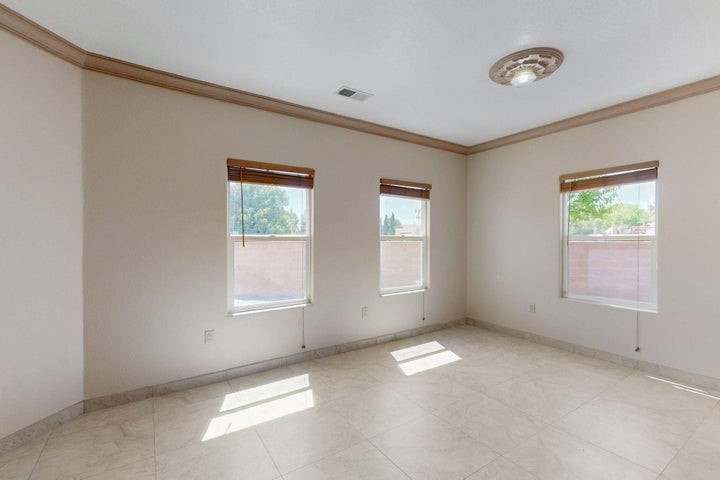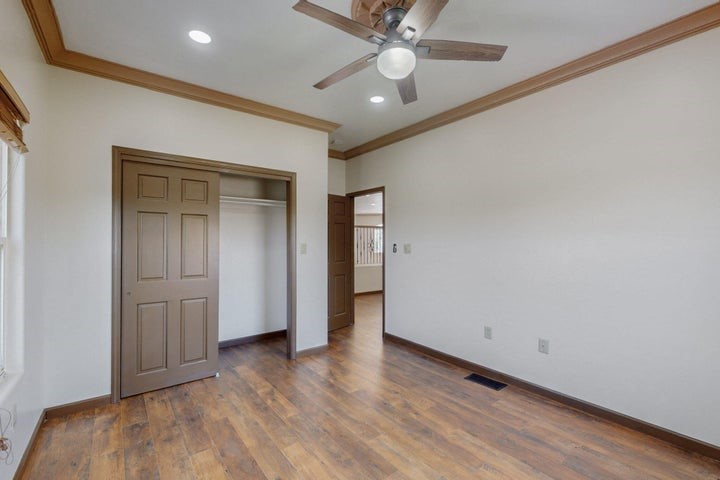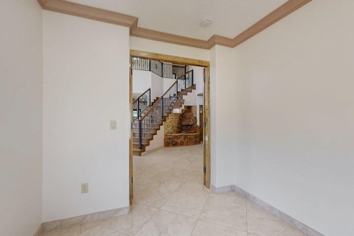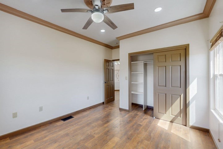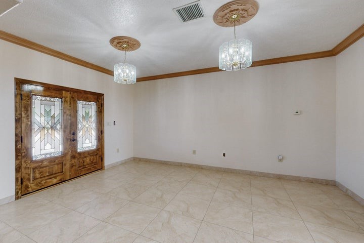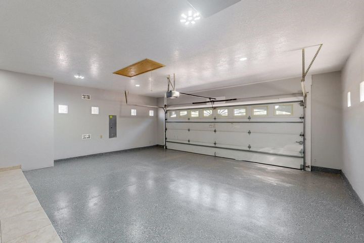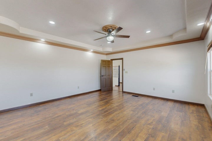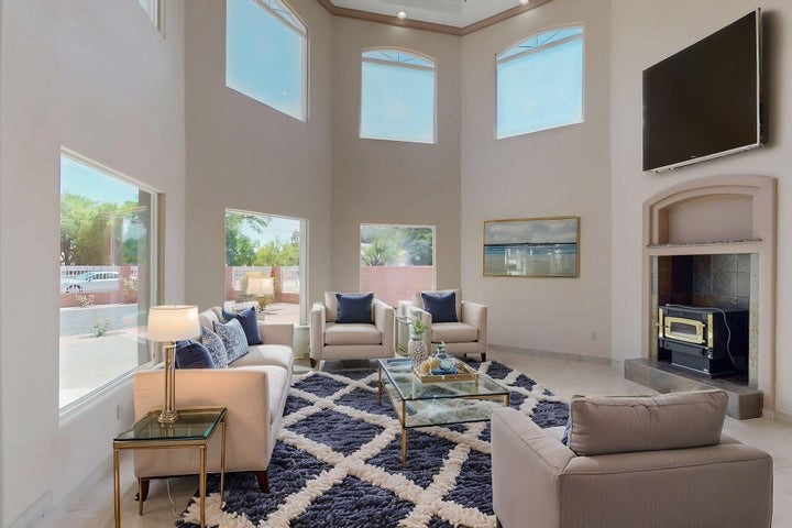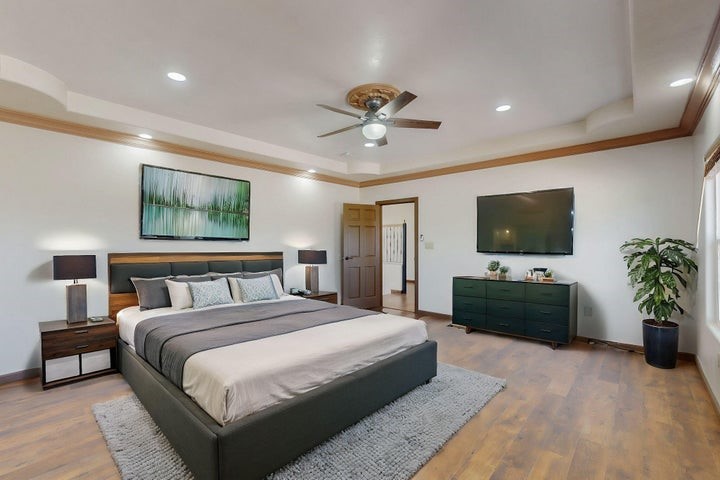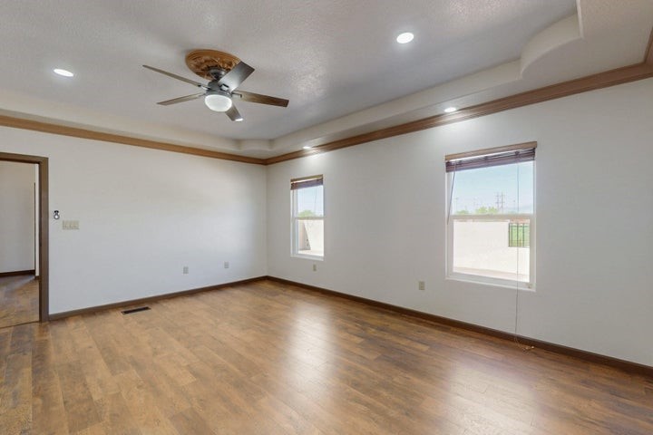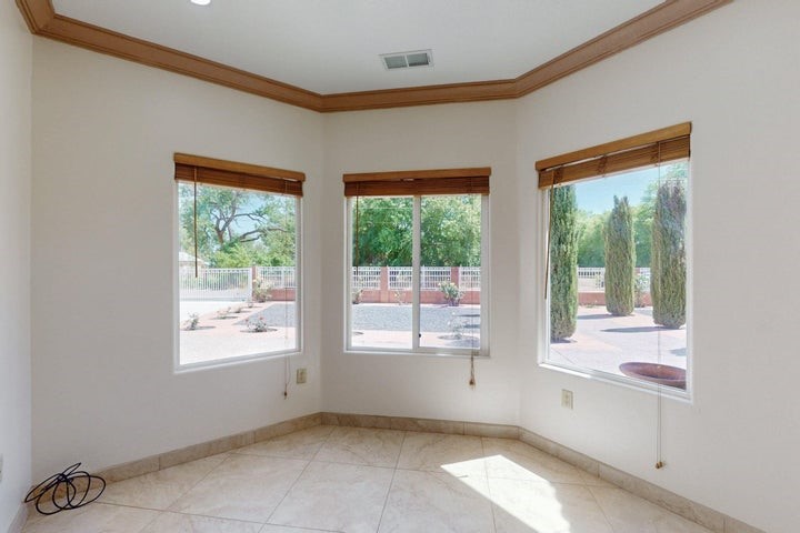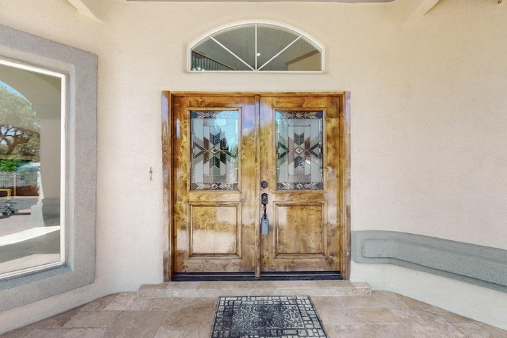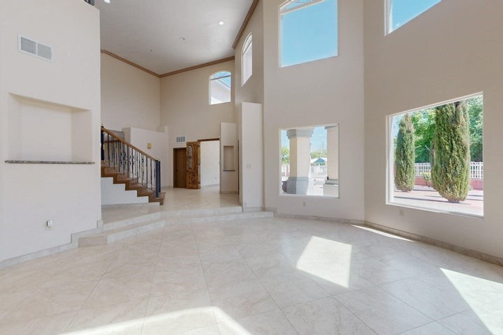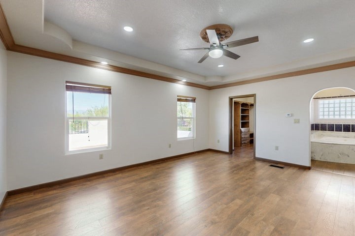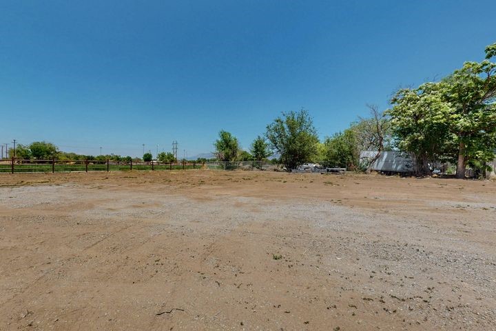 Owner to owner financing available! This one-of-a-kind luxury home is nestled in a highly sought-after, tucked-away neighborhood with million-dollar views of the Sandia Mountains. Set on nearly an acre with an agricultural feel and neighboring green pastures, it offers ultimate privacy and tranquility. The home features a newly stuccoed exterior, fresh paint, tile roofing, soaring ceilings, radiant heated floors, and two combo units with refrigerated air. The oversized kitchen island anchors a spacious, updated interior perfect for entertaining. Step onto the expansive balcony with custom decking to take in the stunning views. A fully finished 2-car garage, a detached 4 car garage/Workshop and updated workshop add incredible functionality. Multiple fruit trees.