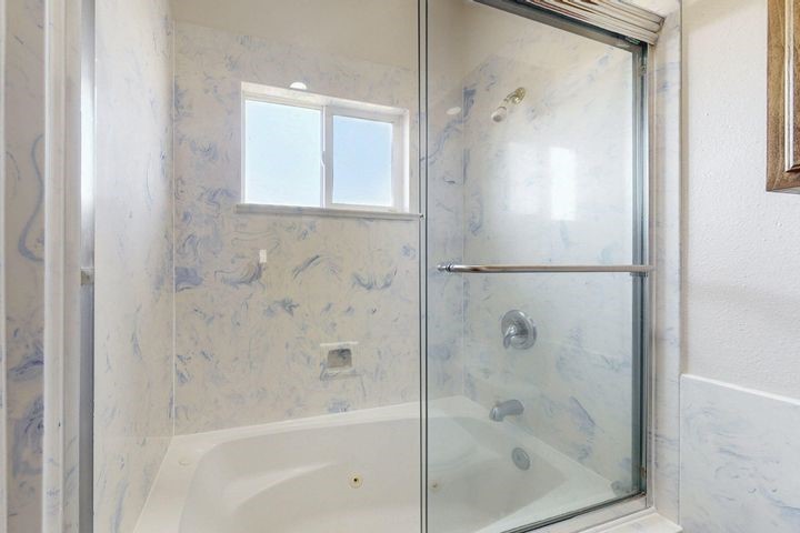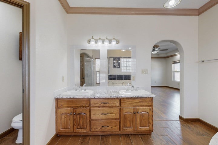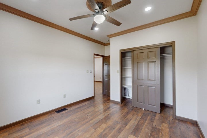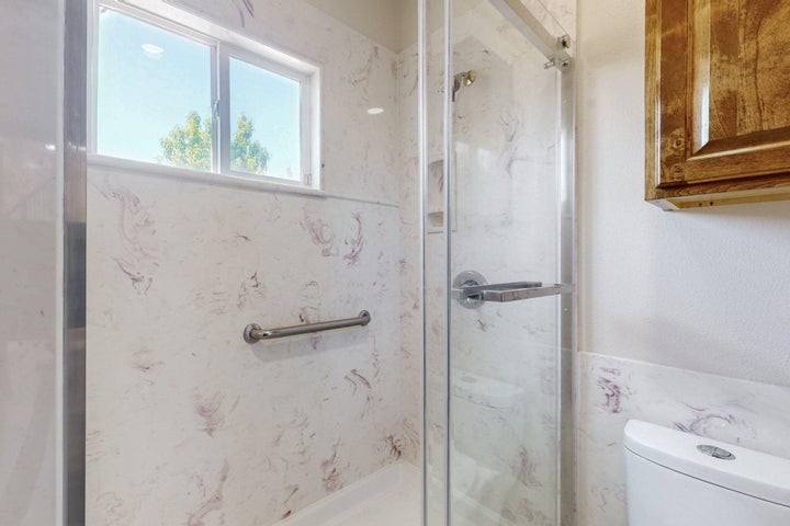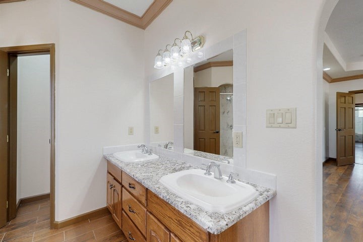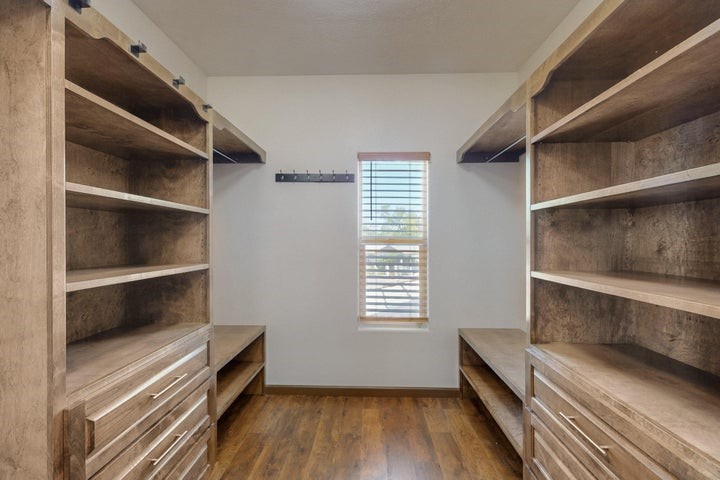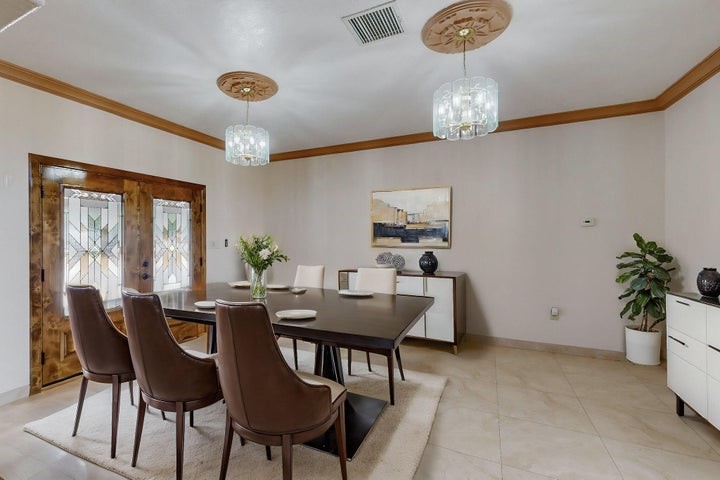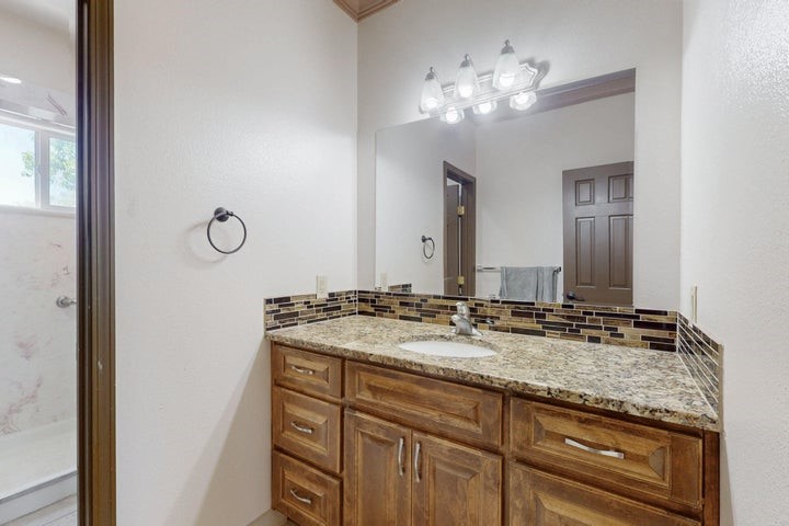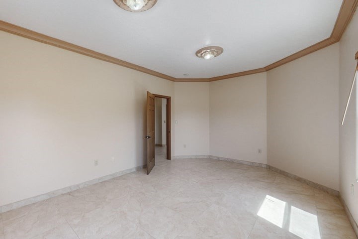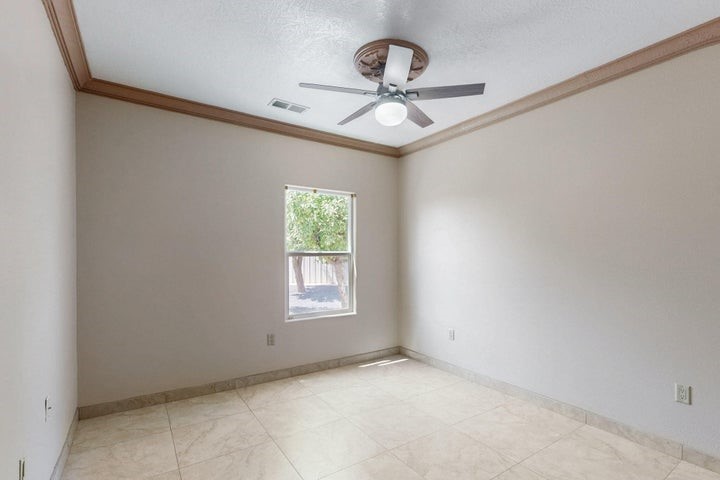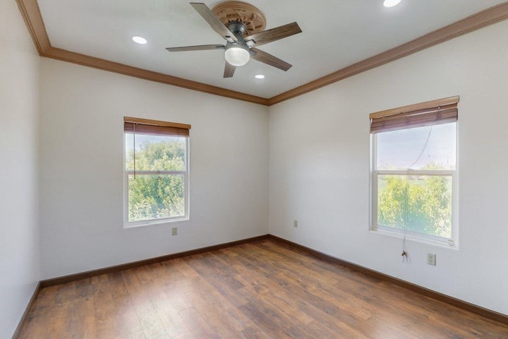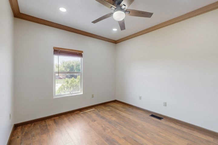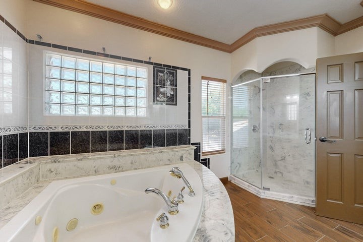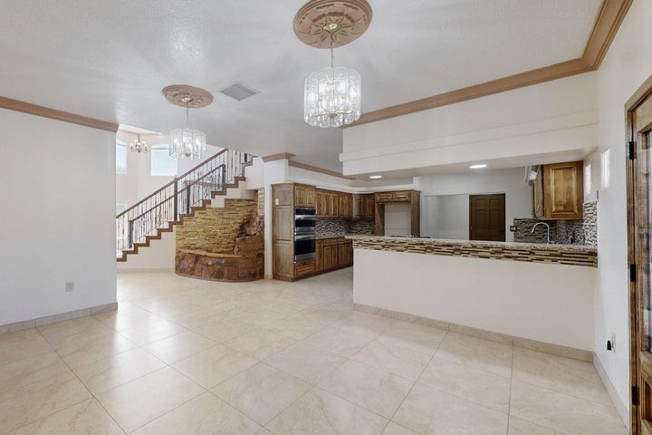 Owner to owner financing available! This one-of-a-kind luxury home is nestled in a highly sought-after, tucked-away neighborhood with million-dollar views of the Sandia Mountains. Set on nearly an acre with an agricultural feel and neighboring green pastures, it offers ultimate privacy and tranquility. The home features a newly stuccoed exterior, fresh paint, tile roofing, soaring ceilings, radiant heated floors, and two combo units with refrigerated air. The oversized kitchen island anchors a spacious, updated interior perfect for entertaining. Step onto the expansive balcony with custom decking to take in the stunning views. A fully finished 2-car garage, a detached 4 car garage/Workshop and updated workshop add incredible functionality. Multiple fruit trees.