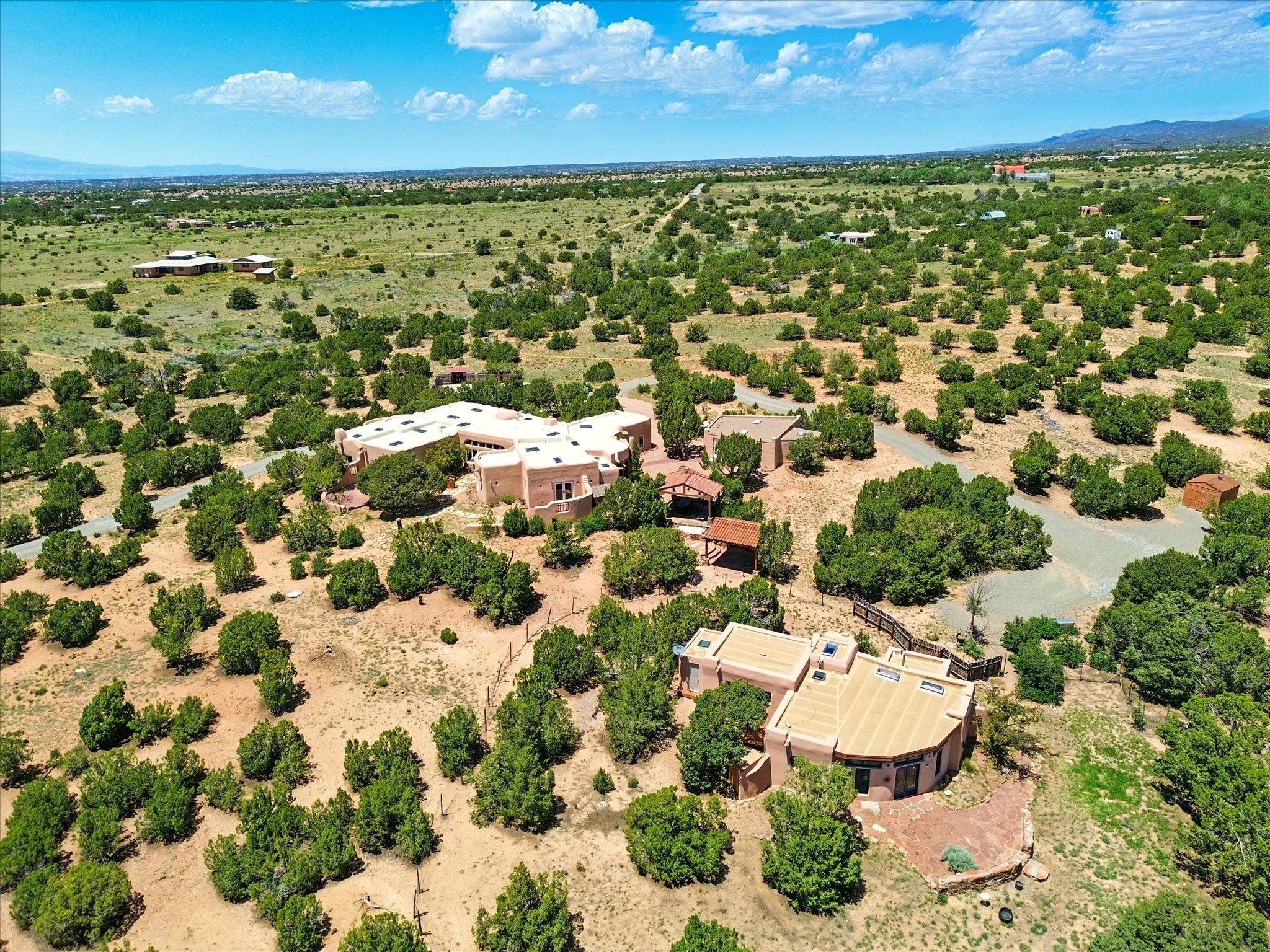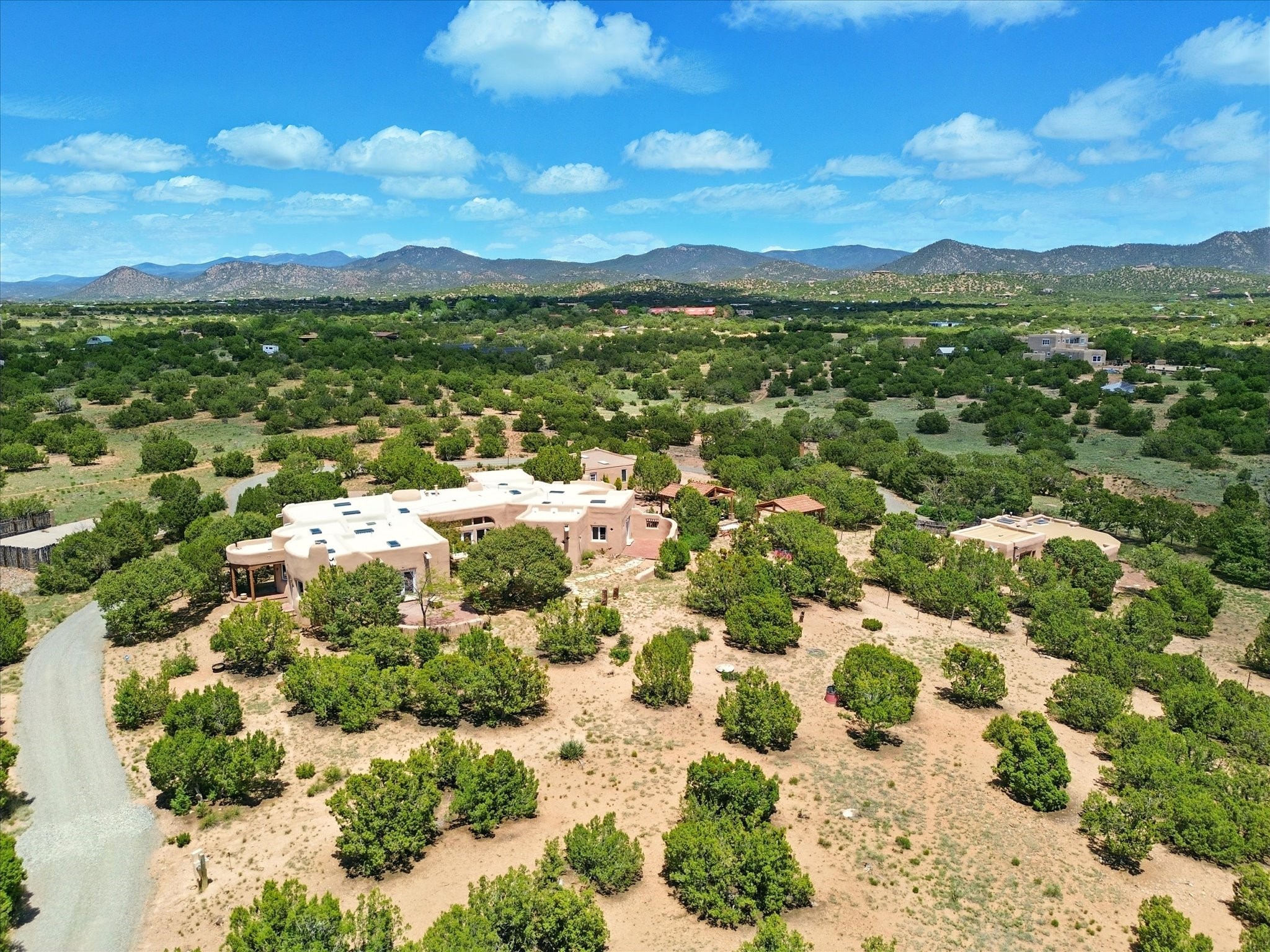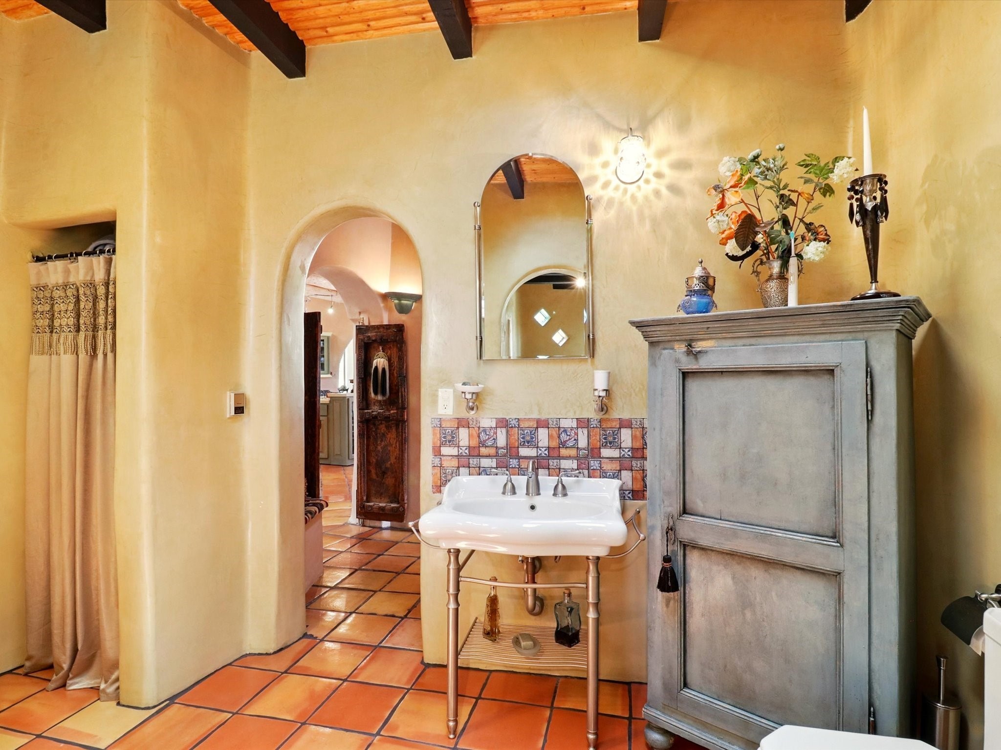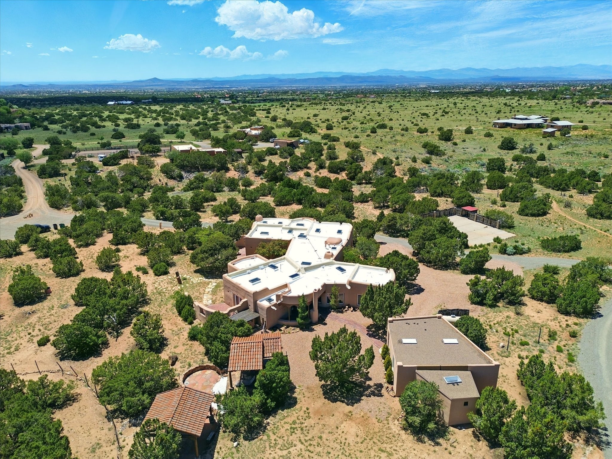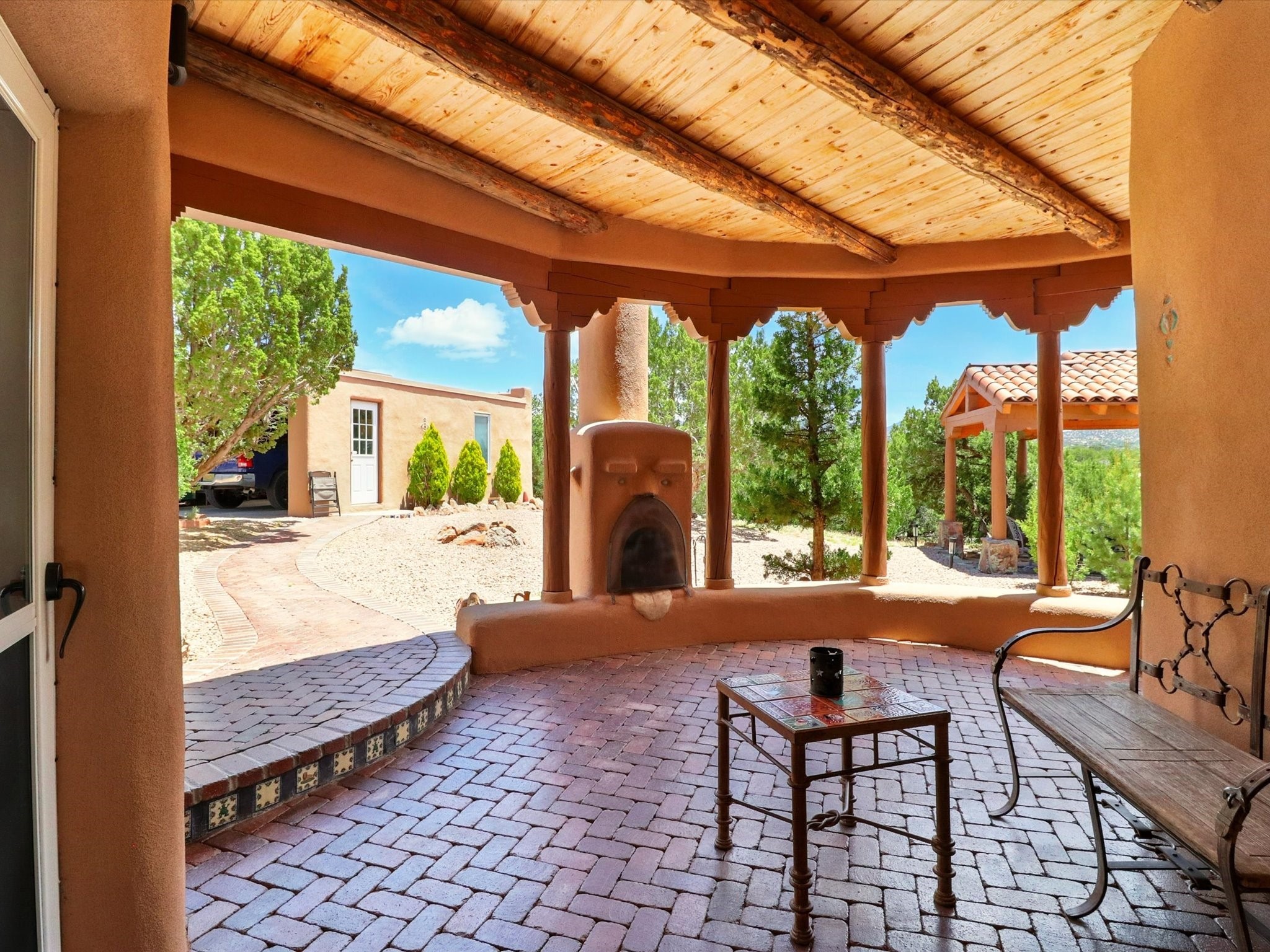 Enchanting Adobe Retreat with Guest Casita on 5 Private Acres - A timeless sanctuary nestled in the foothills of Santa Fe, where every sunrise brings serenity and every sunset invites reflection. For over three decades, this property has been cherished and curated, blending rich Santa Fe tradition with European influences.Begin your mornings on the covered kitchen patio, coffee in hand, as the sun rises over the Sangre De Cristo Mountains. Inside, the heart of the home unfolds with a kitchen island overlooking the living room's doors and windows -- framing an ornamental cherry tree and a 300-year-old pion tree.This custom adobe overflows with craftsmanship. Hand-carved beams, herringbone latillas, corbels, nichos, and structolite plastered walls speak to the region's architectural heritage. Thoughtful design details elevate the space: Venetian glass lighting, custom fixtures crafted by local artisans, and elegant Italian porcelain baths with satin nickel finishes from "Santa Fe by Design."Enjoy year-round comfort thanks to thick adobe walls, Marvin doors and windows, and radiant in-floor heating throughout the home. As the day winds down, indulge in a soak in the luxurious 6-foot clawfoot tub, gazing out the large picture window by sunset.Multiple portals -- two attached and two detached -- offer peaceful spots to unwind, each with its own perspective of the lush 5-acre grounds. Designed as an equestrian property, the land is both functional and magical, offering serenity, privacy, and space to explore.Included is a charming and fully private custom adobe guest house -- perfect for guests or as a proven income-generating rental.31 A&B Hondo Trail is more than a home; it's a living piece of art, a place of beauty, peace, and purpose. Come experience the enchantment for yourself.MAIN HOME HAS A NEW ROOF INSTALLED MAY 2025