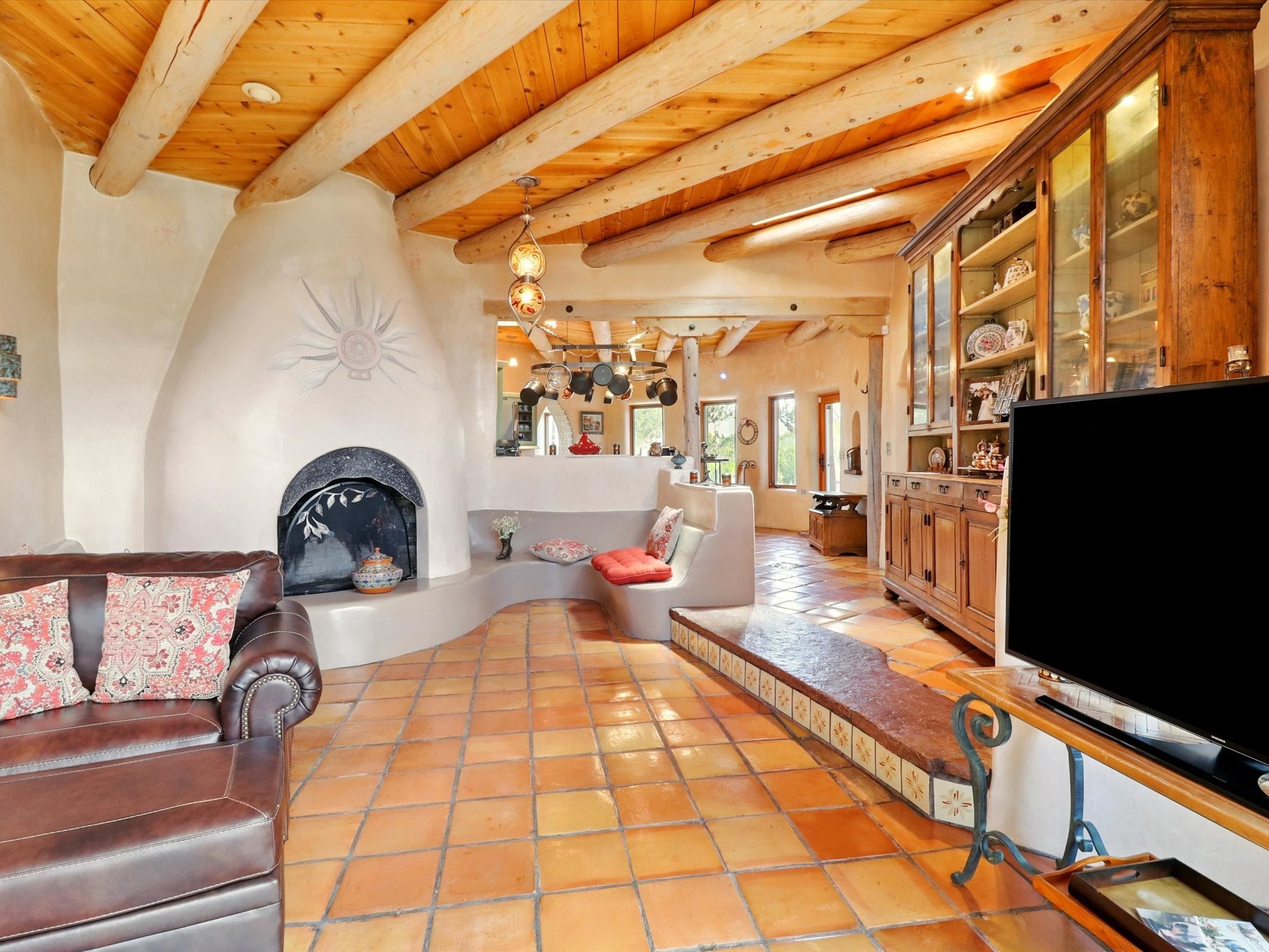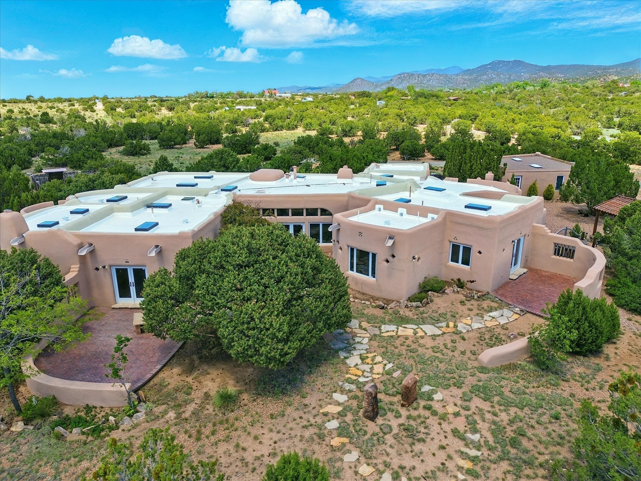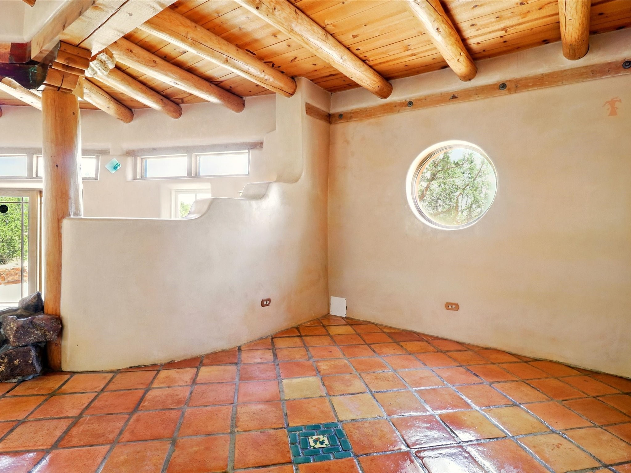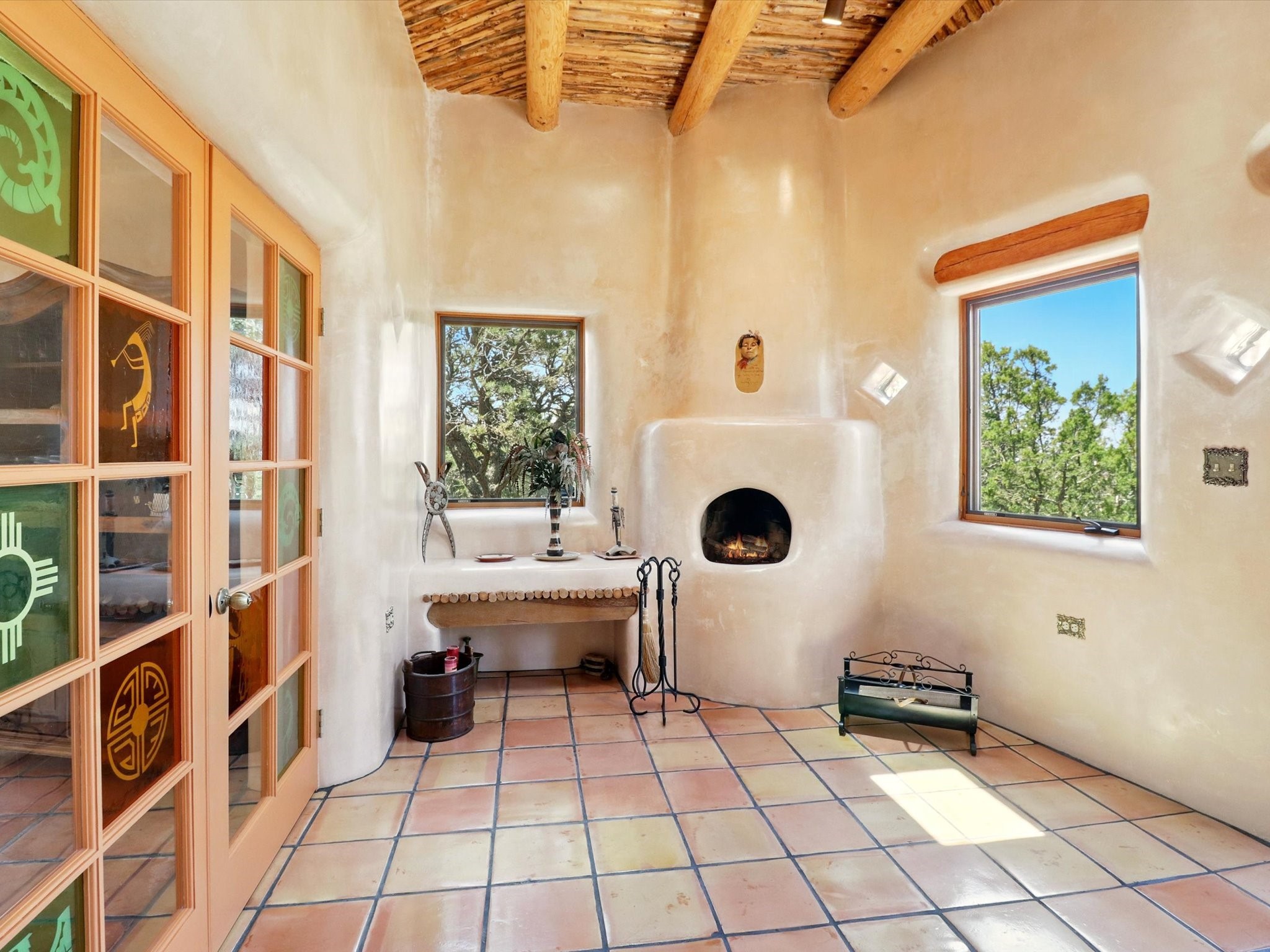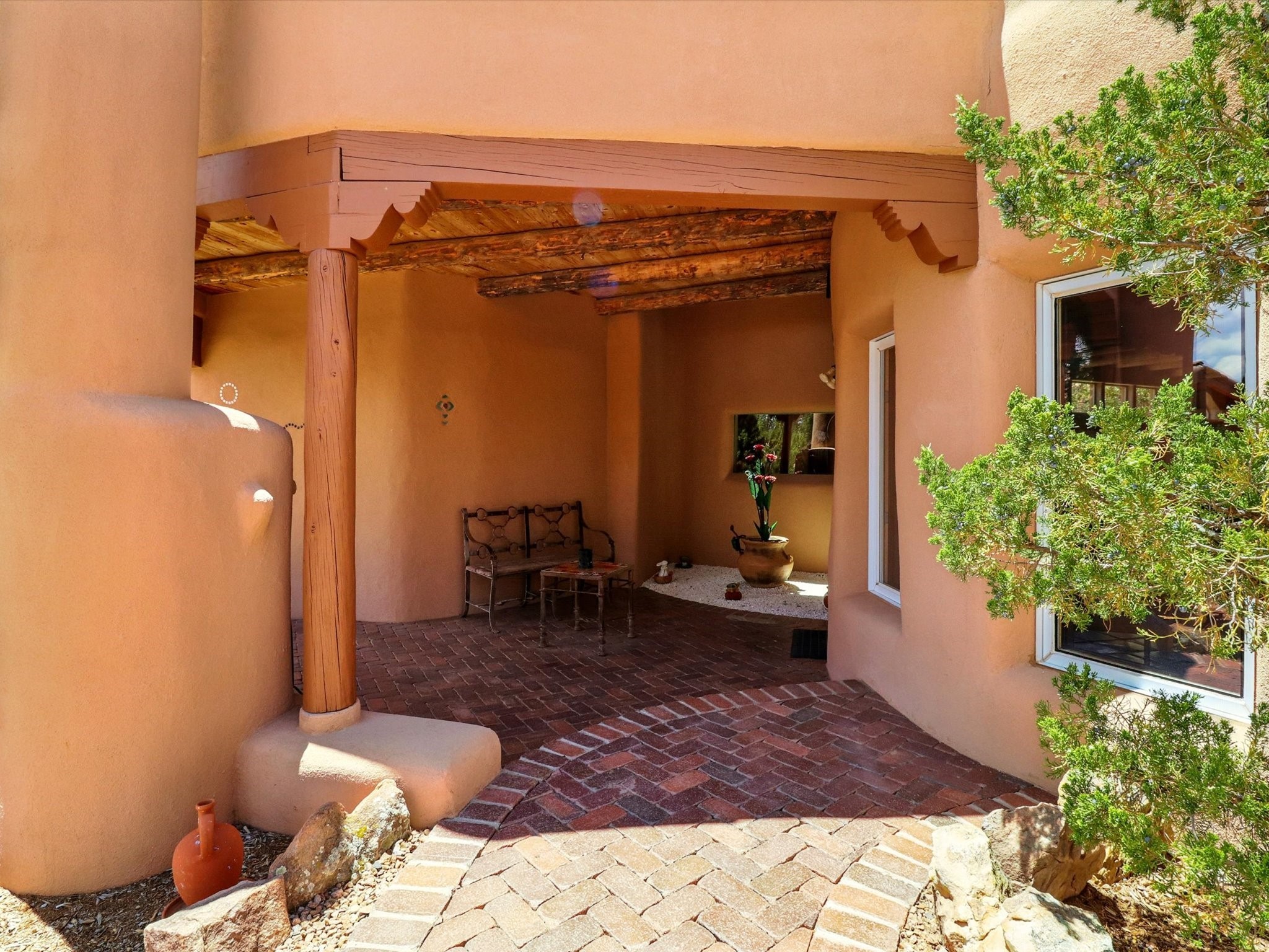 Enchanting Adobe Retreat with Guest Casita on 5 Private Acres - A timeless sanctuary nestled in the foothills of Santa Fe, where every sunrise brings serenity and every sunset invites reflection. For over three decades, this property has been cherished and curated, blending rich Santa Fe tradition with European influences.Begin your mornings on the covered kitchen patio, coffee in hand, as the sun rises over the Sangre De Cristo Mountains. Inside, the heart of the home unfolds with a kitchen island overlooking the living room's doors and windows -- framing an ornamental cherry tree and a 300-year-old pion tree.This custom adobe overflows with craftsmanship. Hand-carved beams, herringbone latillas, corbels, nichos, and structolite plastered walls speak to the region's architectural heritage. Thoughtful design details elevate the space: Venetian glass lighting, custom fixtures crafted by local artisans, and elegant Italian porcelain baths with satin nickel finishes from "Santa Fe by Design."Enjoy year-round comfort thanks to thick adobe walls, Marvin doors and windows, and radiant in-floor heating throughout the home. As the day winds down, indulge in a soak in the luxurious 6-foot clawfoot tub, gazing out the large picture window by sunset.Multiple portals -- two attached and two detached -- offer peaceful spots to unwind, each with its own perspective of the lush 5-acre grounds. Designed as an equestrian property, the land is both functional and magical, offering serenity, privacy, and space to explore.Included is a charming and fully private custom adobe guest house -- perfect for guests or as a proven income-generating rental.31 A&B Hondo Trail is more than a home; it's a living piece of art, a place of beauty, peace, and purpose. Come experience the enchantment for yourself.MAIN HOME HAS A NEW ROOF INSTALLED MAY 2025