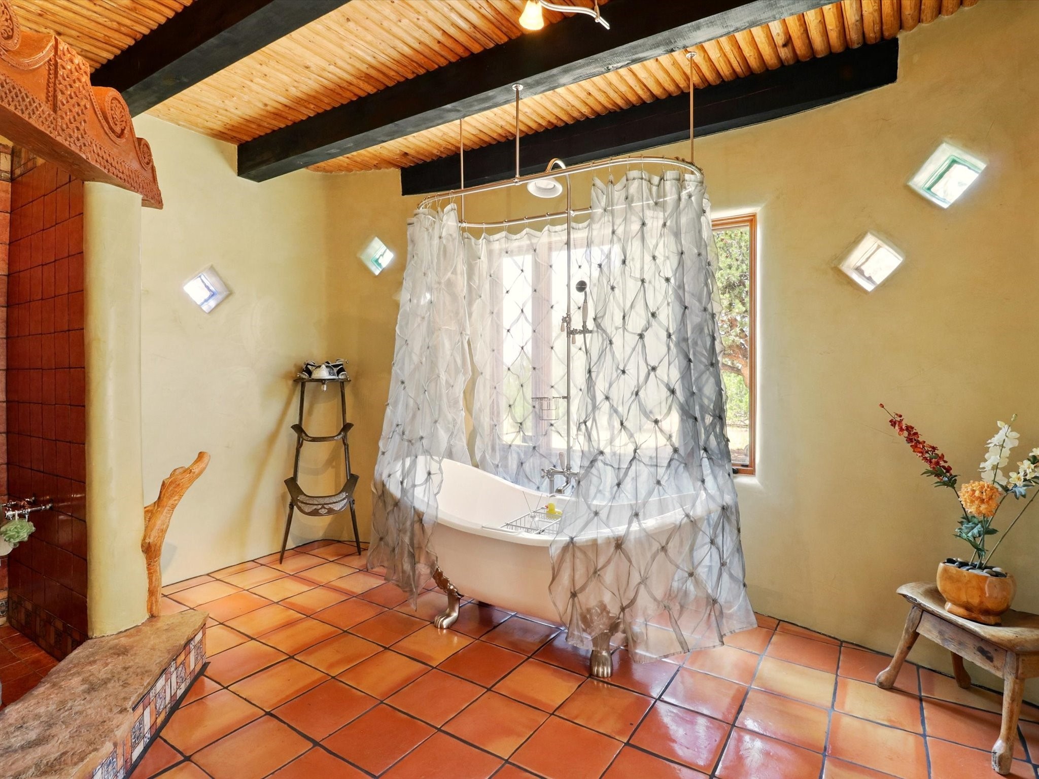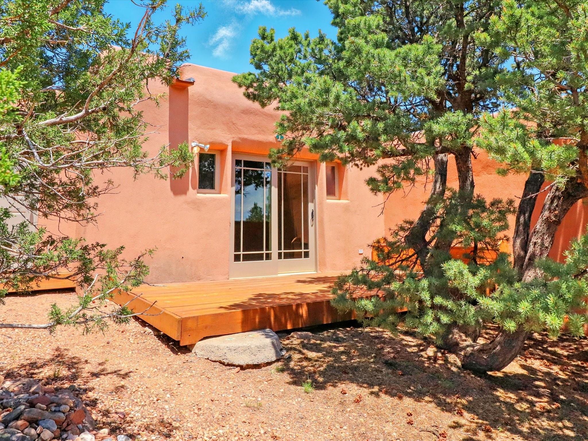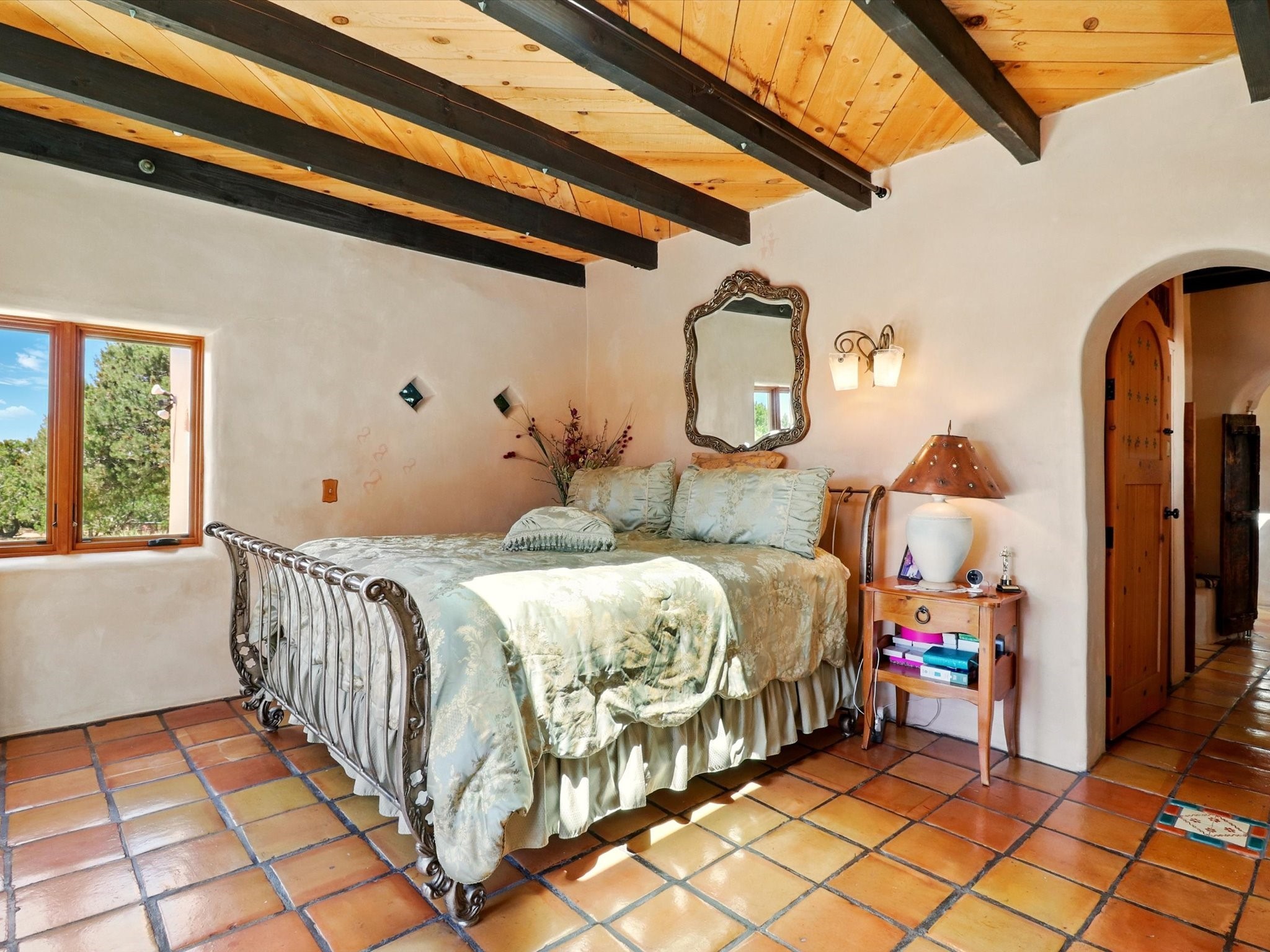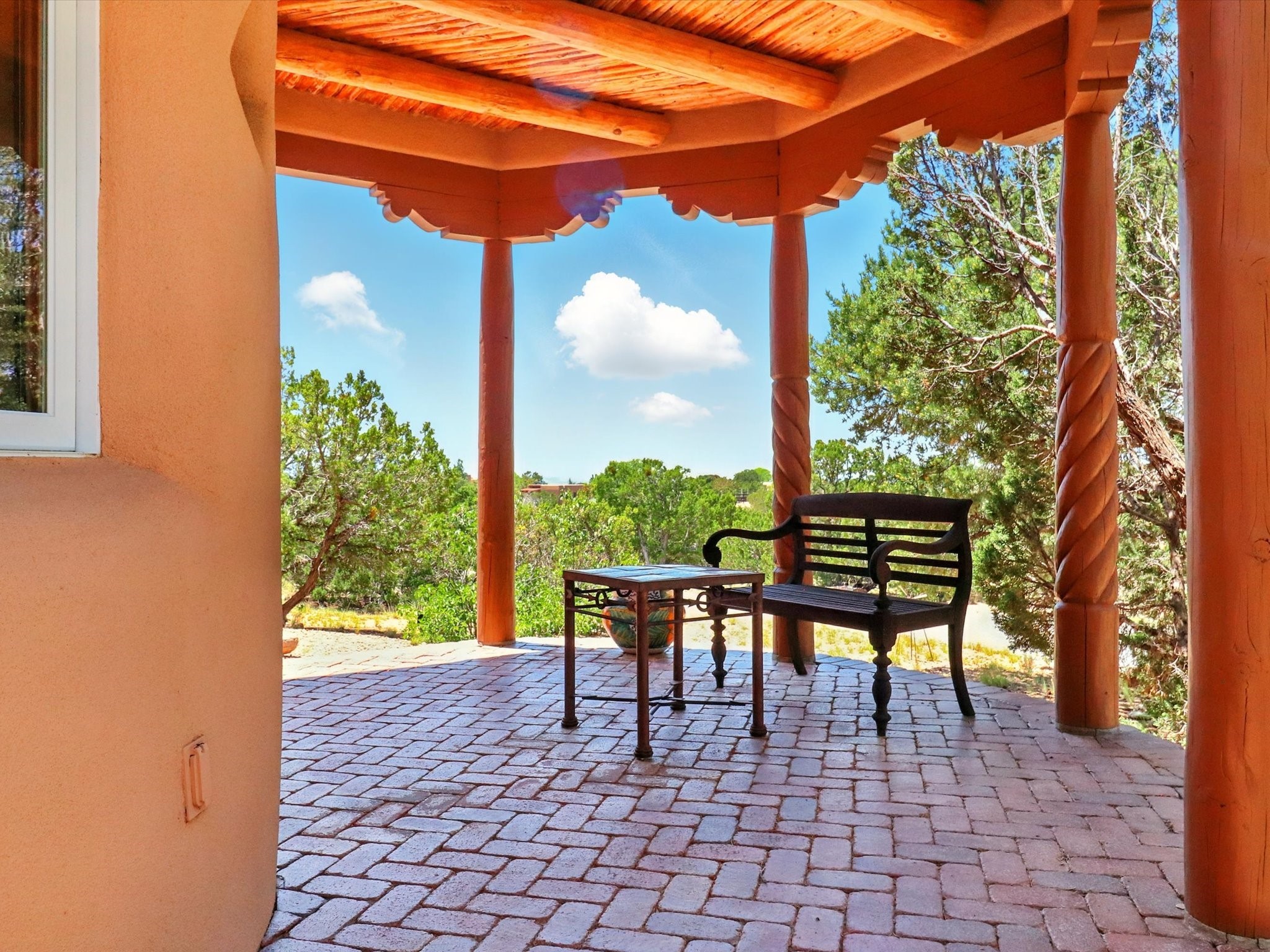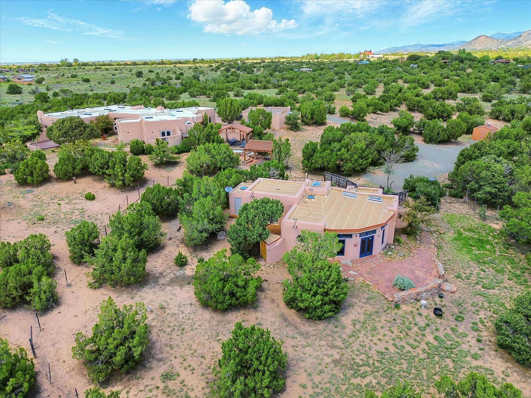Enchanting Adobe Retreat with Guest Casita on 5 Private Acres - A timeless sanctuary nestled in the foothills of Santa Fe, where every sunrise brings serenity and every sunset invites reflection. For over three decades, this property has been cherished and curated, blending rich Santa Fe tradition with European influences.Begin your mornings on the covered kitchen patio, coffee in hand, as the sun rises over the Sangre De Cristo Mountains. Inside, the heart of the home unfolds with a kitchen island overlooking the living room's doors and windows -- framing an ornamental cherry tree and a 300-year-old pion tree.This custom adobe overflows with craftsmanship. Hand-carved beams, herringbone latillas, corbels, nichos, and structolite plastered walls speak to the region's architectural heritage. Thoughtful design details elevate the space: Venetian glass lighting, custom fixtures crafted by local artisans, and elegant Italian porcelain baths with satin nickel finishes from "Santa Fe by Design."Enjoy year-round comfort thanks to thick adobe walls, Marvin doors and windows, and radiant in-floor heating throughout the home. As the day winds down, indulge in a soak in the luxurious 6-foot clawfoot tub, gazing out the large picture window by sunset.Multiple portals -- two attached and two detached -- offer peaceful spots to unwind, each with its own perspective of the lush 5-acre grounds. Designed as an equestrian property, the land is both functional and magical, offering serenity, privacy, and space to explore.Included is a charming and fully private custom adobe guest house -- perfect for guests or as a proven income-generating rental.31 A&B Hondo Trail is more than a home; it's a living piece of art, a place of beauty, peace, and purpose. Come experience the enchantment for yourself.MAIN HOME HAS A NEW ROOF INSTALLED MAY 2025