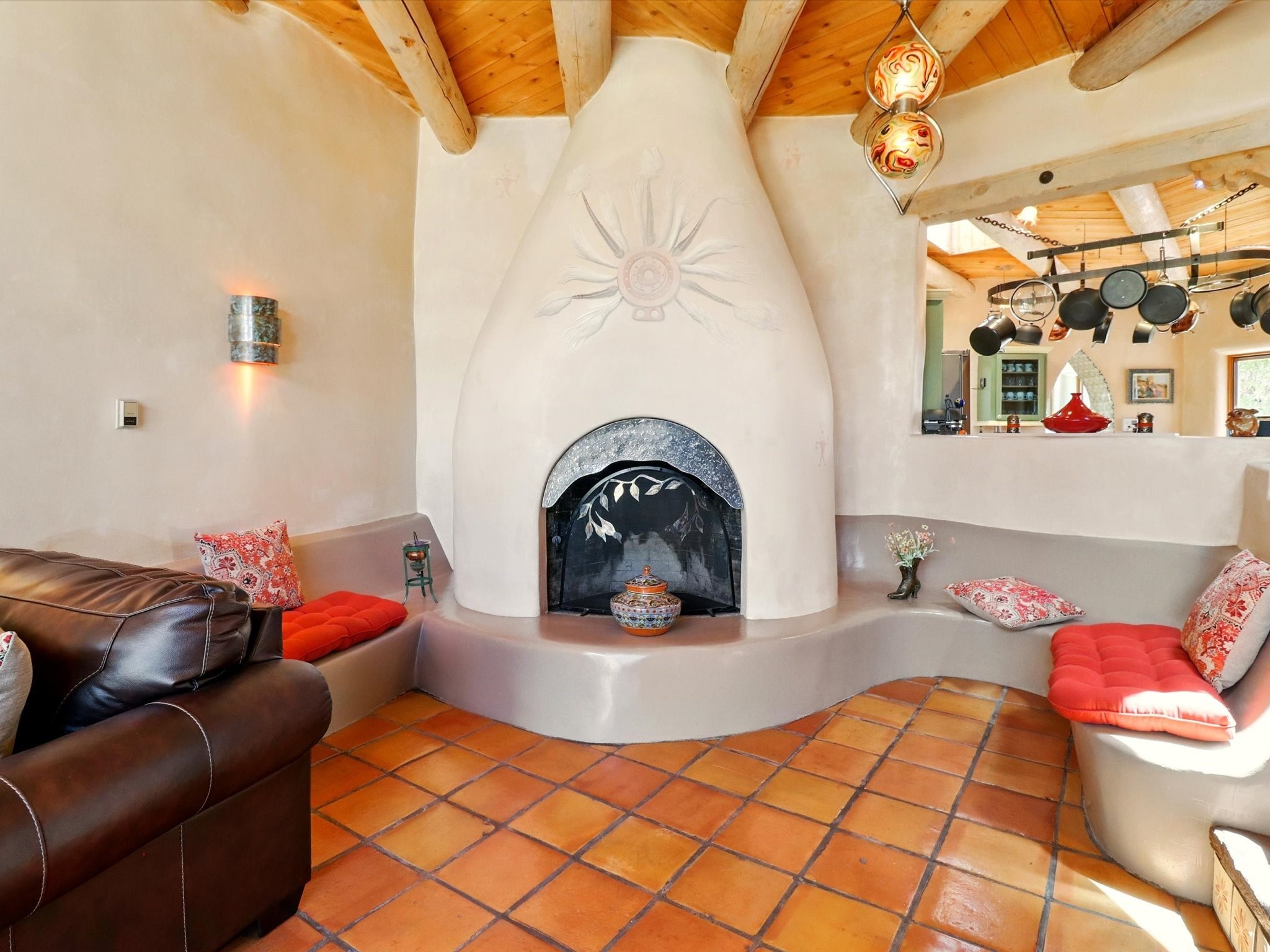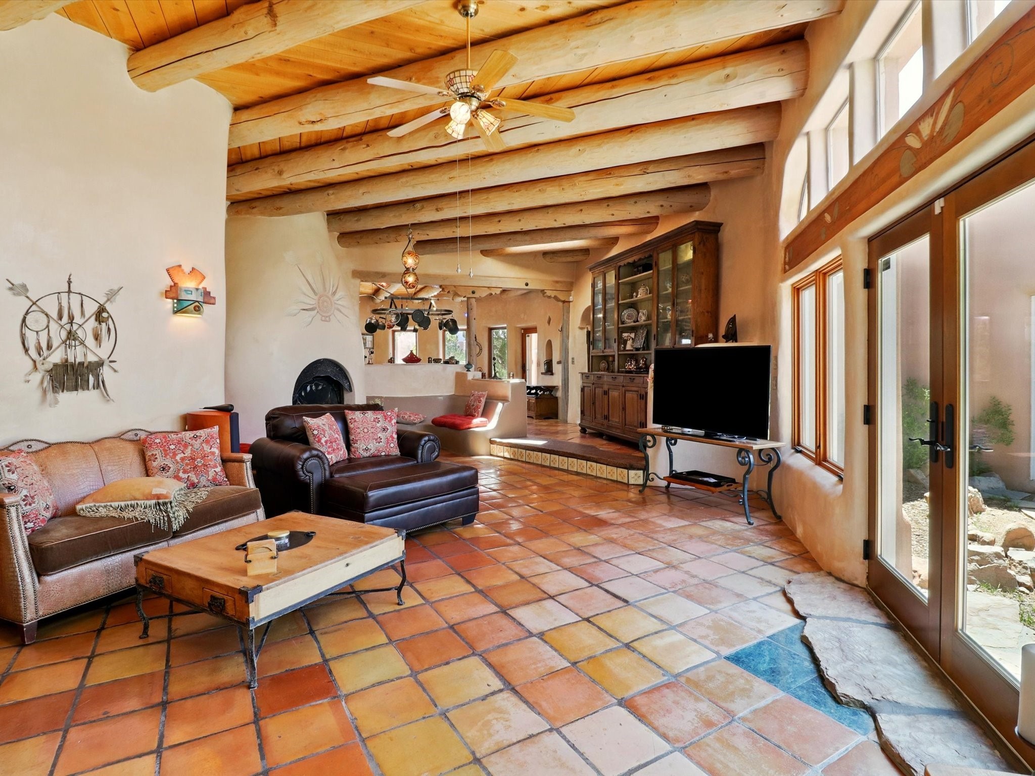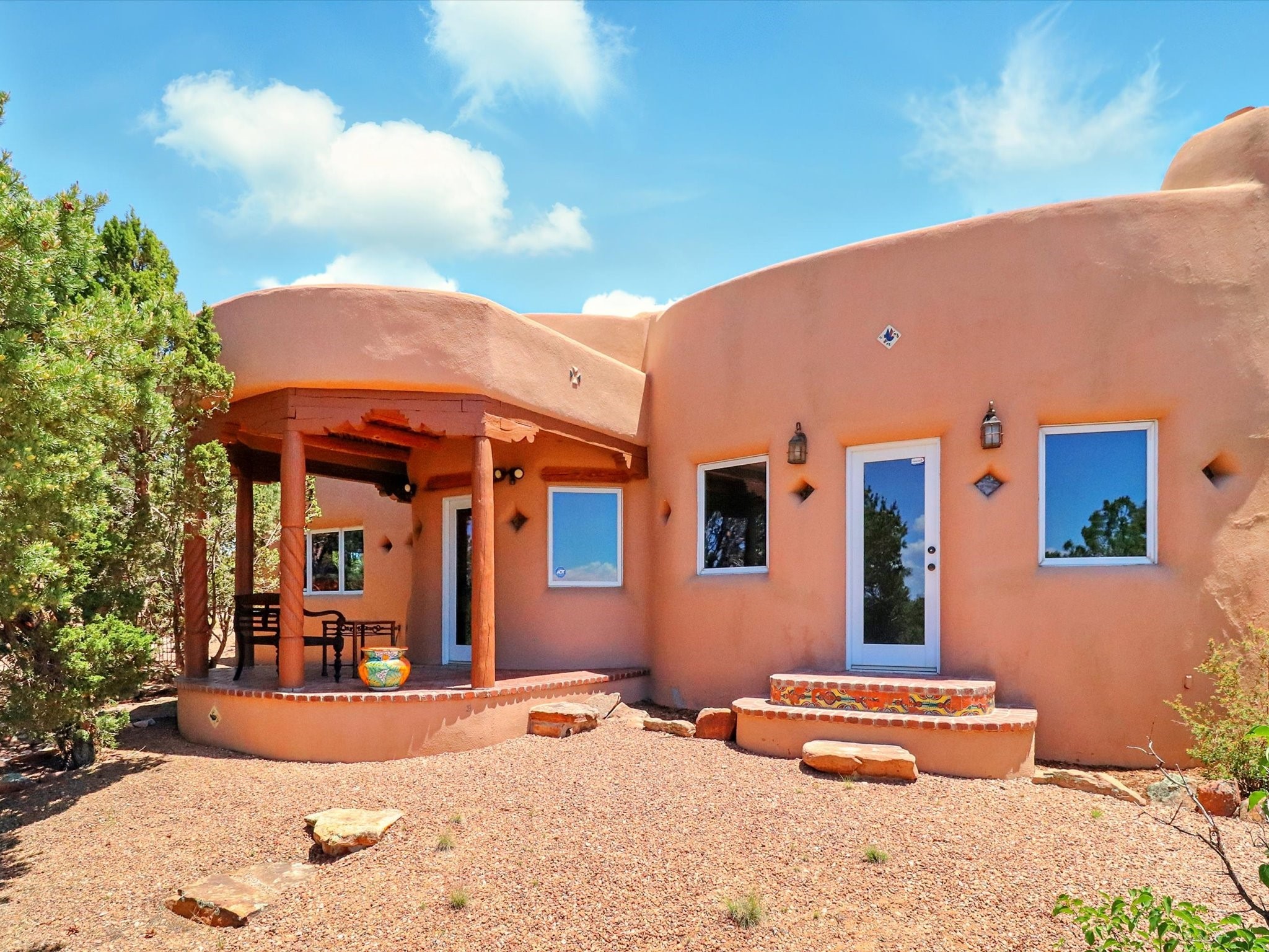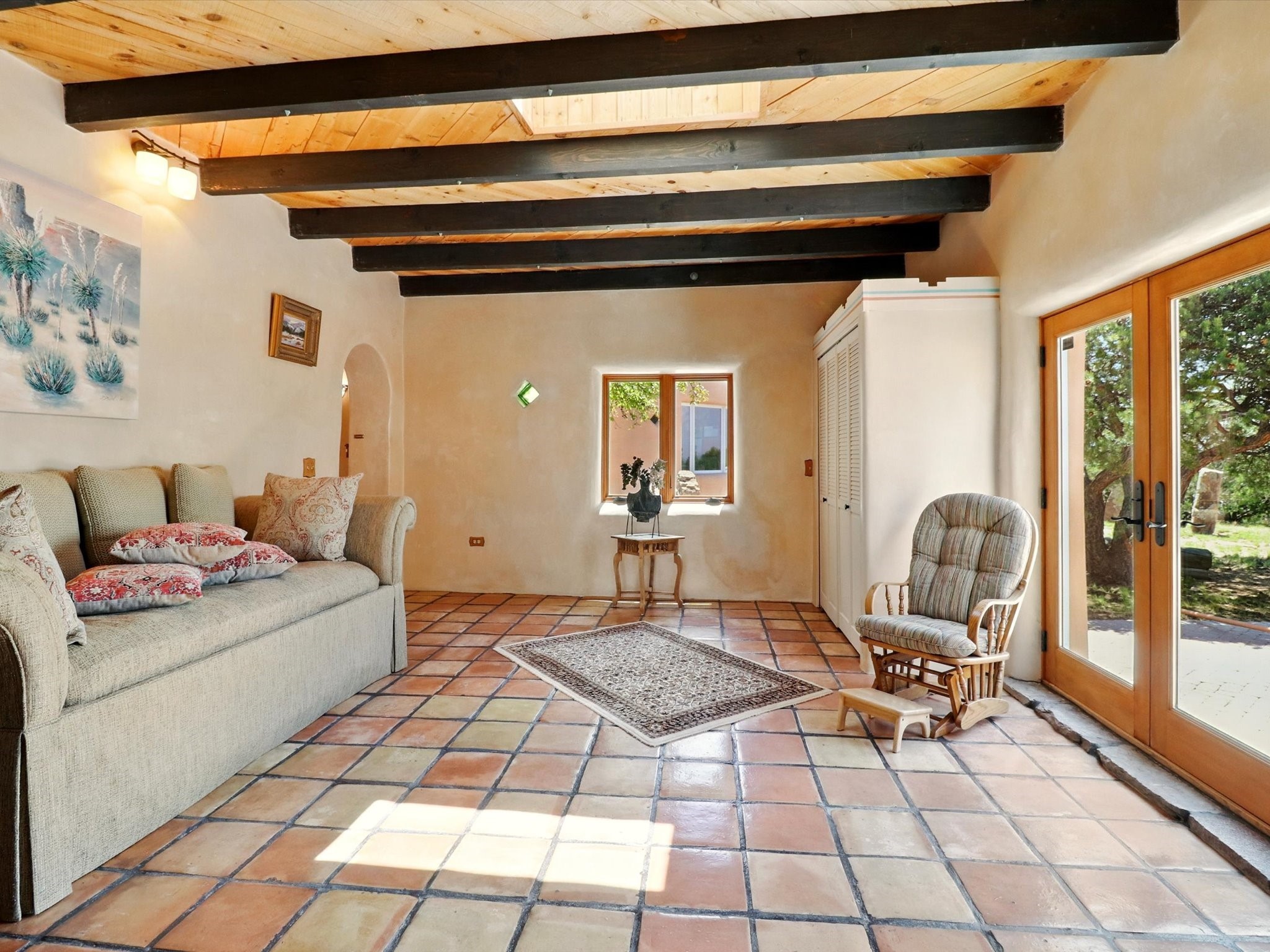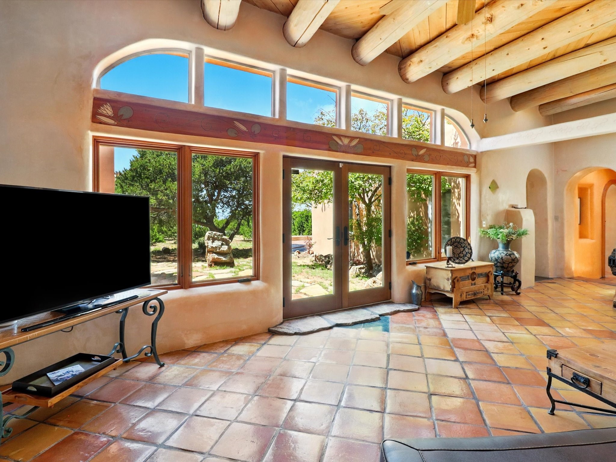 Enchanting Adobe Retreat with Guest Casita on 5 Private Acres - A timeless sanctuary nestled in the foothills of Santa Fe, where every sunrise brings serenity and every sunset invites reflection. For over three decades, this property has been cherished and curated, blending rich Santa Fe tradition with European influences.Begin your mornings on the covered kitchen patio, coffee in hand, as the sun rises over the Sangre De Cristo Mountains. Inside, the heart of the home unfolds with a kitchen island overlooking the living room's doors and windows -- framing an ornamental cherry tree and a 300-year-old pion tree.This custom adobe overflows with craftsmanship. Hand-carved beams, herringbone latillas, corbels, nichos, and structolite plastered walls speak to the region's architectural heritage. Thoughtful design details elevate the space: Venetian glass lighting, custom fixtures crafted by local artisans, and elegant Italian porcelain baths with satin nickel finishes from "Santa Fe by Design."Enjoy year-round comfort thanks to thick adobe walls, Marvin doors and windows, and radiant in-floor heating throughout the home. As the day winds down, indulge in a soak in the luxurious 6-foot clawfoot tub, gazing out the large picture window by sunset.Multiple portals -- two attached and two detached -- offer peaceful spots to unwind, each with its own perspective of the lush 5-acre grounds. Designed as an equestrian property, the land is both functional and magical, offering serenity, privacy, and space to explore.Included is a charming and fully private custom adobe guest house -- perfect for guests or as a proven income-generating rental.31 A&B Hondo Trail is more than a home; it's a living piece of art, a place of beauty, peace, and purpose. Come experience the enchantment for yourself.MAIN HOME HAS A NEW ROOF INSTALLED MAY 2025
