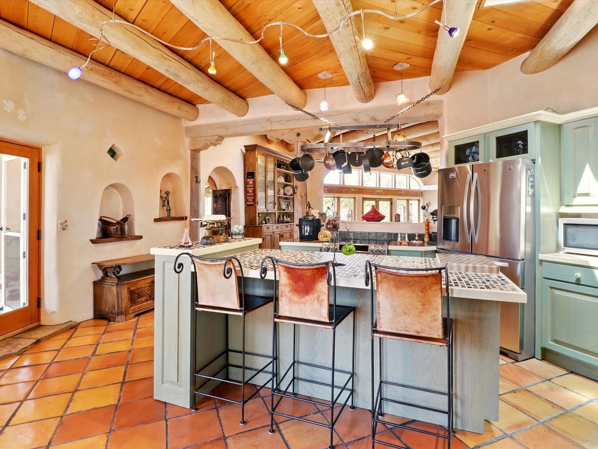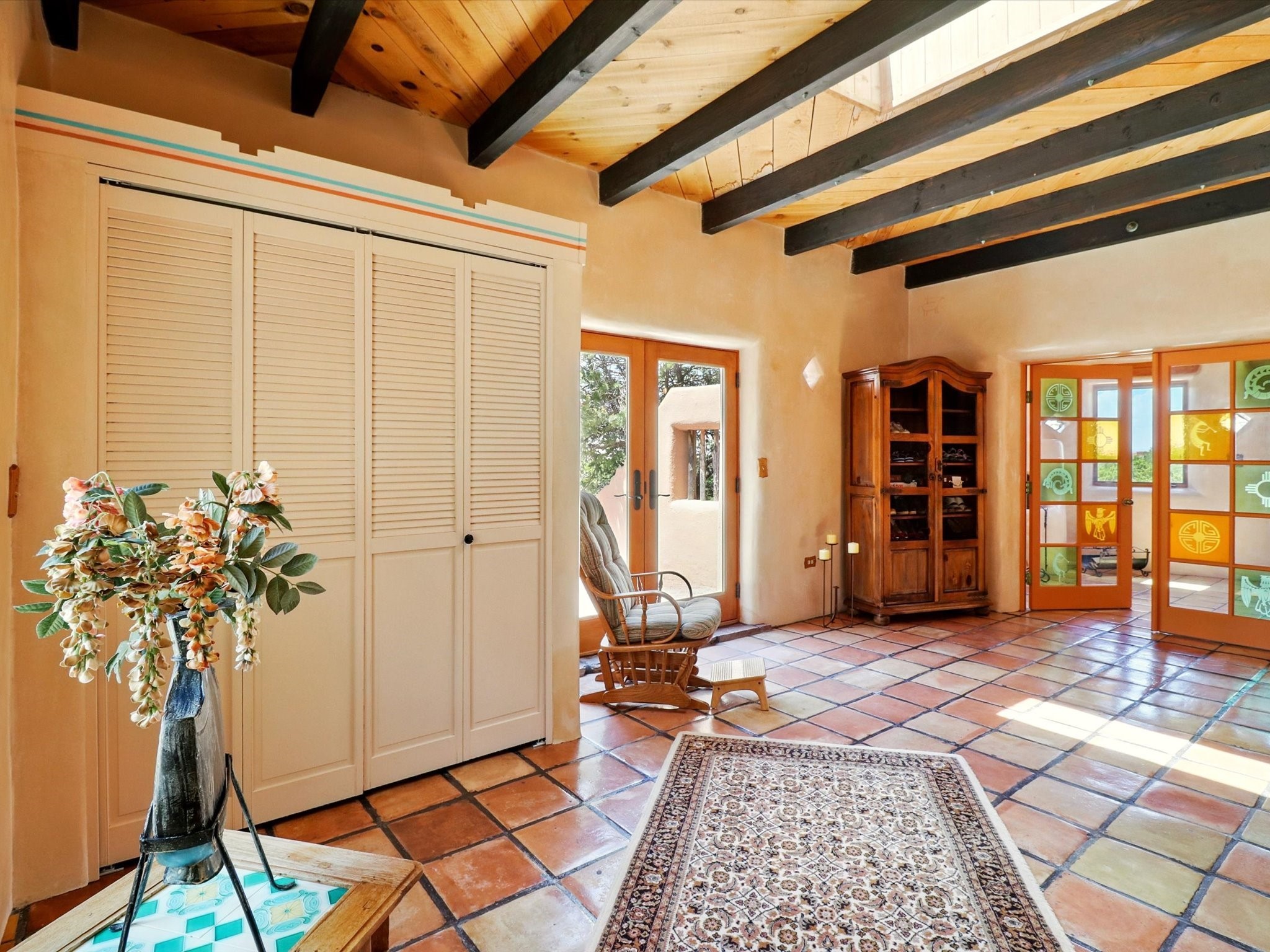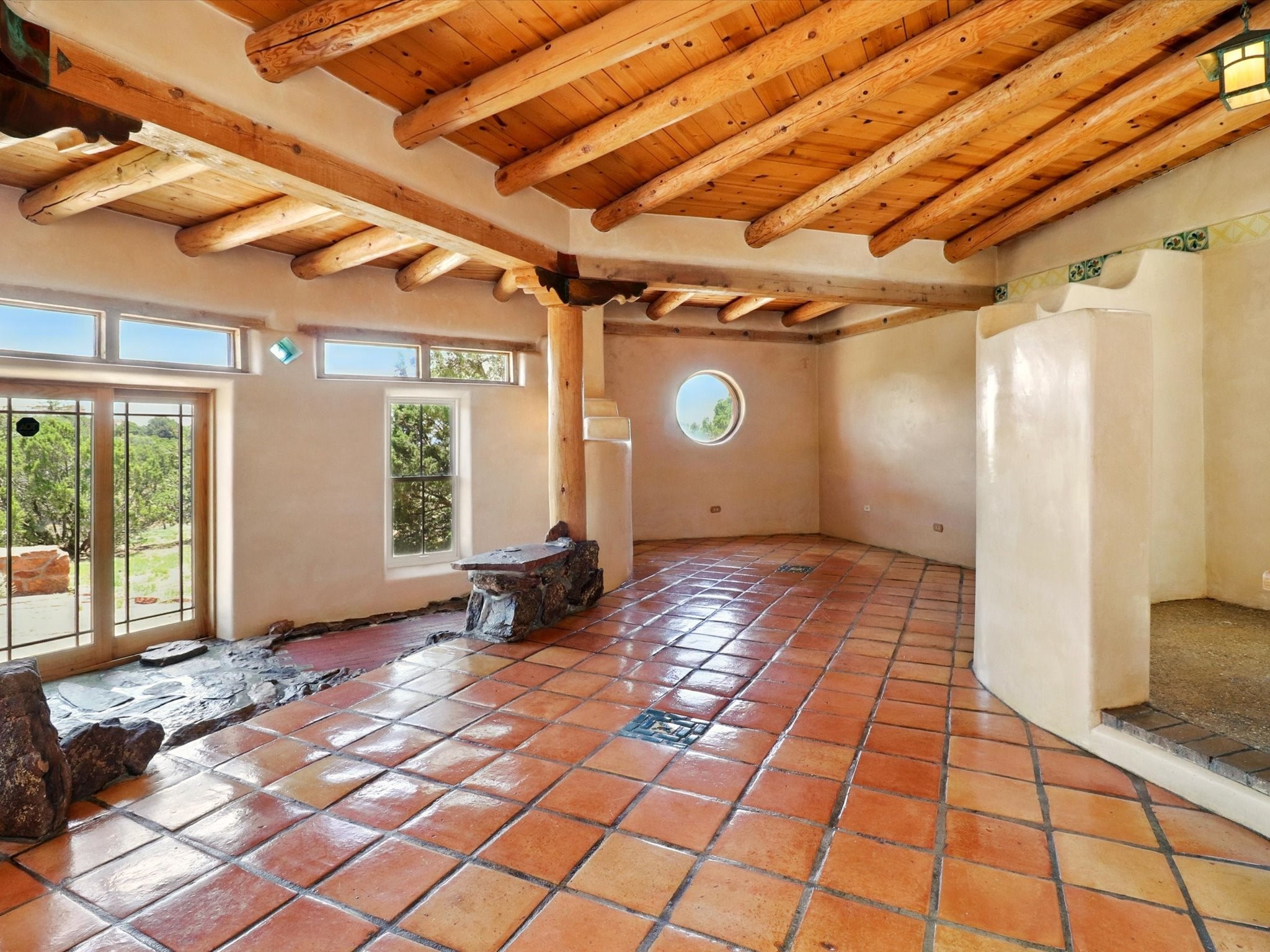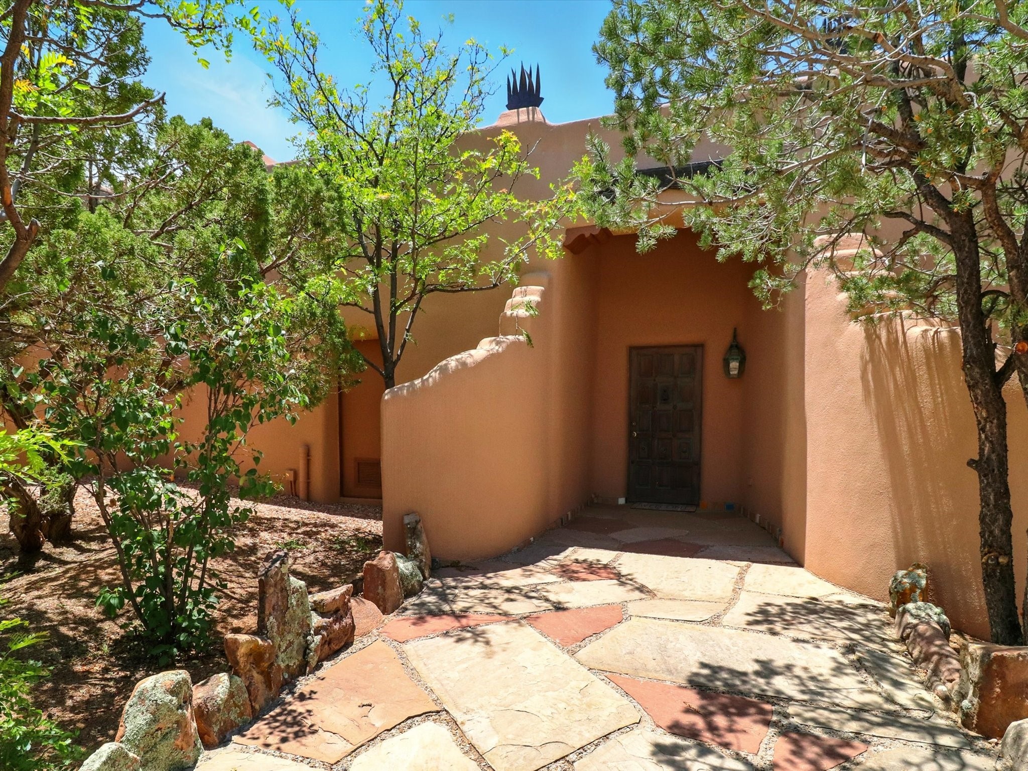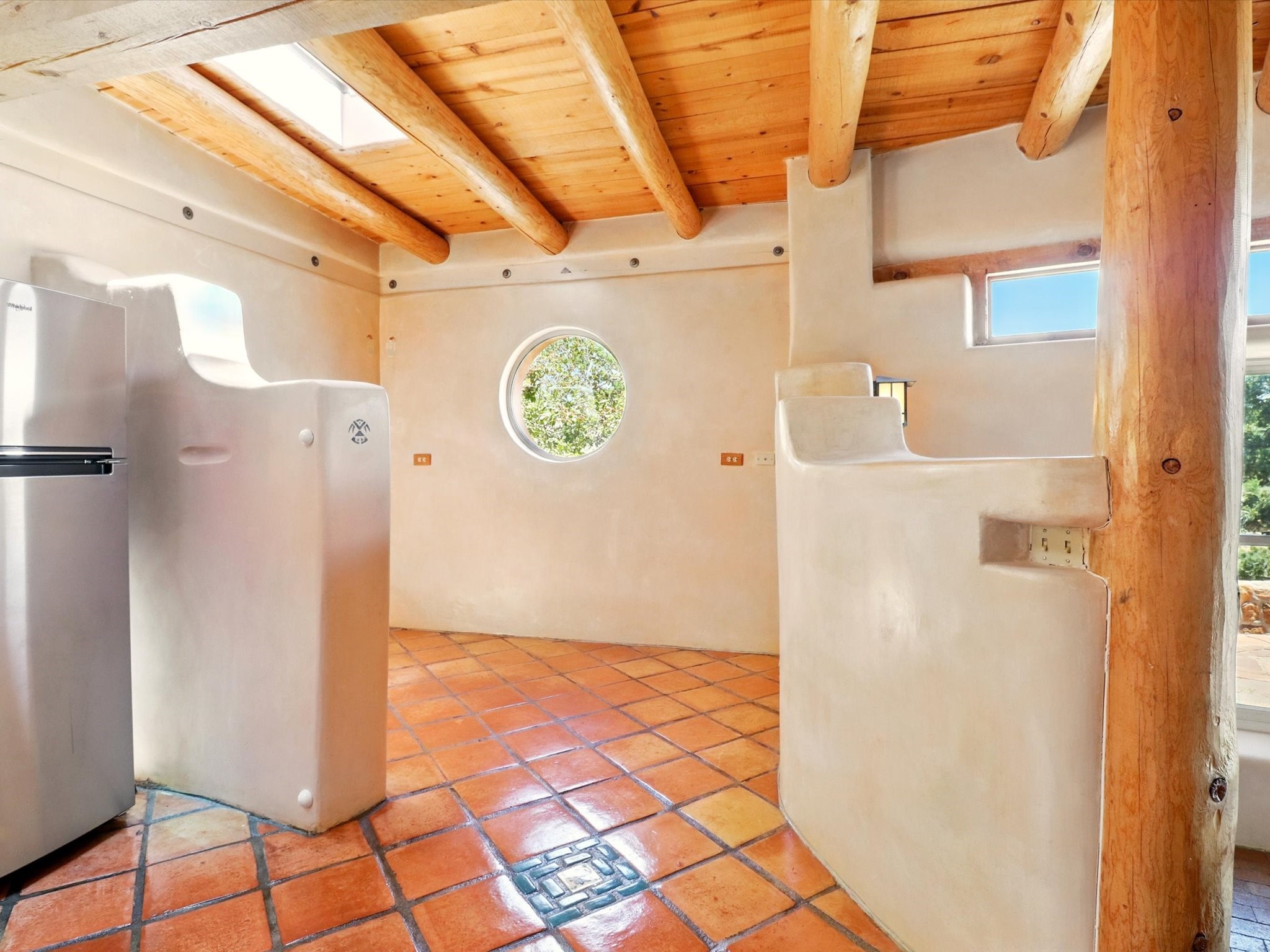 Enchanting Adobe Retreat with Guest Casita on 5 Private Acres - A timeless sanctuary nestled in the foothills of Santa Fe, where every sunrise brings serenity and every sunset invites reflection. For over three decades, this property has been cherished and curated, blending rich Santa Fe tradition with European influences.Begin your mornings on the covered kitchen patio, coffee in hand, as the sun rises over the Sangre De Cristo Mountains. Inside, the heart of the home unfolds with a kitchen island overlooking the living room's doors and windows -- framing an ornamental cherry tree and a 300-year-old pion tree.This custom adobe overflows with craftsmanship. Hand-carved beams, herringbone latillas, corbels, nichos, and structolite plastered walls speak to the region's architectural heritage. Thoughtful design details elevate the space: Venetian glass lighting, custom fixtures crafted by local artisans, and elegant Italian porcelain baths with satin nickel finishes from "Santa Fe by Design."Enjoy year-round comfort thanks to thick adobe walls, Marvin doors and windows, and radiant in-floor heating throughout the home. As the day winds down, indulge in a soak in the luxurious 6-foot clawfoot tub, gazing out the large picture window by sunset.Multiple portals -- two attached and two detached -- offer peaceful spots to unwind, each with its own perspective of the lush 5-acre grounds. Designed as an equestrian property, the land is both functional and magical, offering serenity, privacy, and space to explore.Included is a charming and fully private custom adobe guest house -- perfect for guests or as a proven income-generating rental.31 A&B Hondo Trail is more than a home; it's a living piece of art, a place of beauty, peace, and purpose. Come experience the enchantment for yourself.MAIN HOME HAS A NEW ROOF INSTALLED MAY 2025
