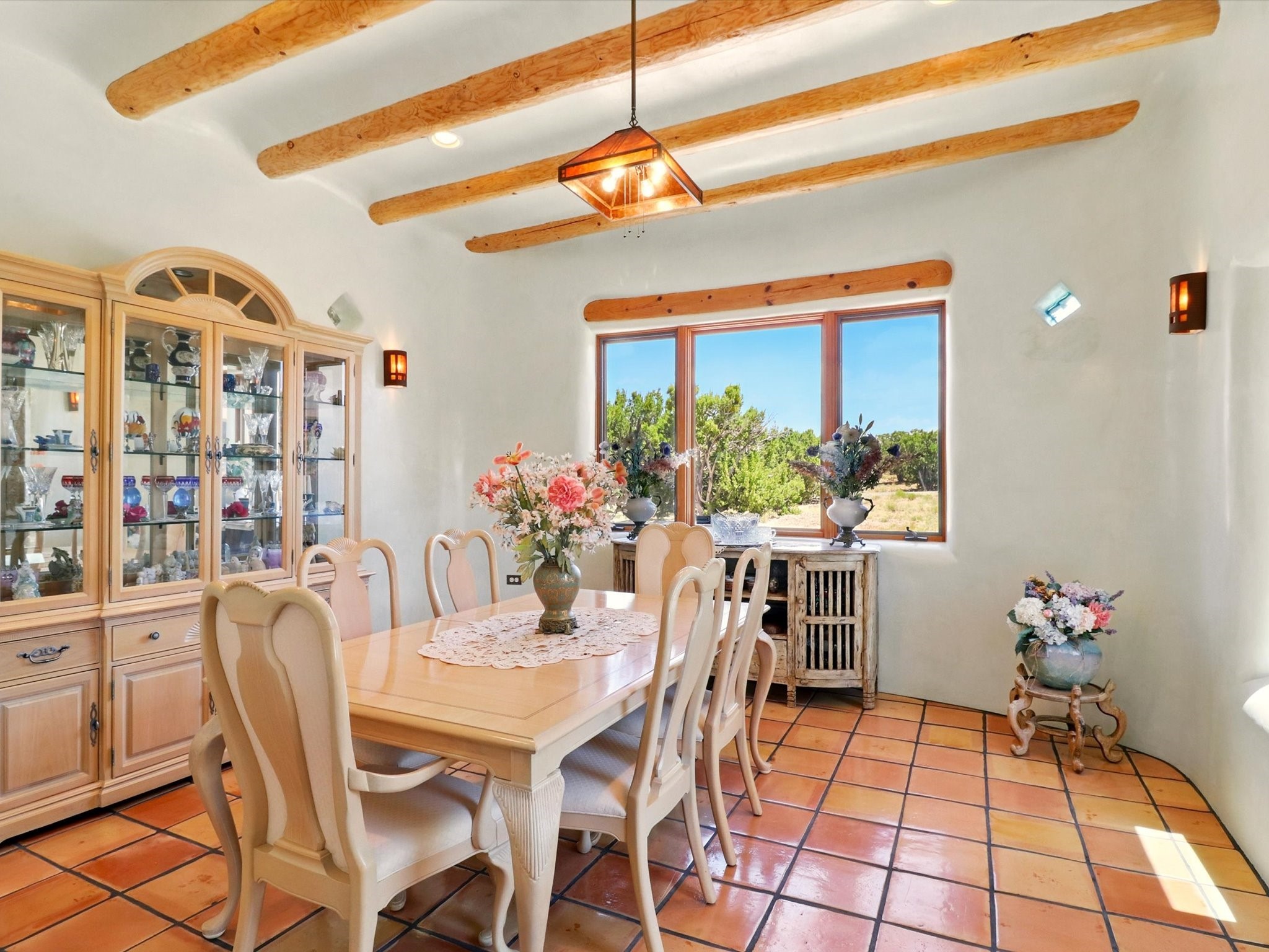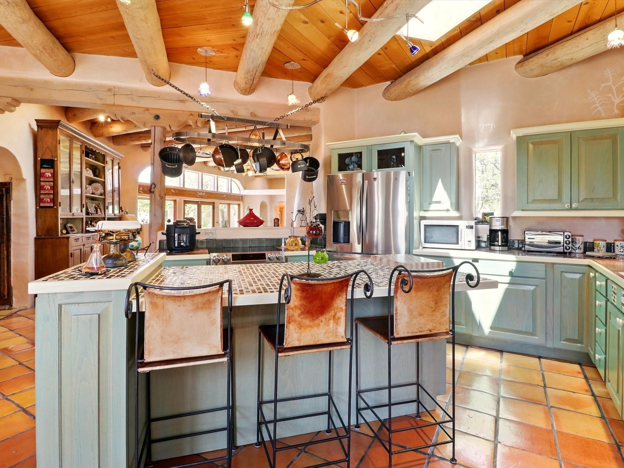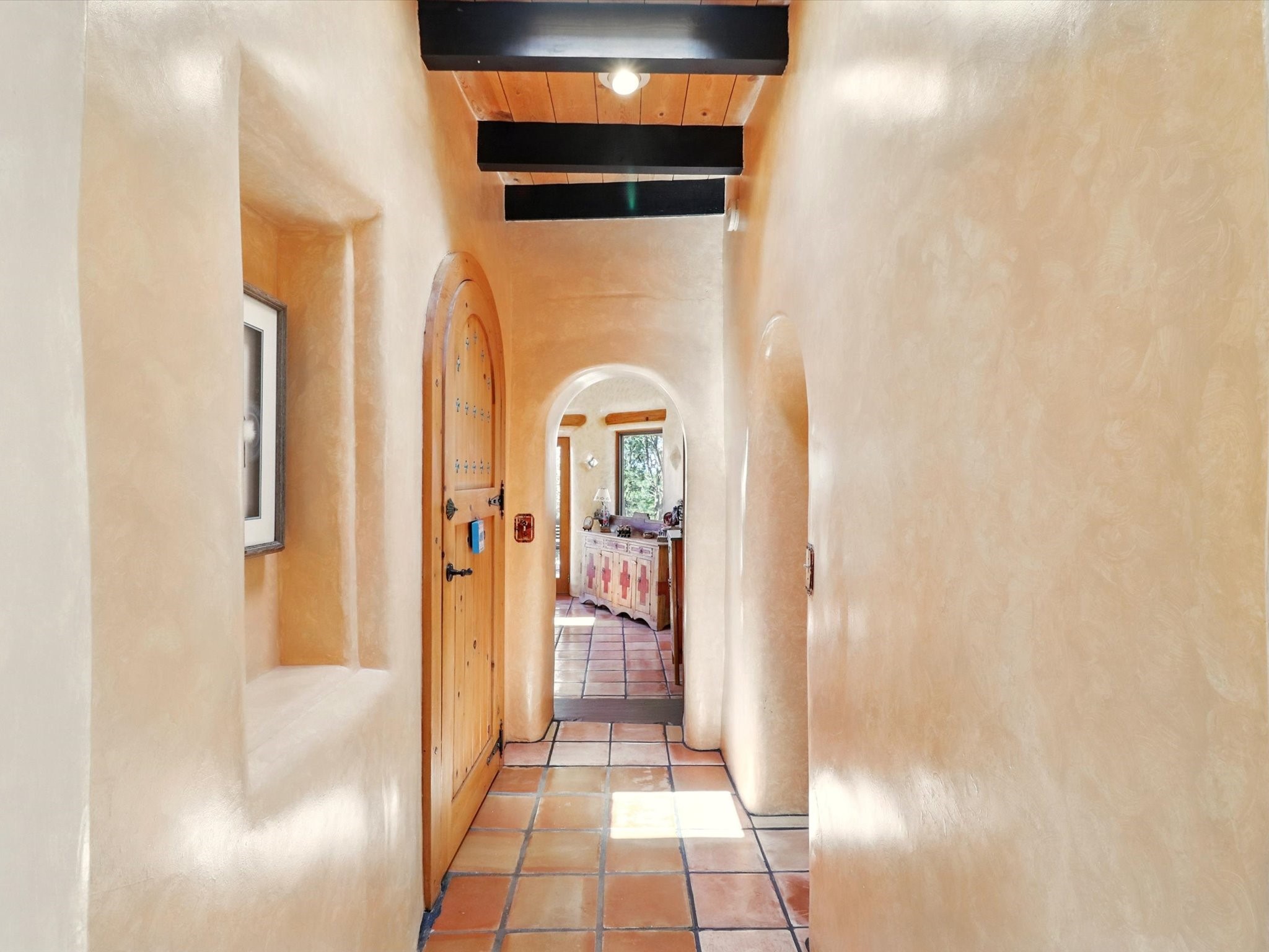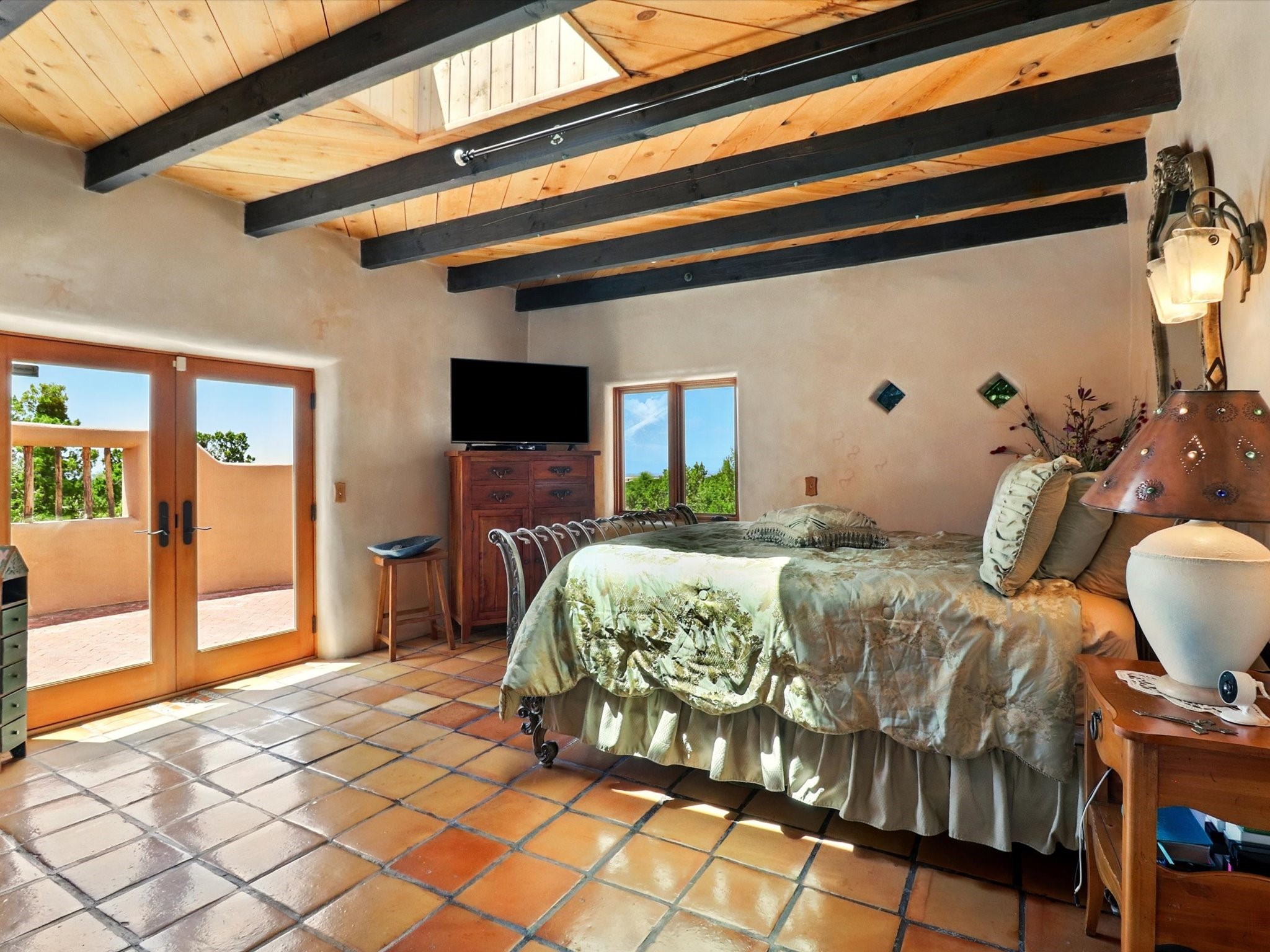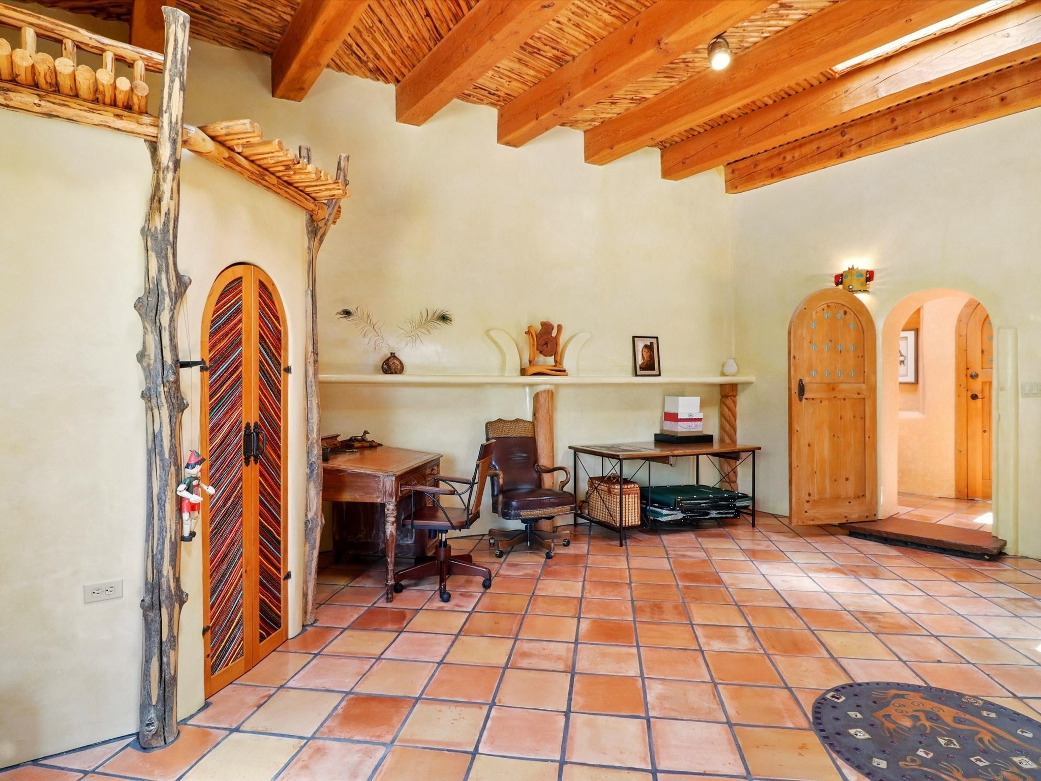 Enchanting Adobe Retreat with Guest Casita on 5 Private Acres - A timeless sanctuary nestled in the foothills of Santa Fe, where every sunrise brings serenity and every sunset invites reflection. For over three decades, this property has been cherished and curated, blending rich Santa Fe tradition with European influences.Begin your mornings on the covered kitchen patio, coffee in hand, as the sun rises over the Sangre De Cristo Mountains. Inside, the heart of the home unfolds with a kitchen island overlooking the living room's doors and windows -- framing an ornamental cherry tree and a 300-year-old pion tree.This custom adobe overflows with craftsmanship. Hand-carved beams, herringbone latillas, corbels, nichos, and structolite plastered walls speak to the region's architectural heritage. Thoughtful design details elevate the space: Venetian glass lighting, custom fixtures crafted by local artisans, and elegant Italian porcelain baths with satin nickel finishes from "Santa Fe by Design."Enjoy year-round comfort thanks to thick adobe walls, Marvin doors and windows, and radiant in-floor heating throughout the home. As the day winds down, indulge in a soak in the luxurious 6-foot clawfoot tub, gazing out the large picture window by sunset.Multiple portals -- two attached and two detached -- offer peaceful spots to unwind, each with its own perspective of the lush 5-acre grounds. Designed as an equestrian property, the land is both functional and magical, offering serenity, privacy, and space to explore.Included is a charming and fully private custom adobe guest house -- perfect for guests or as a proven income-generating rental.31 A&B Hondo Trail is more than a home; it's a living piece of art, a place of beauty, peace, and purpose. Come experience the enchantment for yourself.MAIN HOME HAS A NEW ROOF INSTALLED MAY 2025