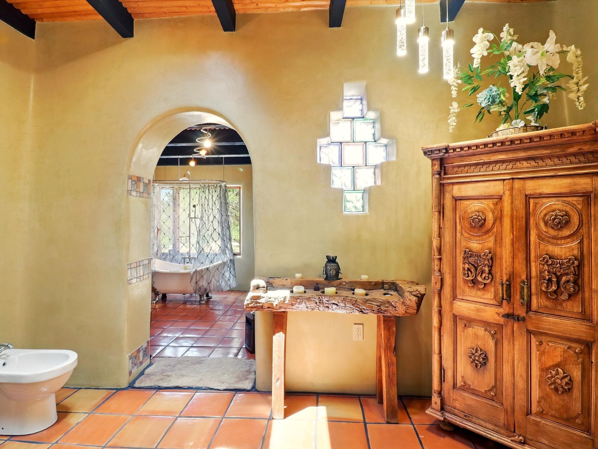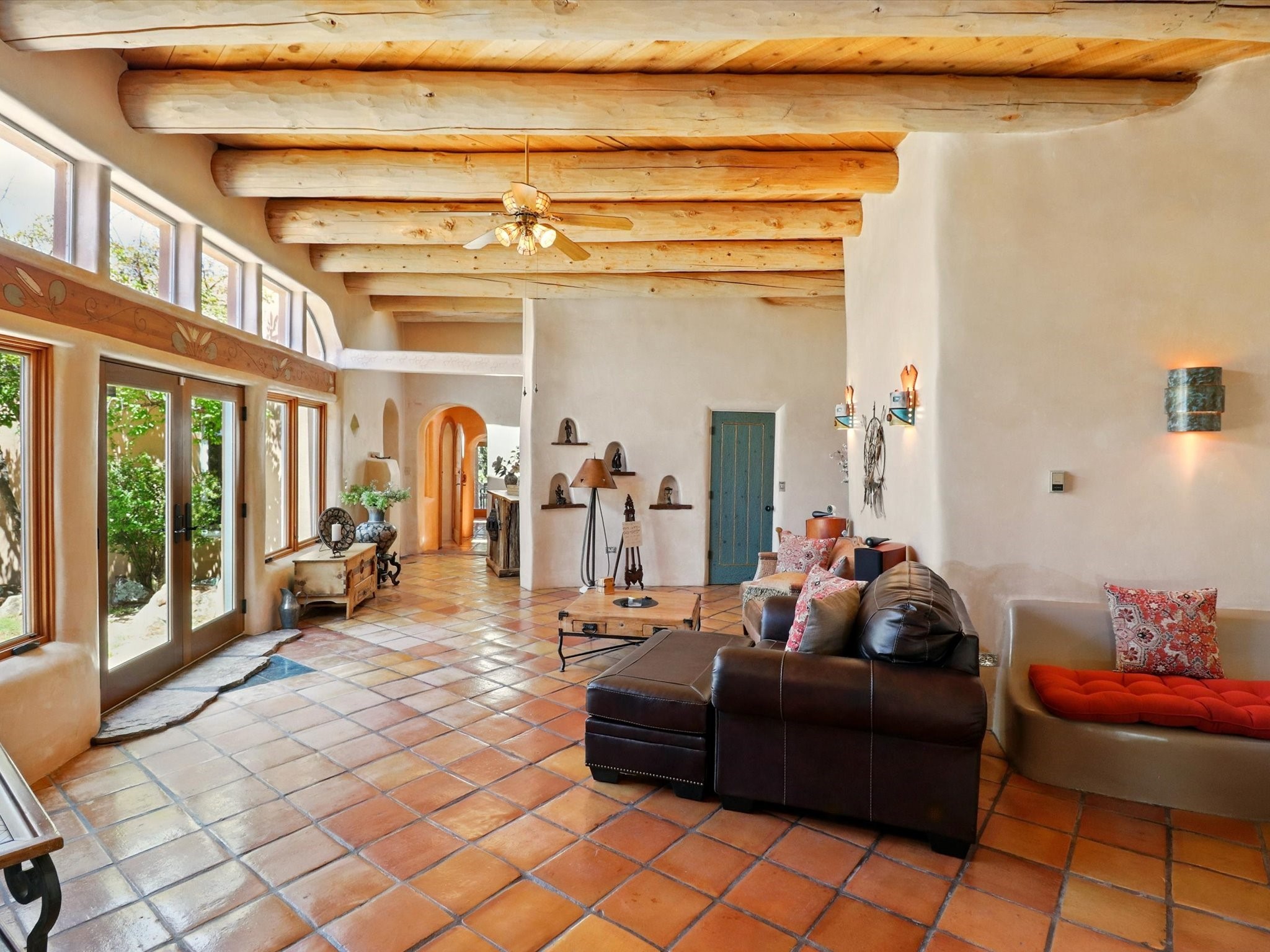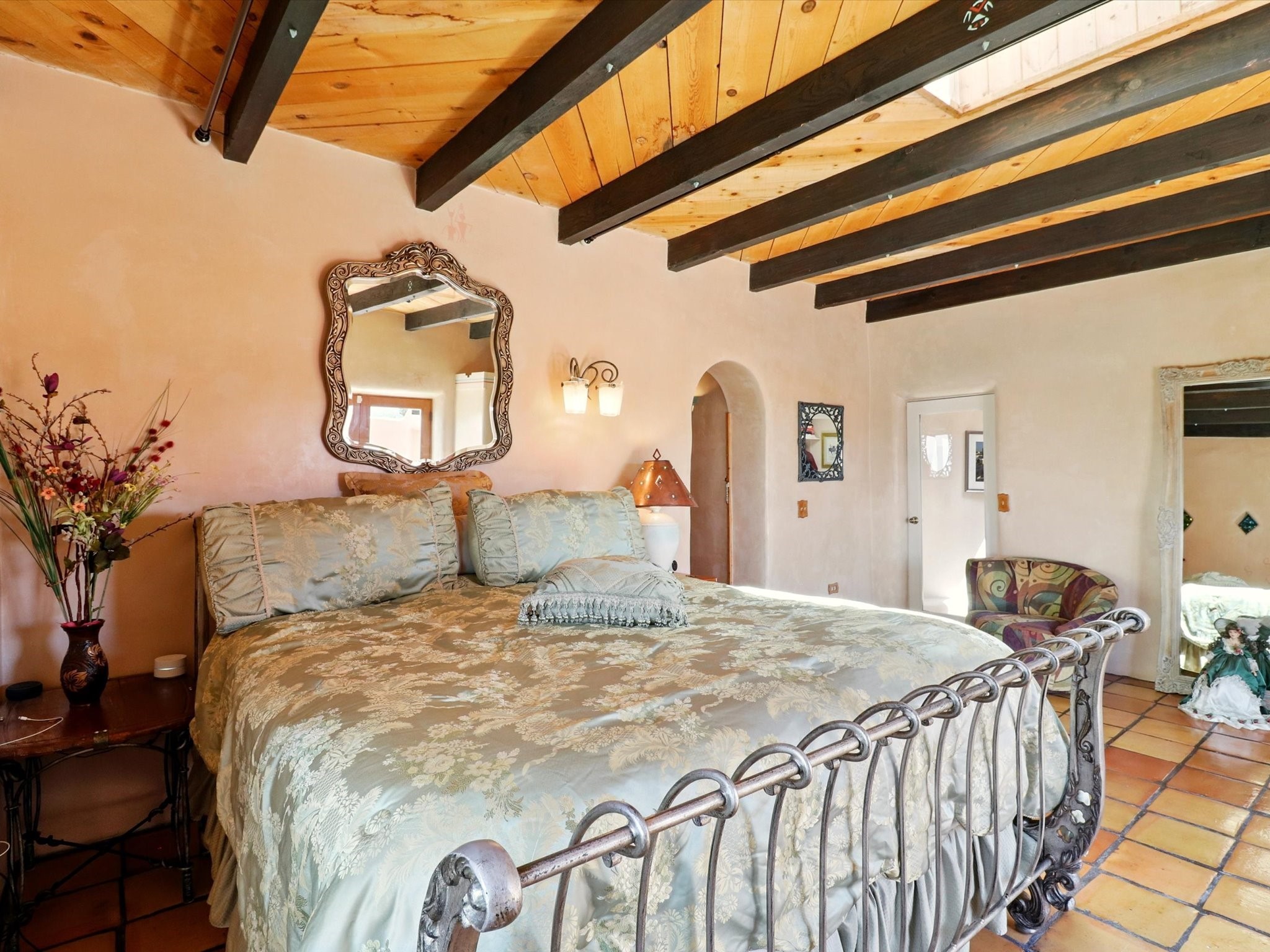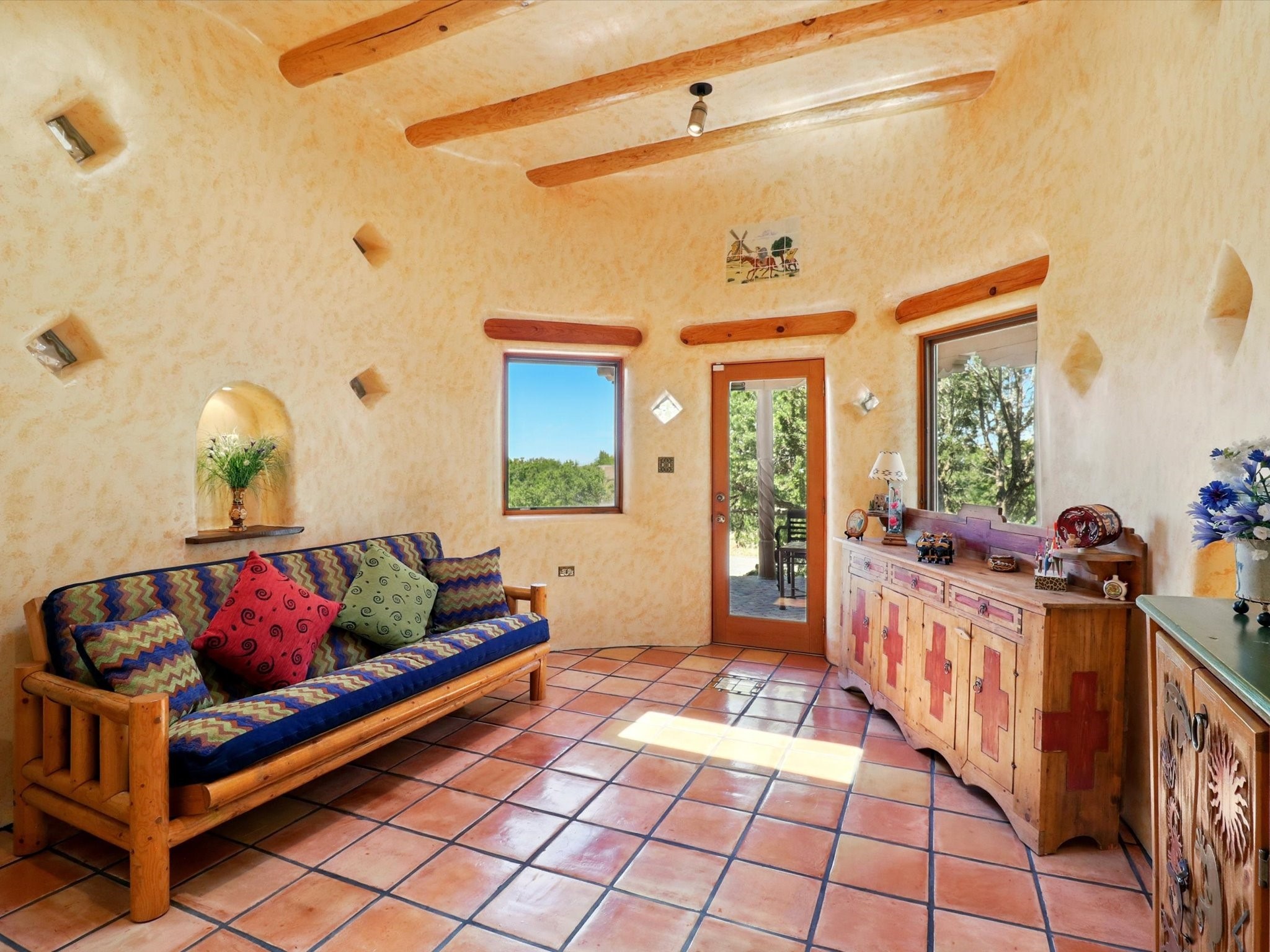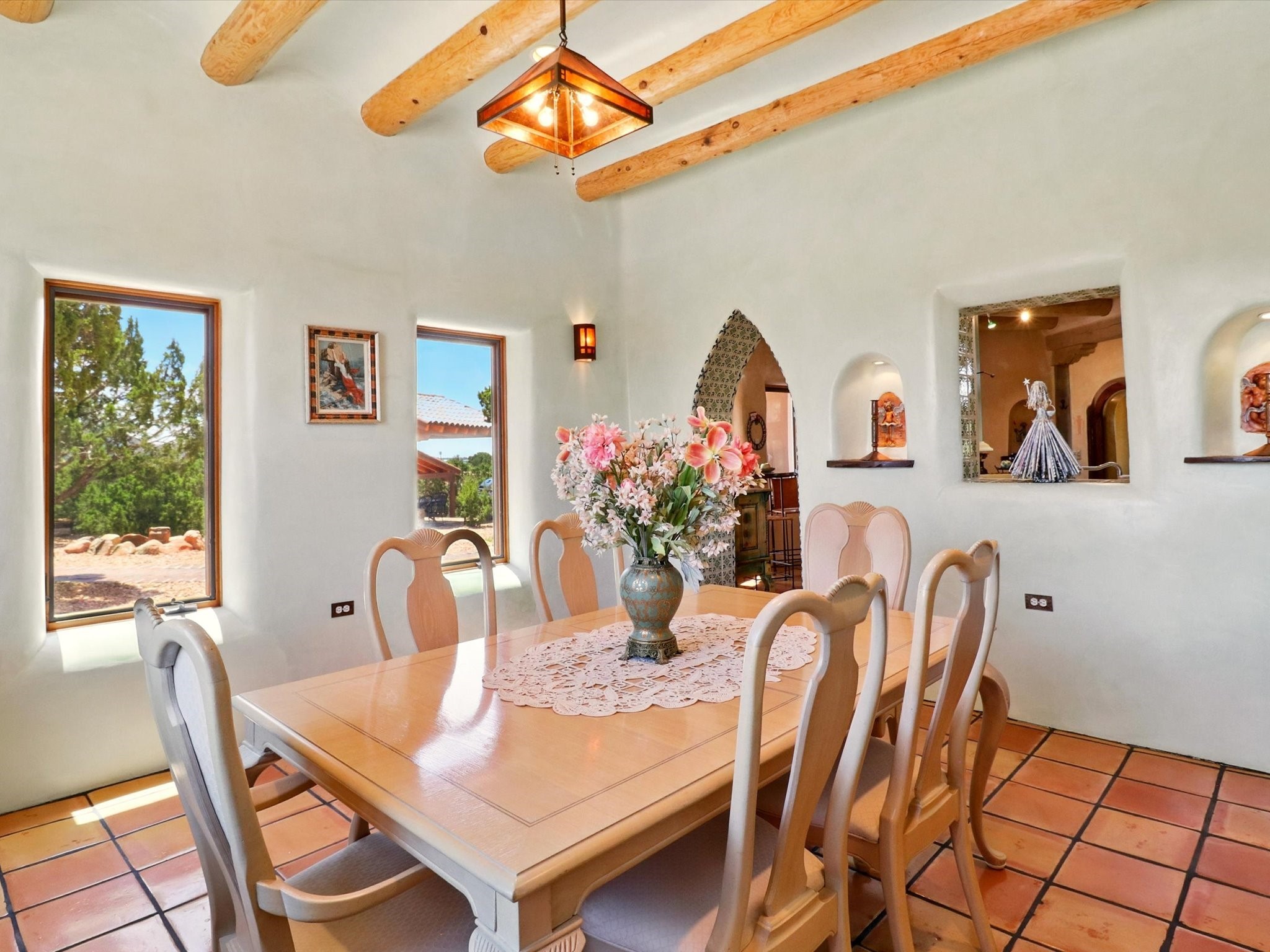 Enchanting Adobe Retreat with Guest Casita on 5 Private Acres - A timeless sanctuary nestled in the foothills of Santa Fe, where every sunrise brings serenity and every sunset invites reflection. For over three decades, this property has been cherished and curated, blending rich Santa Fe tradition with European influences.Begin your mornings on the covered kitchen patio, coffee in hand, as the sun rises over the Sangre De Cristo Mountains. Inside, the heart of the home unfolds with a kitchen island overlooking the living room's doors and windows -- framing an ornamental cherry tree and a 300-year-old pion tree.This custom adobe overflows with craftsmanship. Hand-carved beams, herringbone latillas, corbels, nichos, and structolite plastered walls speak to the region's architectural heritage. Thoughtful design details elevate the space: Venetian glass lighting, custom fixtures crafted by local artisans, and elegant Italian porcelain baths with satin nickel finishes from "Santa Fe by Design."Enjoy year-round comfort thanks to thick adobe walls, Marvin doors and windows, and radiant in-floor heating throughout the home. As the day winds down, indulge in a soak in the luxurious 6-foot clawfoot tub, gazing out the large picture window by sunset.Multiple portals -- two attached and two detached -- offer peaceful spots to unwind, each with its own perspective of the lush 5-acre grounds. Designed as an equestrian property, the land is both functional and magical, offering serenity, privacy, and space to explore.Included is a charming and fully private custom adobe guest house -- perfect for guests or as a proven income-generating rental.31 A&B Hondo Trail is more than a home; it's a living piece of art, a place of beauty, peace, and purpose. Come experience the enchantment for yourself.MAIN HOME HAS A NEW ROOF INSTALLED MAY 2025