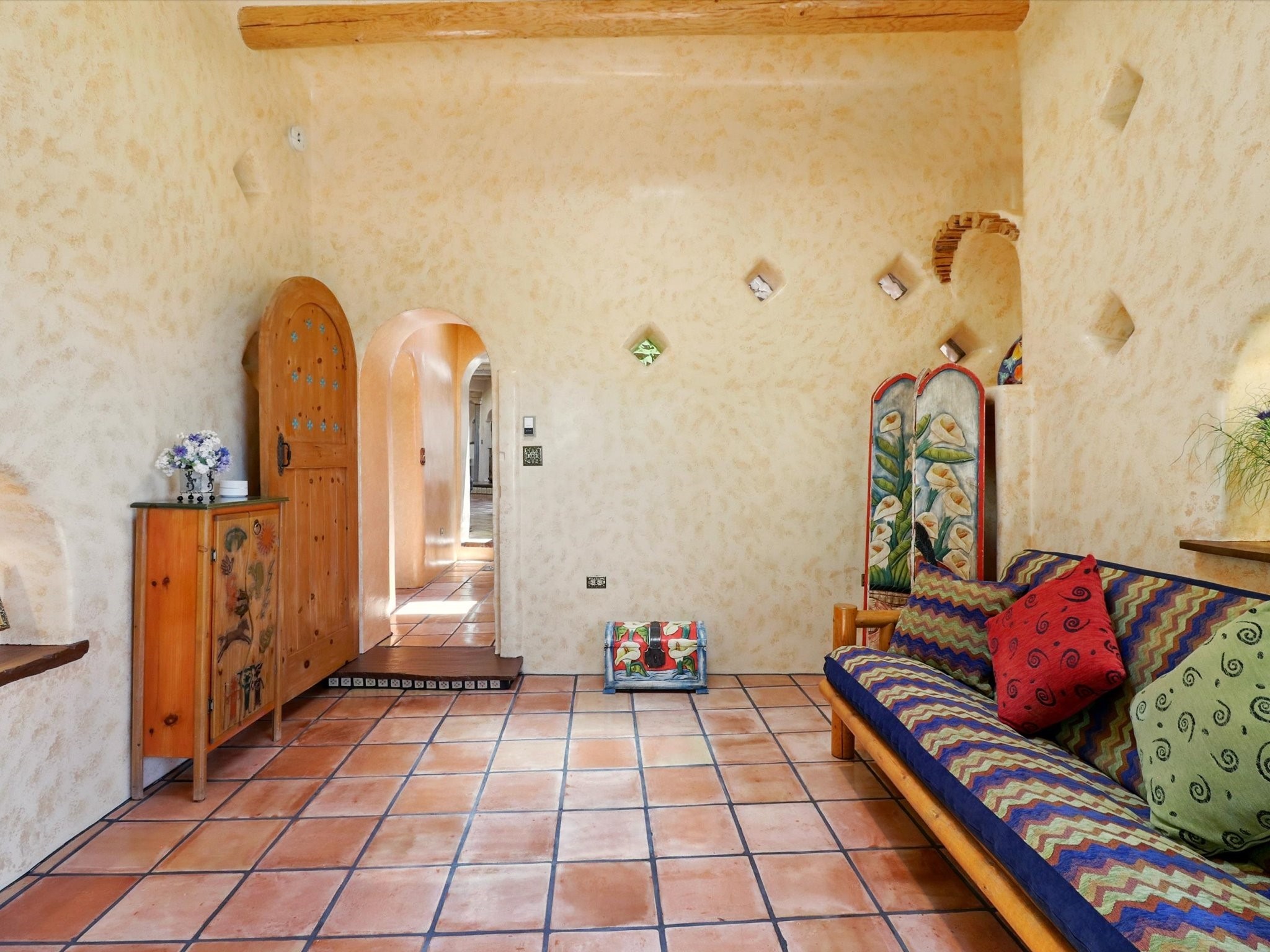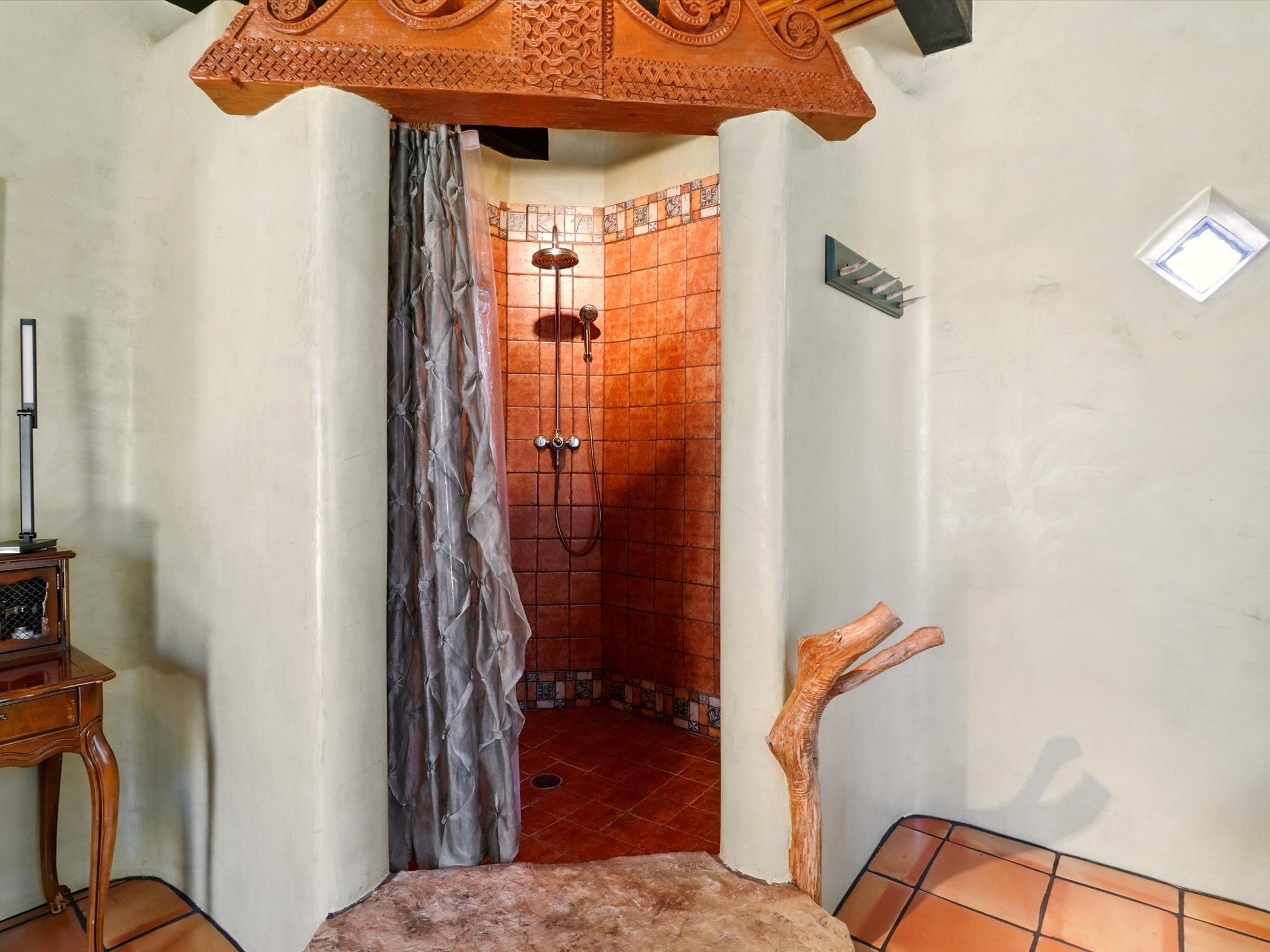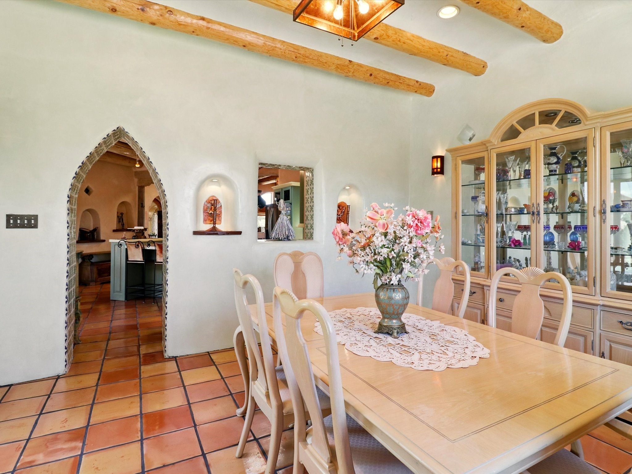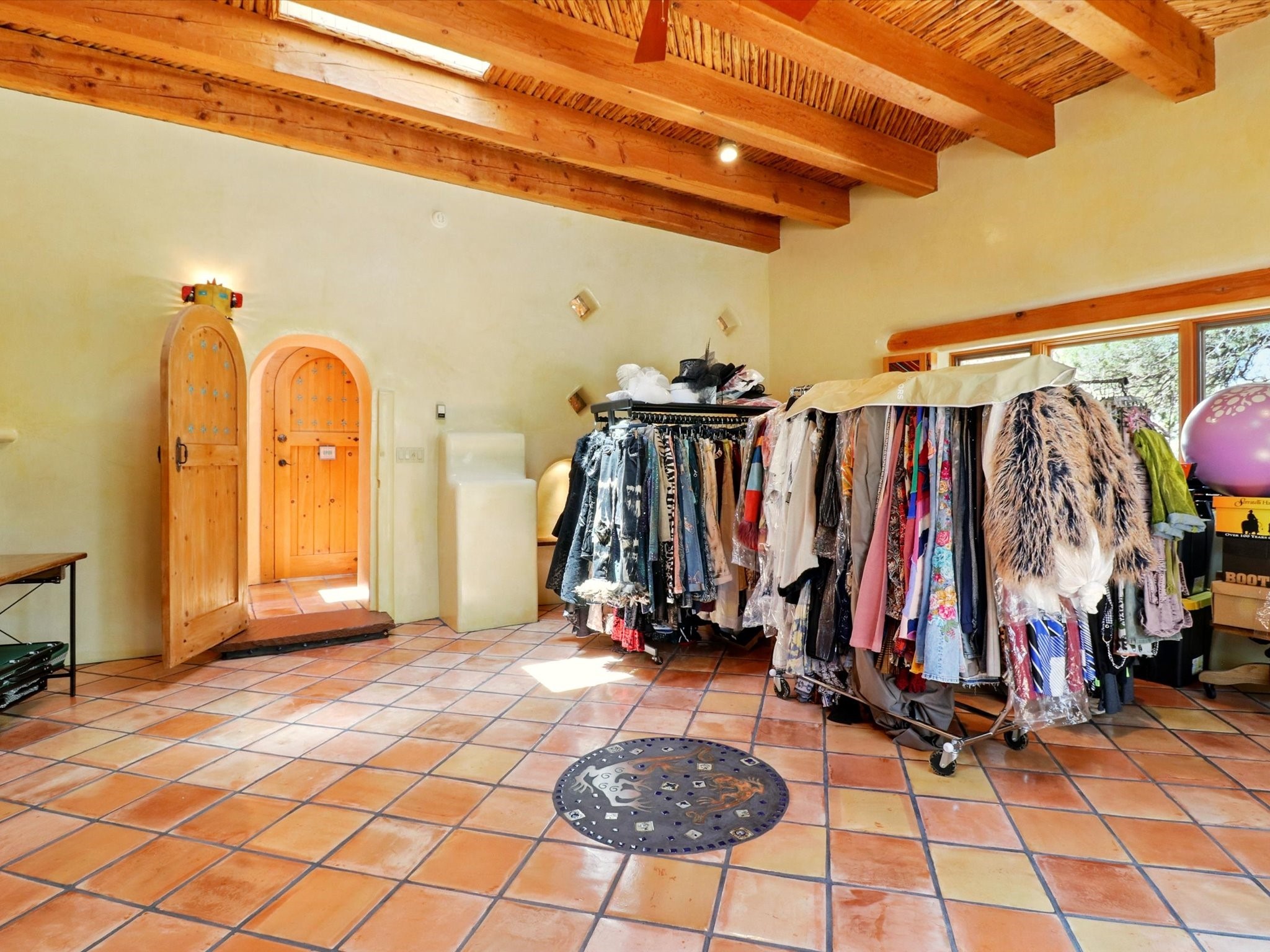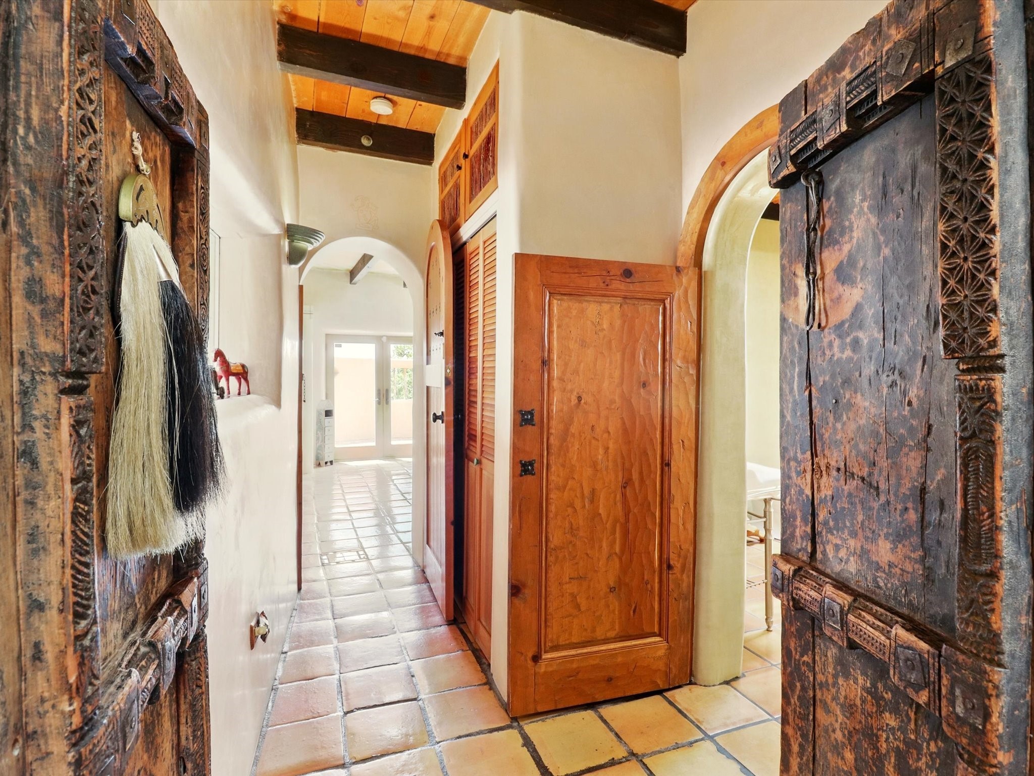 Enchanting Adobe Retreat with Guest Casita on 5 Private Acres - A timeless sanctuary nestled in the foothills of Santa Fe, where every sunrise brings serenity and every sunset invites reflection. For over three decades, this property has been cherished and curated, blending rich Santa Fe tradition with European influences.Begin your mornings on the covered kitchen patio, coffee in hand, as the sun rises over the Sangre De Cristo Mountains. Inside, the heart of the home unfolds with a kitchen island overlooking the living room's doors and windows -- framing an ornamental cherry tree and a 300-year-old pion tree.This custom adobe overflows with craftsmanship. Hand-carved beams, herringbone latillas, corbels, nichos, and structolite plastered walls speak to the region's architectural heritage. Thoughtful design details elevate the space: Venetian glass lighting, custom fixtures crafted by local artisans, and elegant Italian porcelain baths with satin nickel finishes from "Santa Fe by Design."Enjoy year-round comfort thanks to thick adobe walls, Marvin doors and windows, and radiant in-floor heating throughout the home. As the day winds down, indulge in a soak in the luxurious 6-foot clawfoot tub, gazing out the large picture window by sunset.Multiple portals -- two attached and two detached -- offer peaceful spots to unwind, each with its own perspective of the lush 5-acre grounds. Designed as an equestrian property, the land is both functional and magical, offering serenity, privacy, and space to explore.Included is a charming and fully private custom adobe guest house -- perfect for guests or as a proven income-generating rental.31 A&B Hondo Trail is more than a home; it's a living piece of art, a place of beauty, peace, and purpose. Come experience the enchantment for yourself.MAIN HOME HAS A NEW ROOF INSTALLED MAY 2025