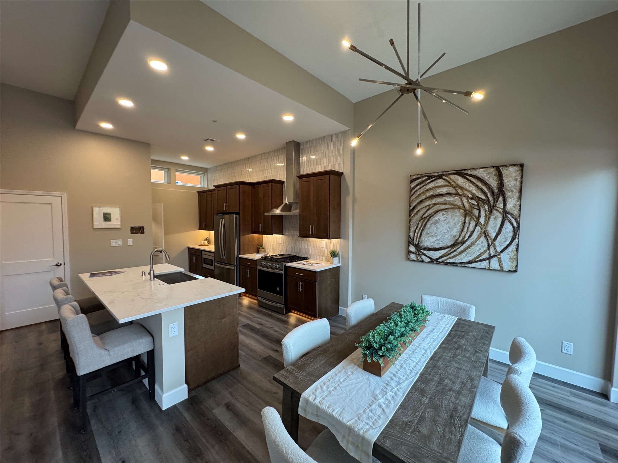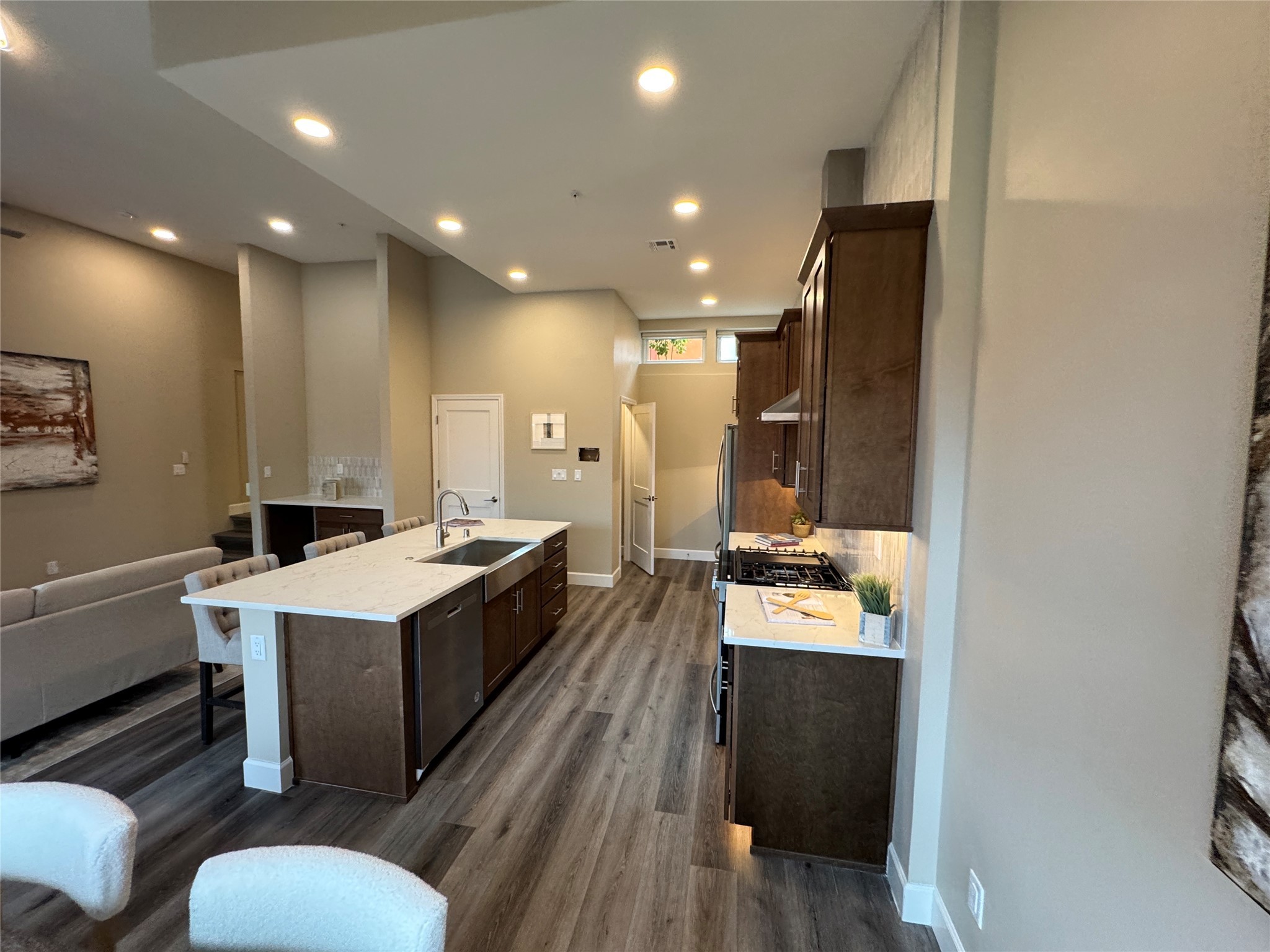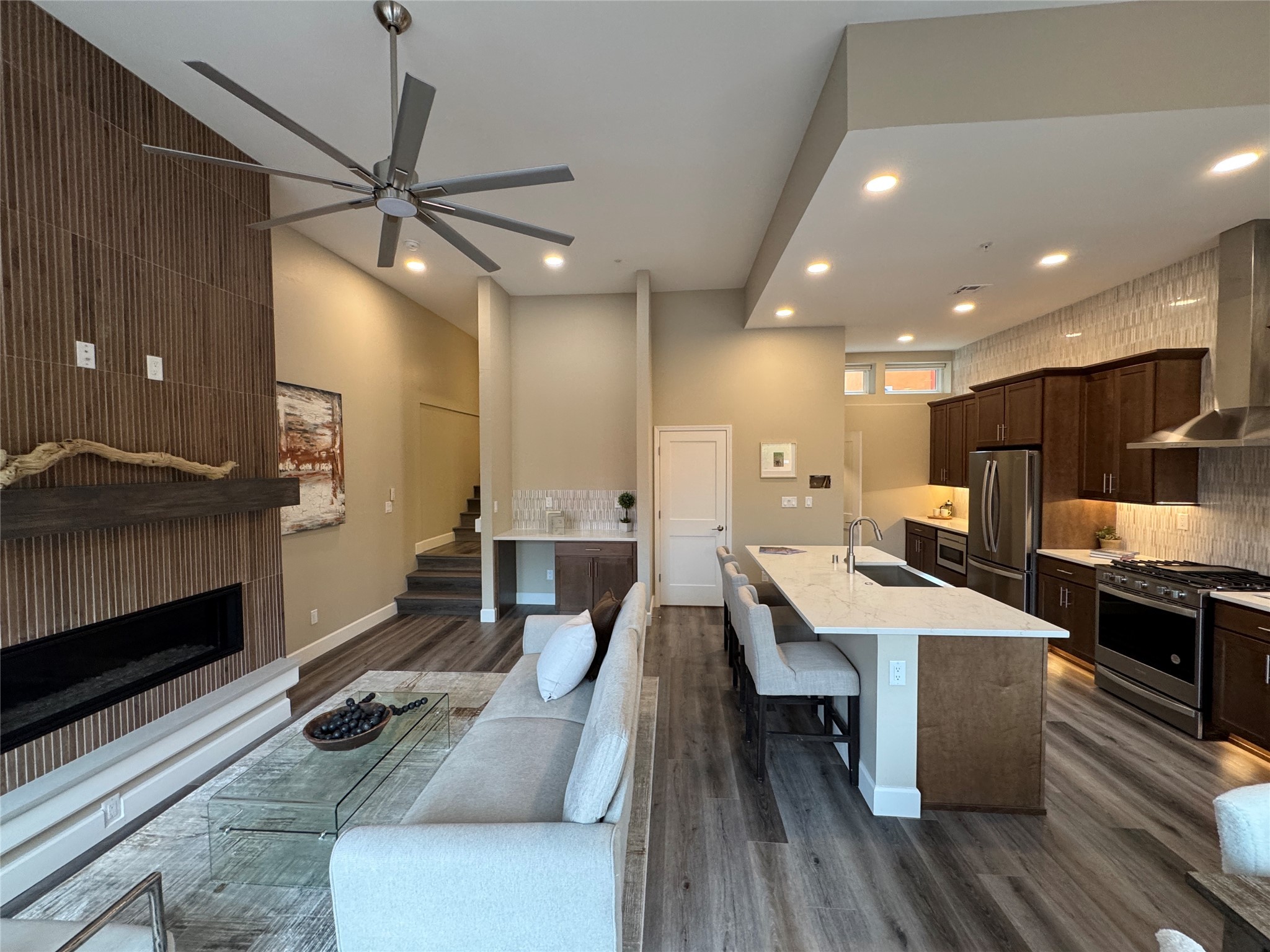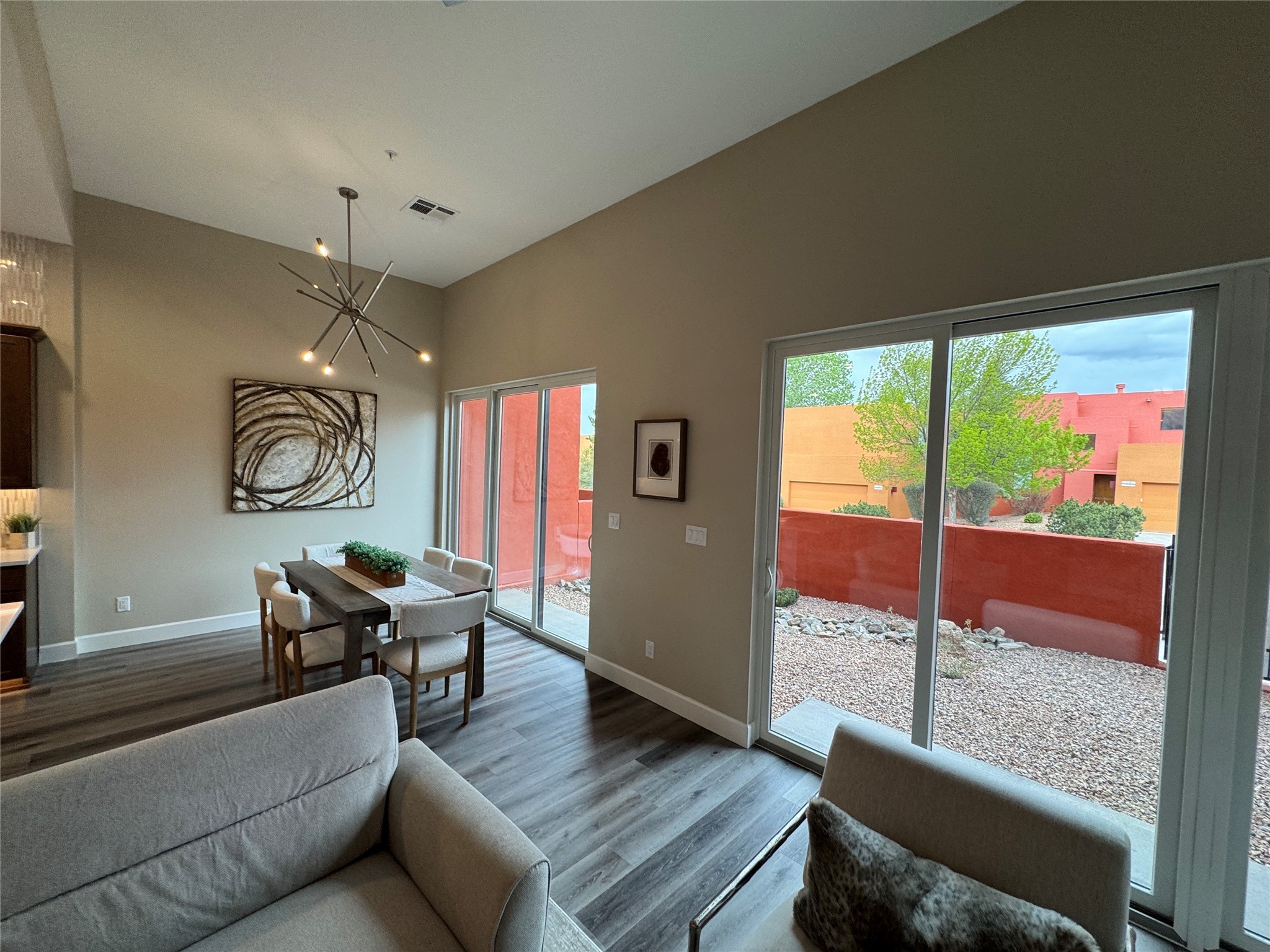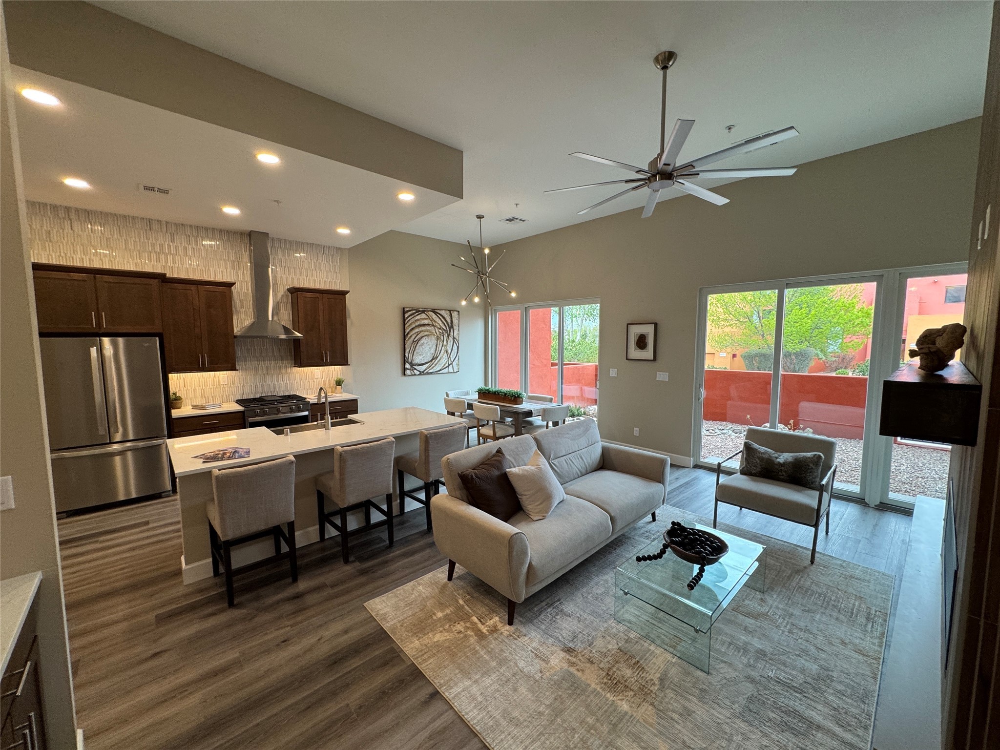 Welcome to Zocalo,#42. A rare and extraordinary offering within one of Santa Fe's most coveted communities. This sophisticated interior unit redefines modern elegance, seamlessly blending luxury, comfort, and style in an enviable location. Step inside and be captivated by the spacious great room, where contemporary tones meet the warmth of SPC luxury vinyl flooring. The open layout is designed for effortless entertaining, featuring a striking contemporary fireplace that invites both intimate gatherings and grand celebrations. The gourmet kitchen is a tasteful addition to the design, boasting pristine quartz countertops that exude timeless elegance. Perfectly paired with stainless appliance and ample storage.