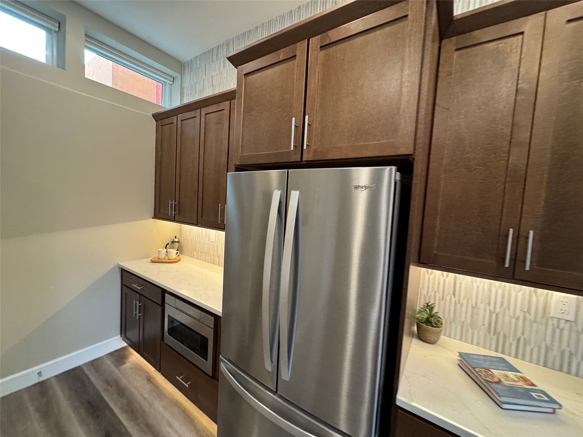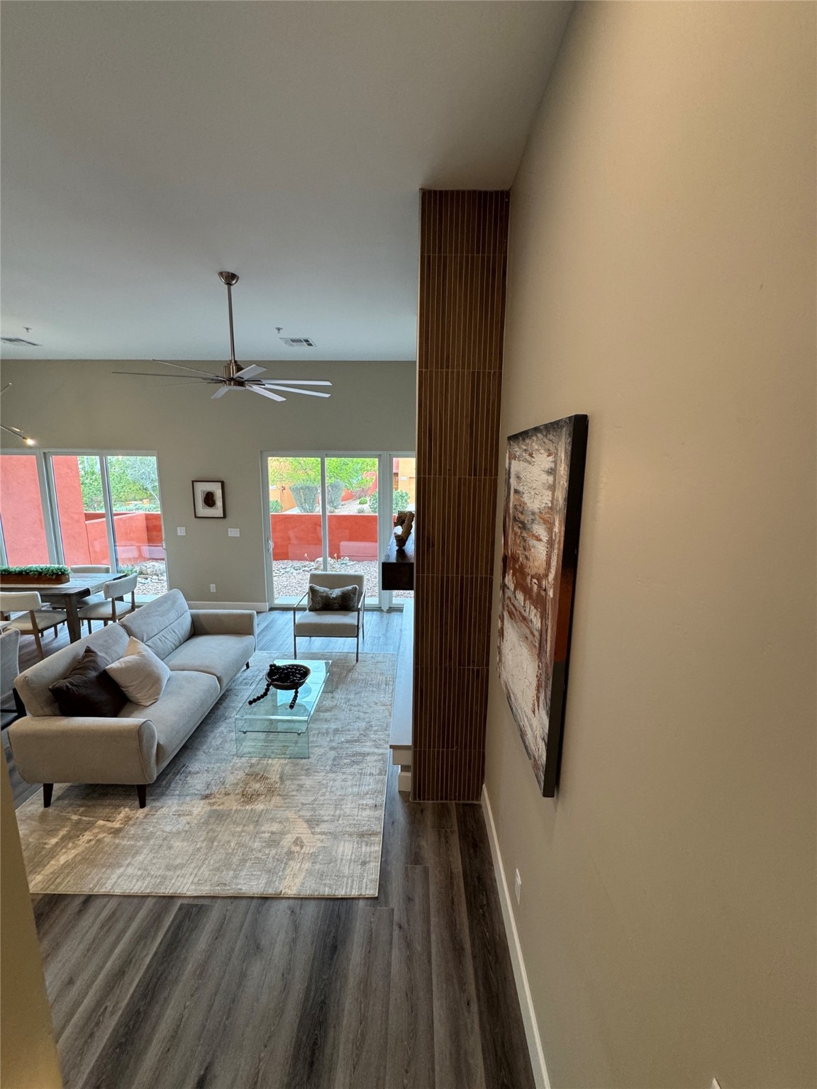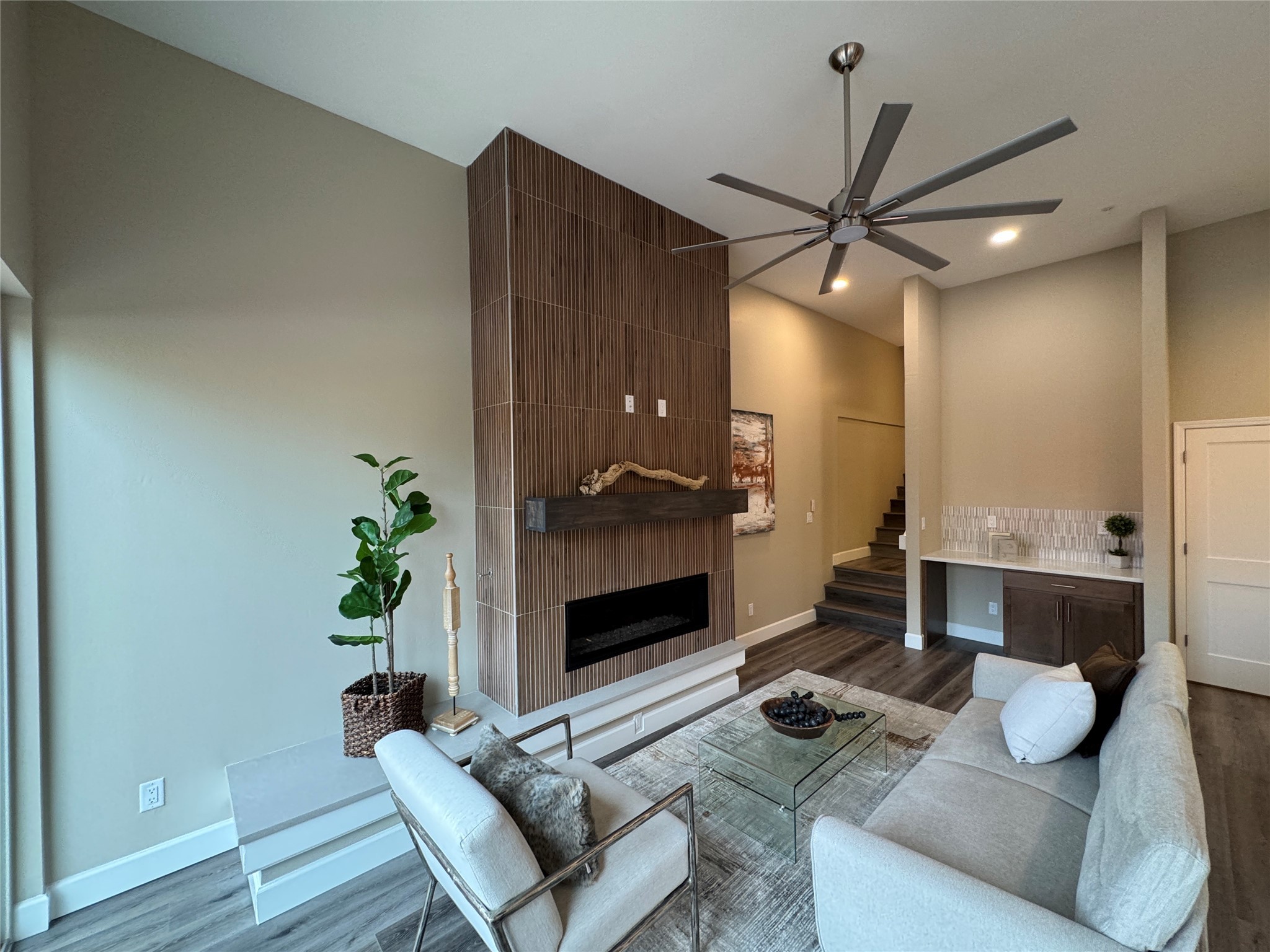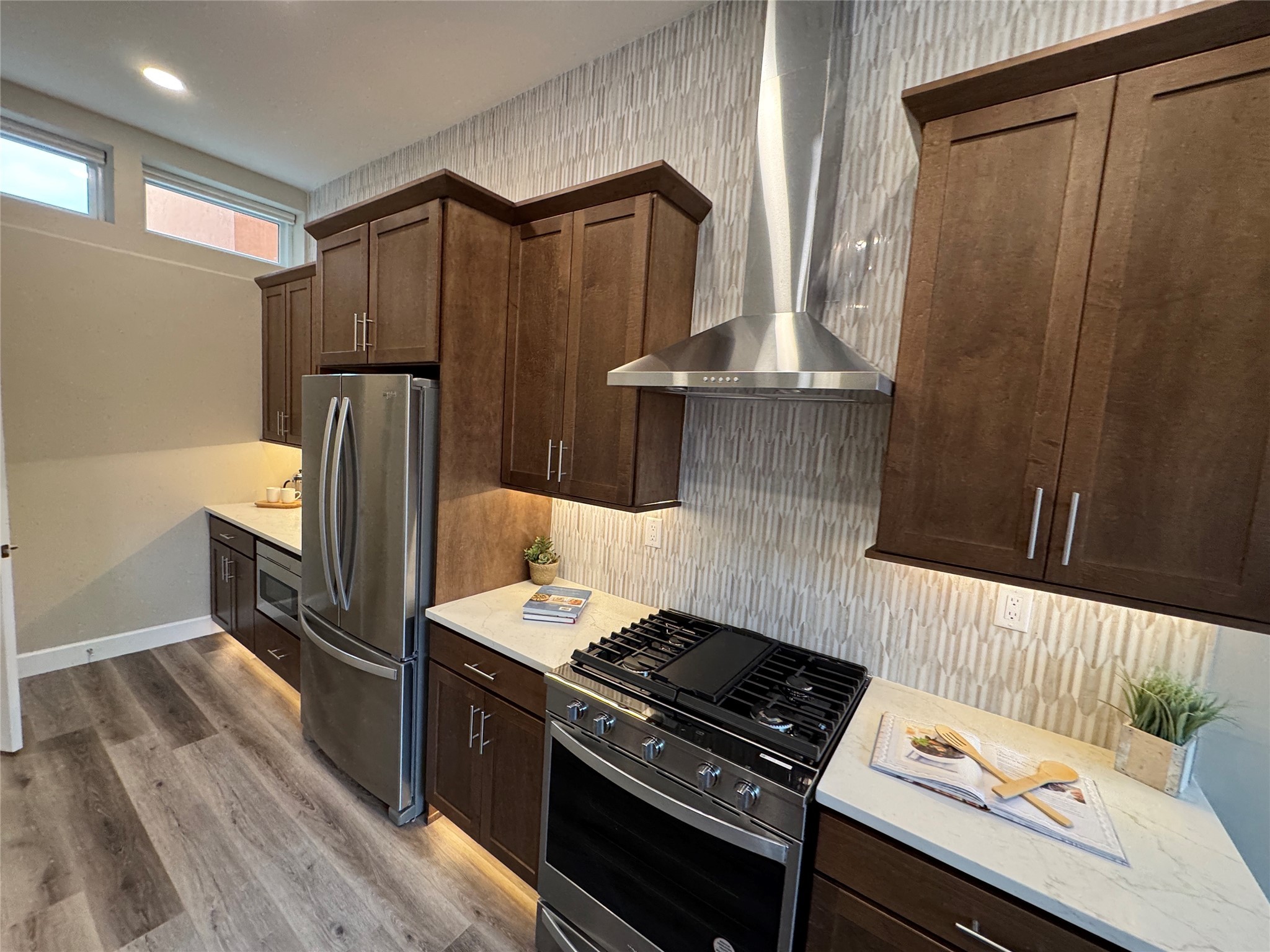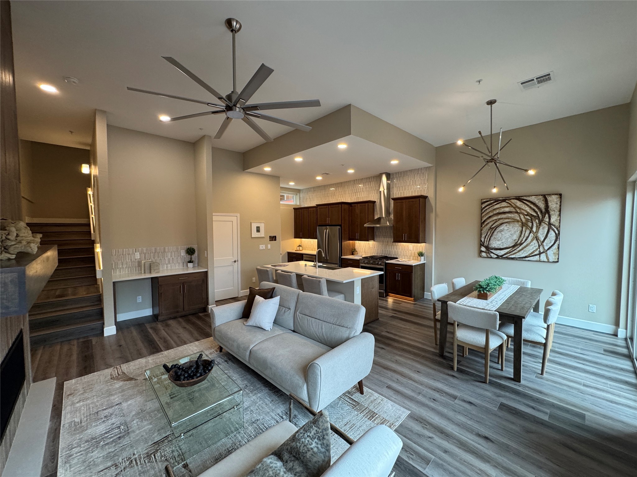 Welcome to Zocalo,#42. A rare and extraordinary offering within one of Santa Fe's most coveted communities. This sophisticated interior unit redefines modern elegance, seamlessly blending luxury, comfort, and style in an enviable location. Step inside and be captivated by the spacious great room, where contemporary tones meet the warmth of SPC luxury vinyl flooring. The open layout is designed for effortless entertaining, featuring a striking contemporary fireplace that invites both intimate gatherings and grand celebrations. The gourmet kitchen is a tasteful addition to the design, boasting pristine quartz countertops that exude timeless elegance. Perfectly paired with stainless appliance and ample storage.