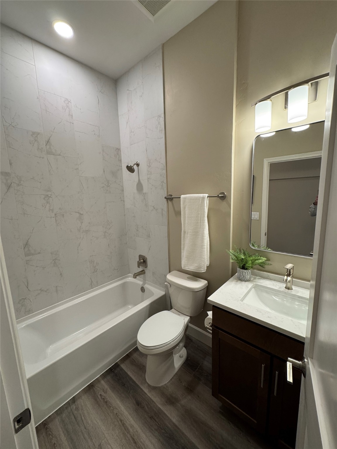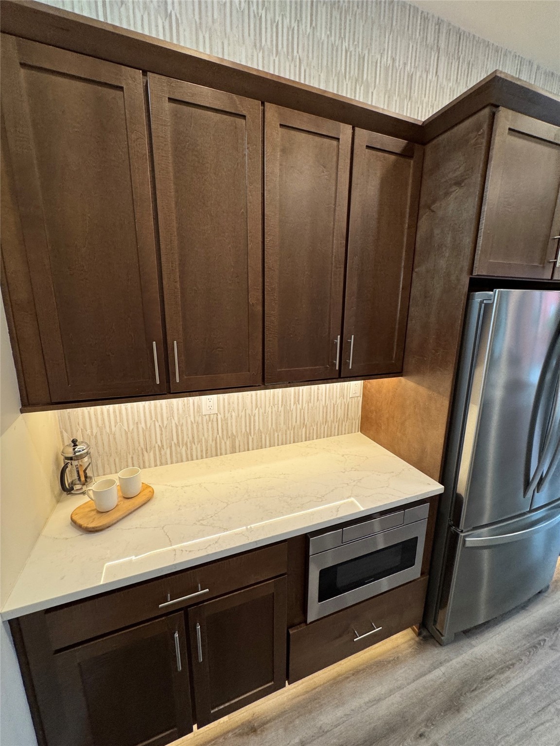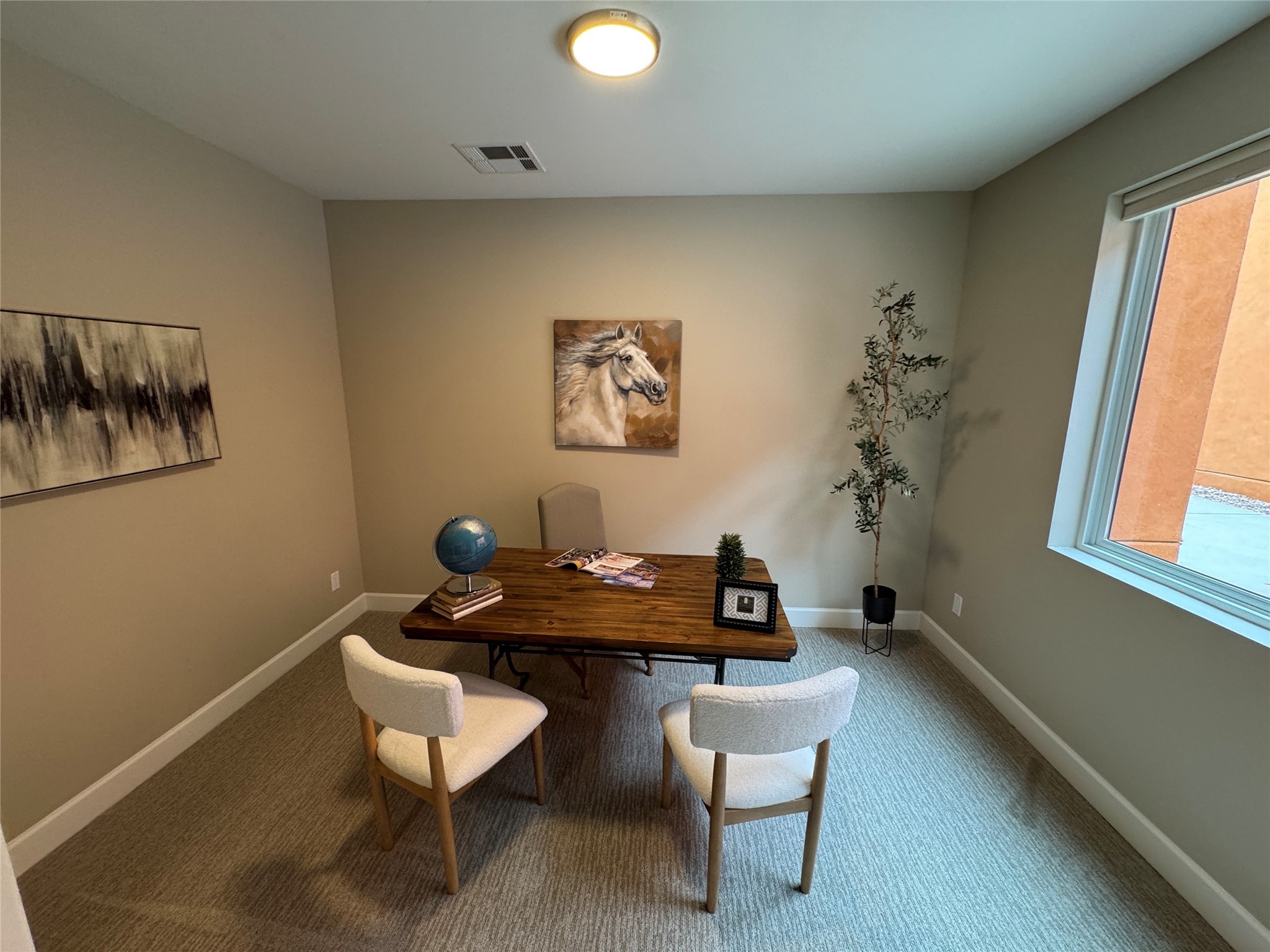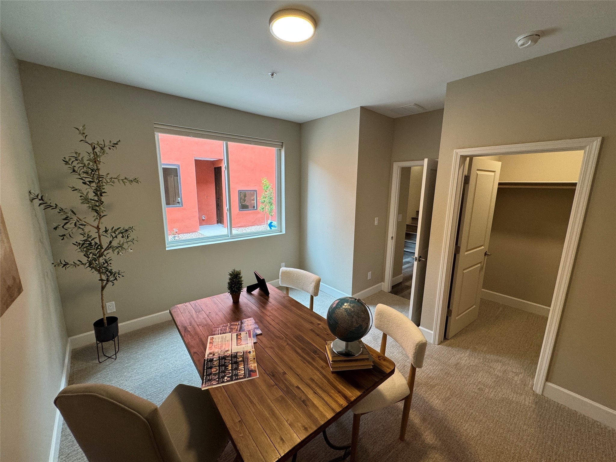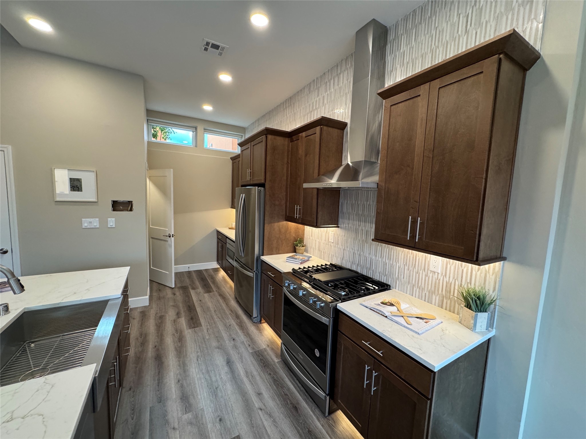 Welcome to Zocalo,#42. A rare and extraordinary offering within one of Santa Fe's most coveted communities. This sophisticated interior unit redefines modern elegance, seamlessly blending luxury, comfort, and style in an enviable location. Step inside and be captivated by the spacious great room, where contemporary tones meet the warmth of SPC luxury vinyl flooring. The open layout is designed for effortless entertaining, featuring a striking contemporary fireplace that invites both intimate gatherings and grand celebrations. The gourmet kitchen is a tasteful addition to the design, boasting pristine quartz countertops that exude timeless elegance. Perfectly paired with stainless appliance and ample storage.