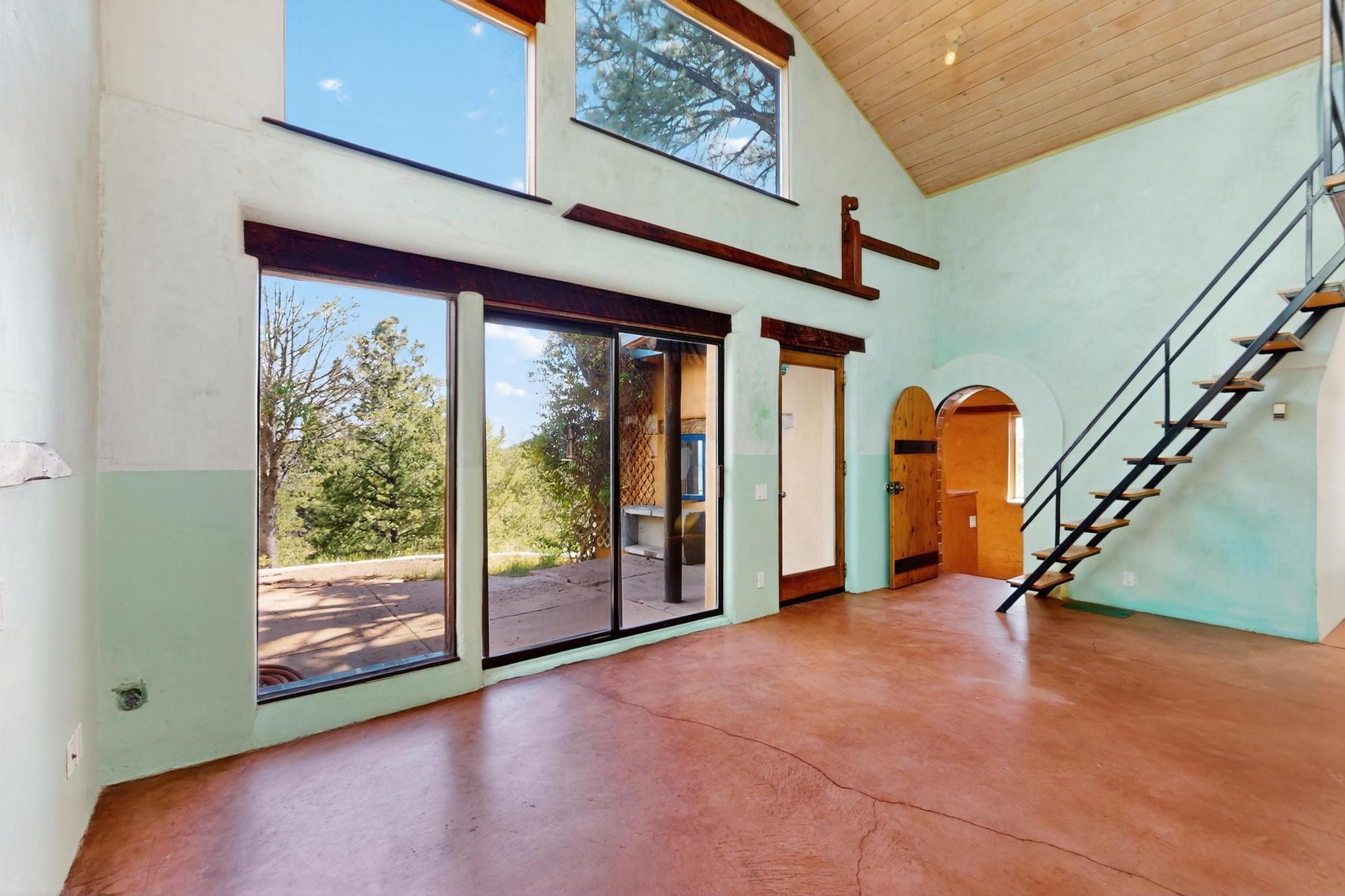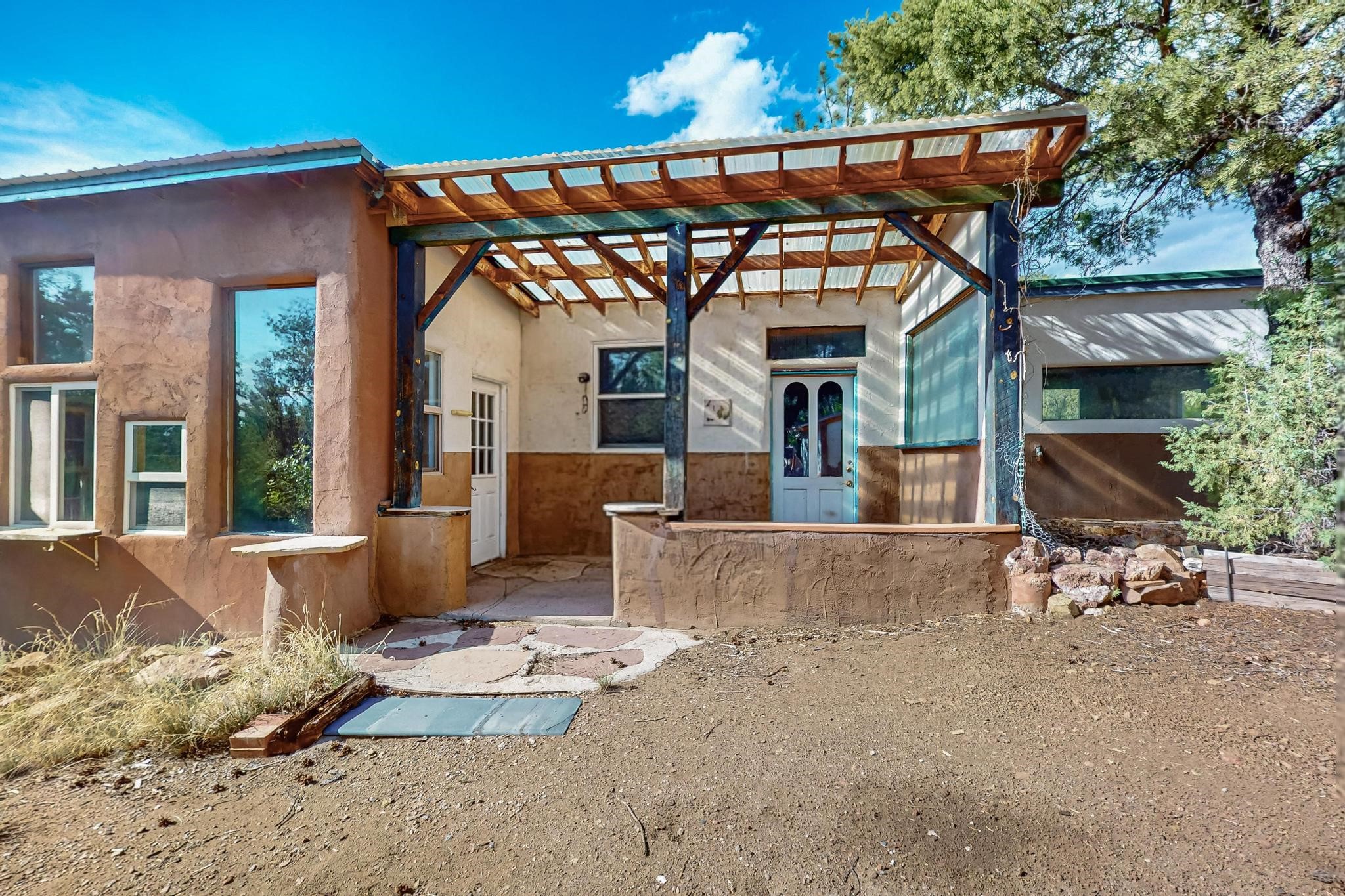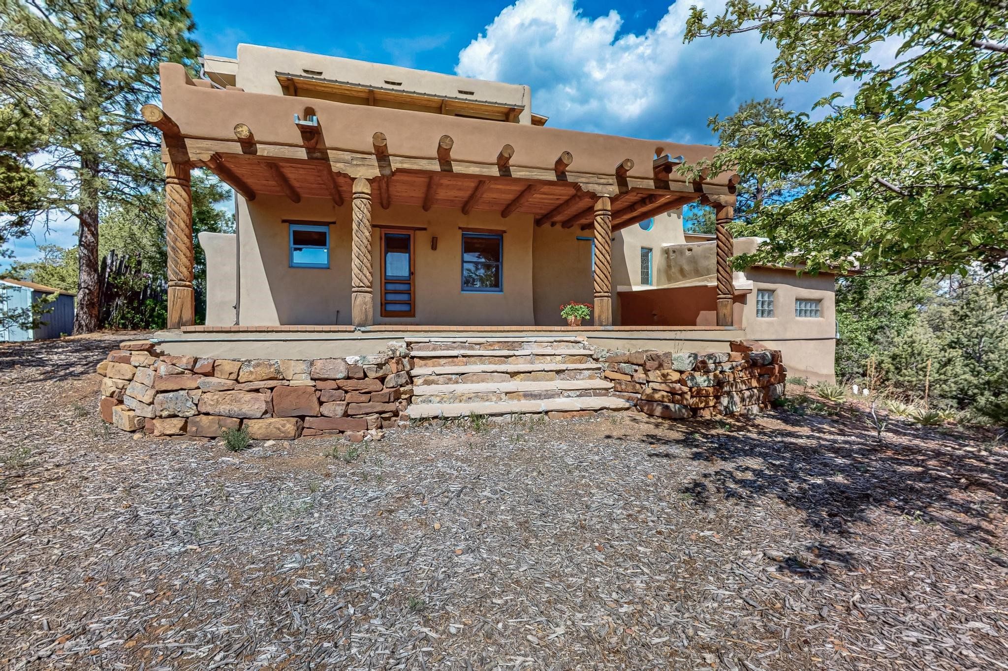 Two houses reside on this beautiful 5 Acre property that is nestled among old growth pine trees, offering numerous possibilities and conveniently located about 20 minutes from town The property features two distinct homes and a studio/workshop, all within a peaceful natural environment. House #A includes 2 bedrooms, 1 bath, fireplace, stained concrete floors, hard trowel plaster walls, radiant heat, a loft, and vigas, and a private deck. House #B known as the "Lily Pad House" offers 3 bedrooms, 2 baths, fireplace, saltillo tiles, vigas, radiant heat, hard trowel plaster, wood floors, vigas, spacious kitchen, portal, and delightful koi pond with lilies. Additionally, there is a versatile studio/workshop, consisting of an enclosed vintage travel trailer perfect for guests, and an attached site-built studio/workshop, providing multiple potential uses. The property also benefits from a private well, storage sheds, and no Homeowners Association.