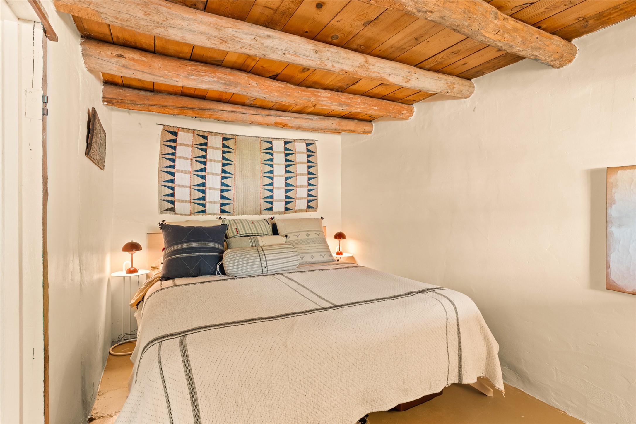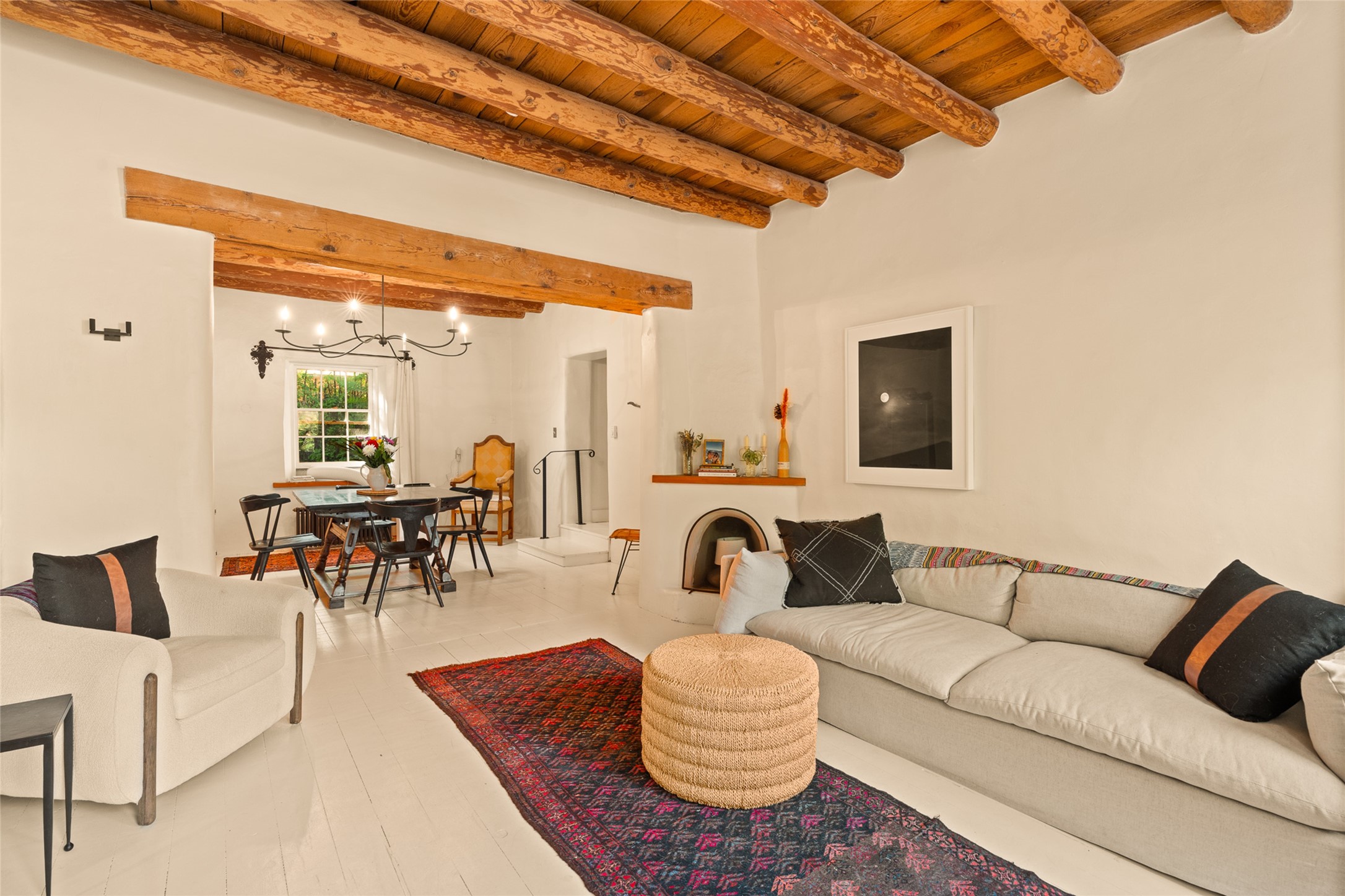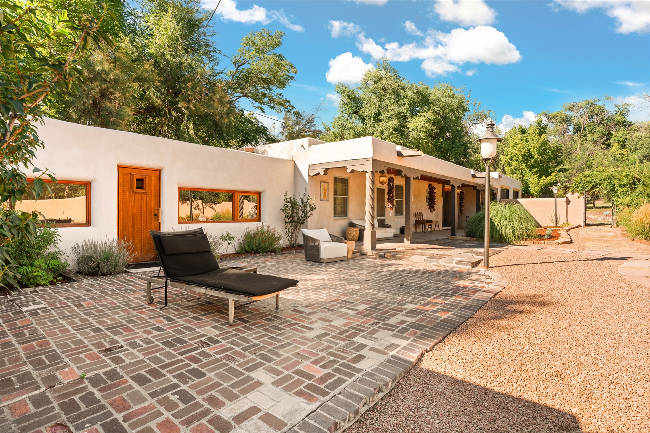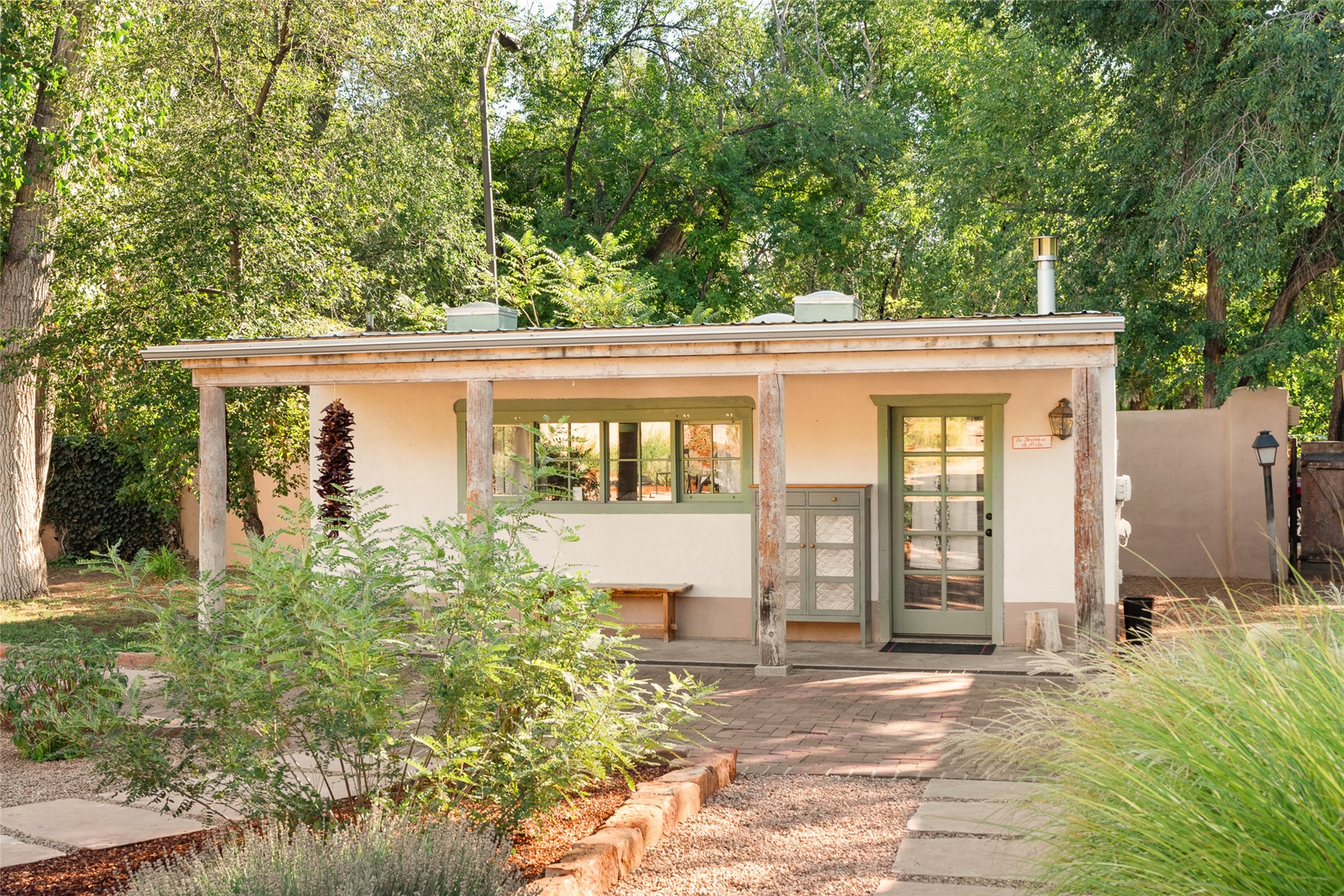 Recently updated with a rich old world charm and history (formerly El Cuervito Ranch), this private and gated compound is situated in the lush village of Tesuque just steps away from El Nido Restaurant, the famed Tesuque Village Market and the world-renowned Santa Fe Opera. Consisting of 0.754 beautifully manicured acres, the entry courtyard has stone pathways and seasonal greenery, creating a warm and inviting playground for the senses. The property consists of a main house (two bedrooms/two baths), guesthouse (one bedroom/one bath), and three separate studio spaces all served by both a shared well and the Tesuque Community Water System. The interiors of these adobe and frame constructed homes are washed with light and have vast tree-lined views in every direction. Formal living spaces open out onto a plethora of indoor/outdoor entertaining options with sitting portals weaving the beauty of nature into the living environment. There is a nice separation of space between the structures, but the property also offers many uses as it is zoned Rural Commercial, allowing many business options for the homeowner. Classic in style, this sensuous property has been fitted with mini-split heating and A/C, plastered walls, wood floors, vigas and beams, completely walled and tucked away in one of Santa Fe's finest idyllic locales.